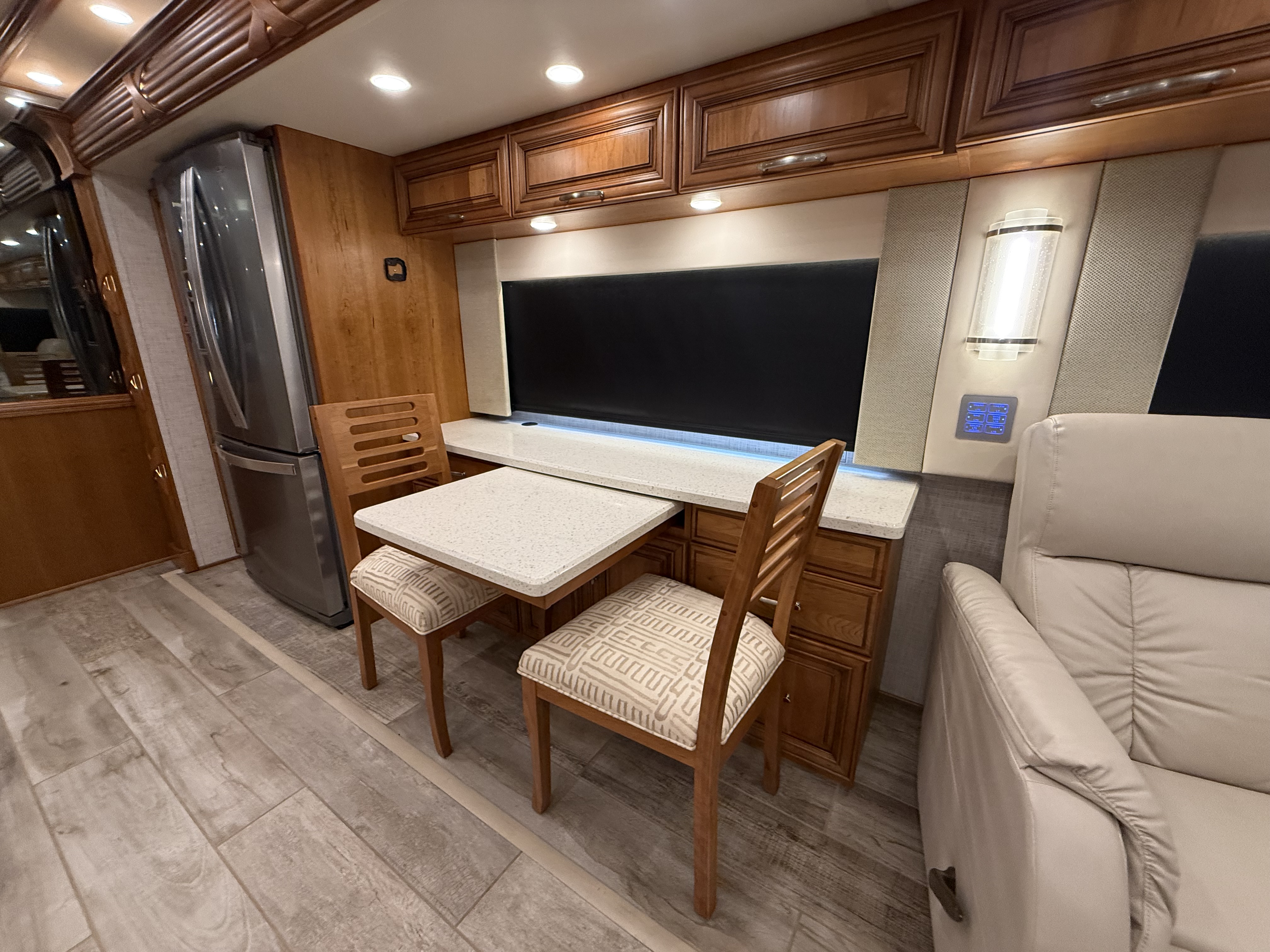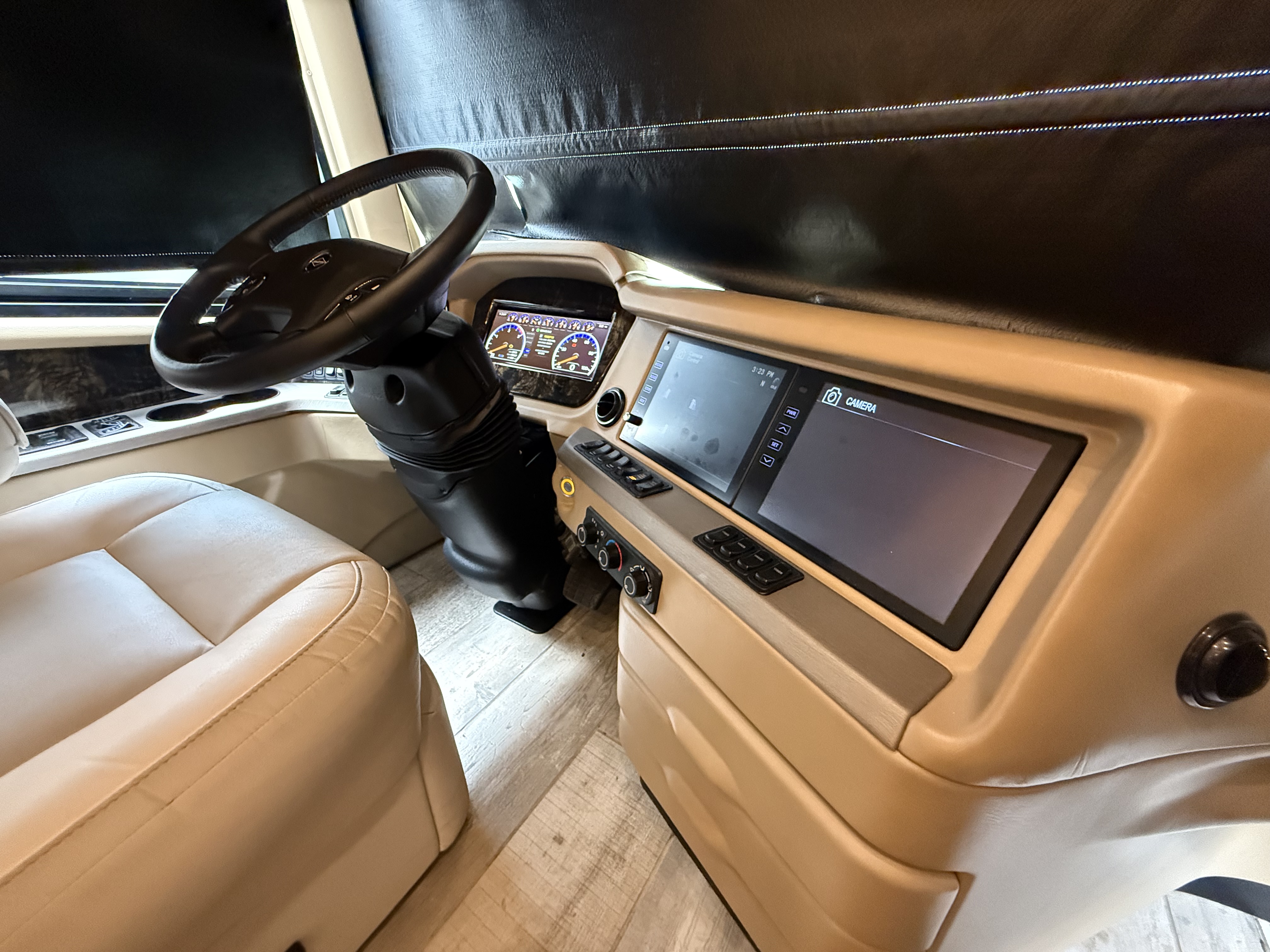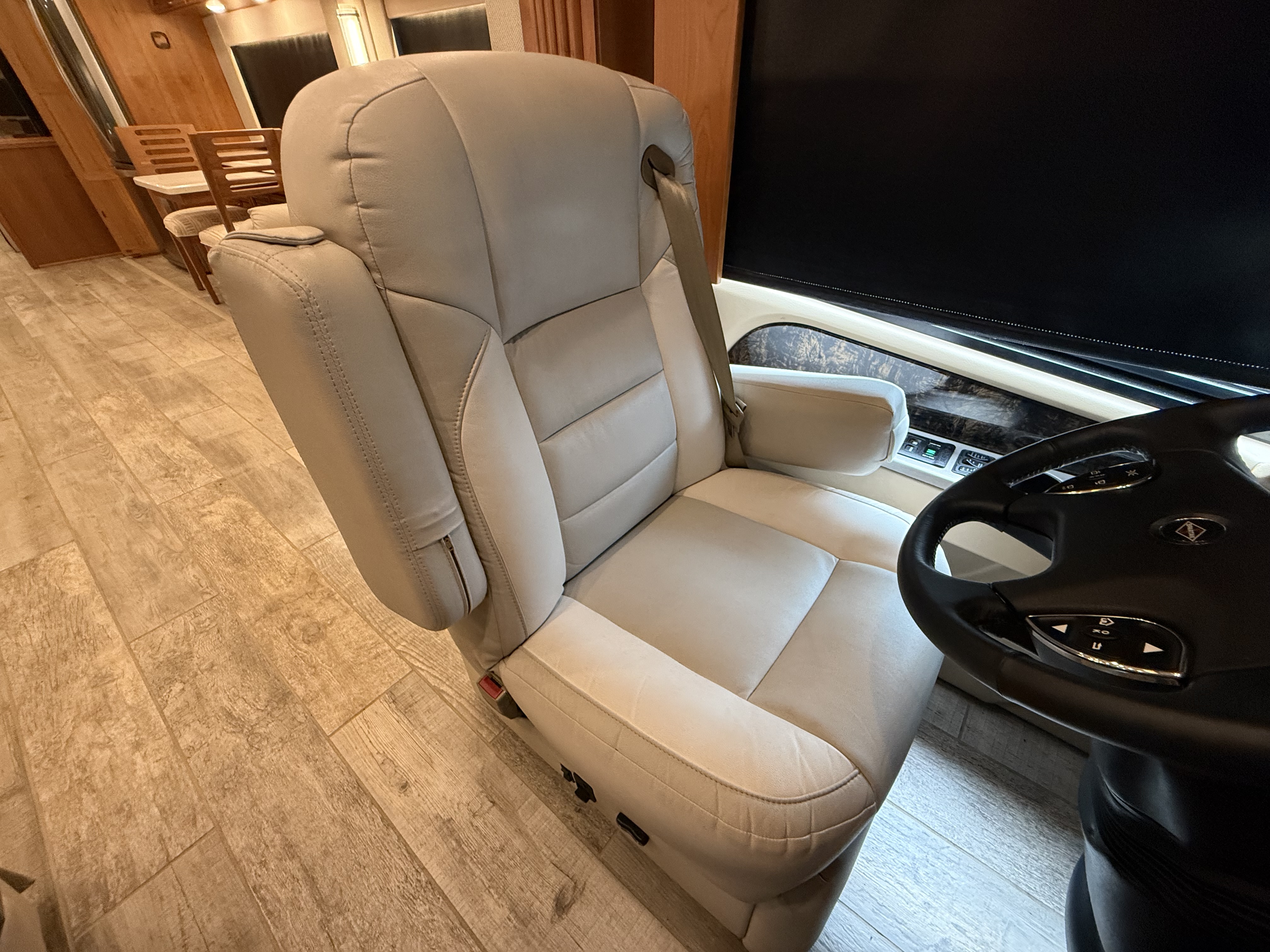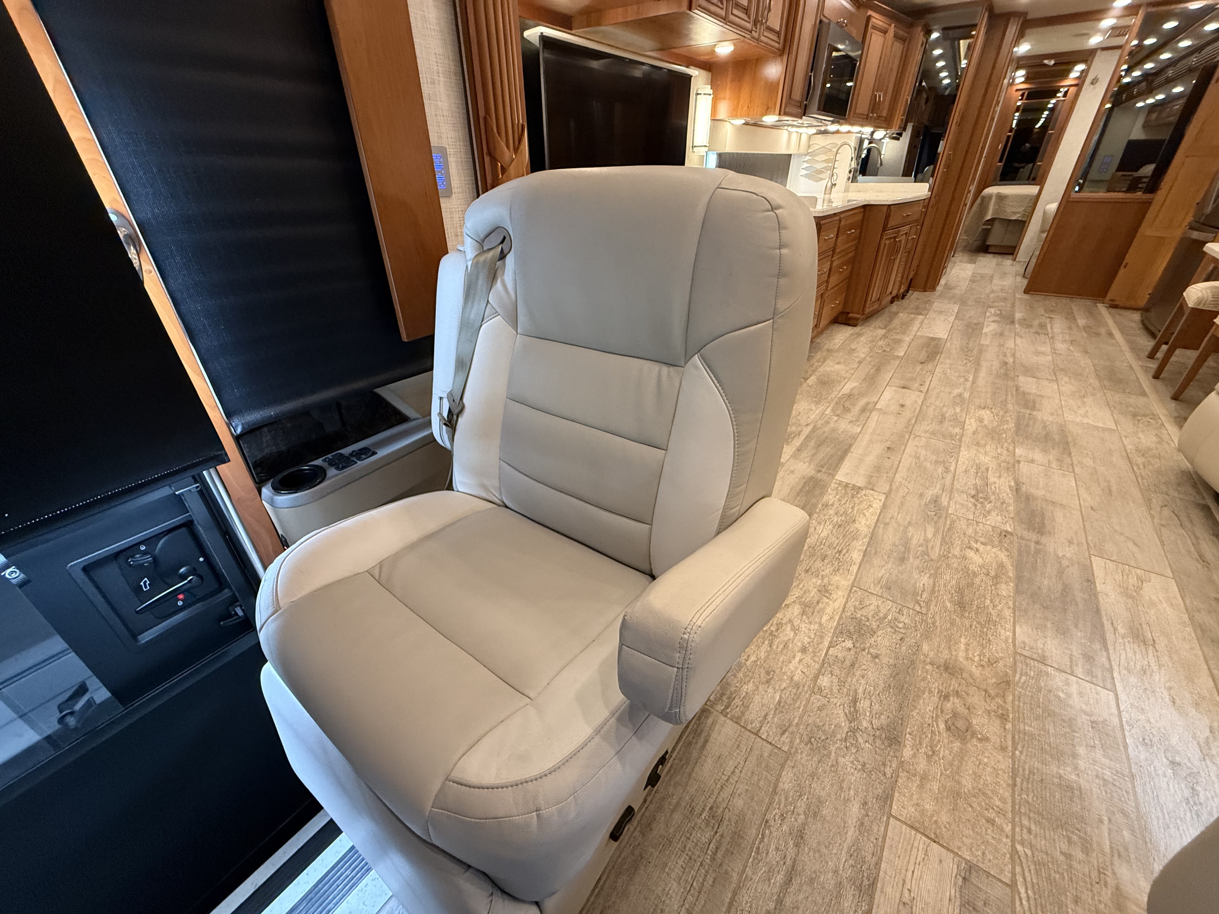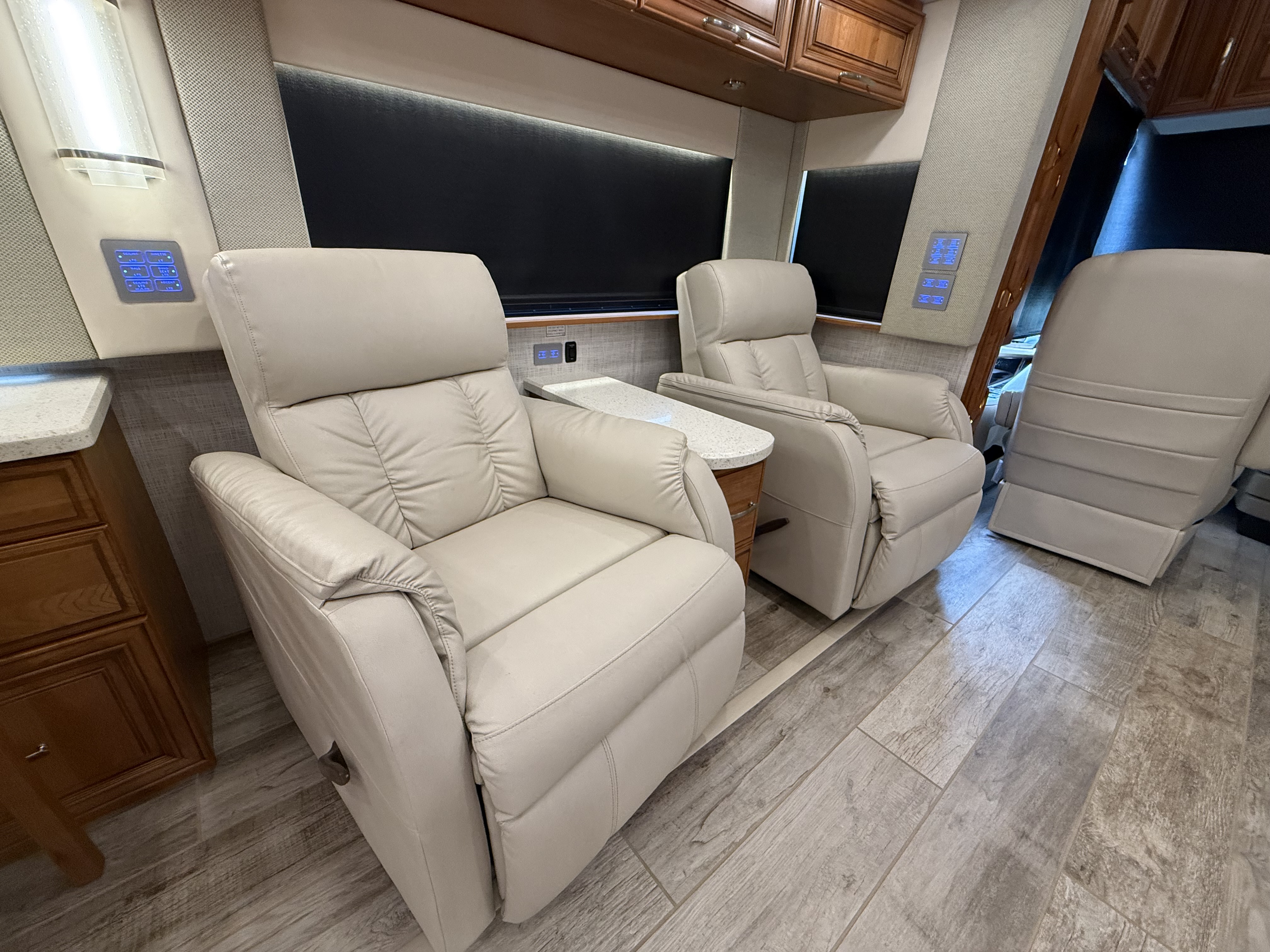 On top of 45 feet of gorgeous herringbone-patterned porcelain tile, floor plan 4579 lets you select between a new chaise lounge or a pair of recliners split by a solid-surface lampstand. And for journeying to the next destination, heated captains chairs include a queen-sized passenger seat with a footrest. There is even a dashboard-mounted wireless charging pad for your mobile devices.