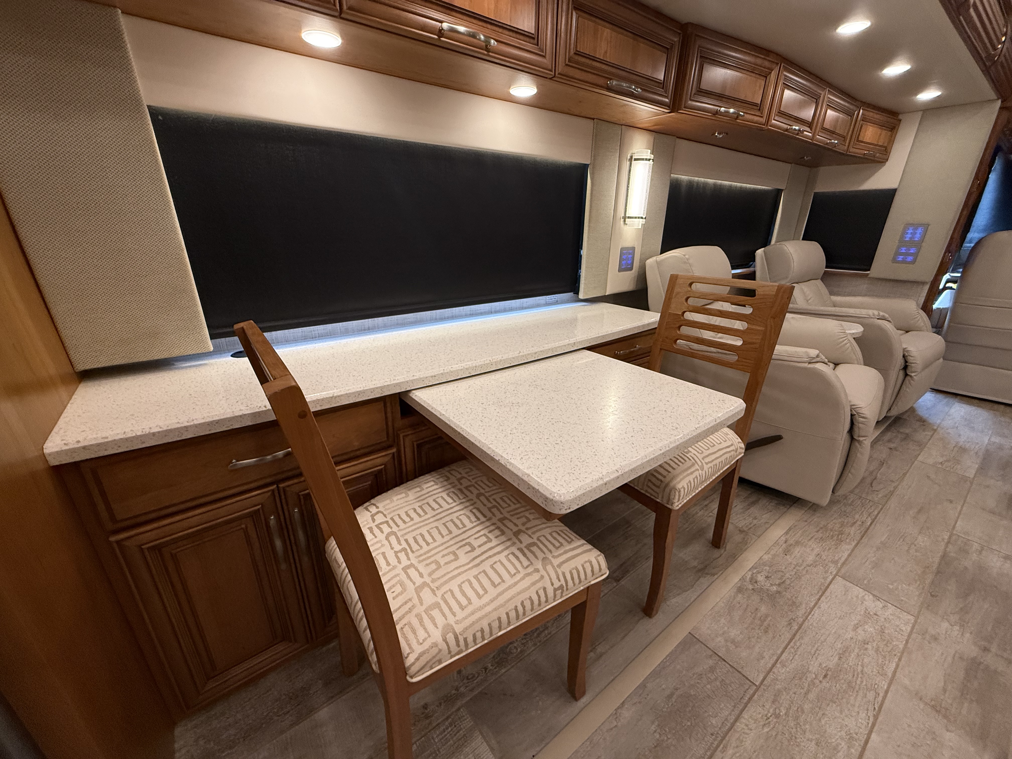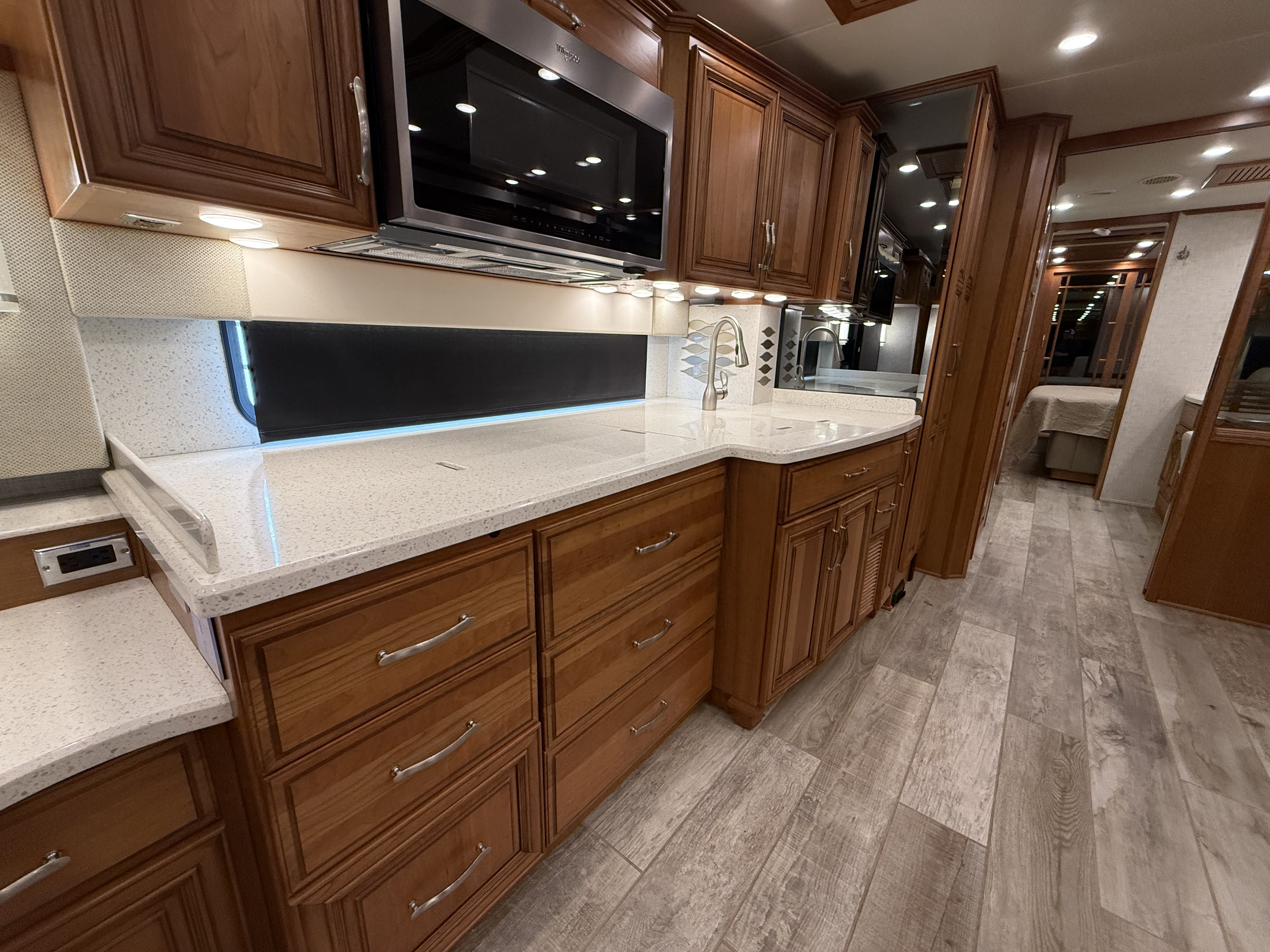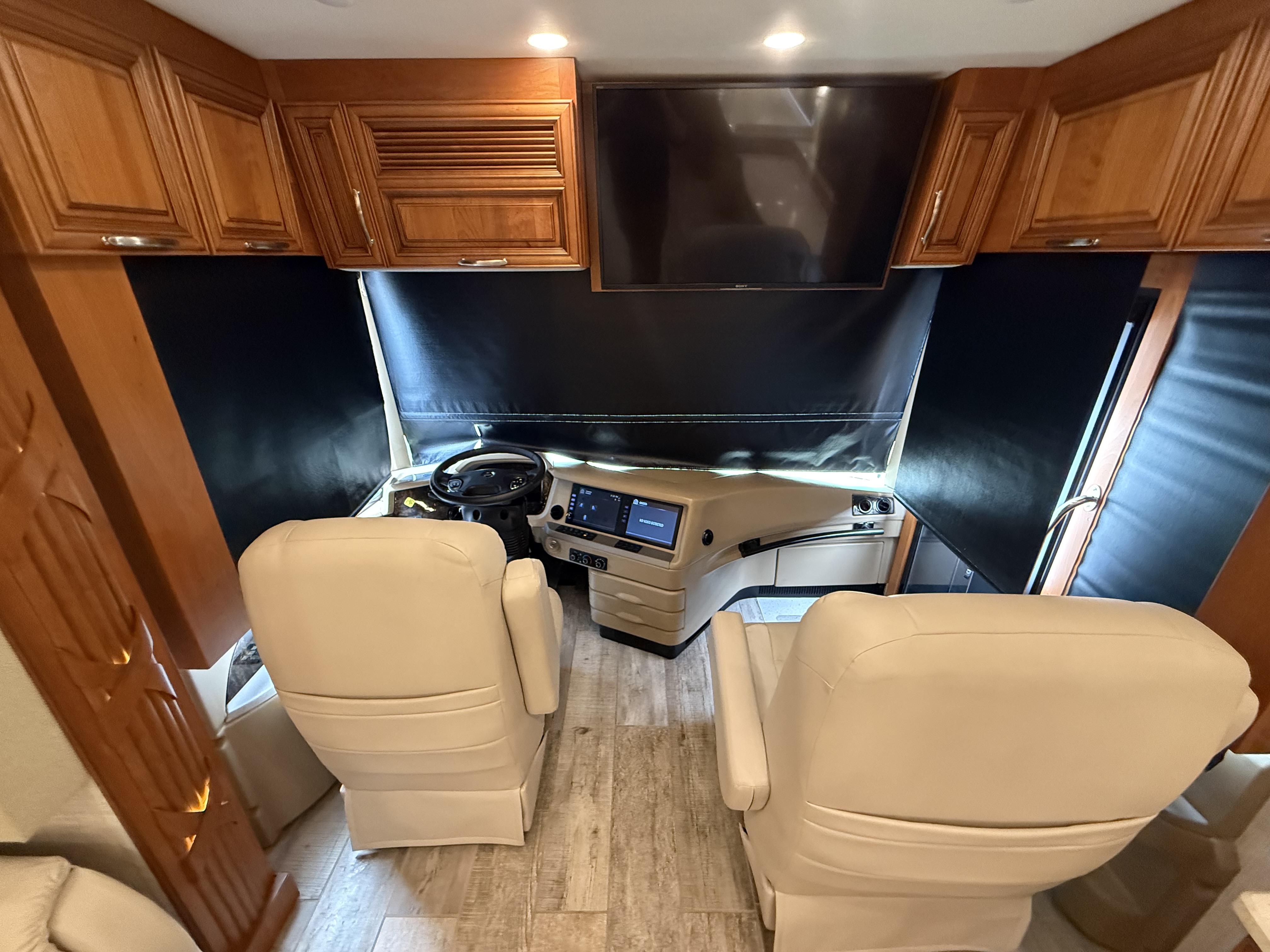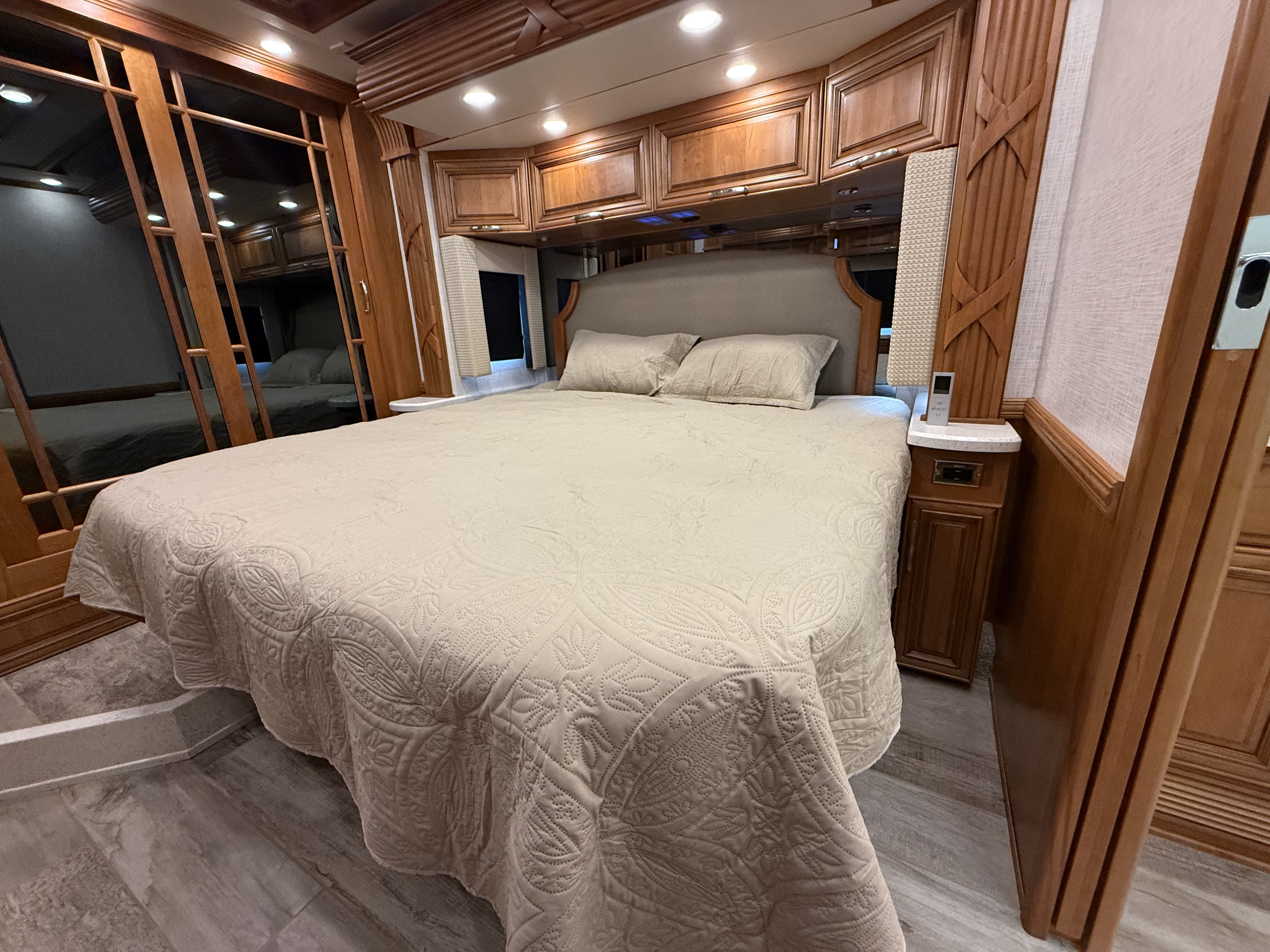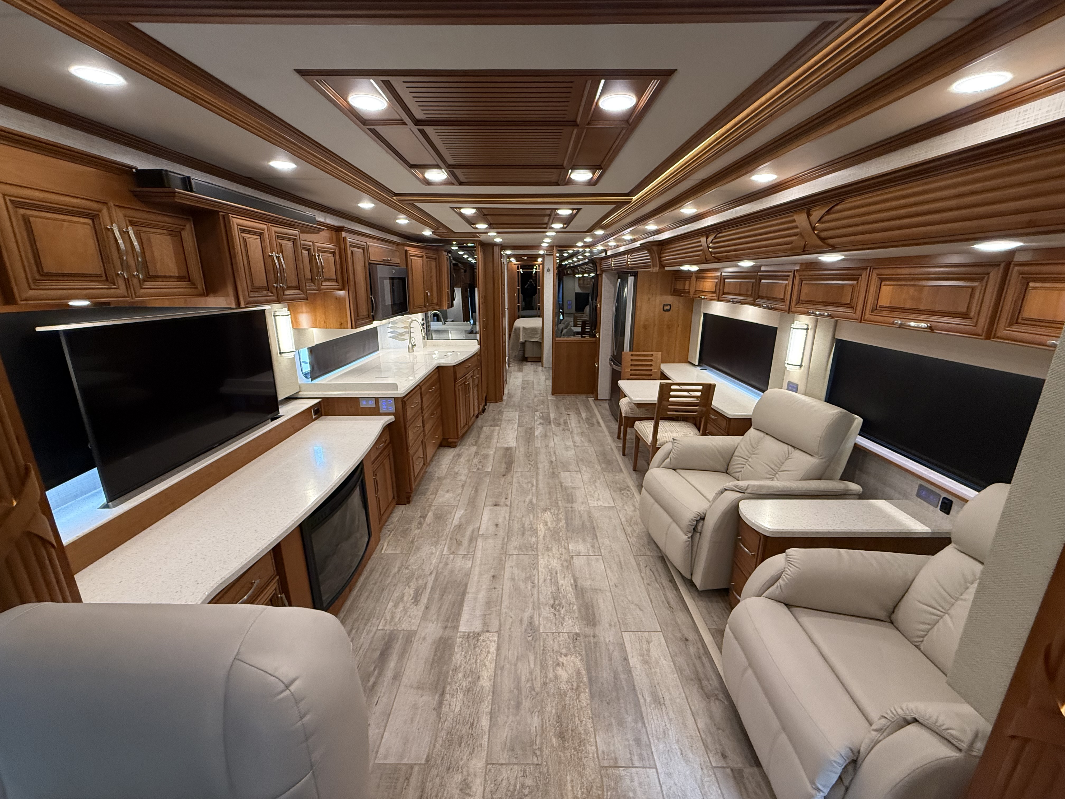 On top of 45 feet of gorgeous herringbone-patterned porcelain tile, floor plan 4579 lets you select between a new chaise lounge or a pair of recliners split by a solid-surface lampstand. And for journeying to the next destination, heated captains chairs include a queen-sized passenger seat with a footrest. There is even a dashboard-mounted wireless charging pad for your mobile devices.
