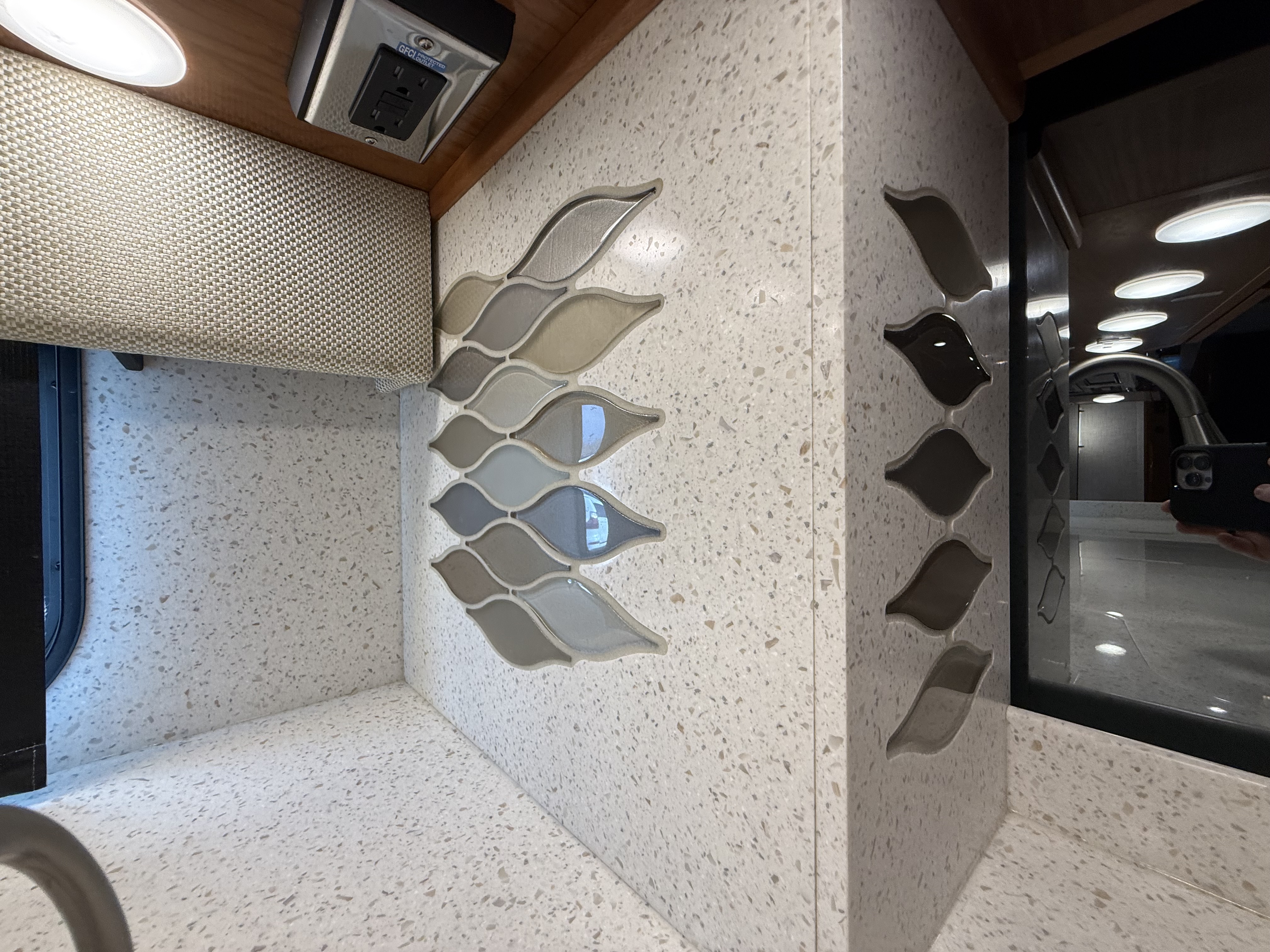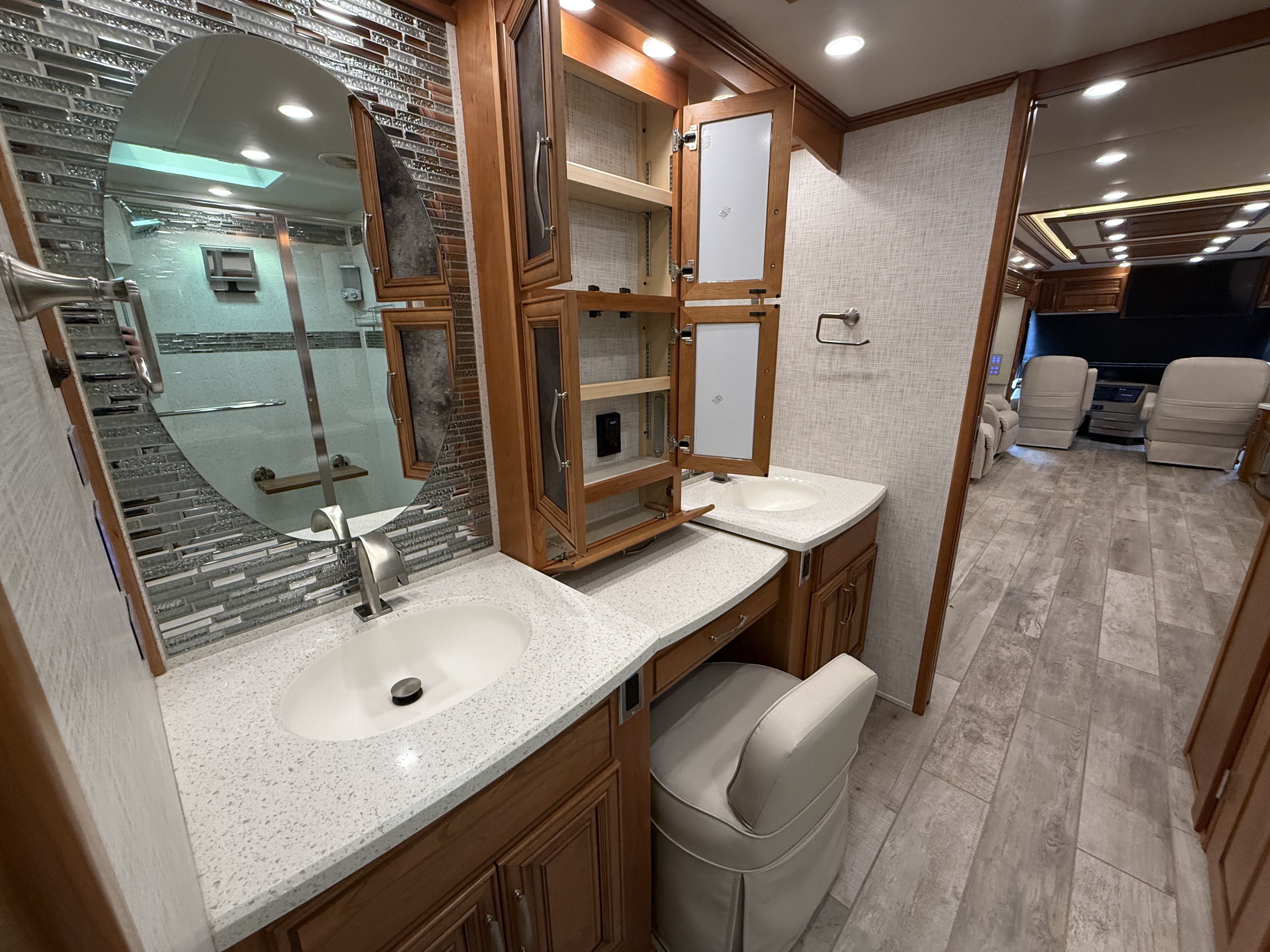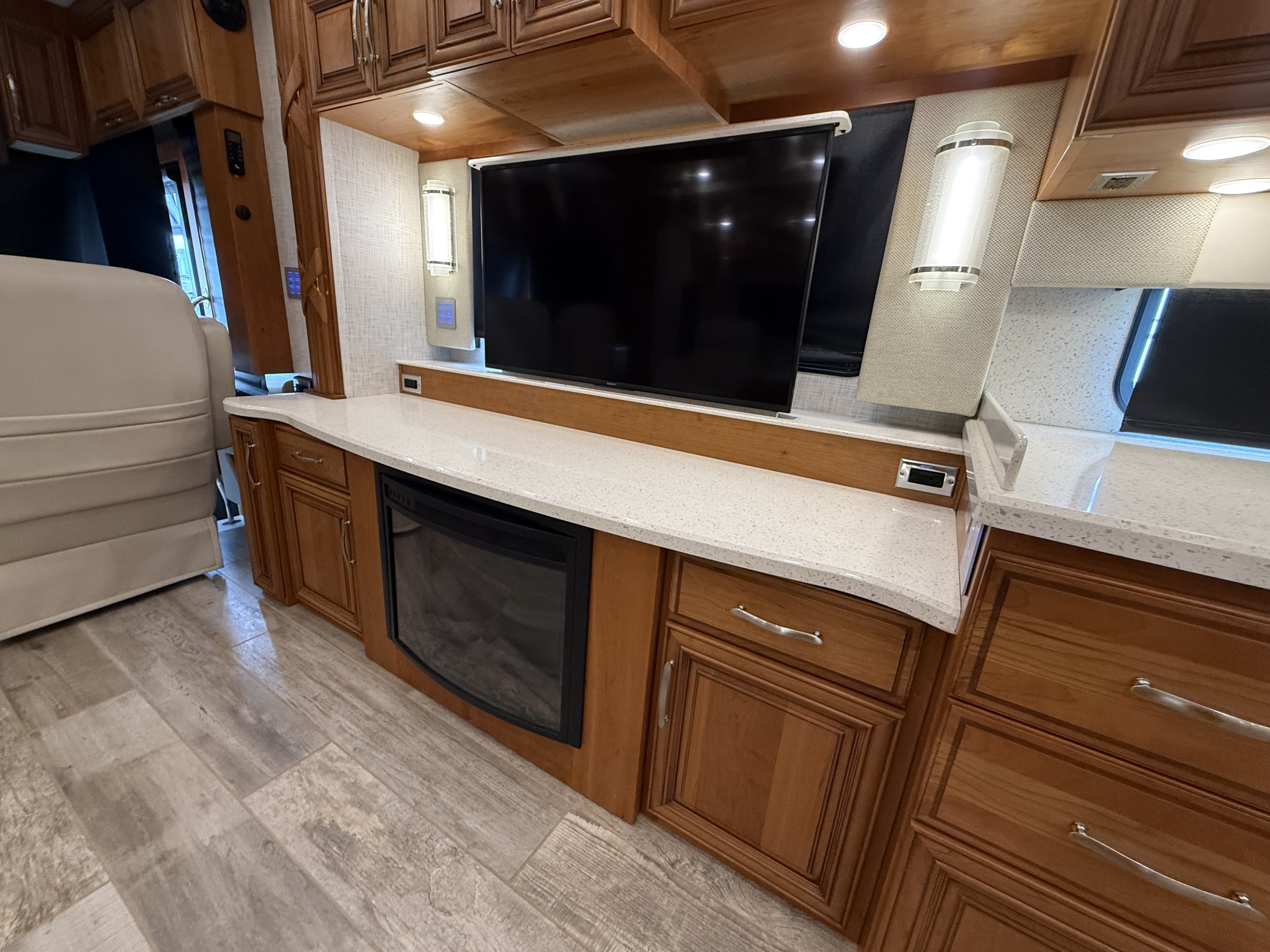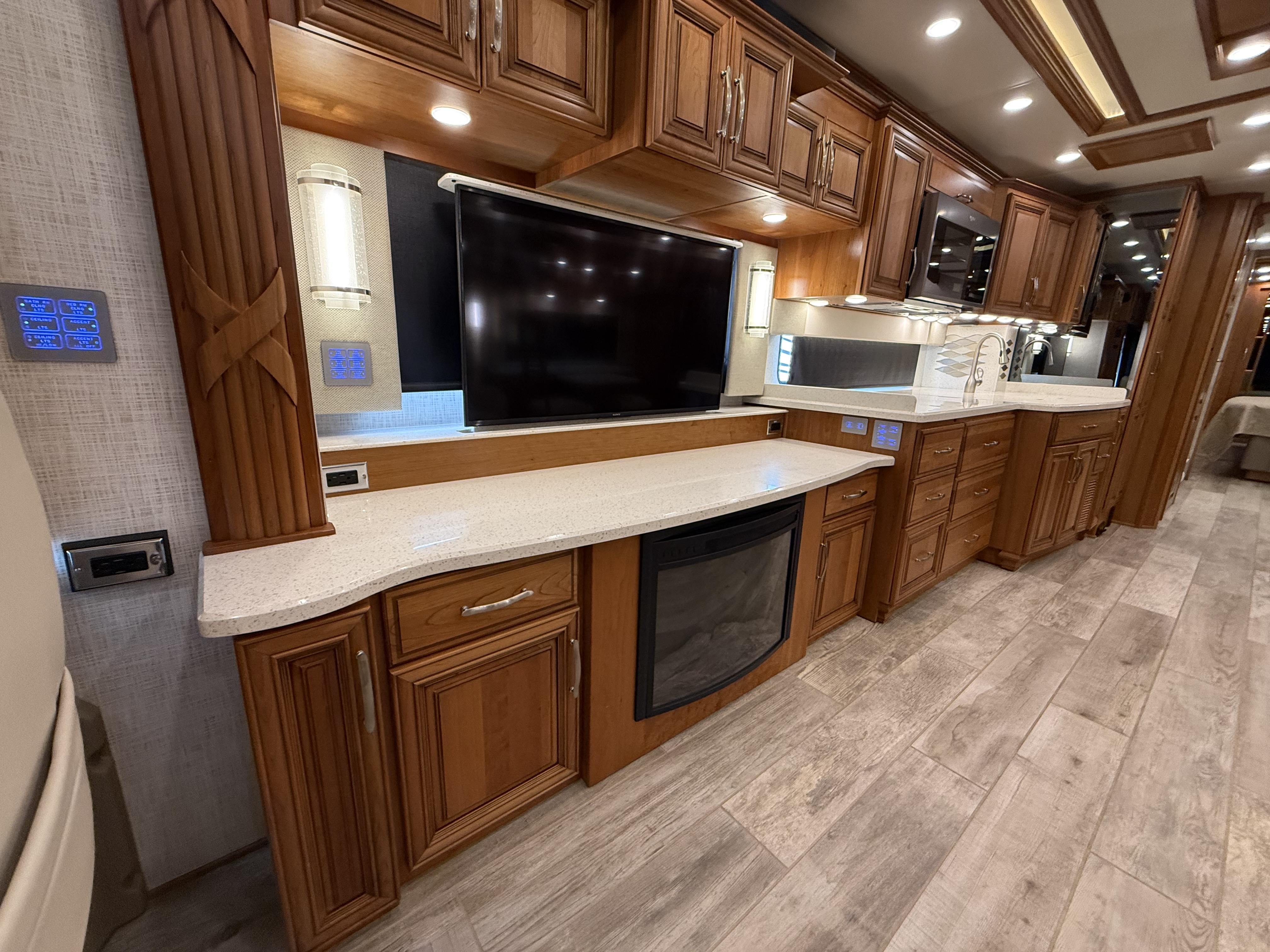 On top of 45 feet of gorgeous herringbone-patterned porcelain tile, floor plan 4579 lets you select between a new chaise lounge or a pair of recliners split by a solid-surface lampstand. And for journeying to the next destination, heated captains chairs include a queen-sized passenger seat with a footrest. There is even a dashboard-mounted wireless charging pad for your mobile devices.