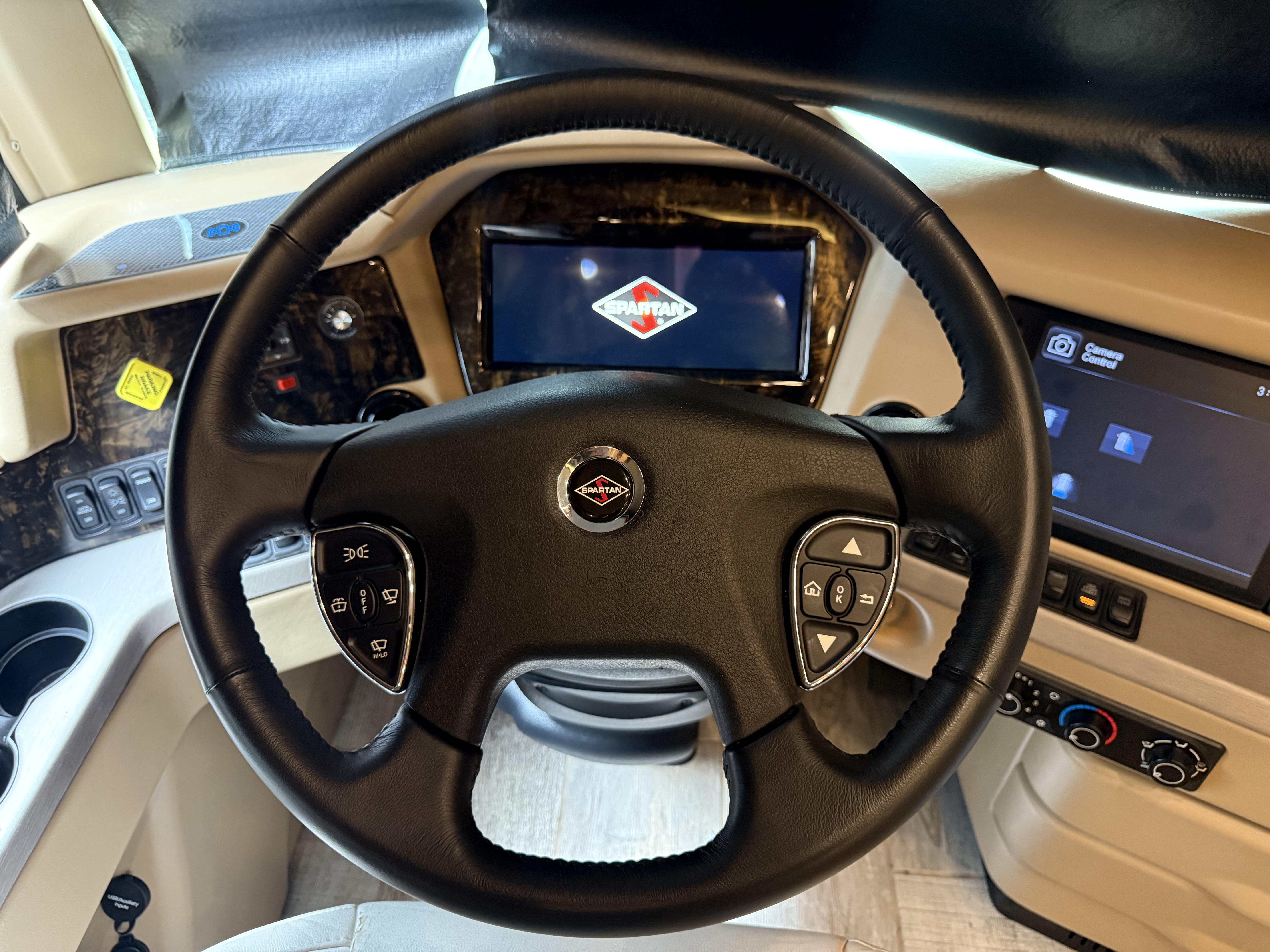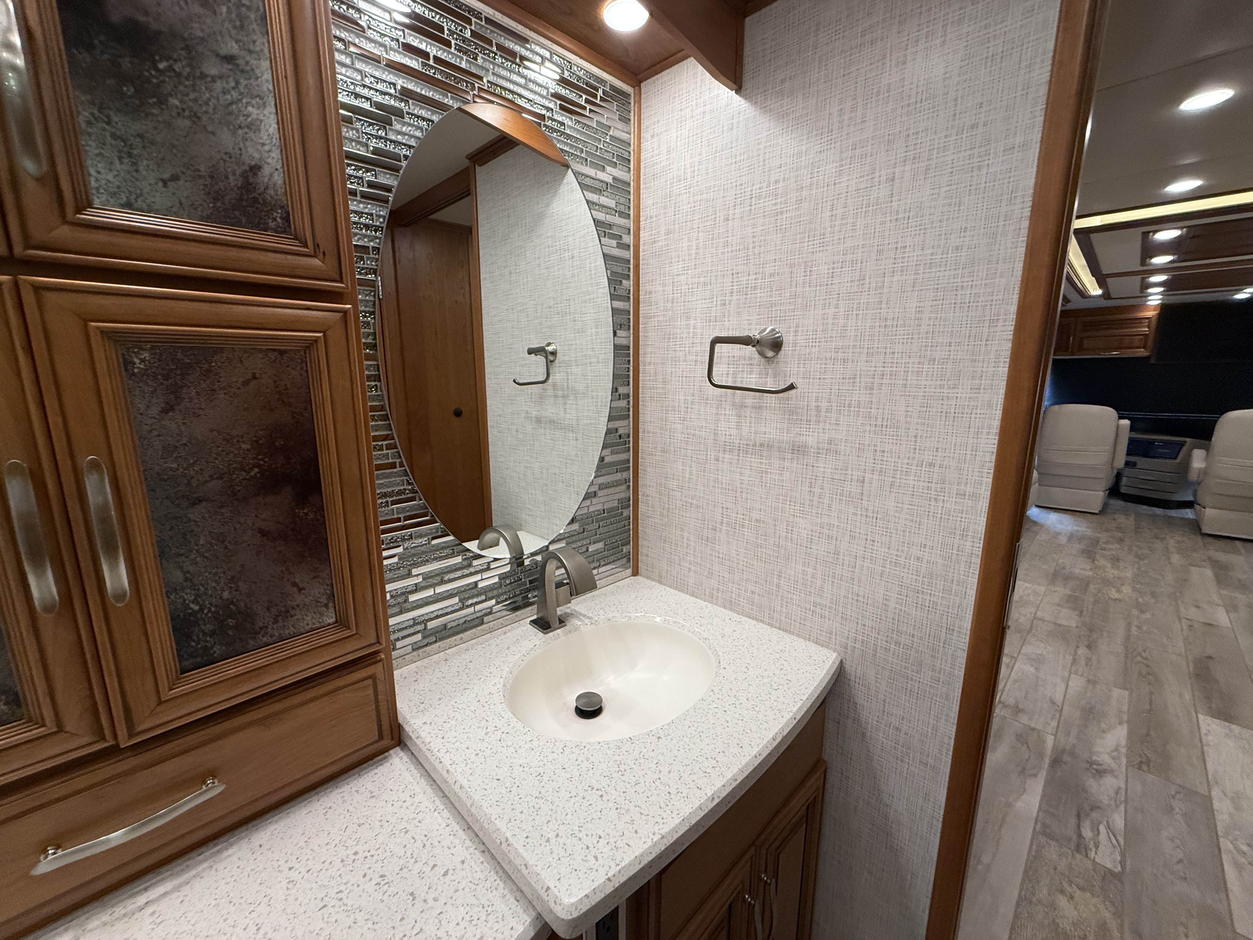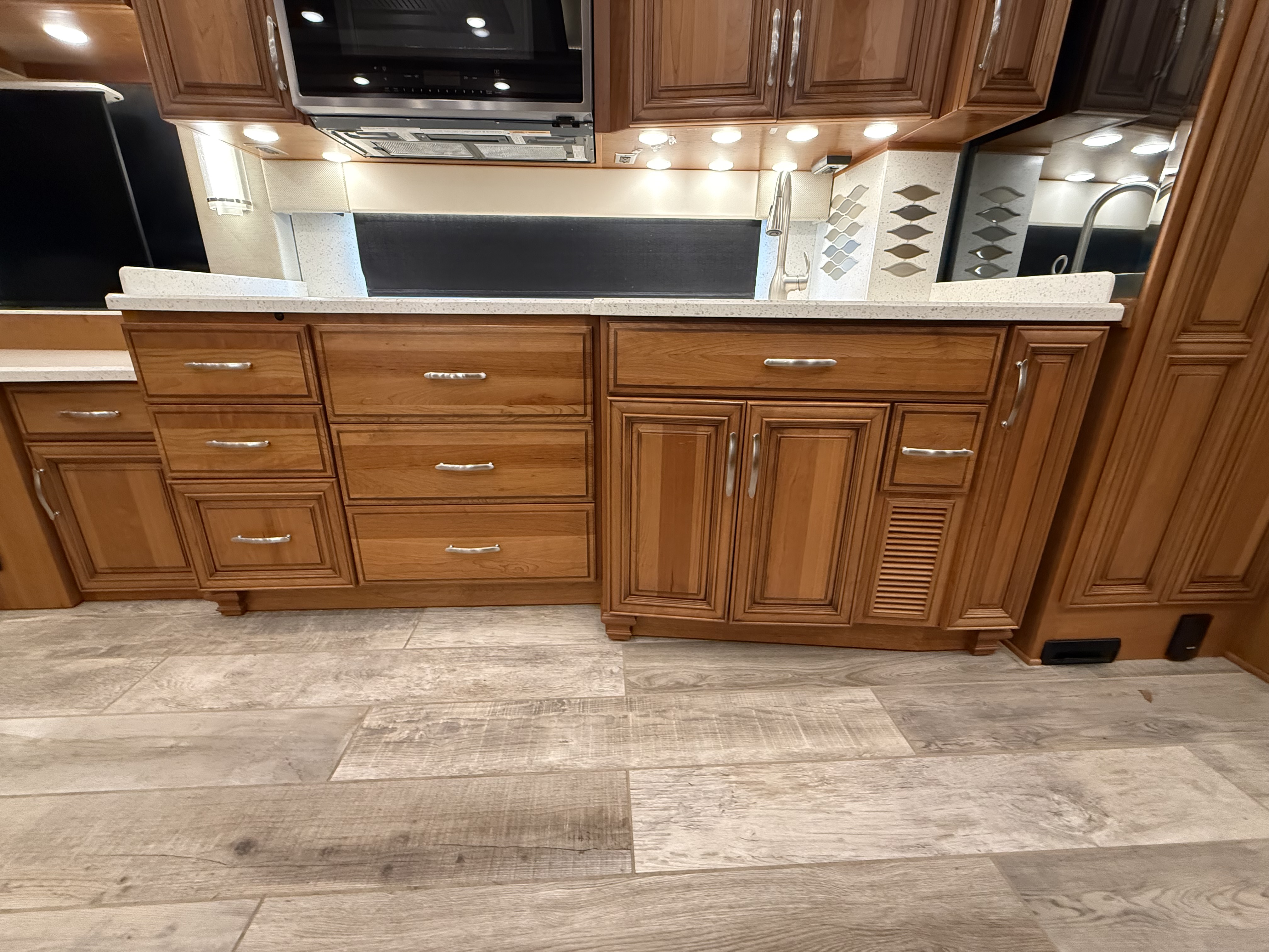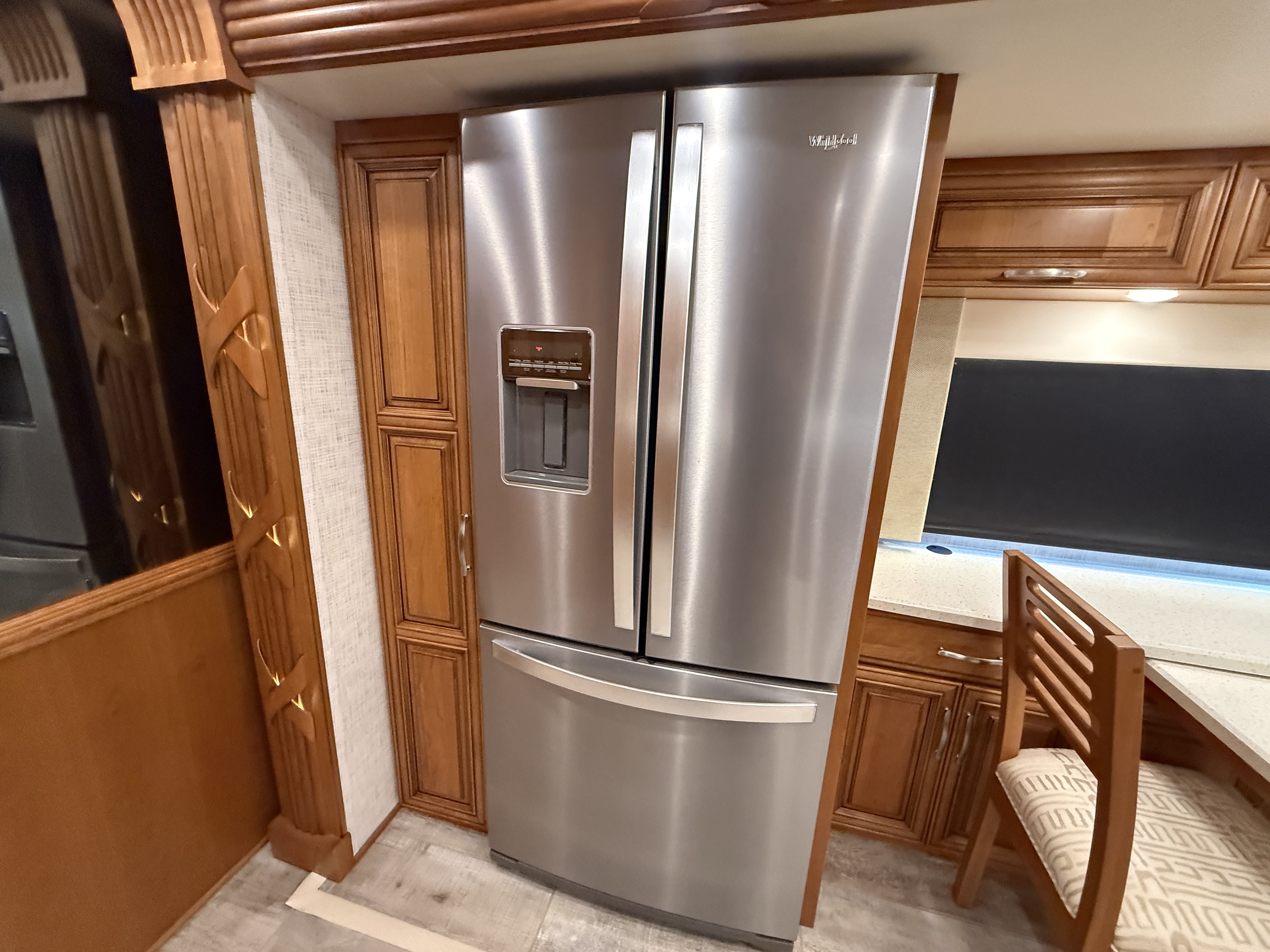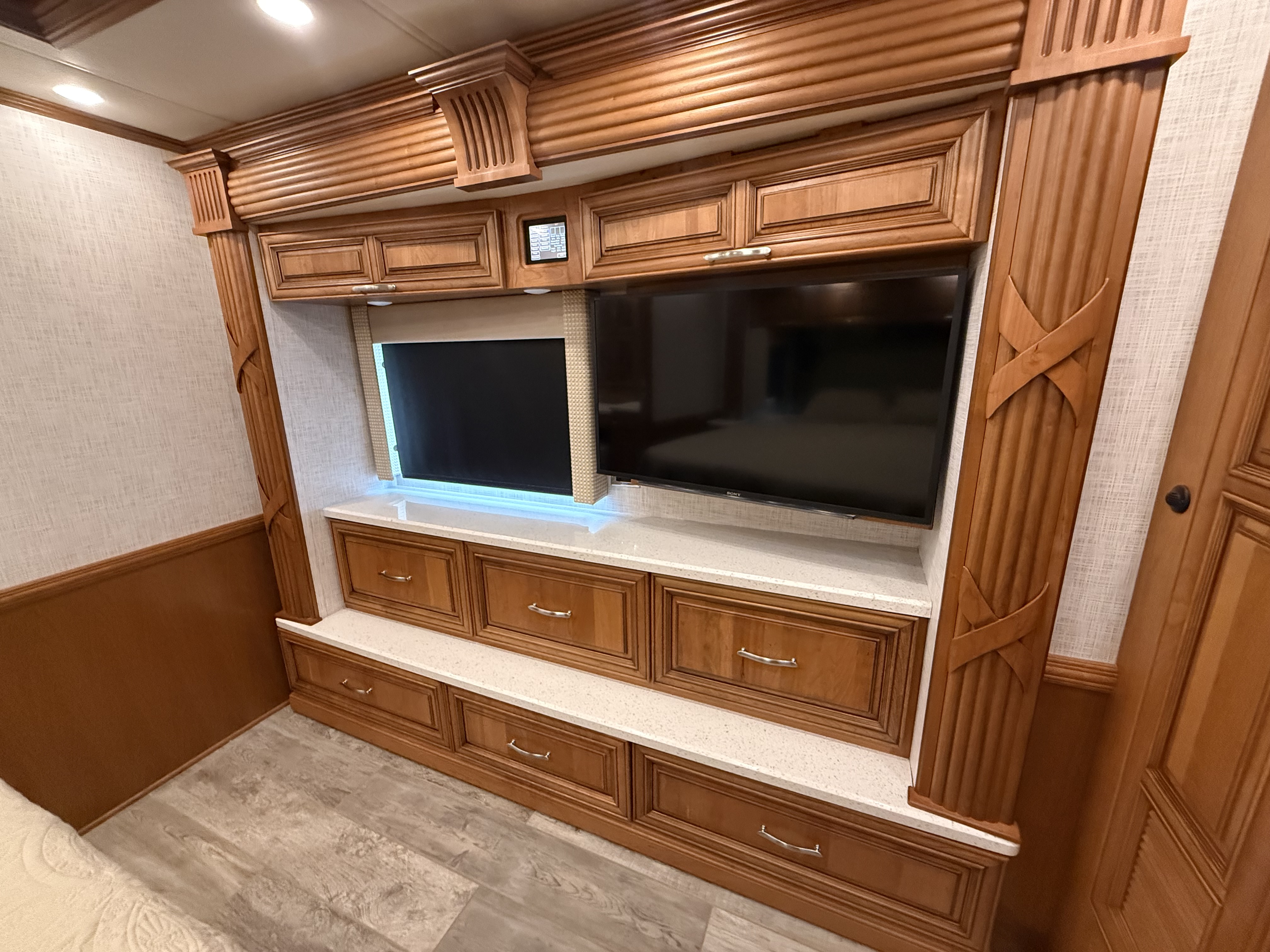 On top of 45 feet of gorgeous herringbone-patterned porcelain tile, floor plan 4579 lets you select between a new chaise lounge or a pair of recliners split by a solid-surface lampstand. And for journeying to the next destination, heated captains chairs include a queen-sized passenger seat with a footrest. There is even a dashboard-mounted wireless charging pad for your mobile devices.