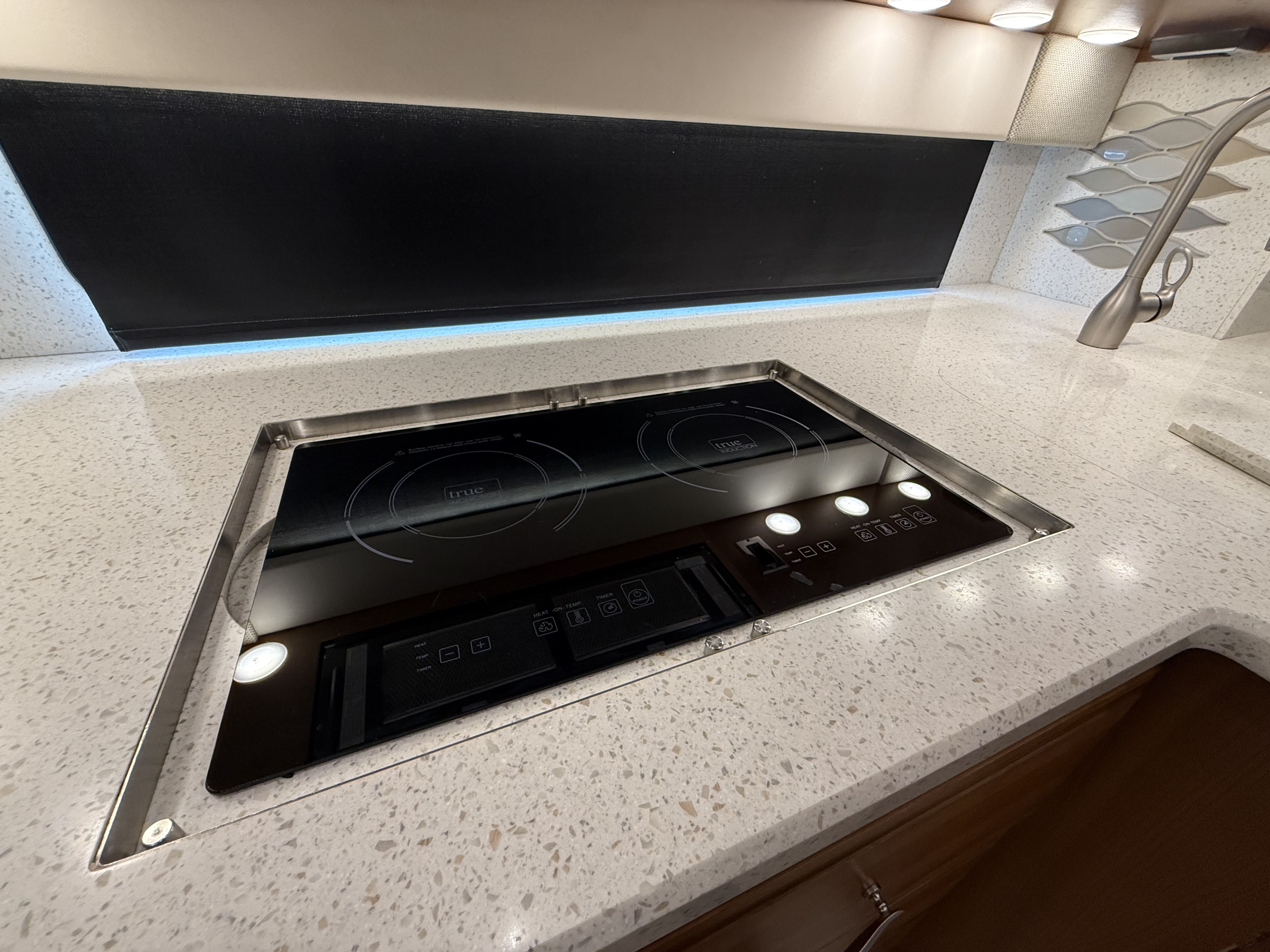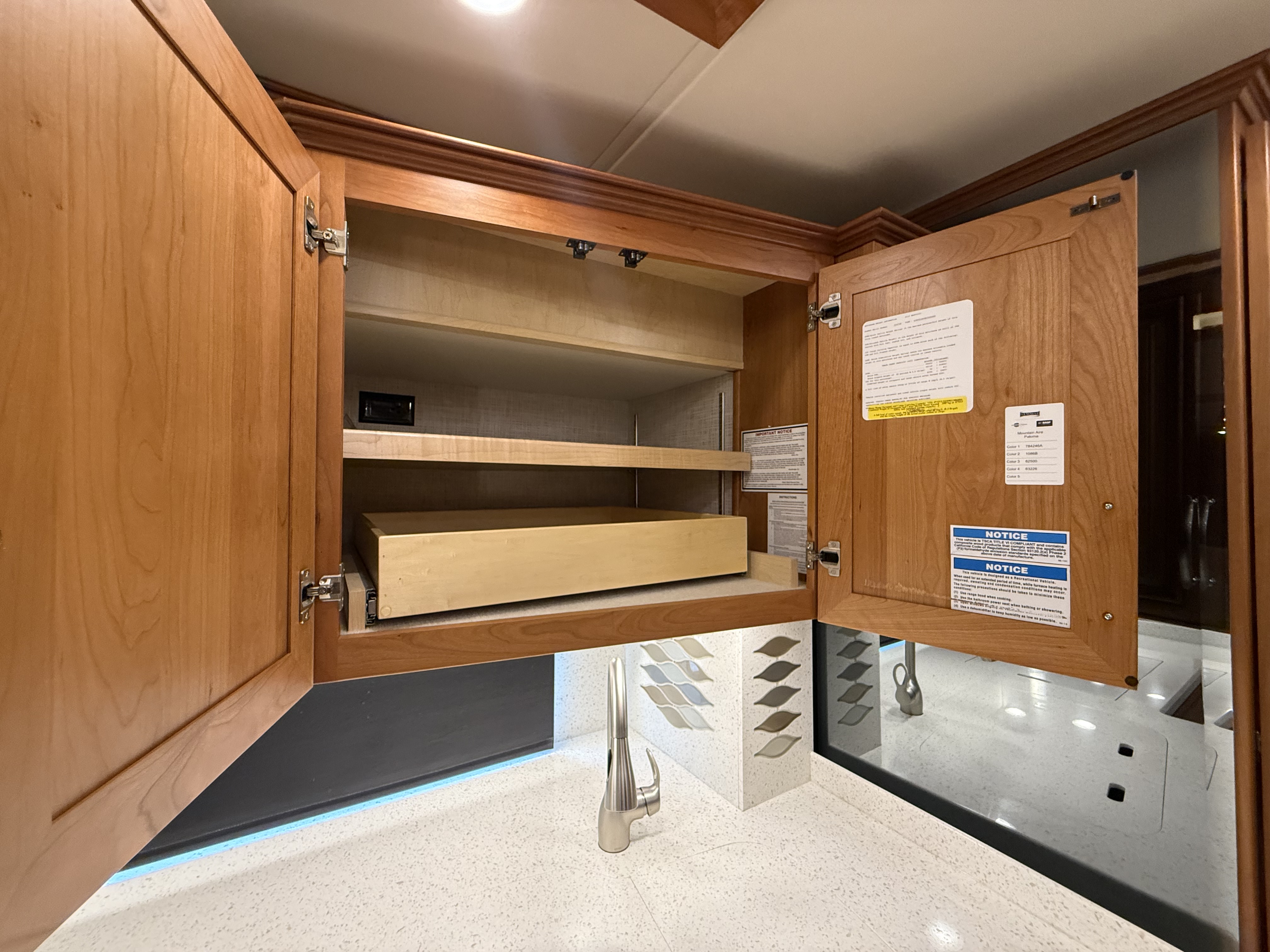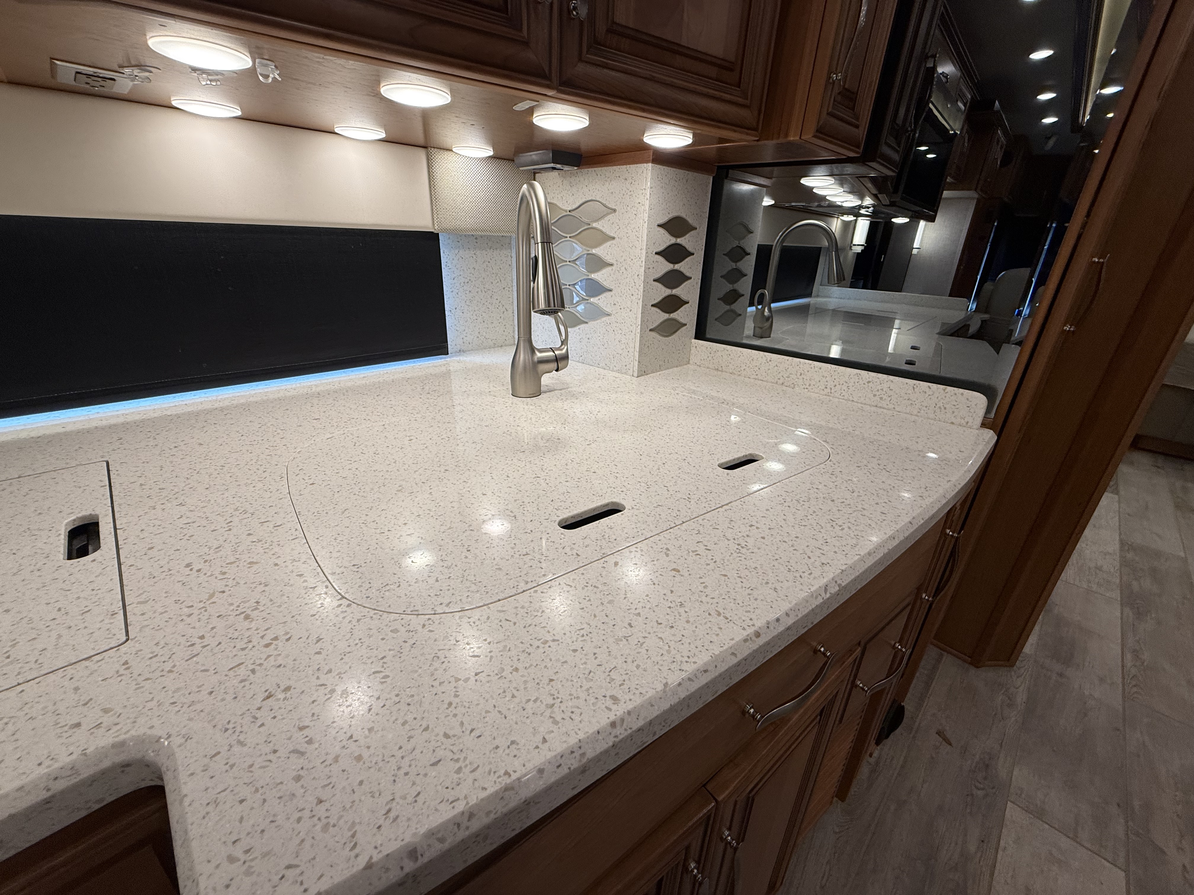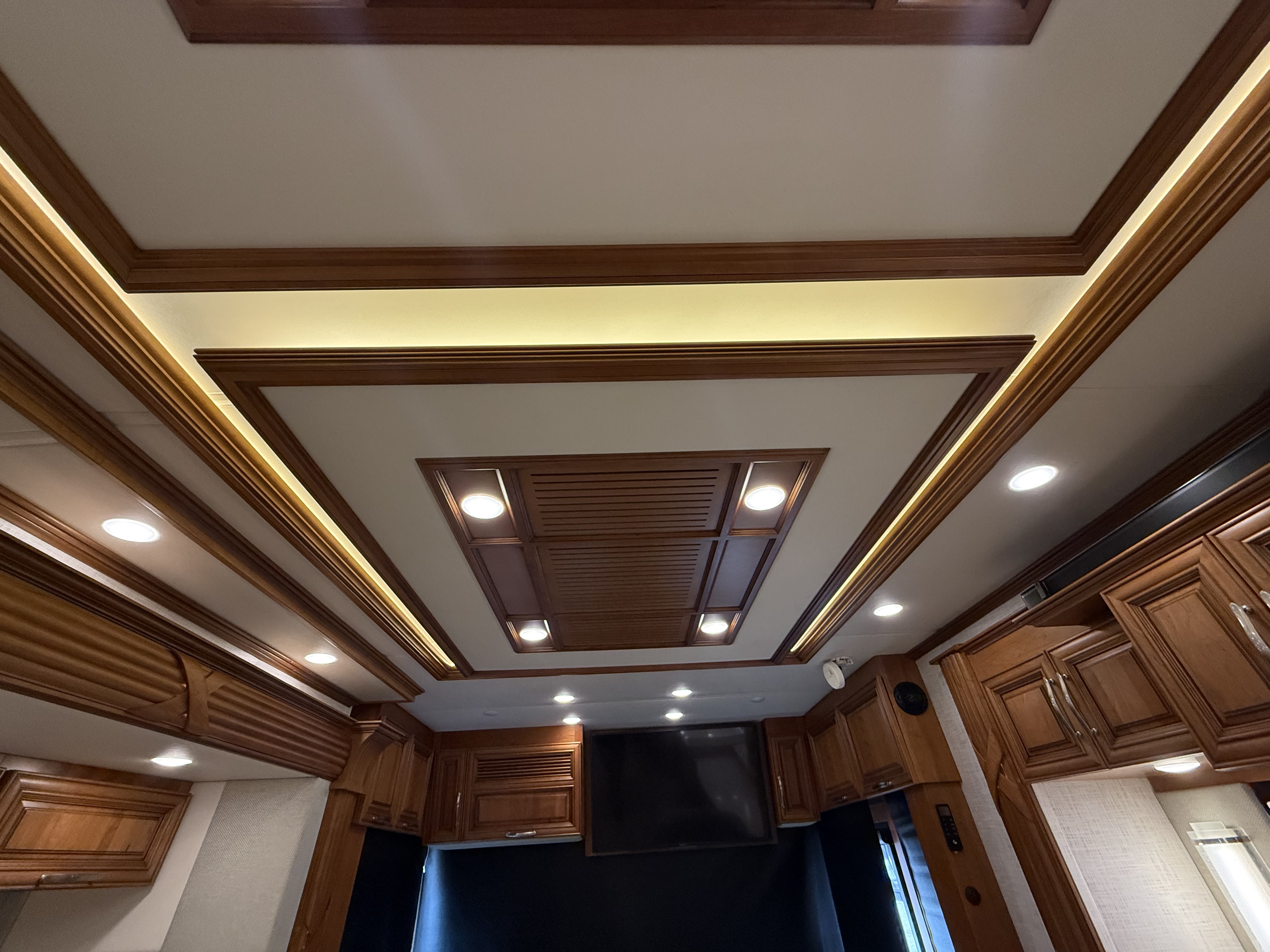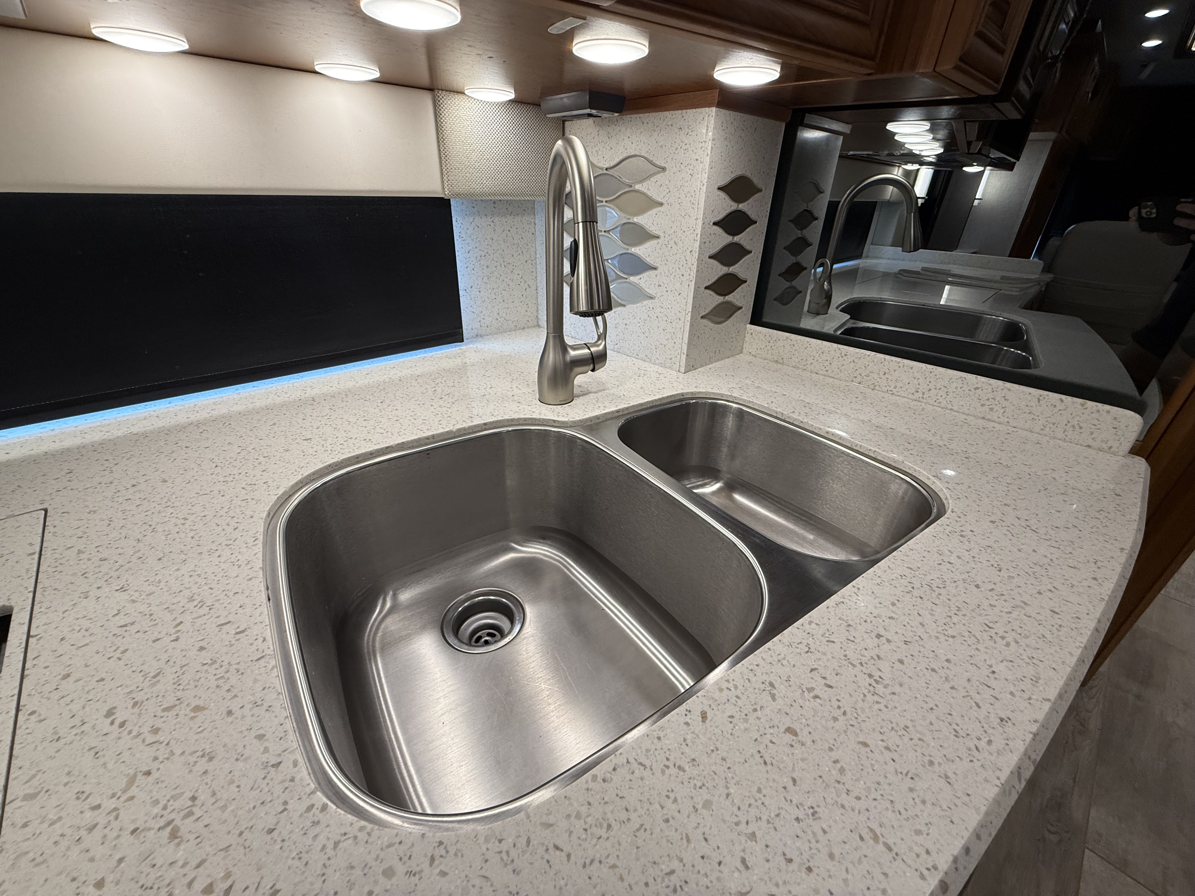 On top of 45 feet of gorgeous herringbone-patterned porcelain tile, floor plan 4579 lets you select between a new chaise lounge or a pair of recliners split by a solid-surface lampstand. And for journeying to the next destination, heated captains chairs include a queen-sized passenger seat with a footrest. There is even a dashboard-mounted wireless charging pad for your mobile devices.