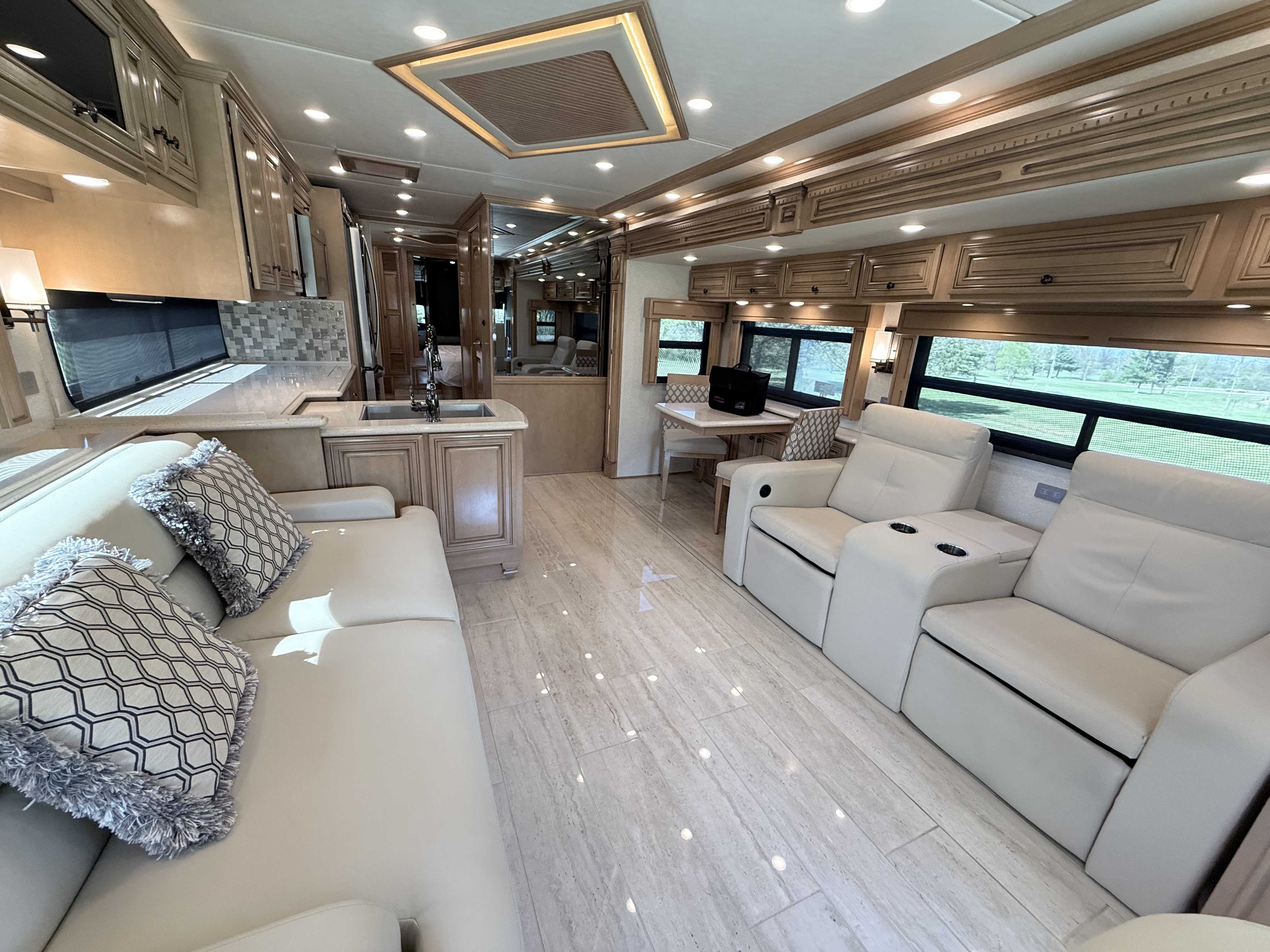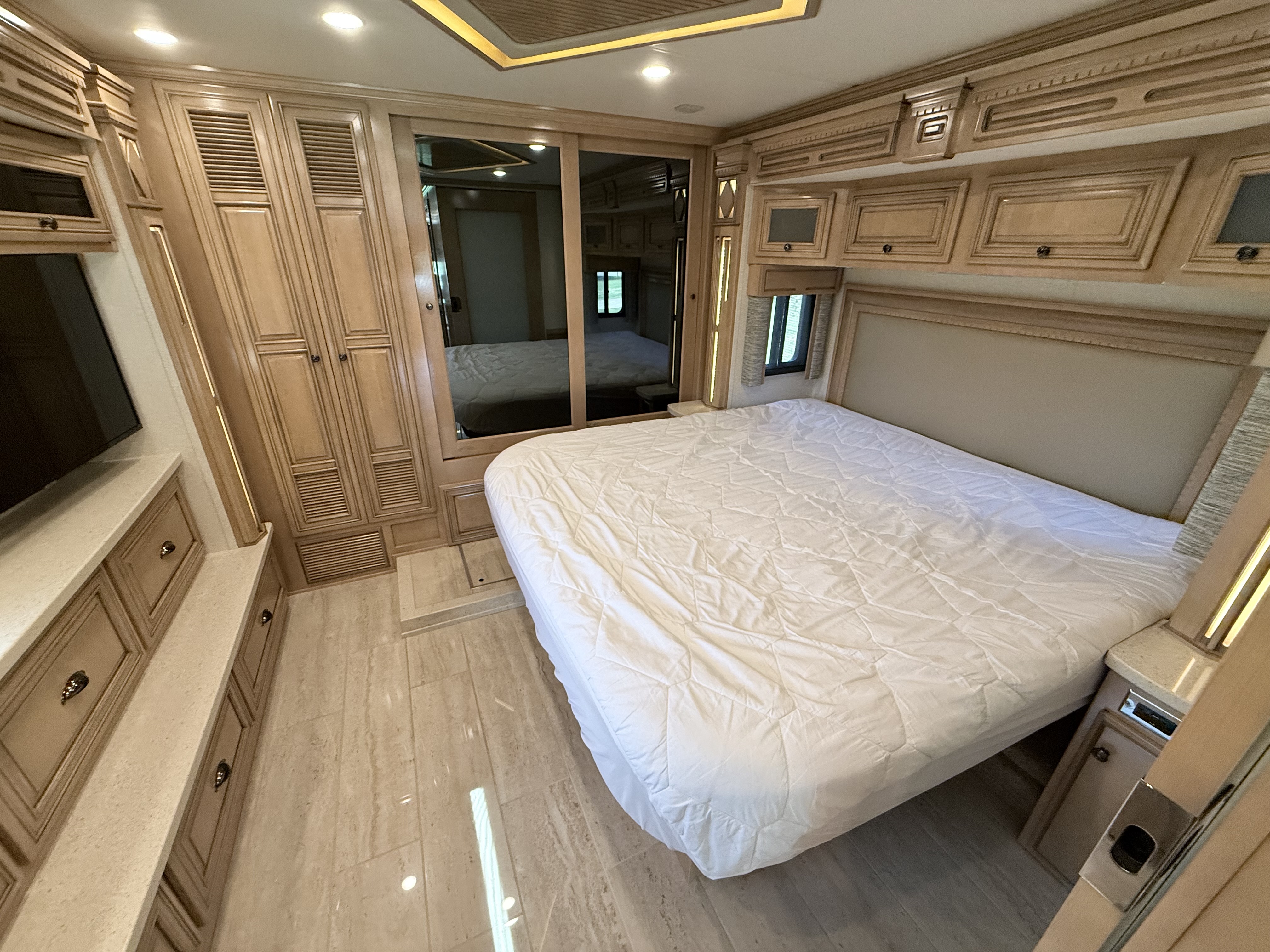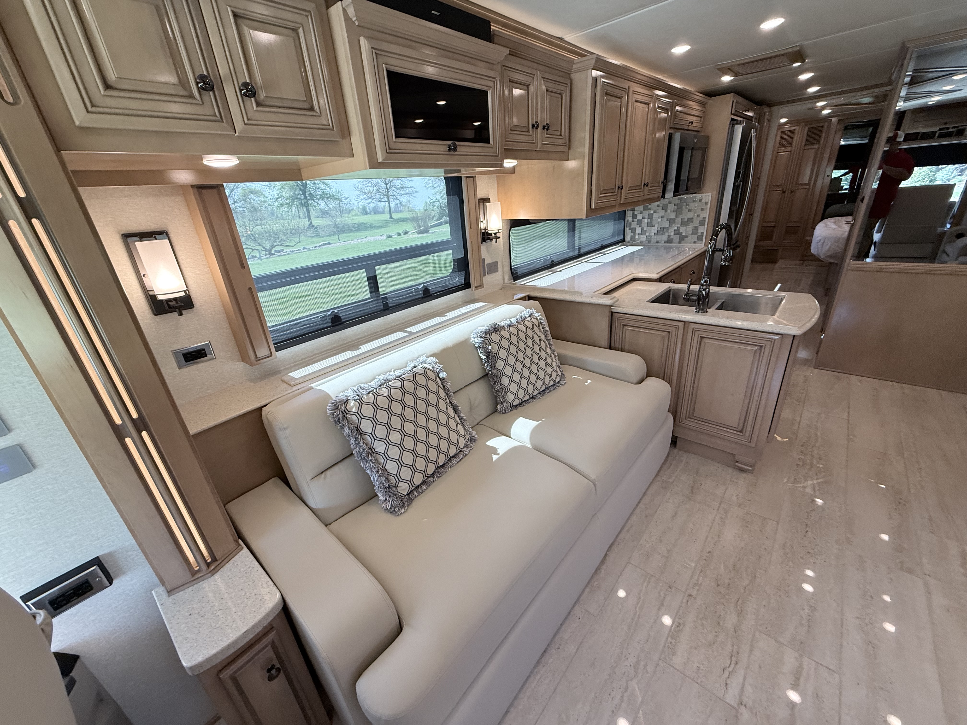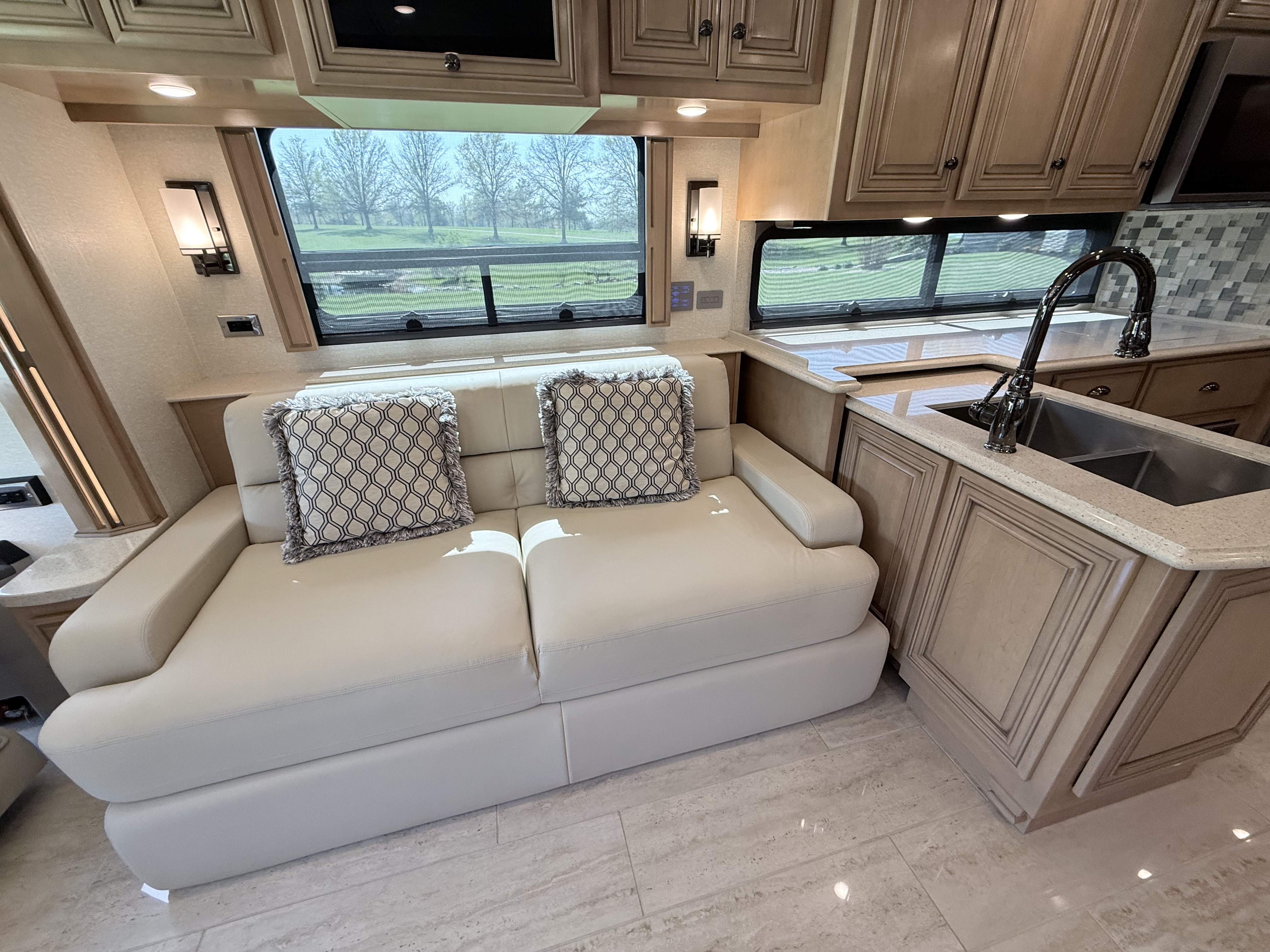 A new feature ceiling design is a highlight of the Dutch Star living room, which offers you a retractable Samsung 50” 4K LED TV with a Sony® Blu-ray player and a Bose® Solo 5 sound bar. The comfortable Flexsteel® furniture—available in a variety of configurations—invites relaxation, while optional radiant tile heat lends coziness in cooler weather. In all rear-bath floor plans, you’ll find an extra 6” of height thanks to cathedral ceilings.