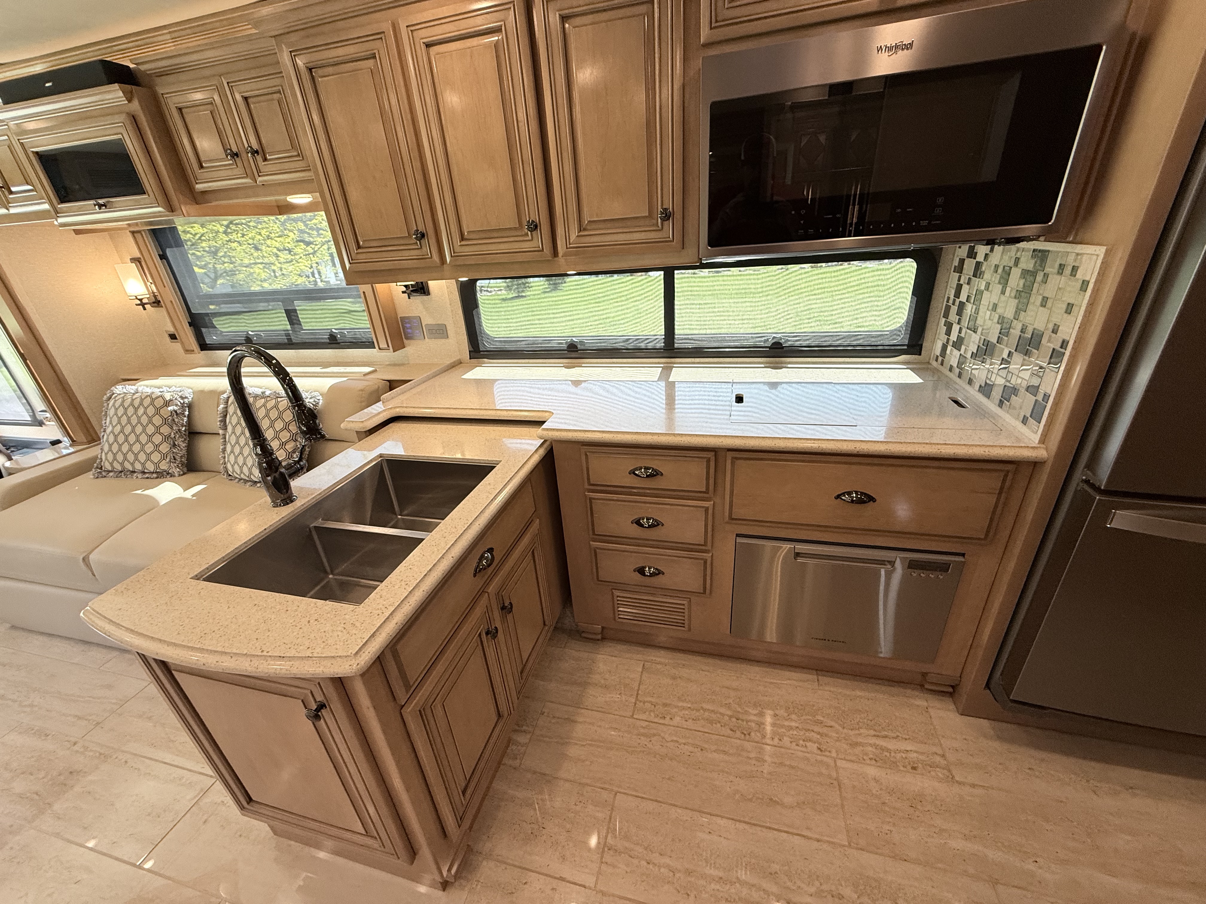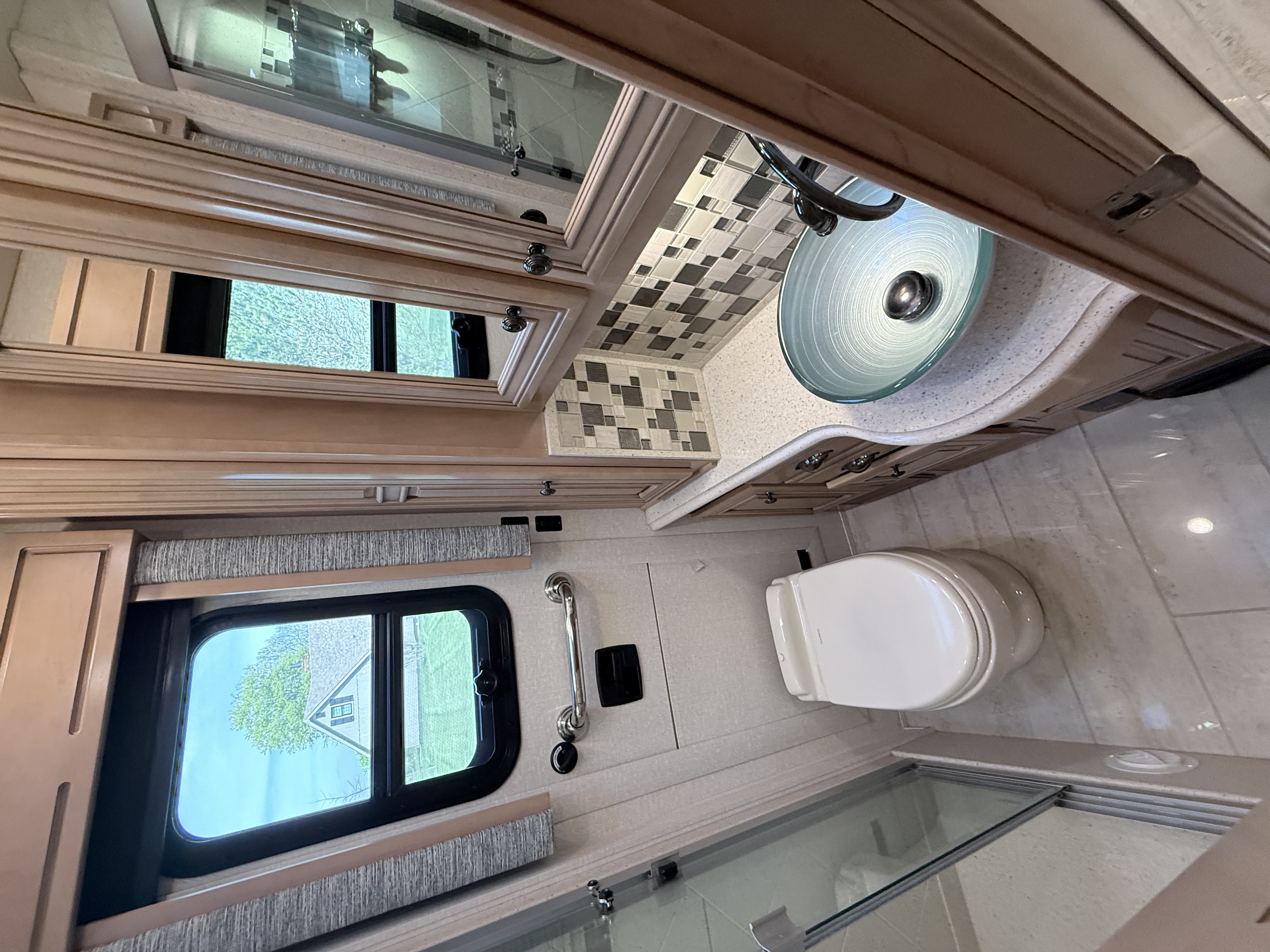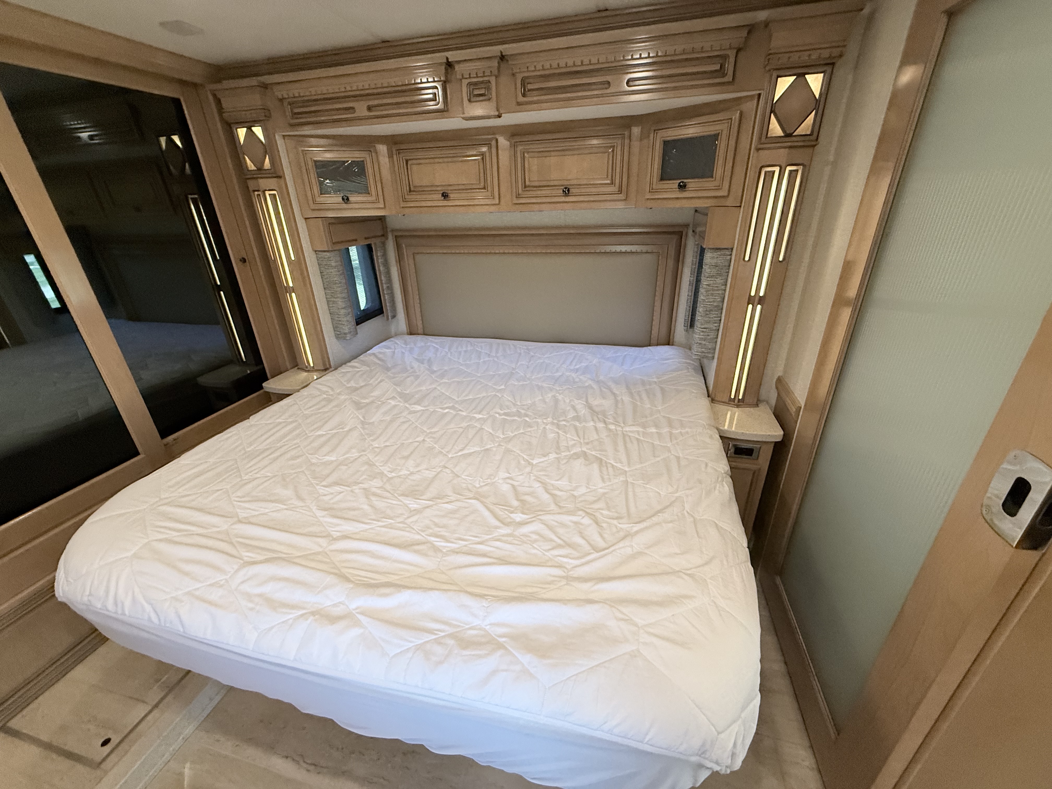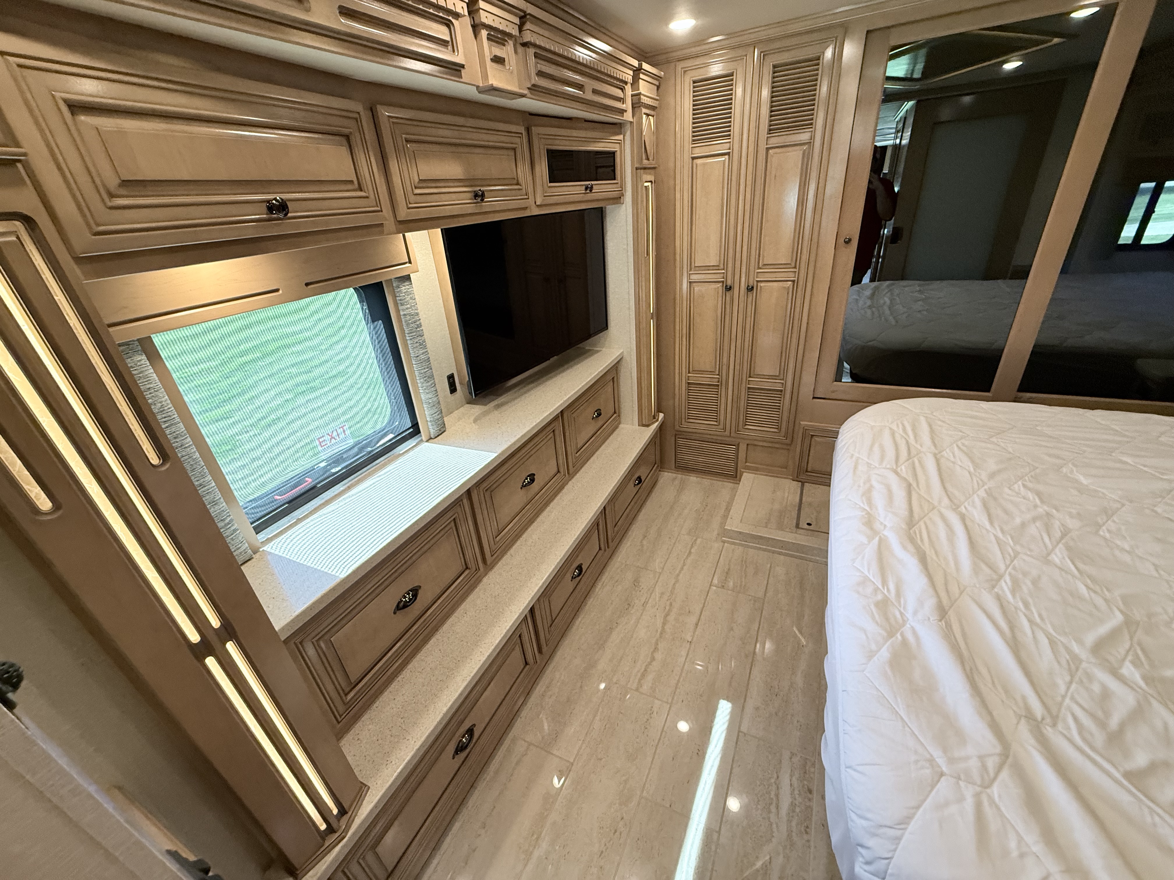 A new feature ceiling design is a highlight of the Dutch Star living room, which offers you a retractable Samsung 50” 4K LED TV with a Sony® Blu-ray player and a Bose® Solo 5 sound bar. The comfortable Flexsteel® furniture—available in a variety of configurations—invites relaxation, while optional radiant tile heat lends coziness in cooler weather. In all rear-bath floor plans, you’ll find an extra 6” of height thanks to cathedral ceilings.