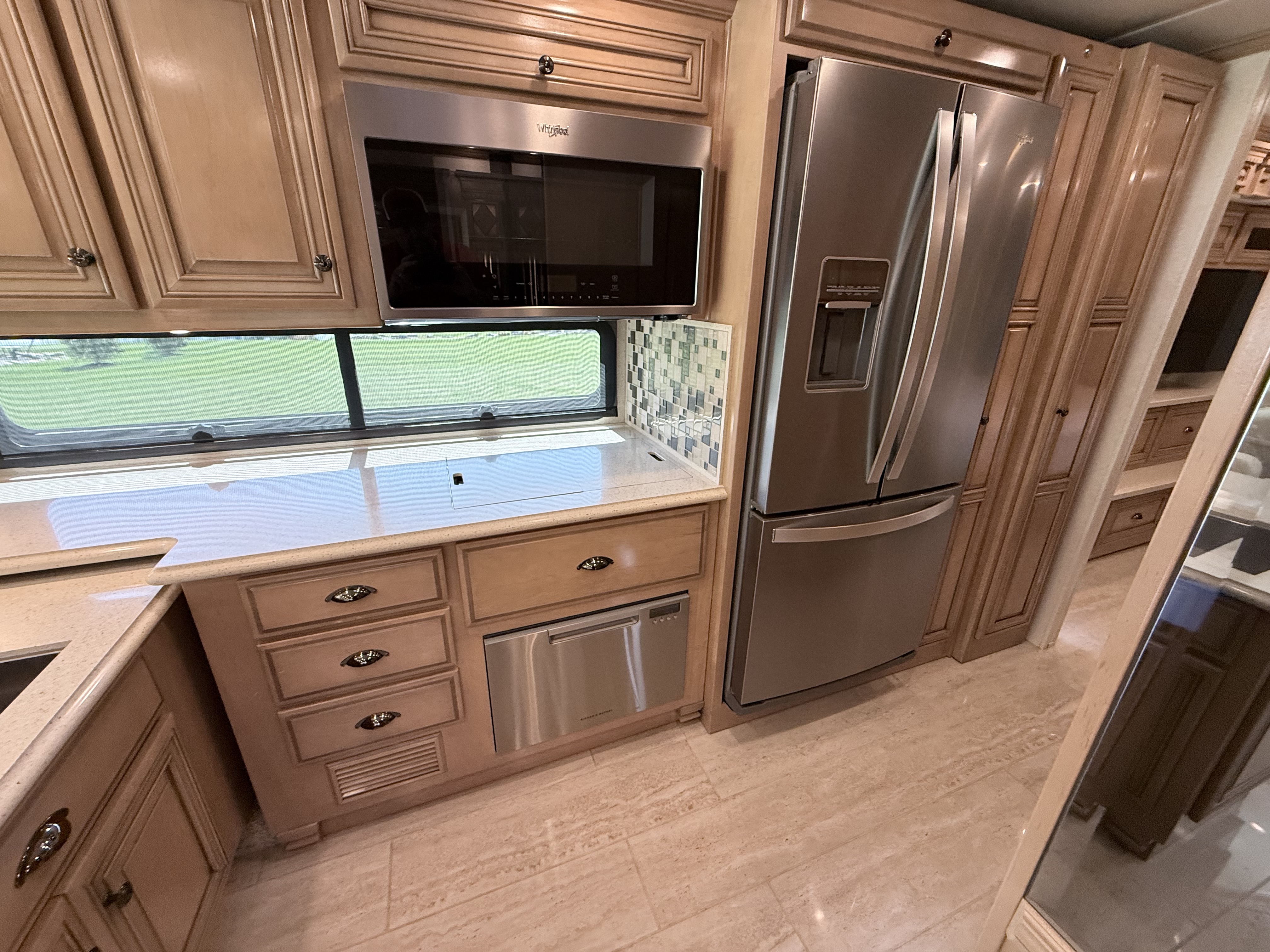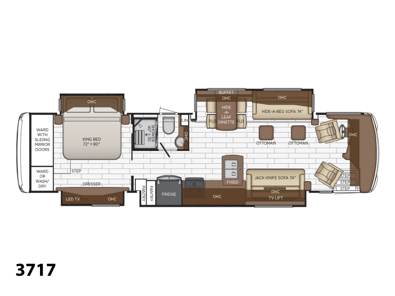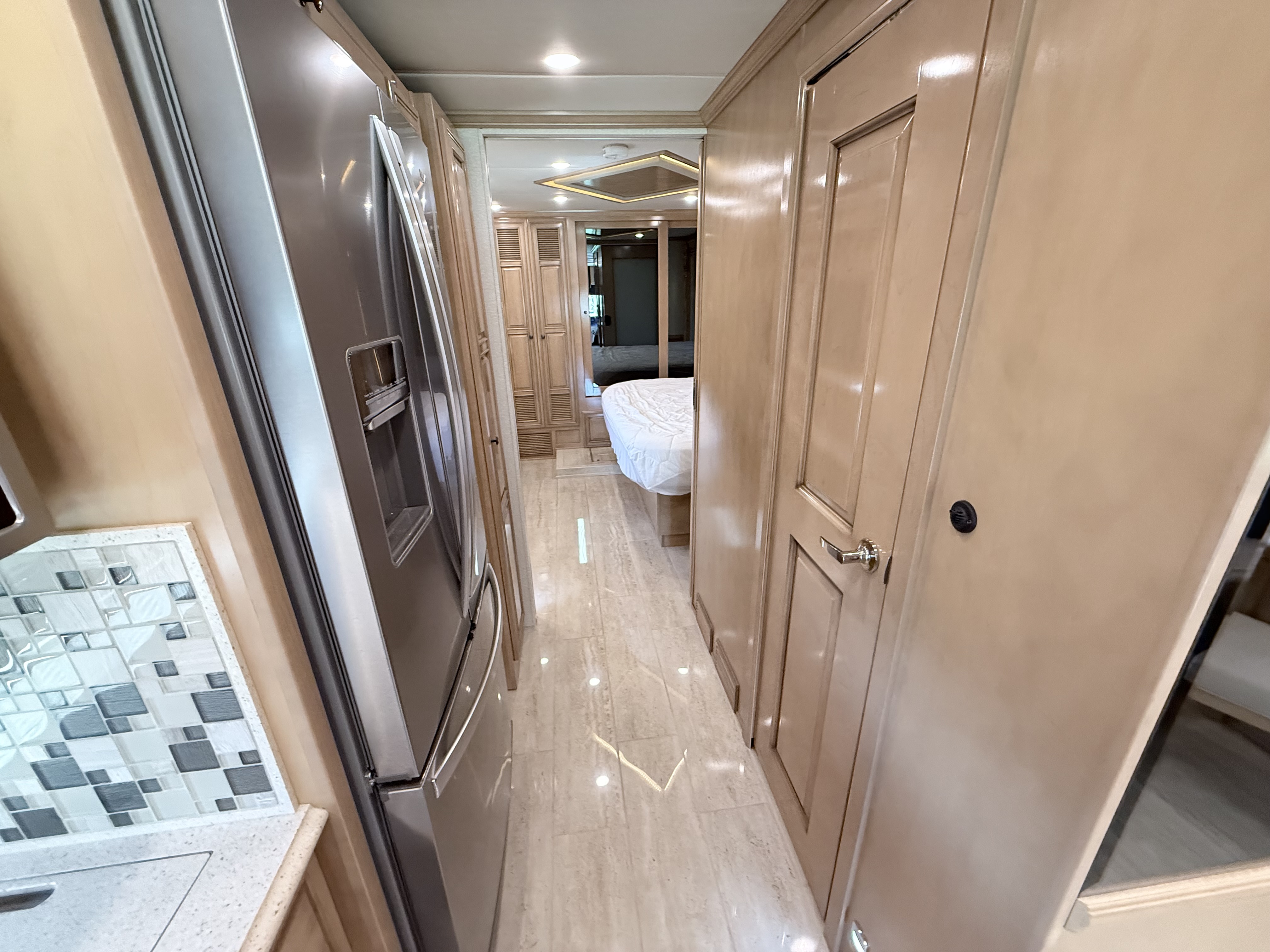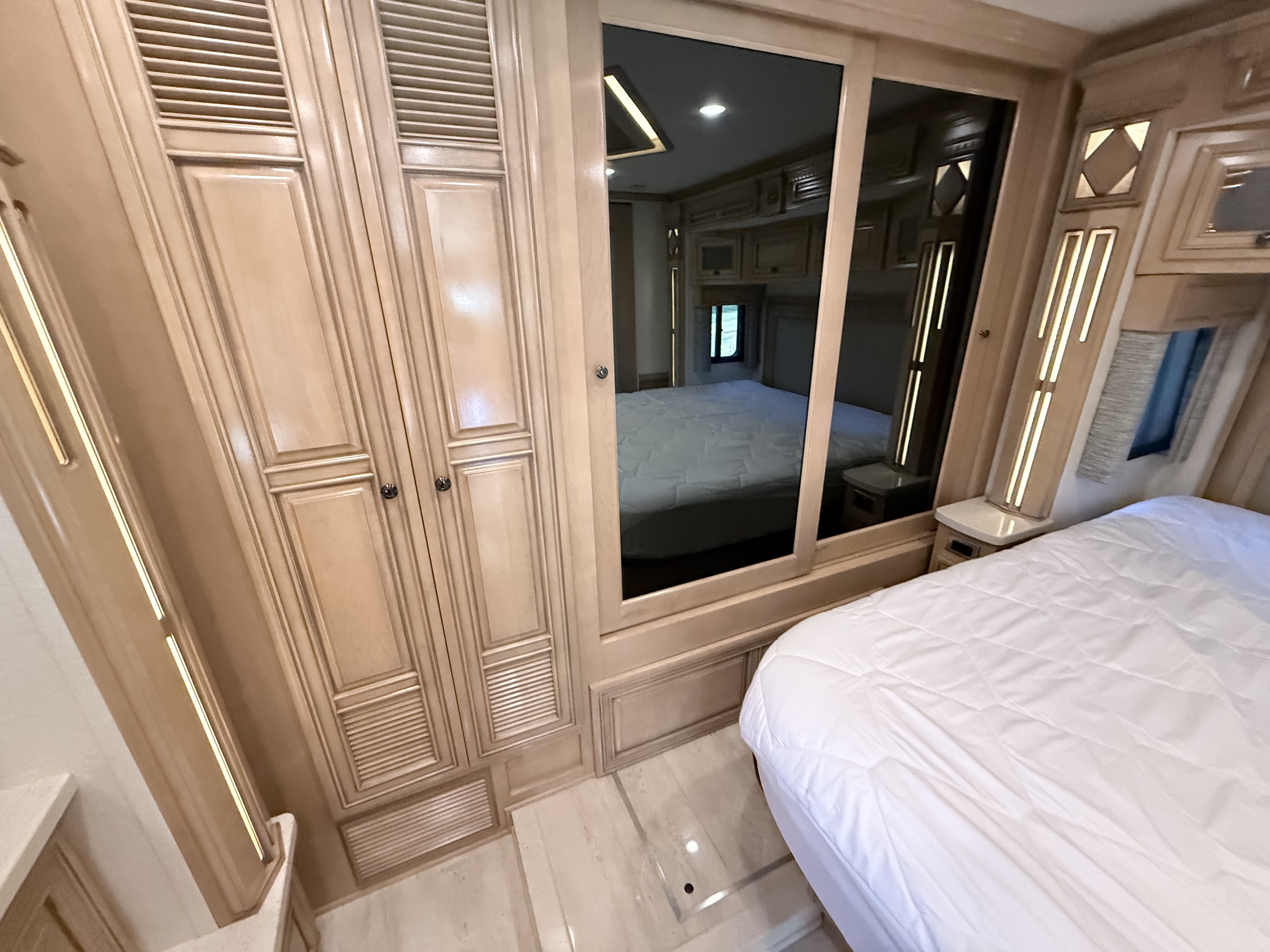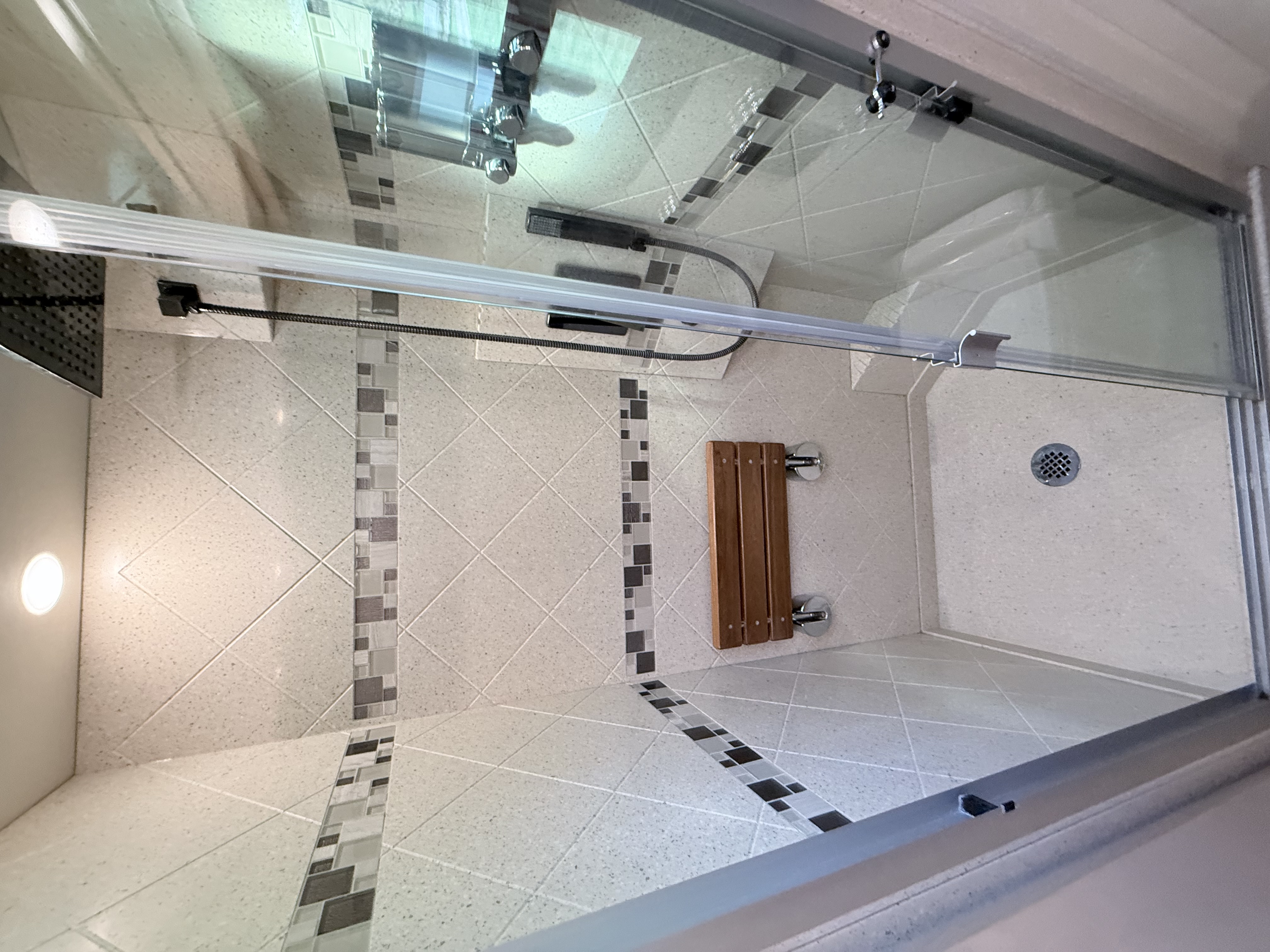 A new feature ceiling design is a highlight of the Dutch Star living room, which offers you a retractable Samsung 50” 4K LED TV with a Sony® Blu-ray player and a Bose® Solo 5 sound bar. The comfortable Flexsteel® furniture—available in a variety of configurations—invites relaxation, while optional radiant tile heat lends coziness in cooler weather. In all rear-bath floor plans, you’ll find an extra 6” of height thanks to cathedral ceilings.