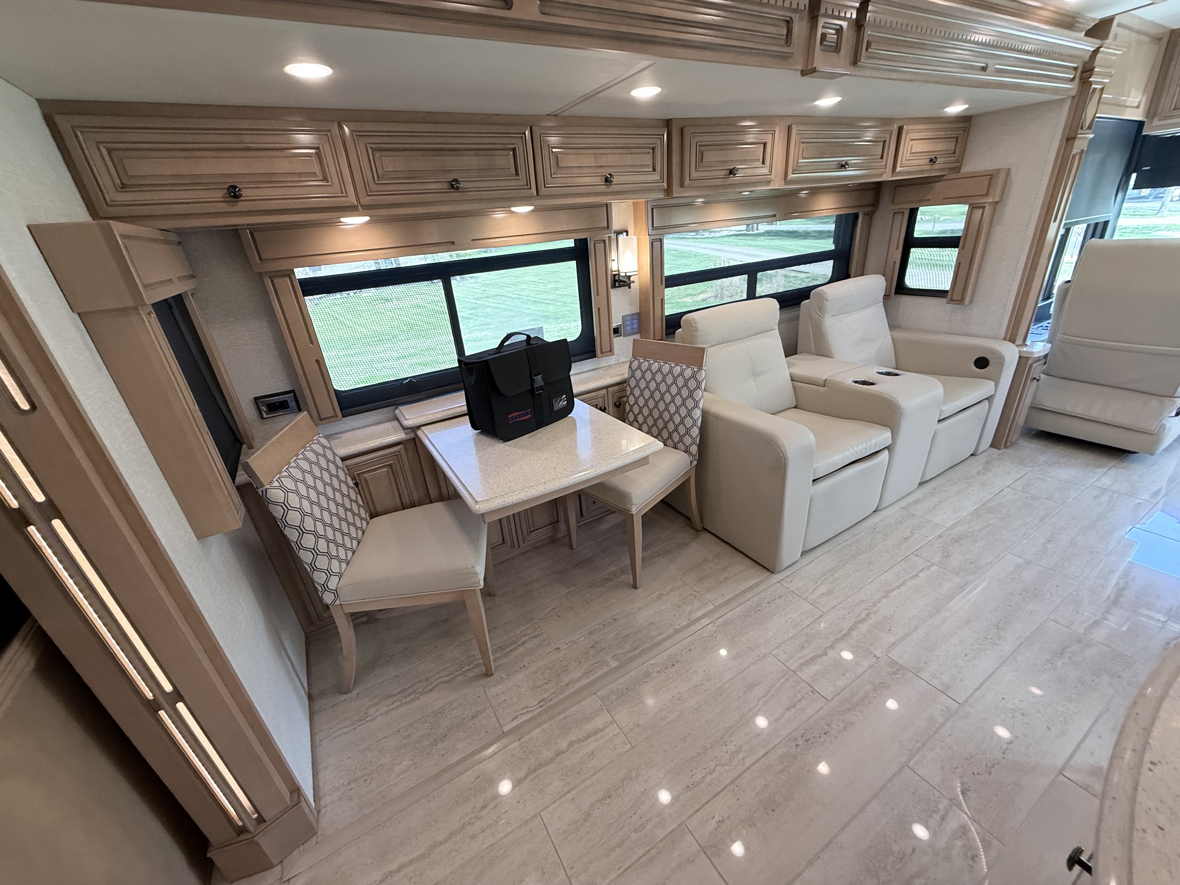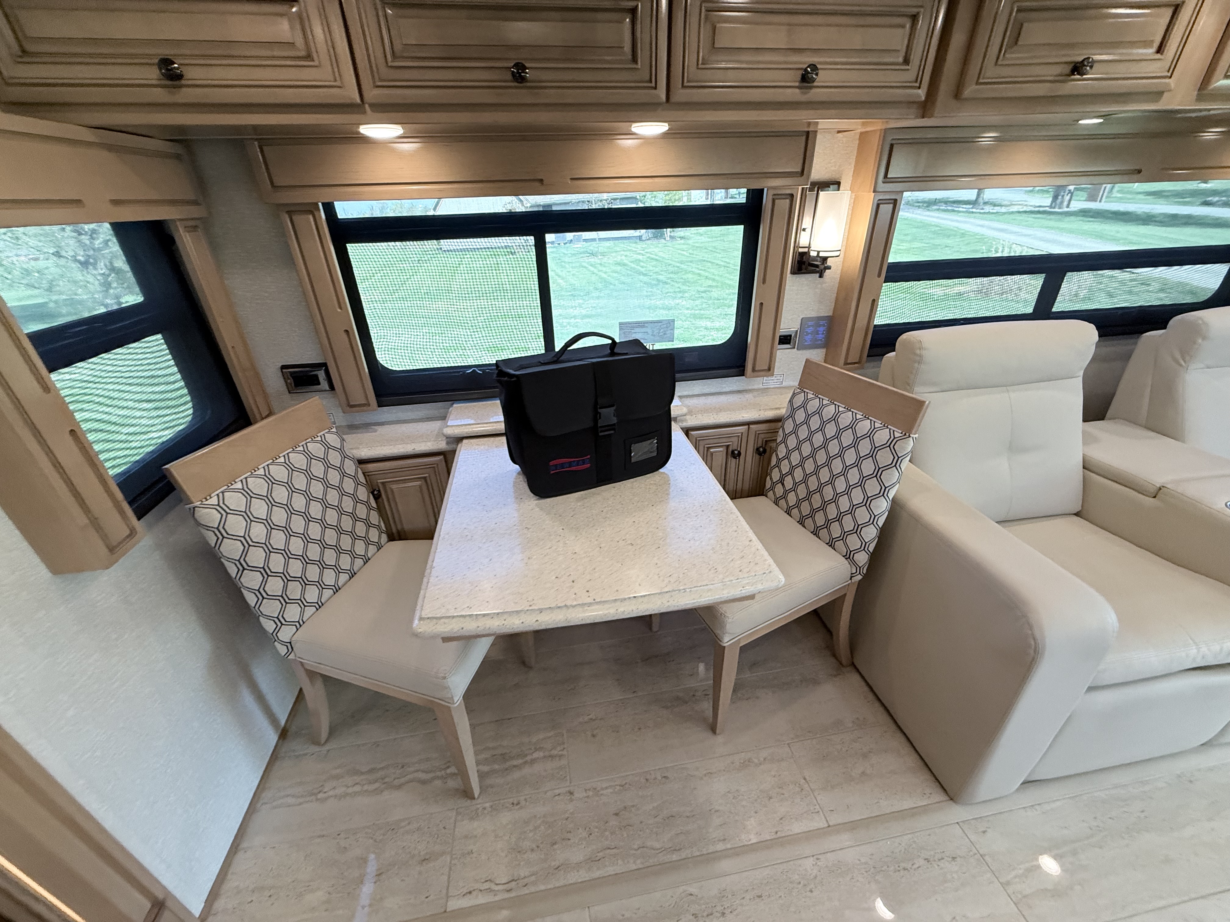 - Dinette with power adjusted table, bench seat and a folding chair on wheelchair accessible floor plan
