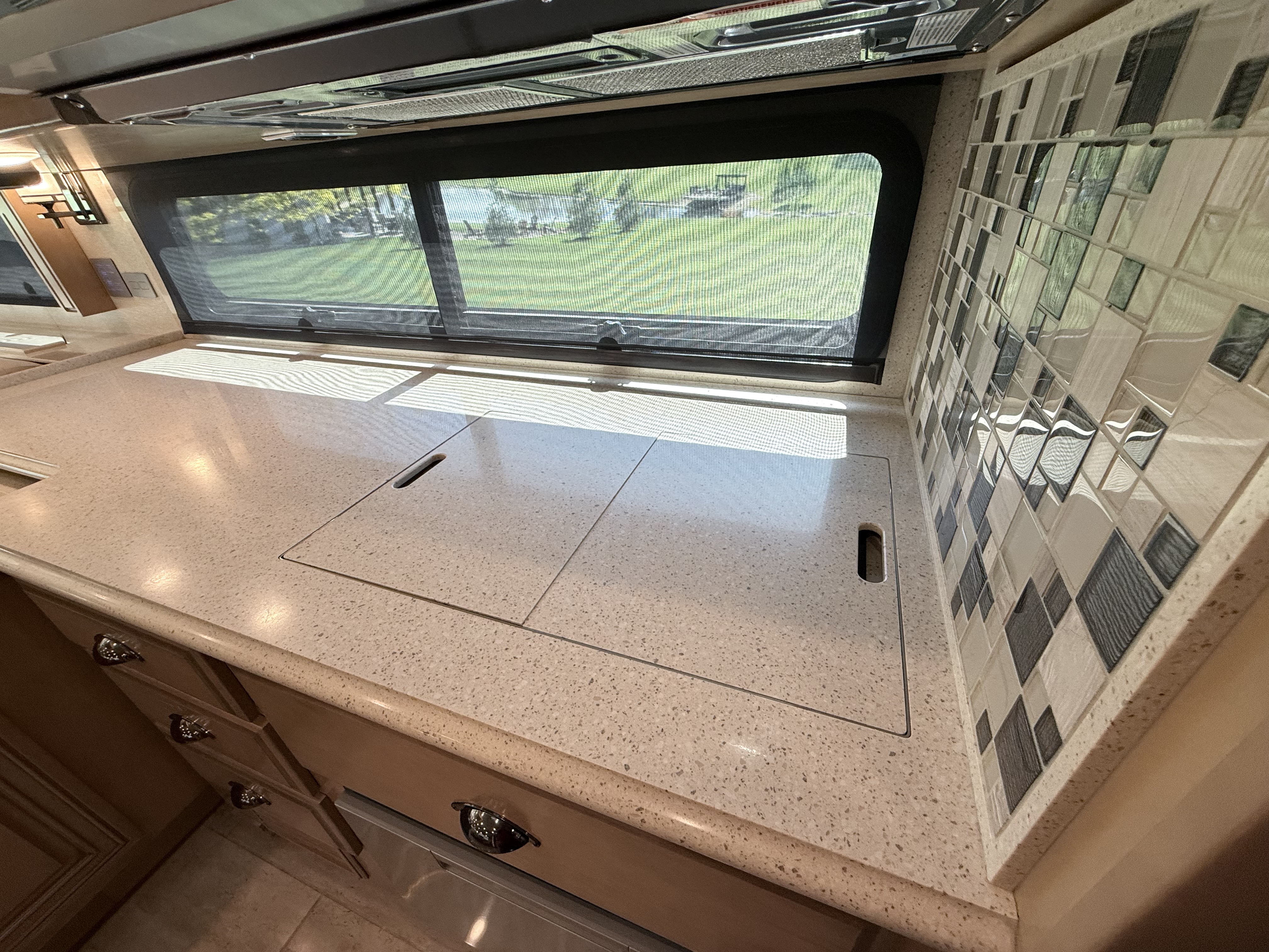 - Super polished solid surface countertop in kitchen with undermounted stainless steel sink & sink covers