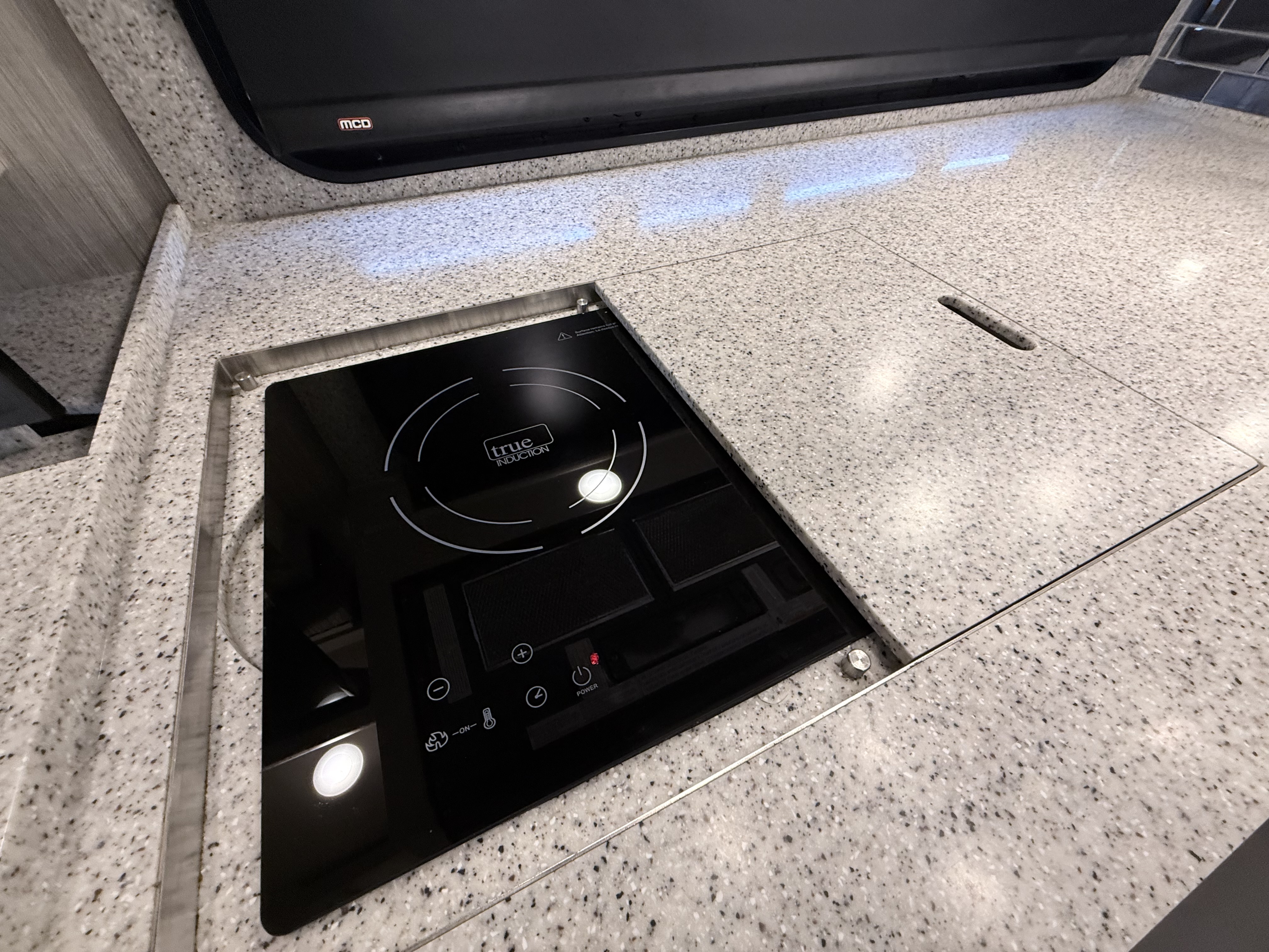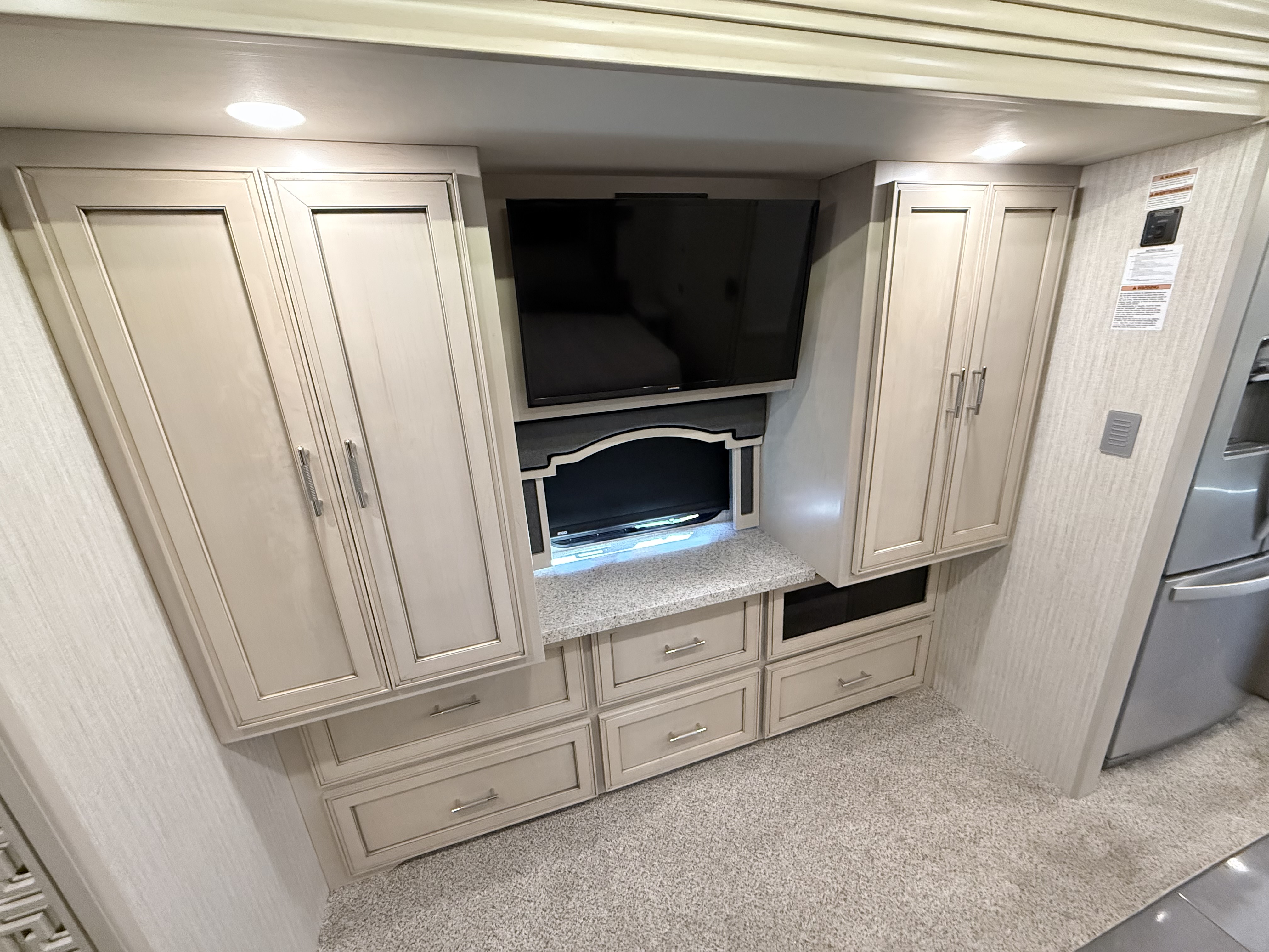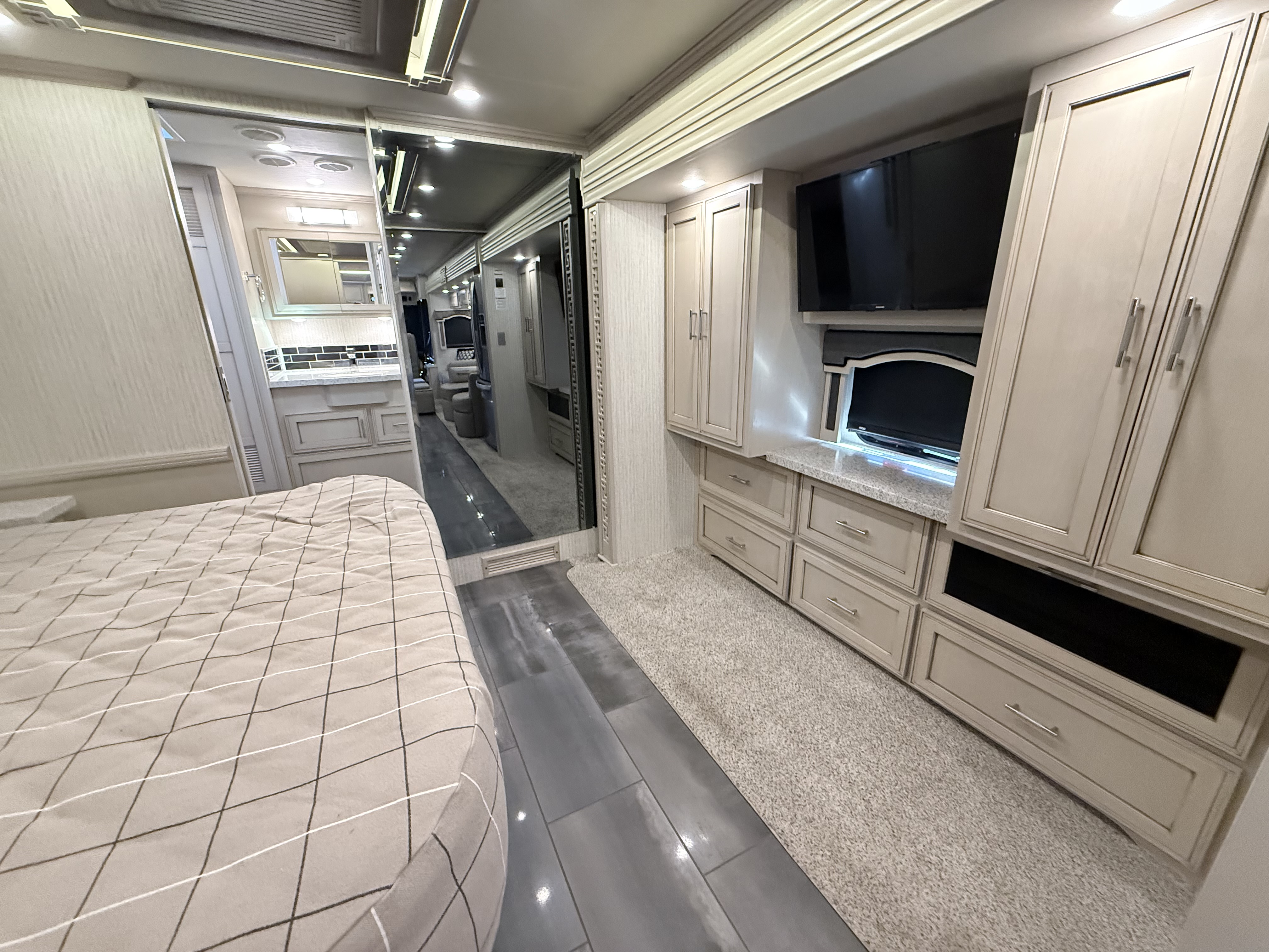 The Ventana kitchen features redesigned hardwood cabinet doors, soft-close drawers with new hardware, and beautiful polished solid surface countertops. A brushed aluminum refrigerator, a stainless steel convection microwave, and a three-burner recessed gas cooktop come standard, while available upgrades include a dishwasher and a flush-mount induction cooktop. Escape to the Ventana master bedroom and find a plush pillow top queen- or king-size mattress backed by a redesigned headboard—or upgrade to the optional Sleep Number™ mattress. For your entertainment, a Samsung LED TV with a Blu-ray player is positioned across from the bed. And for your convenience, an optional two-piece washer and dryer may also be selected.