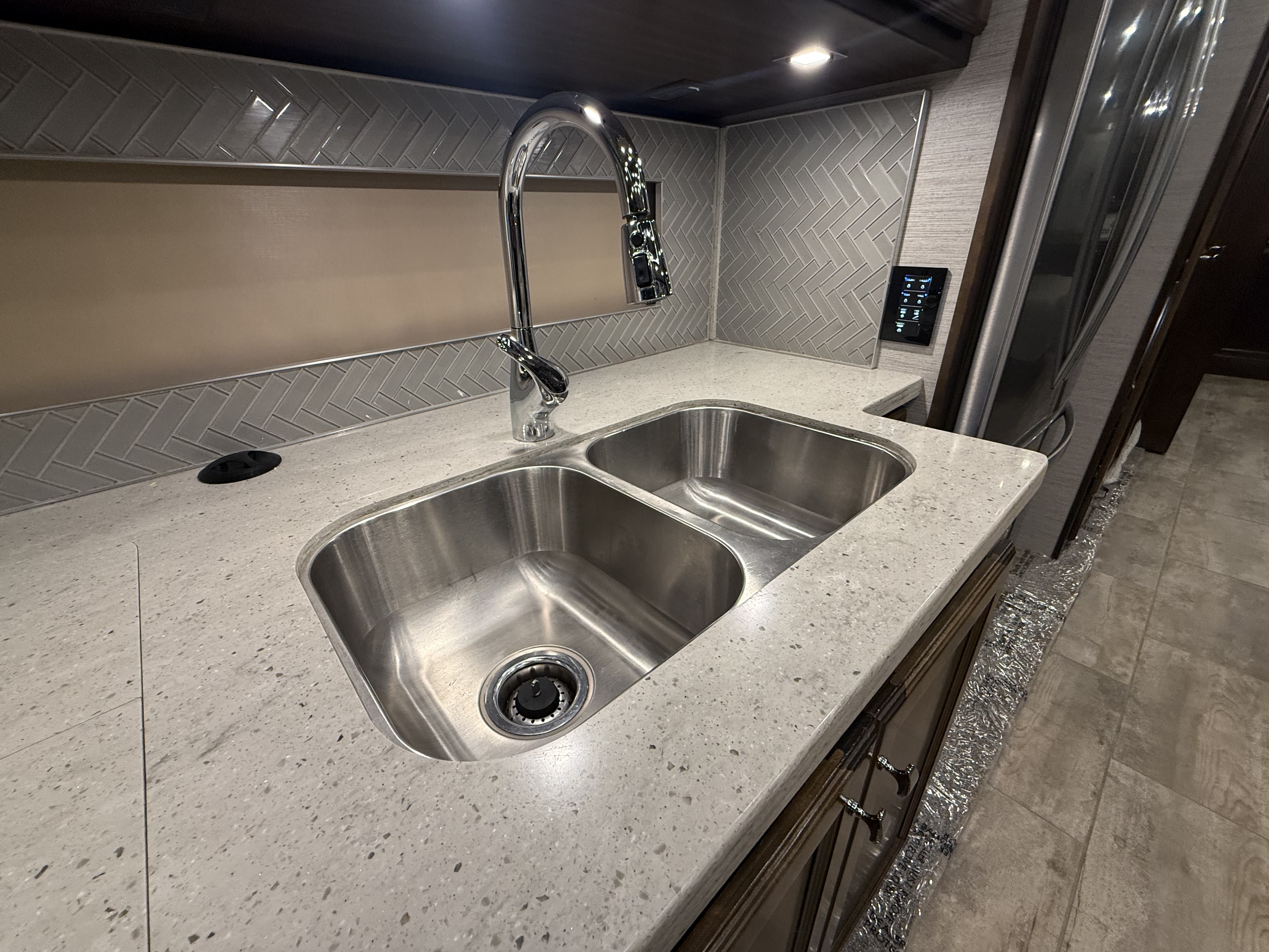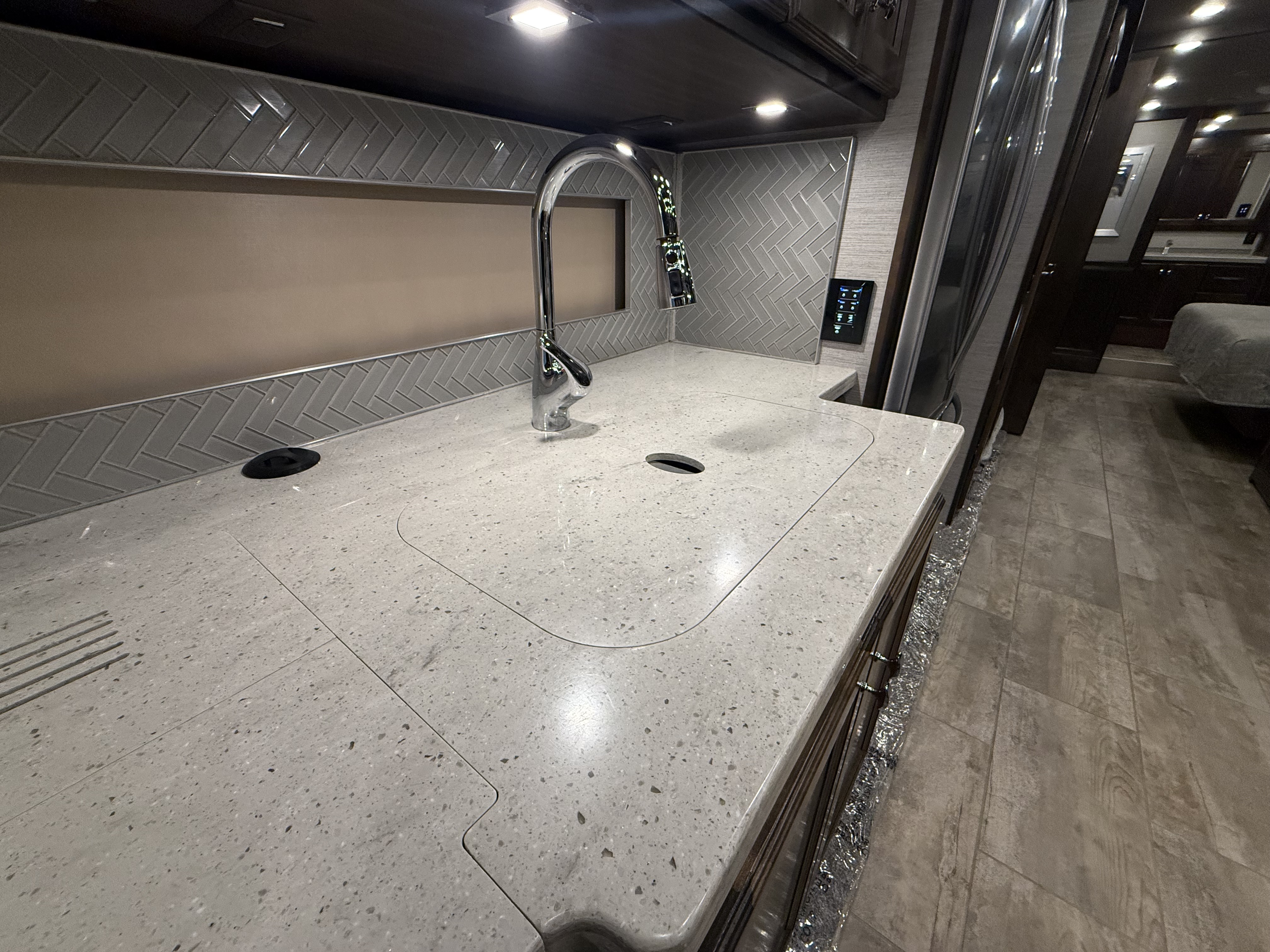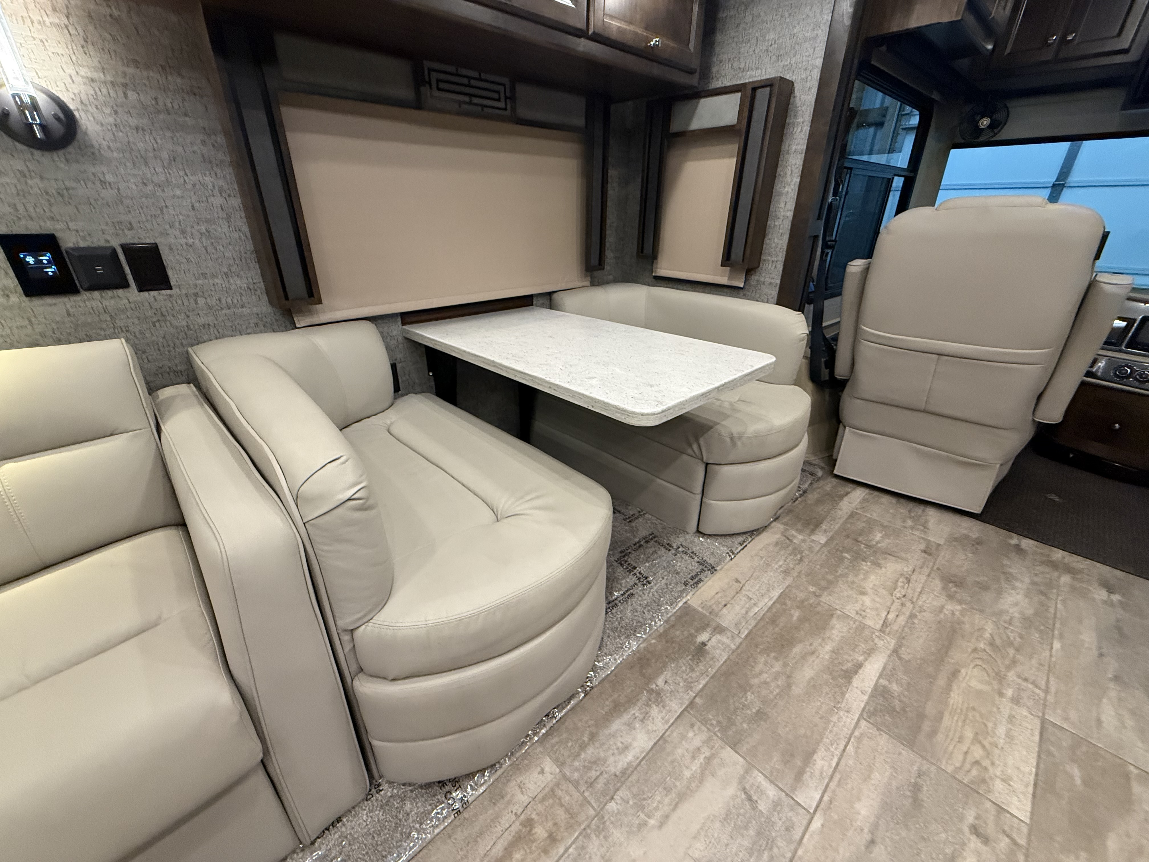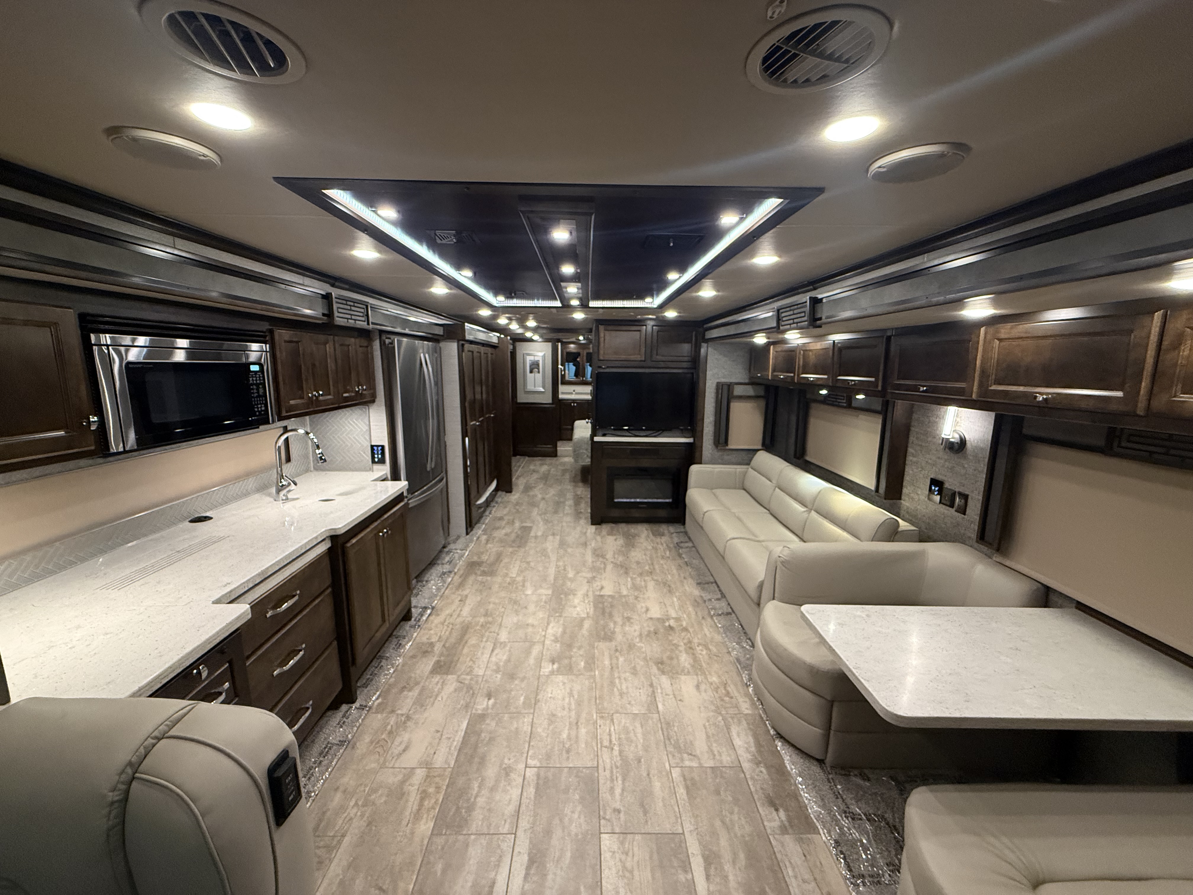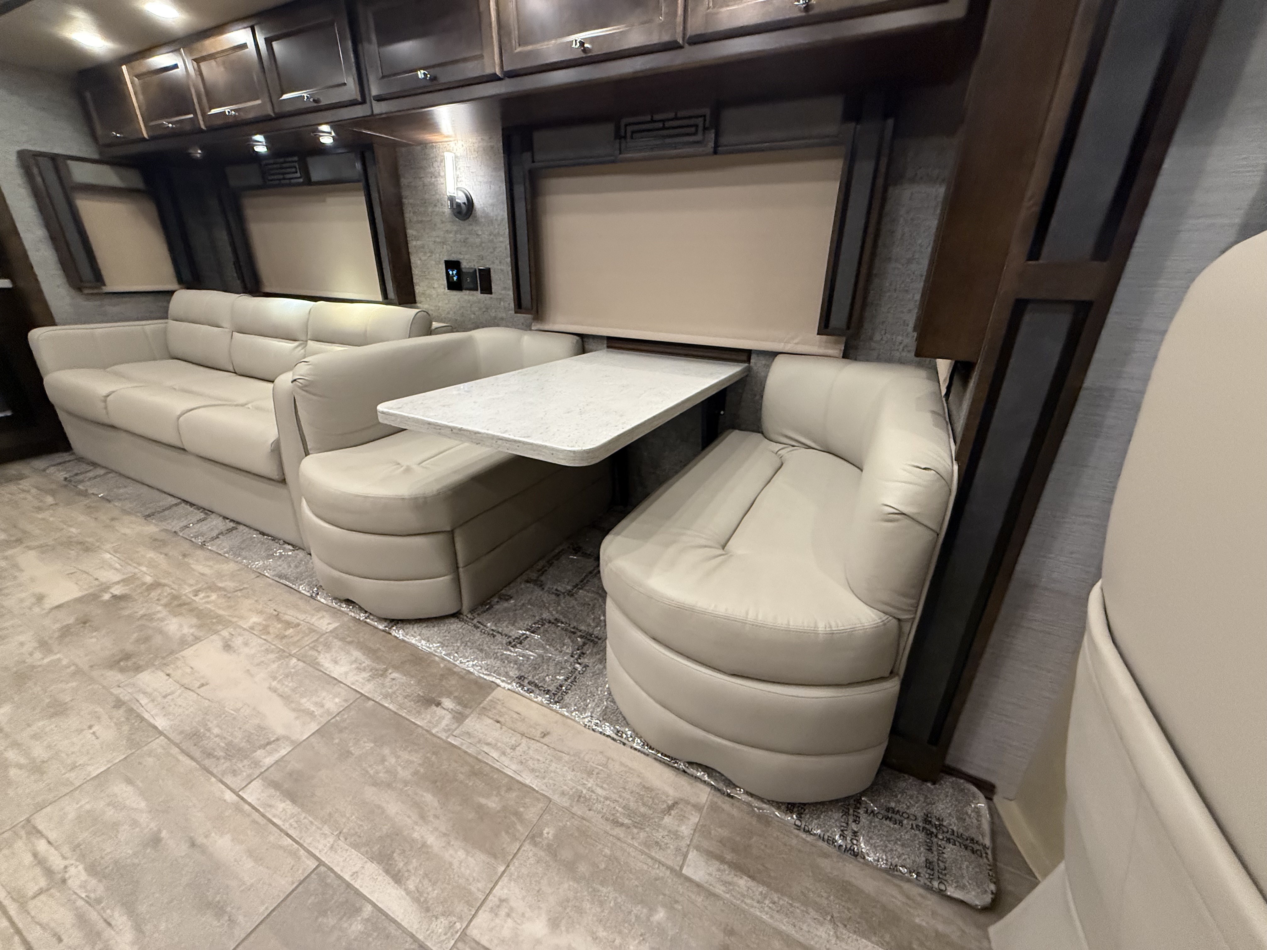 - A streamlined console with an optional In-dash Navigation System moves the driver closer to the coach’s front wheels for easier handling, while the panoramic windshield provides an impressive, full view of the road ahead. Adjustable chairs ensure maximum comfort on long journeys. When parked, they can be rotated to provide additional seating for the living area.