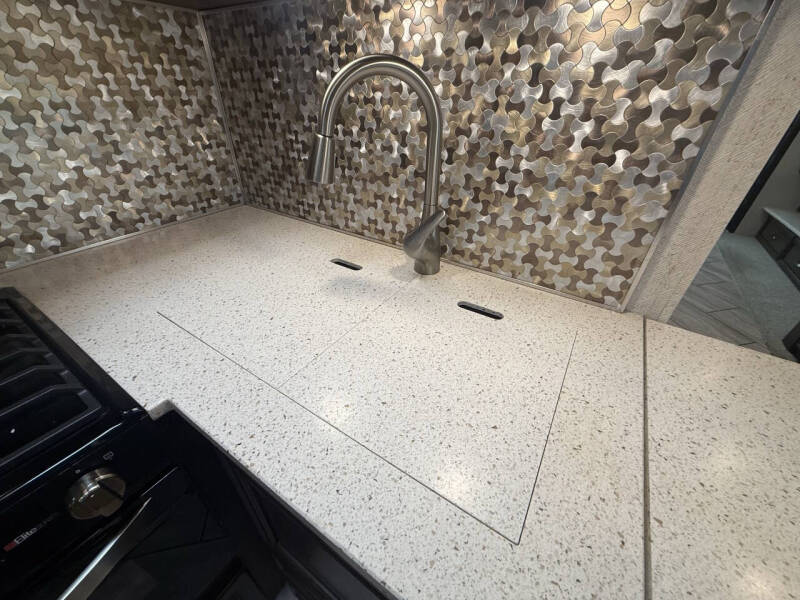 - Polished Solid Surface Countertop in Kitchen with Undermounted Stainless Steel Sink & Covers
