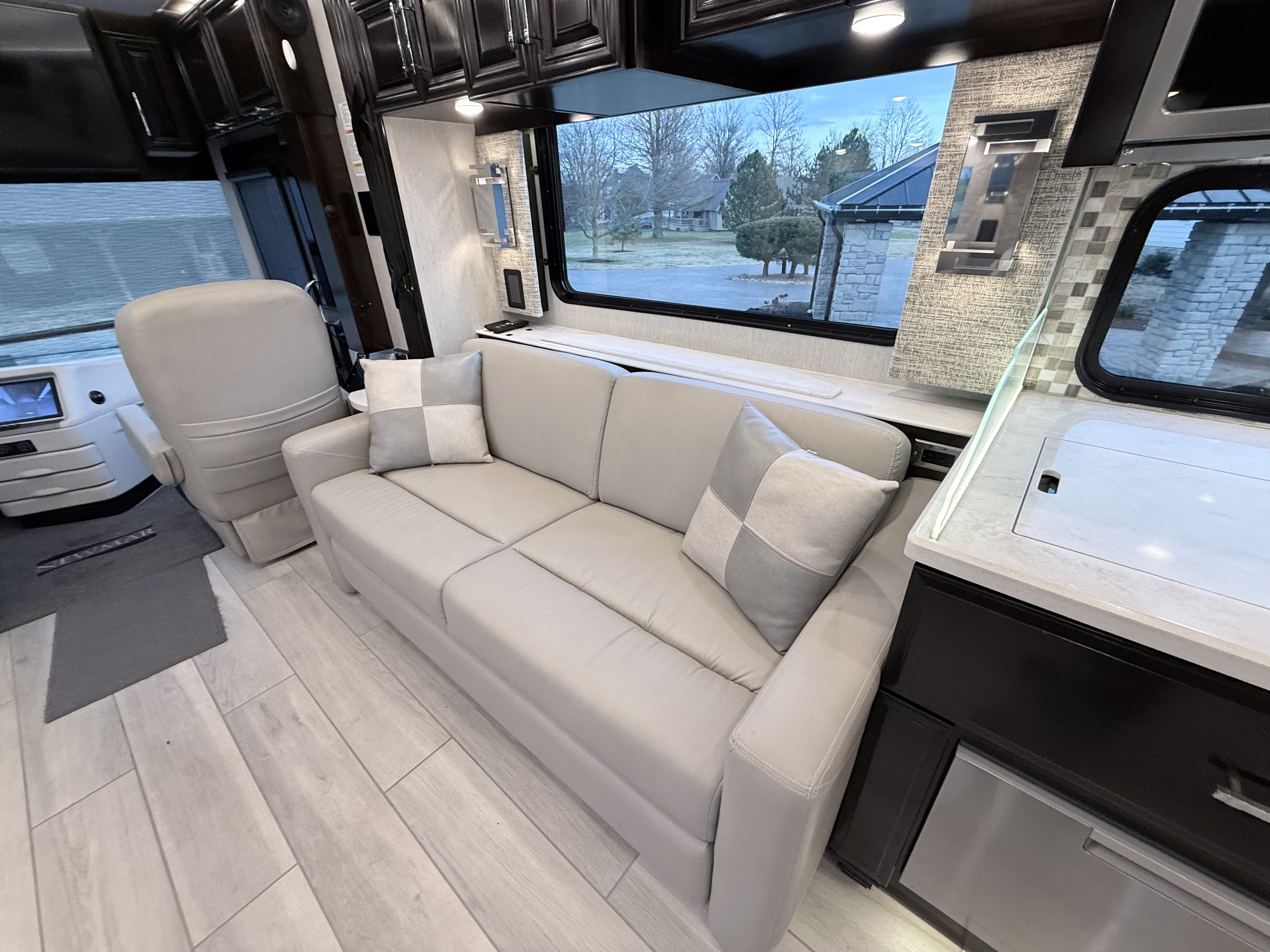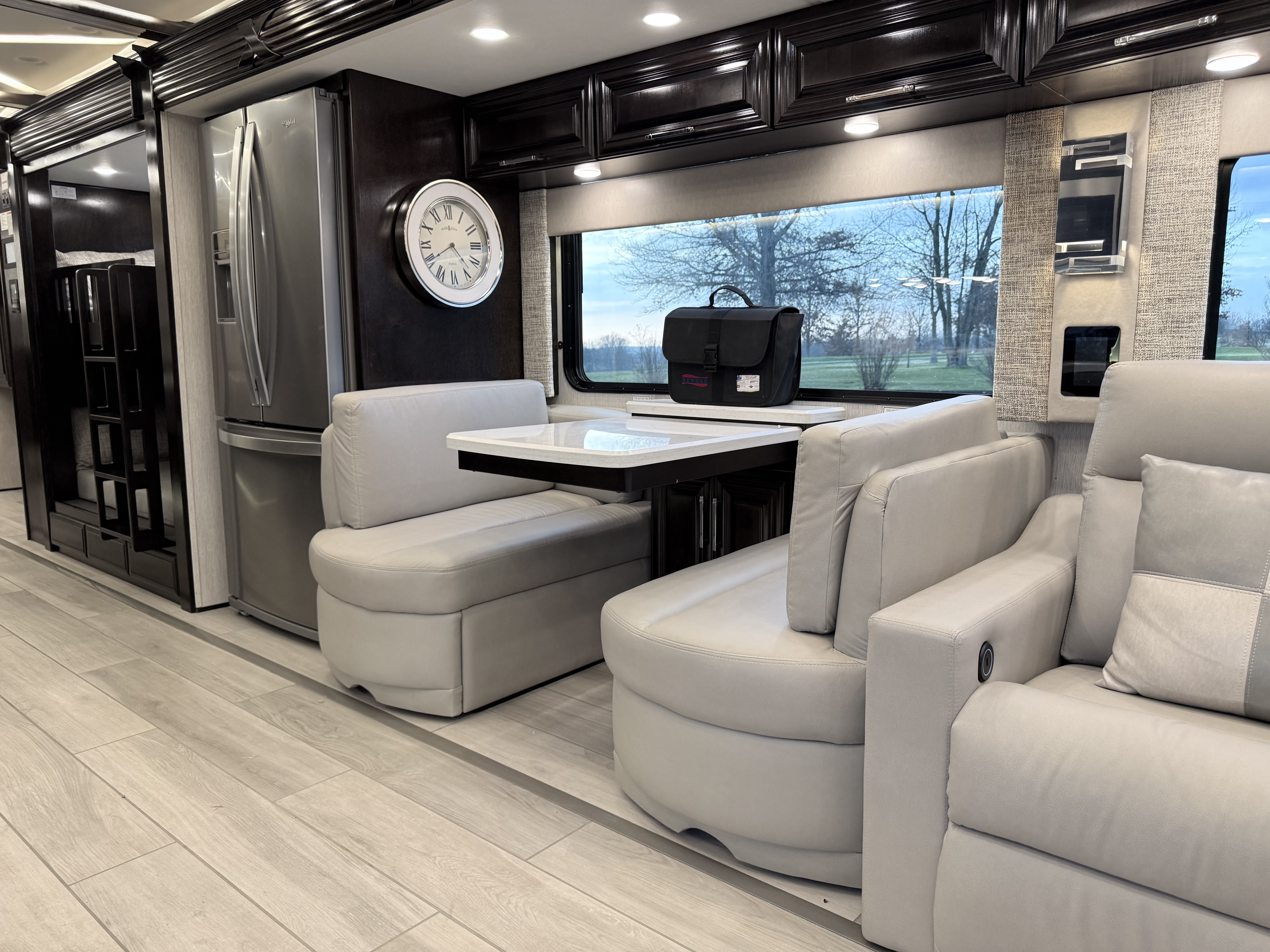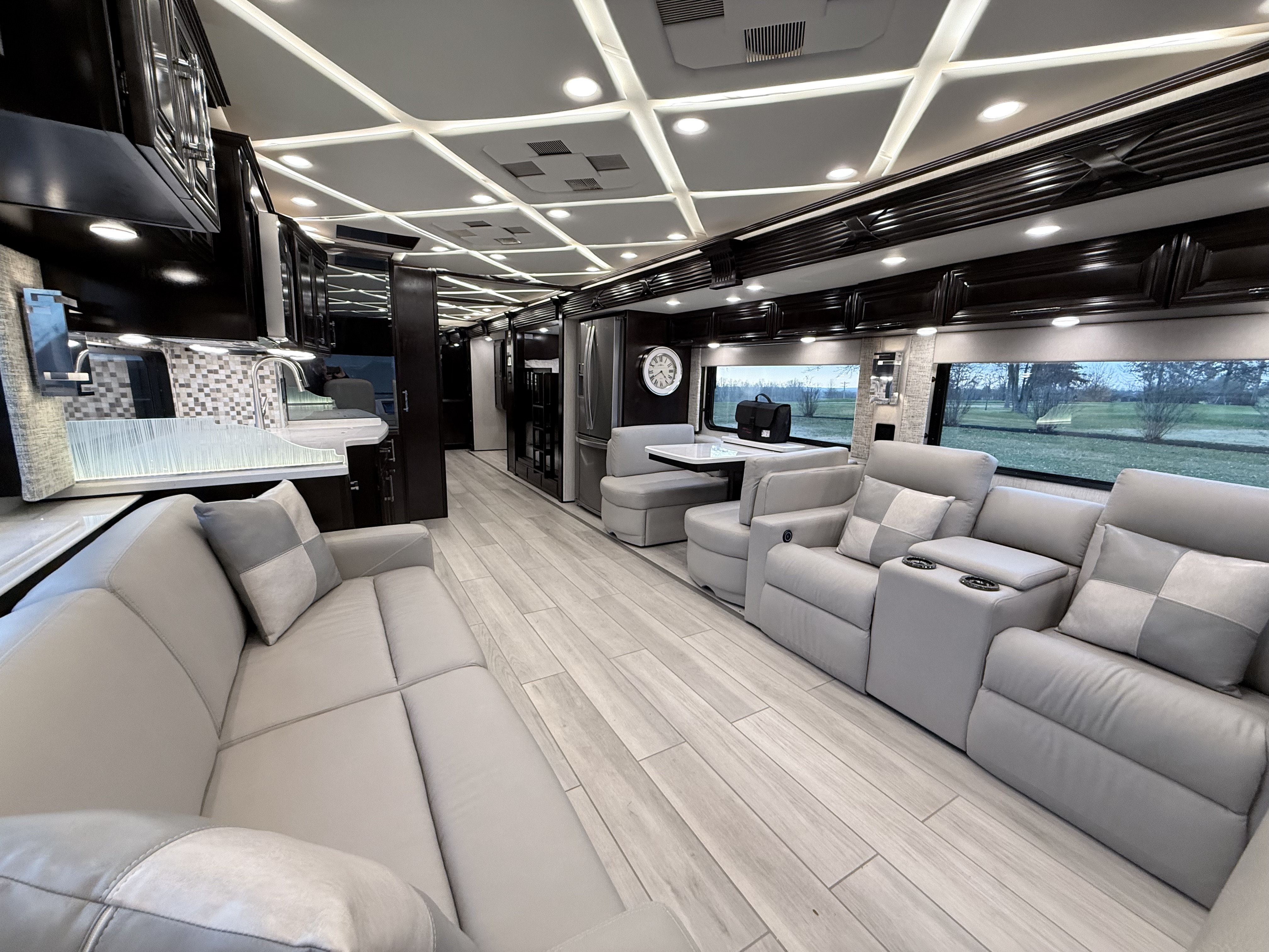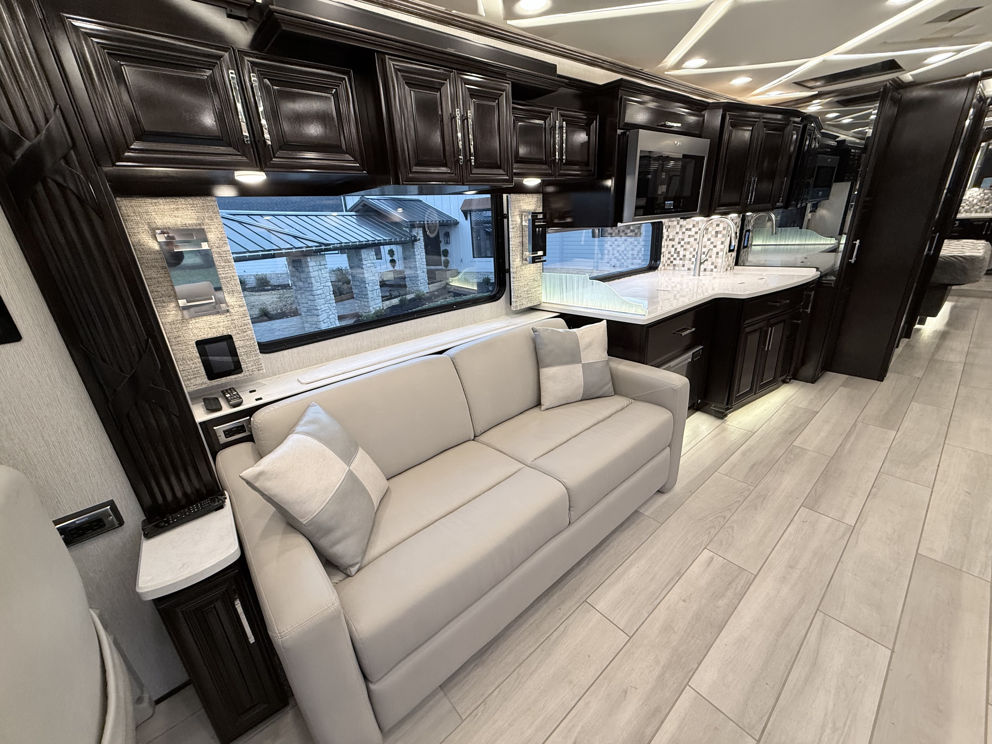 Step inside the 2023 Mountain Aire 4535 and you enter a realm of bespoke elegance, defined by Sable Maple hardwood cabinetry with a high-gloss glaze and heated porcelain tile floors throughout. This floor plan is a masterclass in livability, featuring cathedral ceilings in the rear bath for added volume and a chef’s galley equipped with Viking residential appliances. The quietness of the cabin is unmatched, thanks to Newmar’s superior insulation and the Silverleaf total coach control system, which allows you to orchestrate your environment—from shades to lighting—with a single touch.