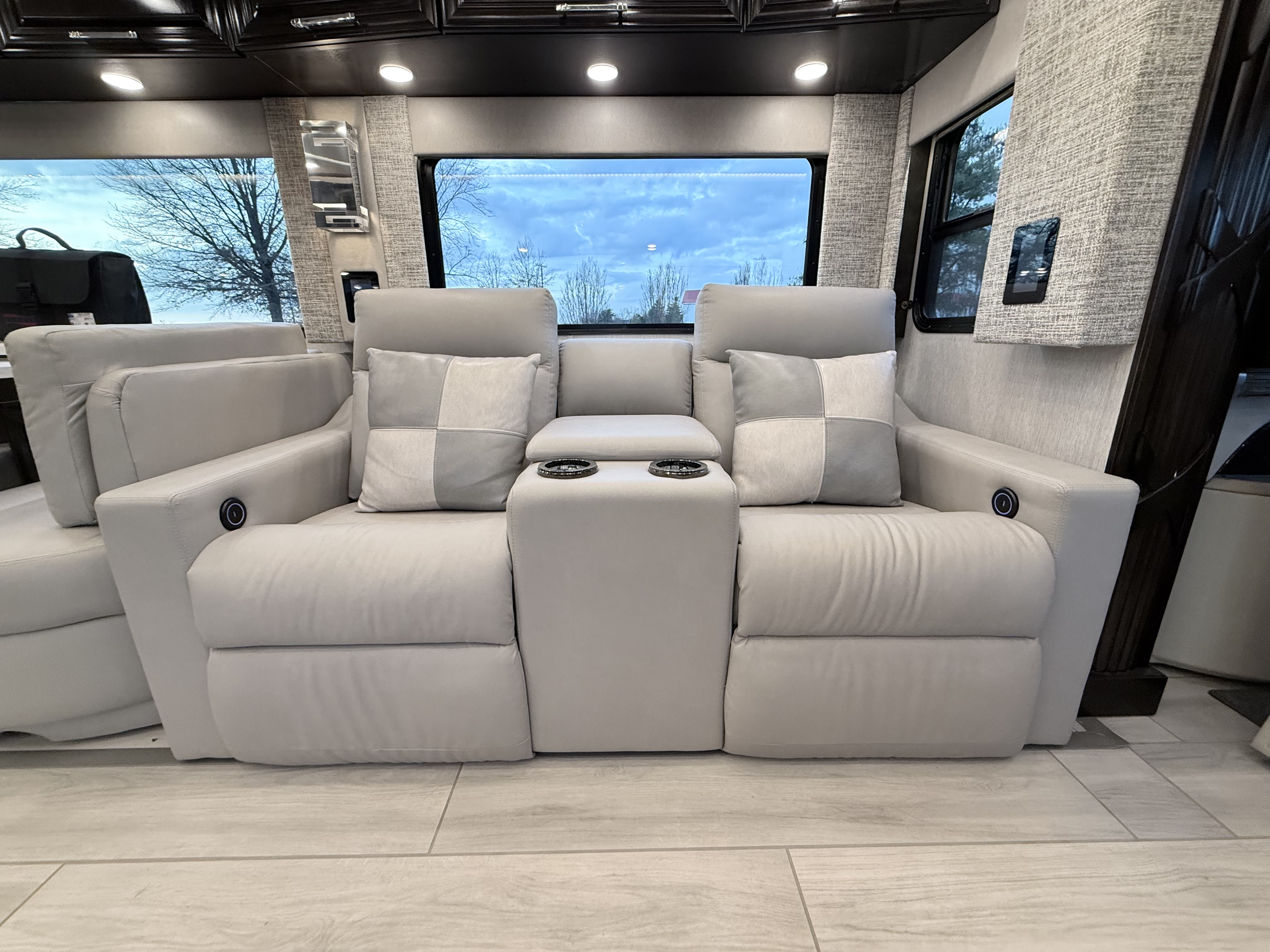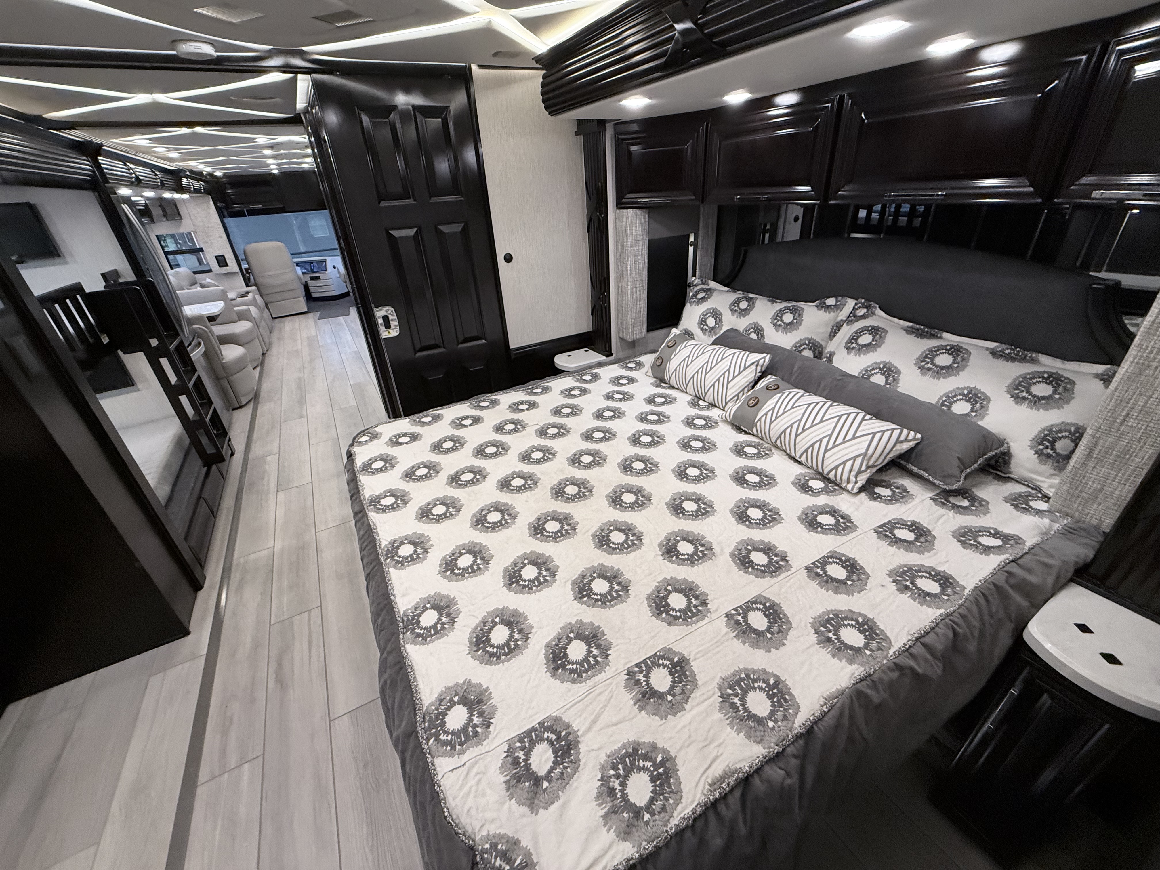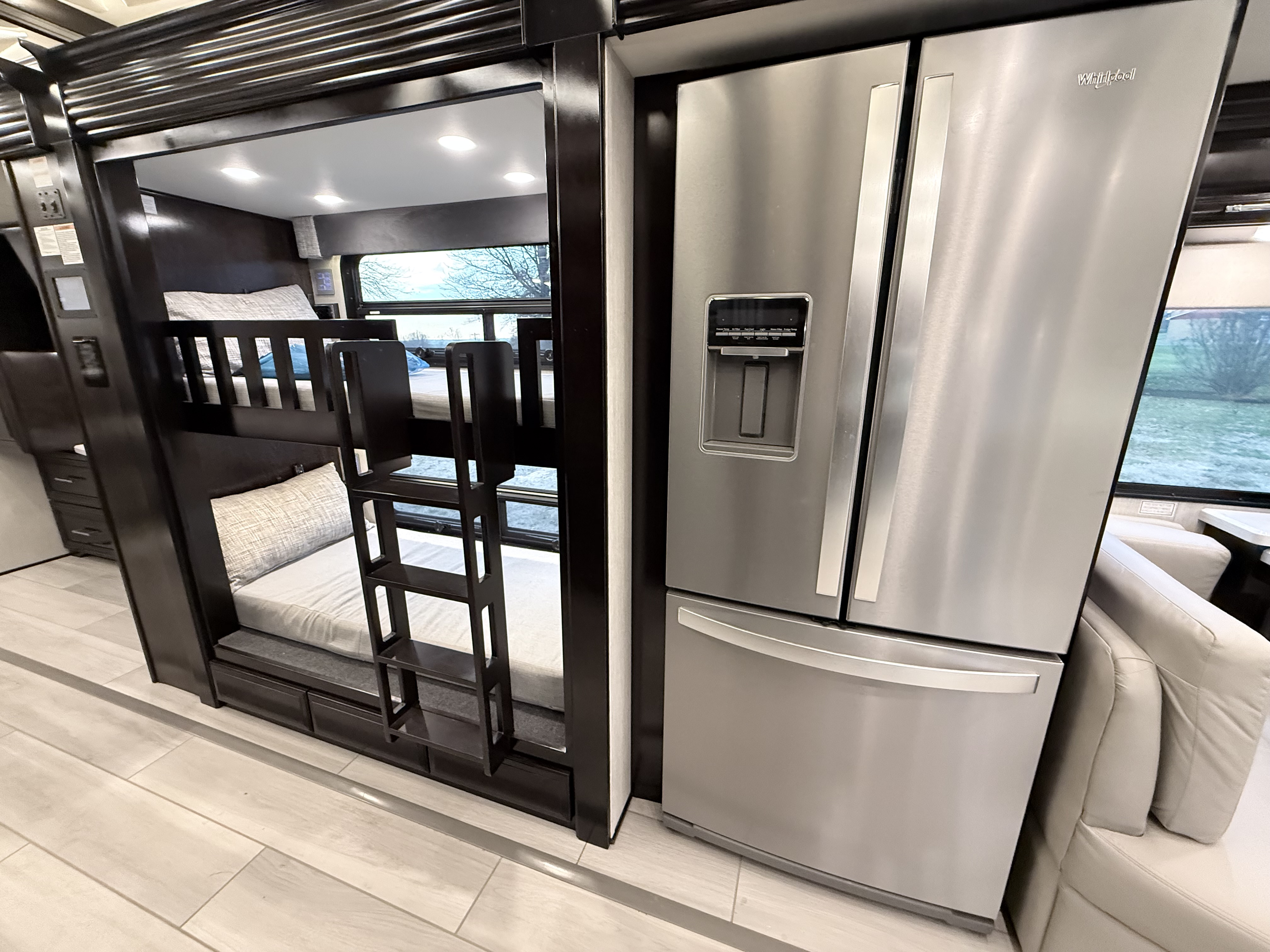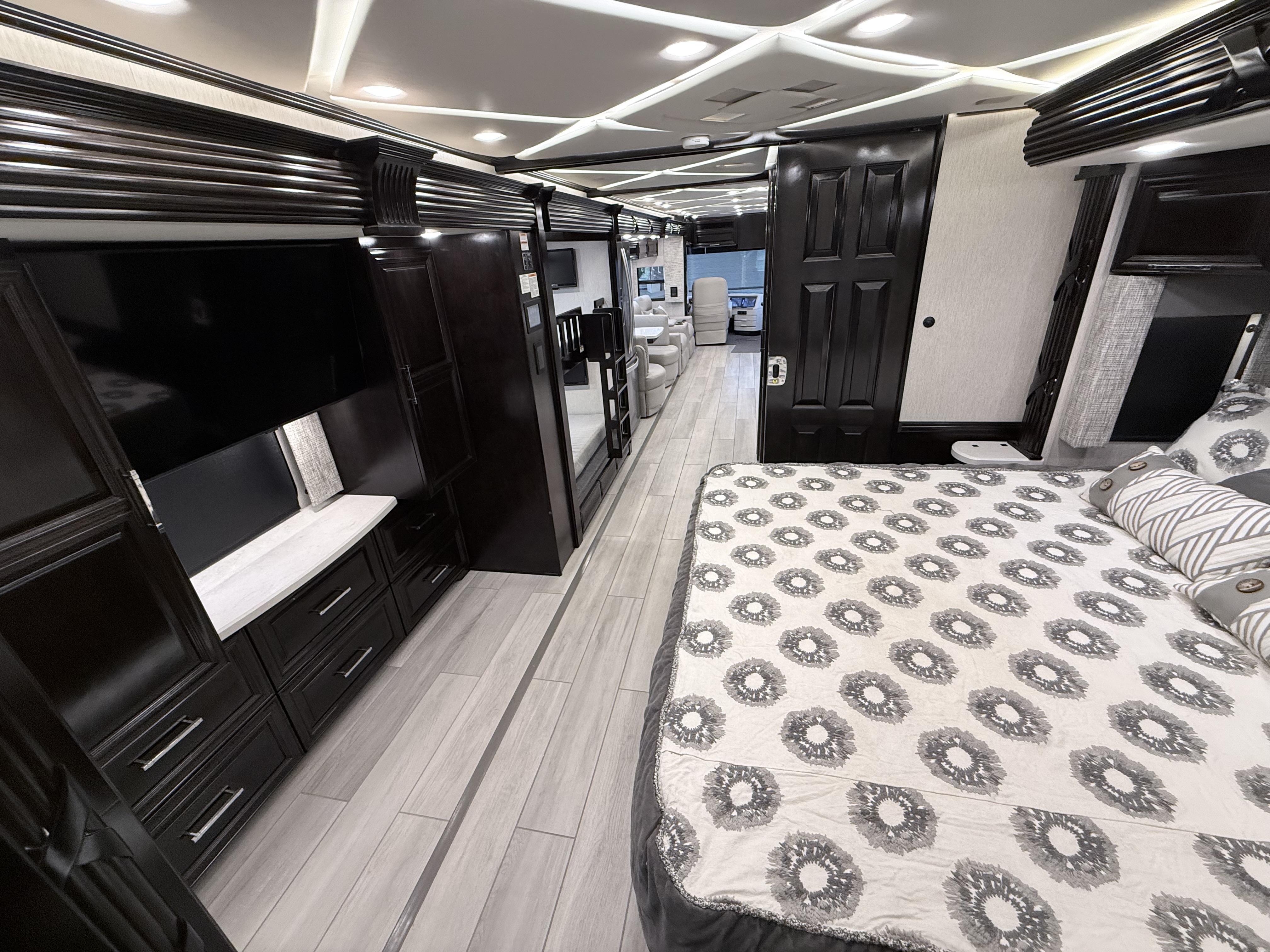 Step inside the 2023 Mountain Aire 4535 and you enter a realm of bespoke elegance, defined by Sable Maple hardwood cabinetry with a high-gloss glaze and heated porcelain tile floors throughout. This floor plan is a masterclass in livability, featuring cathedral ceilings in the rear bath for added volume and a chef’s galley equipped with Viking residential appliances. The quietness of the cabin is unmatched, thanks to Newmar’s superior insulation and the Silverleaf total coach control system, which allows you to orchestrate your environment—from shades to lighting—with a single touch.