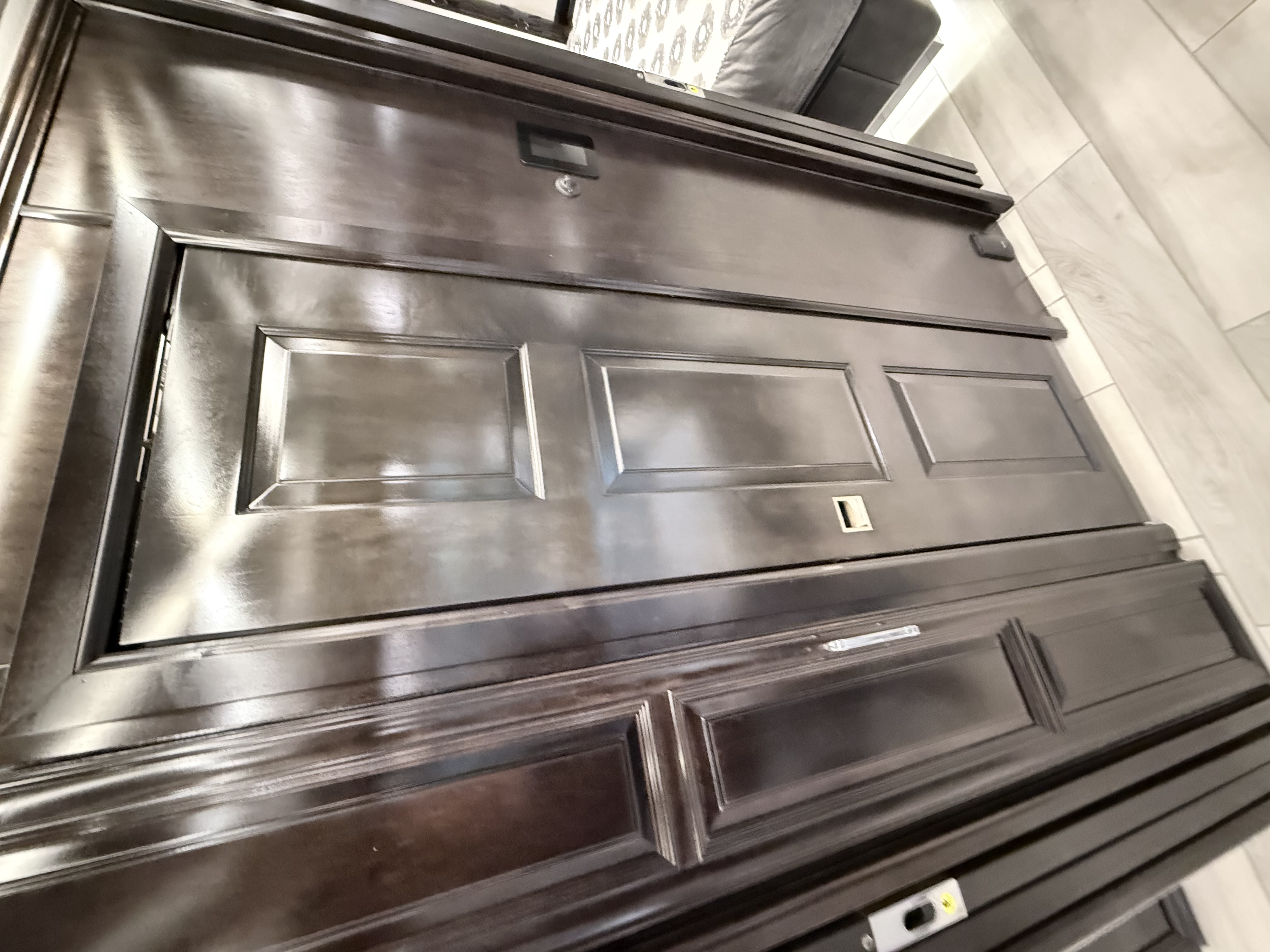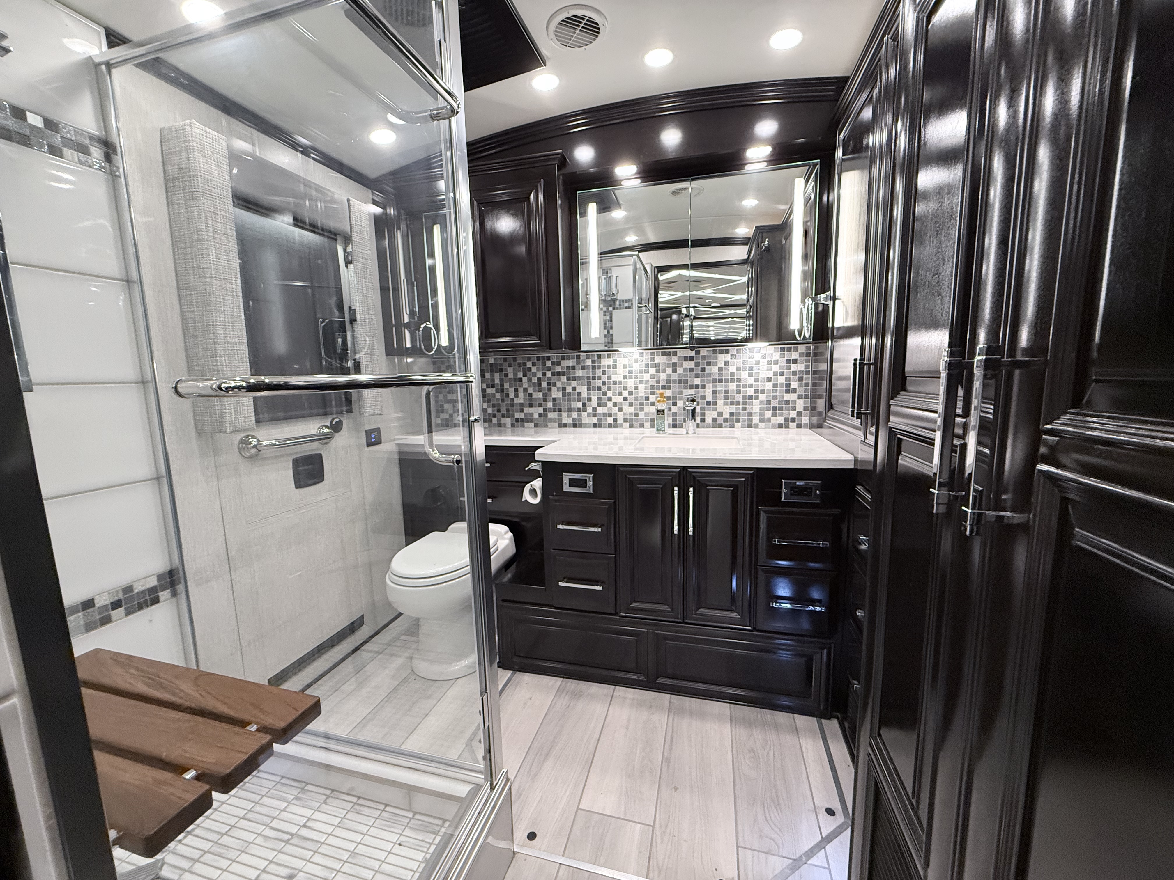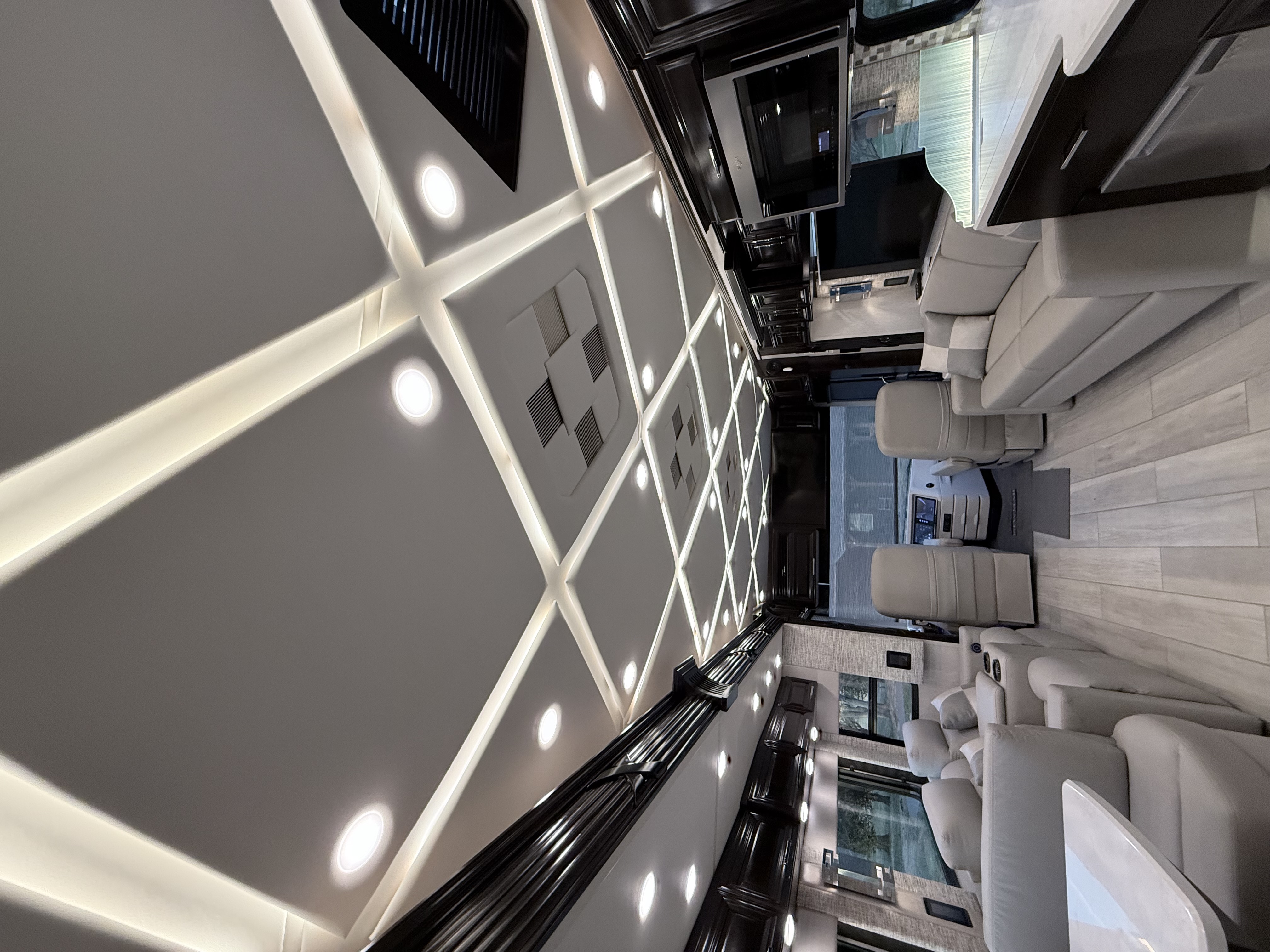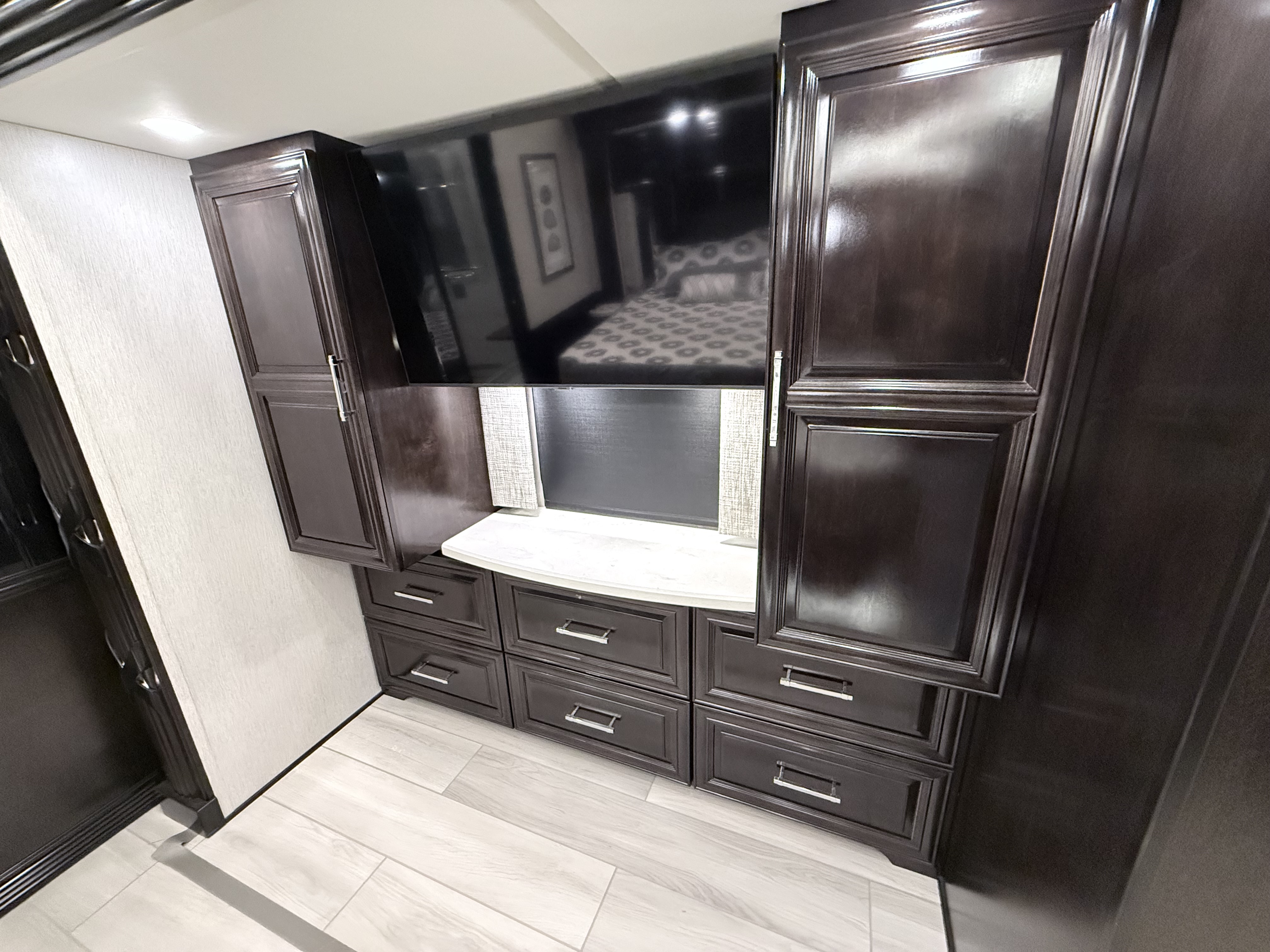 Step inside the 2023 Mountain Aire 4535 and you enter a realm of bespoke elegance, defined by Sable Maple hardwood cabinetry with a high-gloss glaze and heated porcelain tile floors throughout. This floor plan is a masterclass in livability, featuring cathedral ceilings in the rear bath for added volume and a chef’s galley equipped with Viking residential appliances. The quietness of the cabin is unmatched, thanks to Newmar’s superior insulation and the Silverleaf total coach control system, which allows you to orchestrate your environment—from shades to lighting—with a single touch.
