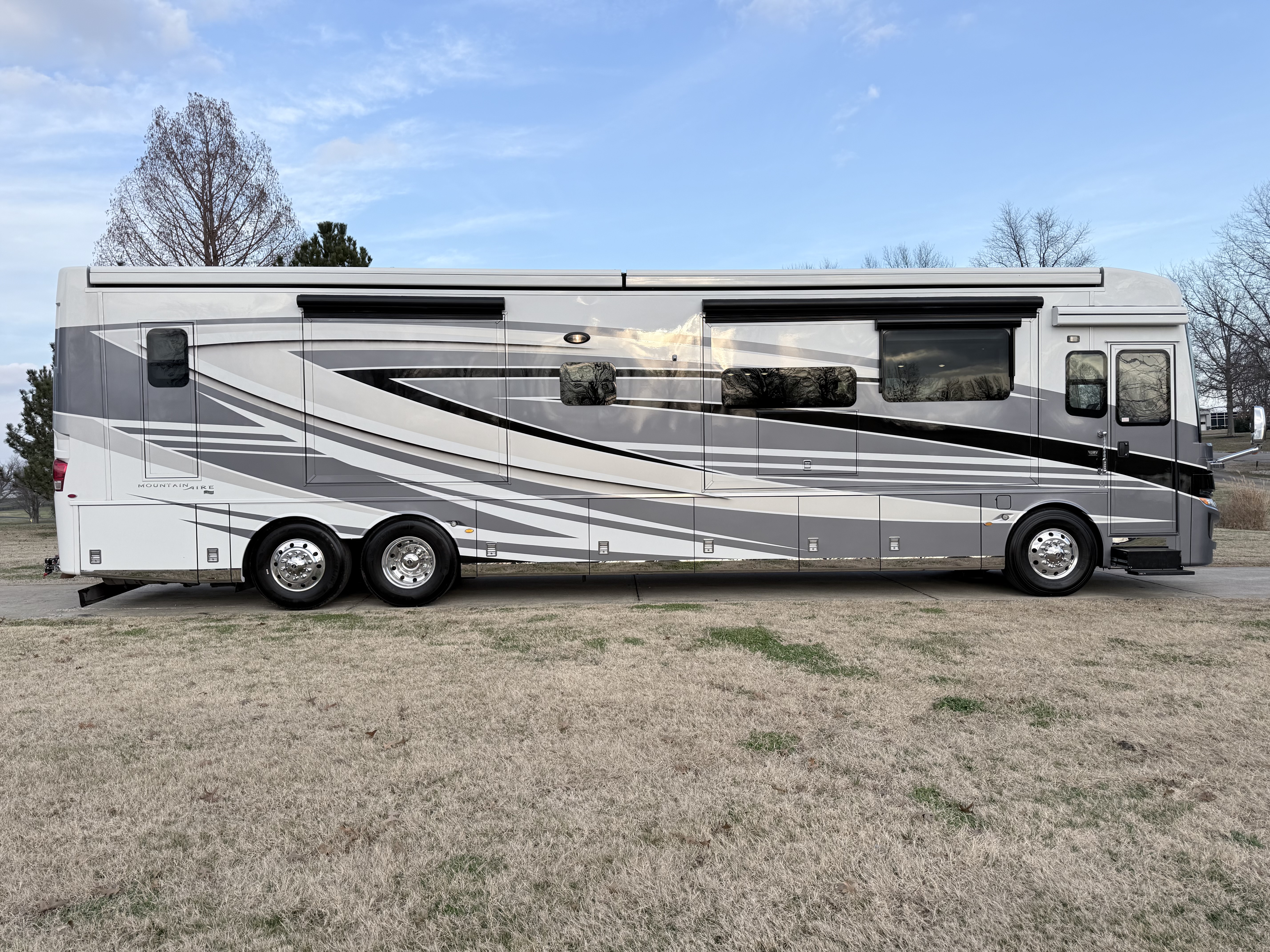 The 2023 Mountain Aire is available in six floor plans, including three new for 2023, that vary between 41’-45’ in length. Floor plan 4591 offers a bath and a half with an angled galley. Floor plan 4586 offers a large walk-through bath area mid-coach, perfect for additional passengers or guests, while floor plan 4521 includes a patio-side Euro booth dinette.
