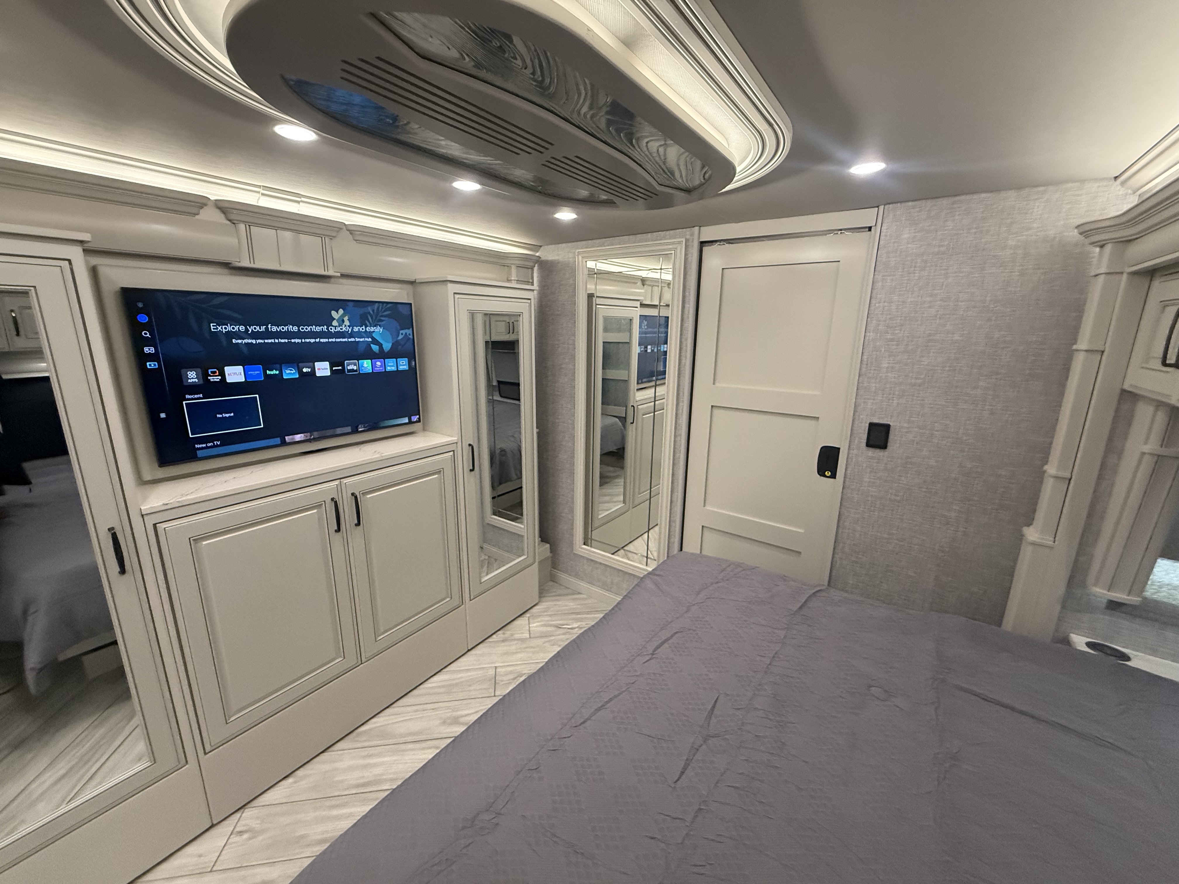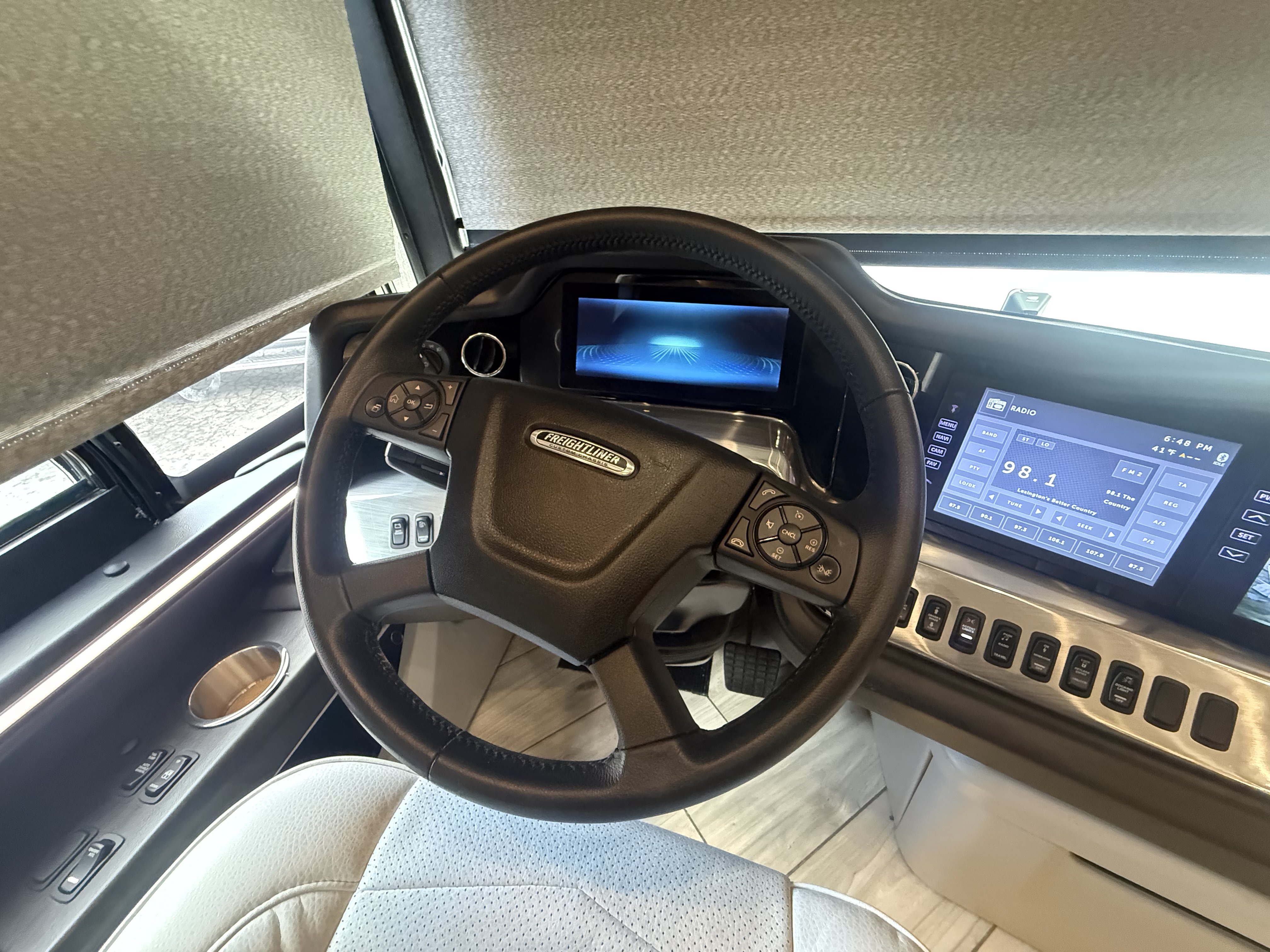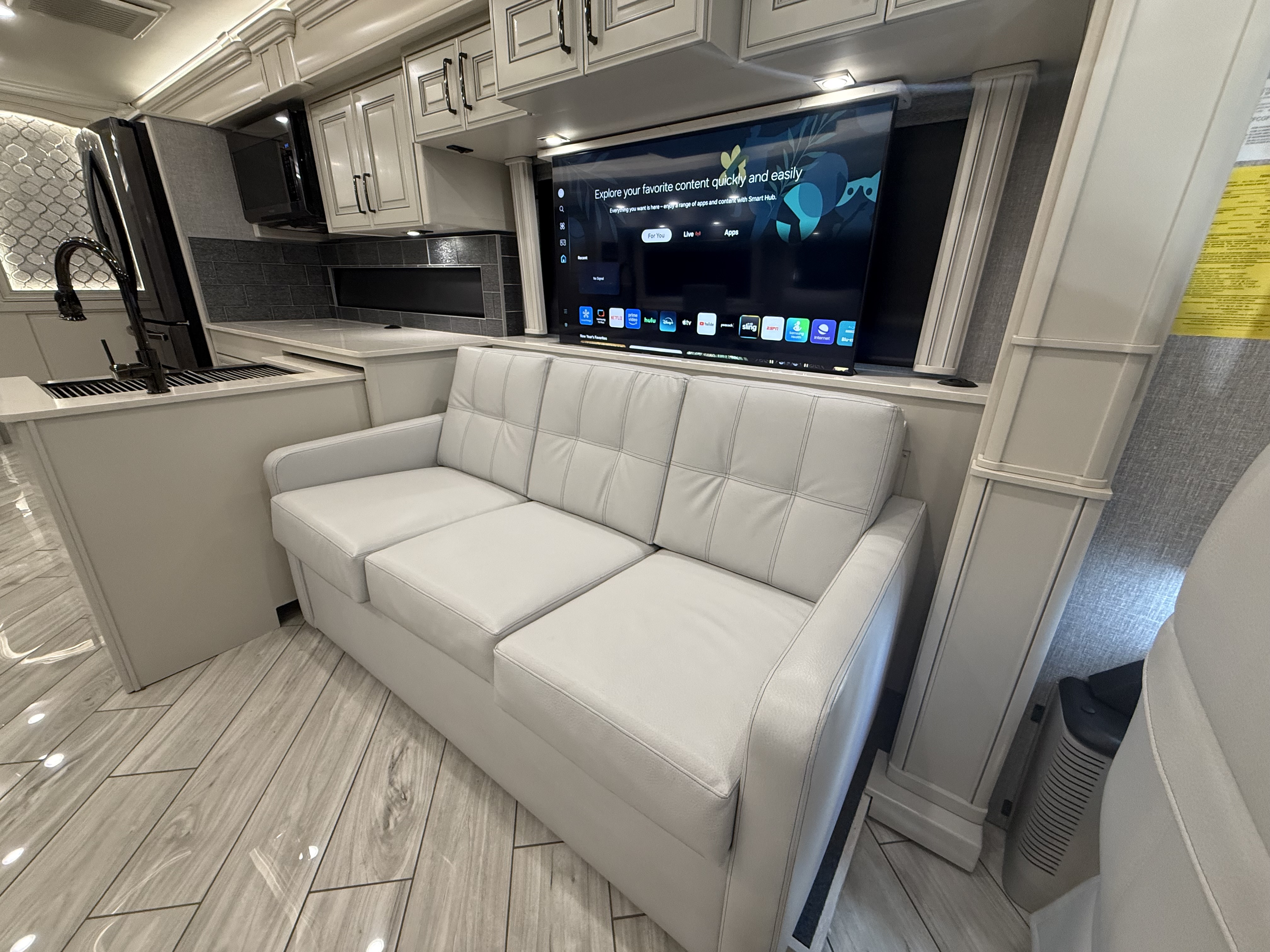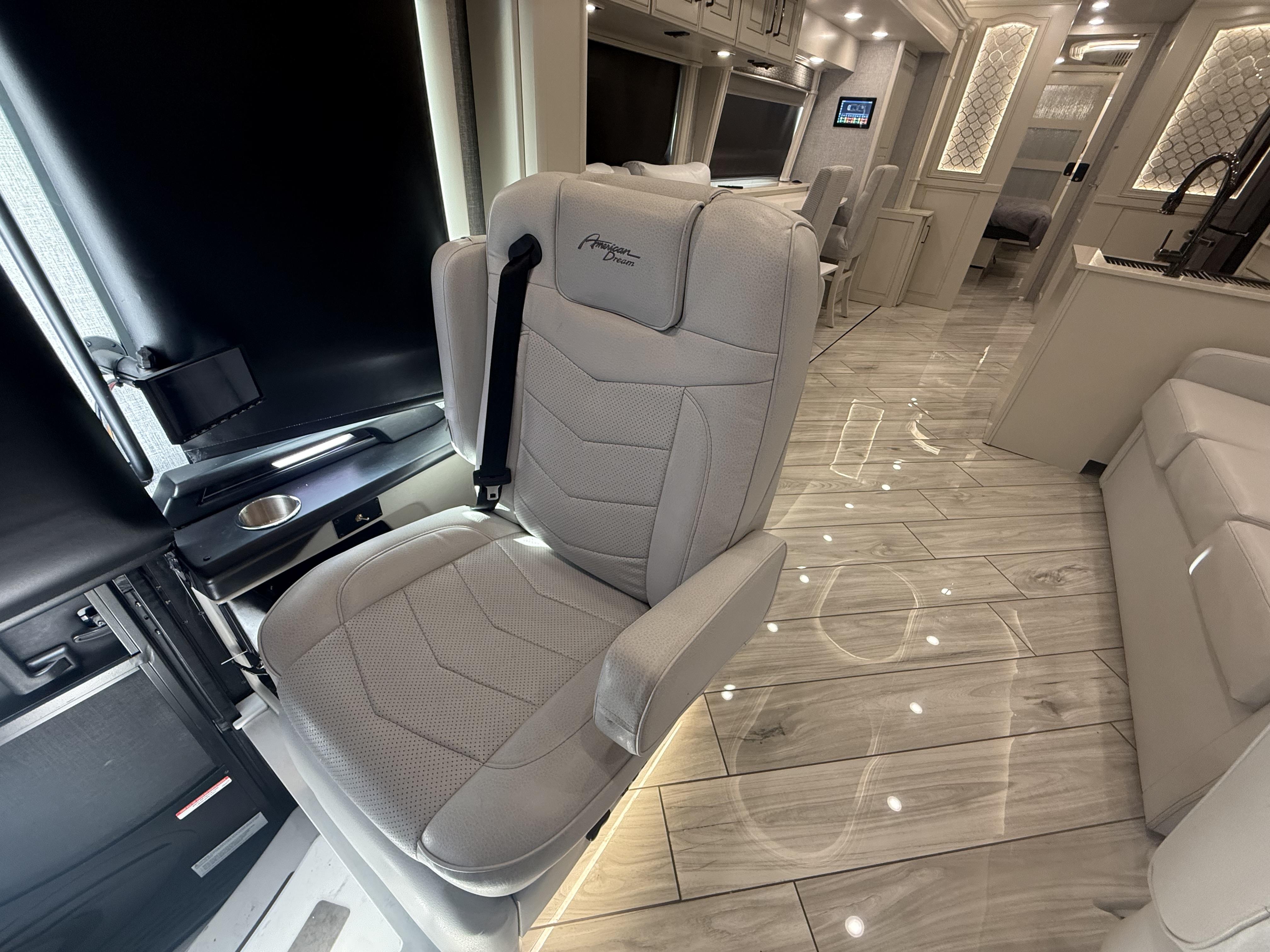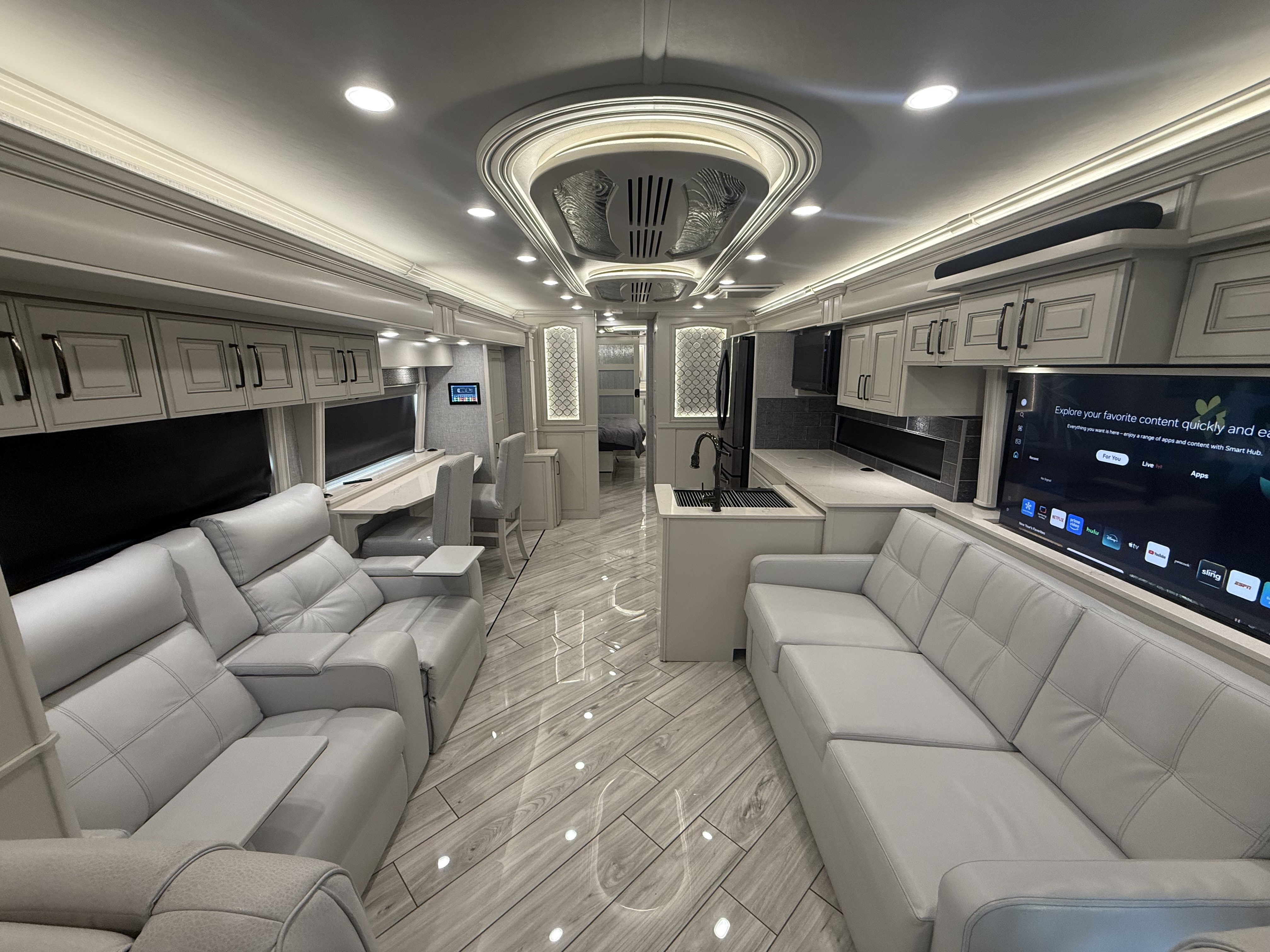 The 2024 American Coach Dream 45P is not just a motorhome; it is a rolling declaration of success, riding on the exclusive Liberty Bridge chassis which provides a foundation of rock-solid stability. This coach is defined by sheer muscle, commanded by the colossal 450HP Cummins L9engine that delivers earth-moving torque, ensuring you can tow a stacker trailer up any grade without hesitation. Inside, the "P" floor plan offers a level of bespoke opulence rarely seen, featuring quartz countertops, heated porcelain tile floors, and Apex custom furniture that rivals the comfort of a private jet. It is a sanctuary of technology and taste, equipped with a digital dash, advanced safety systems, and a master suite that feels like a five-star hotel.