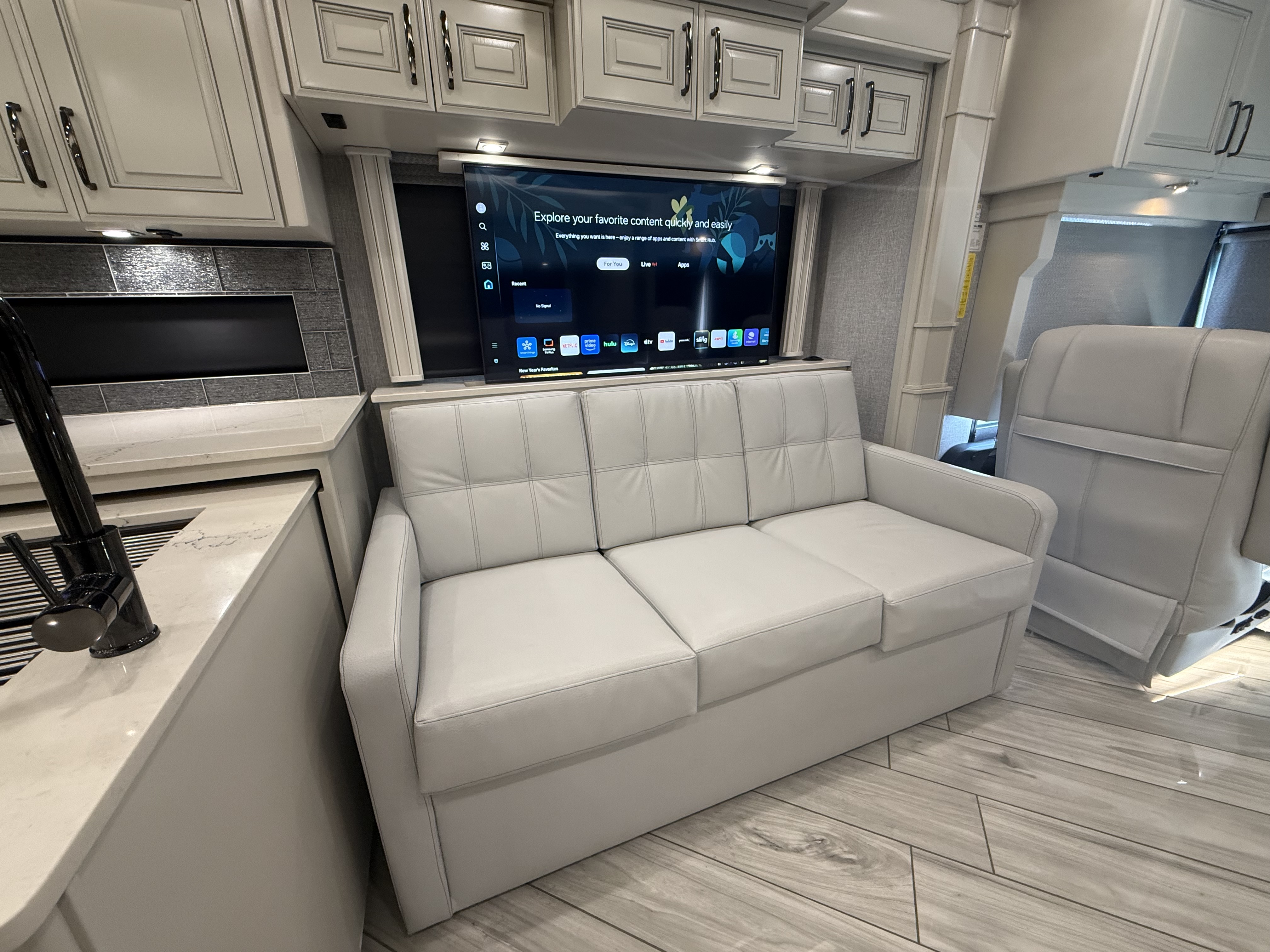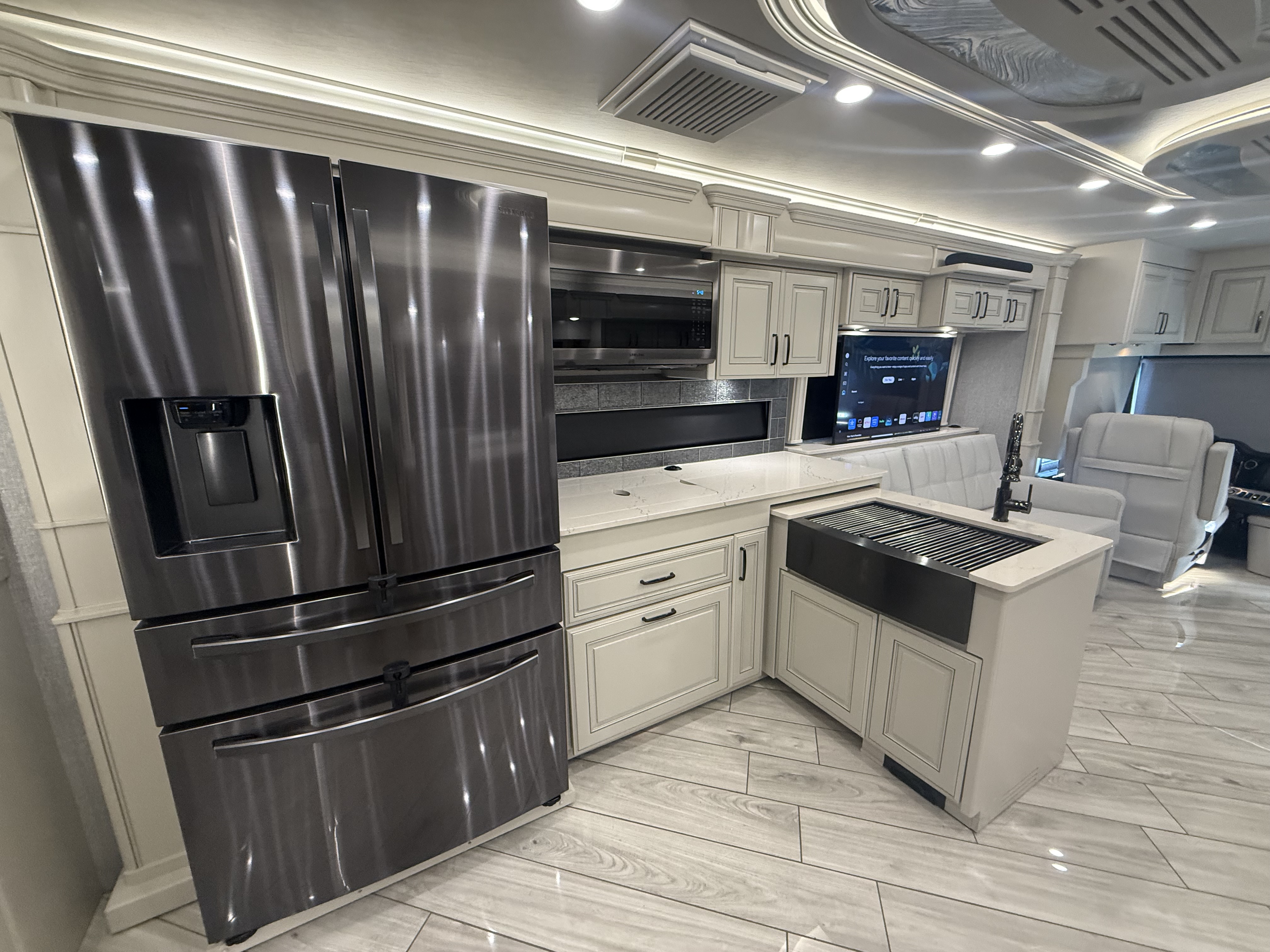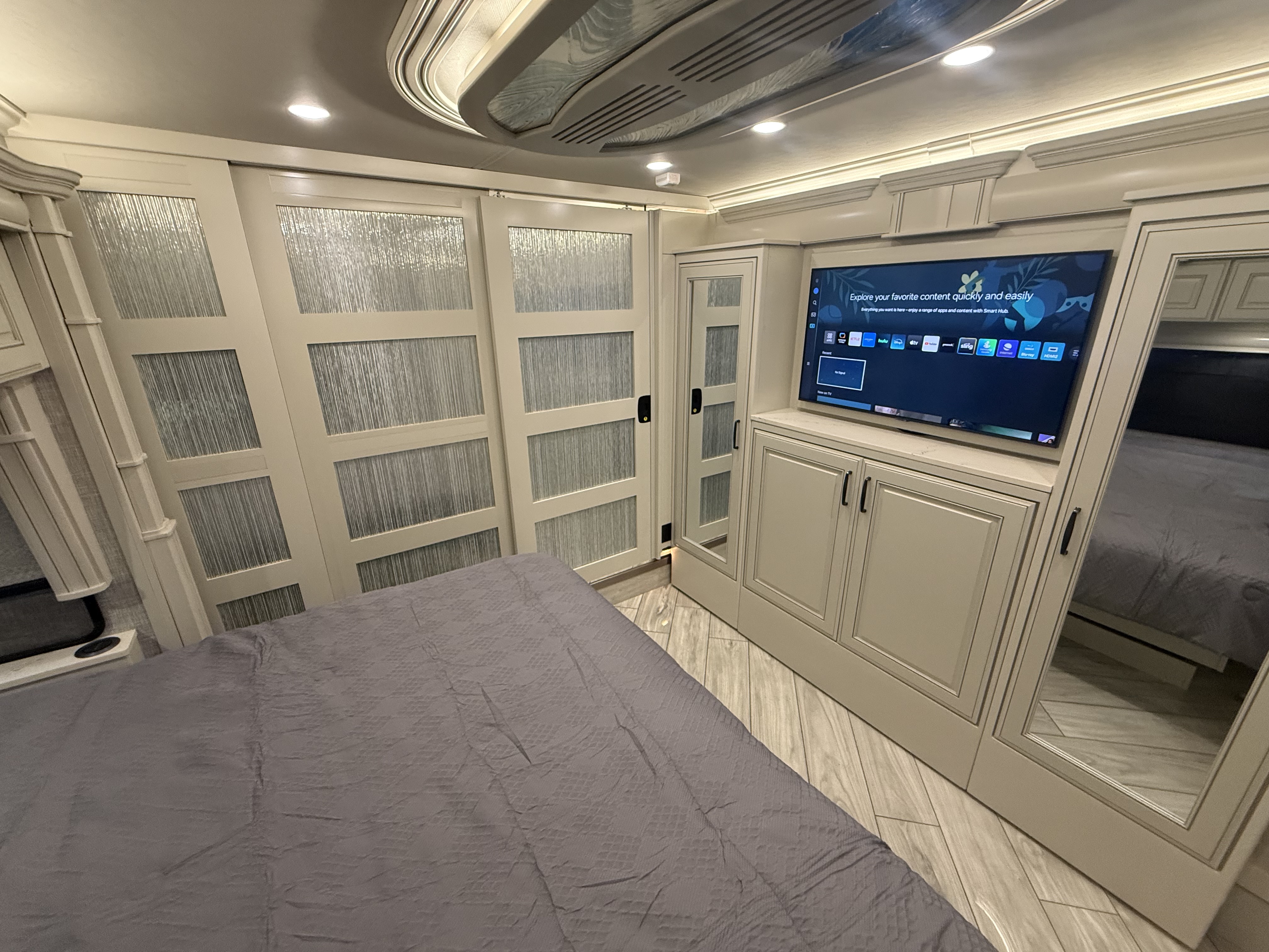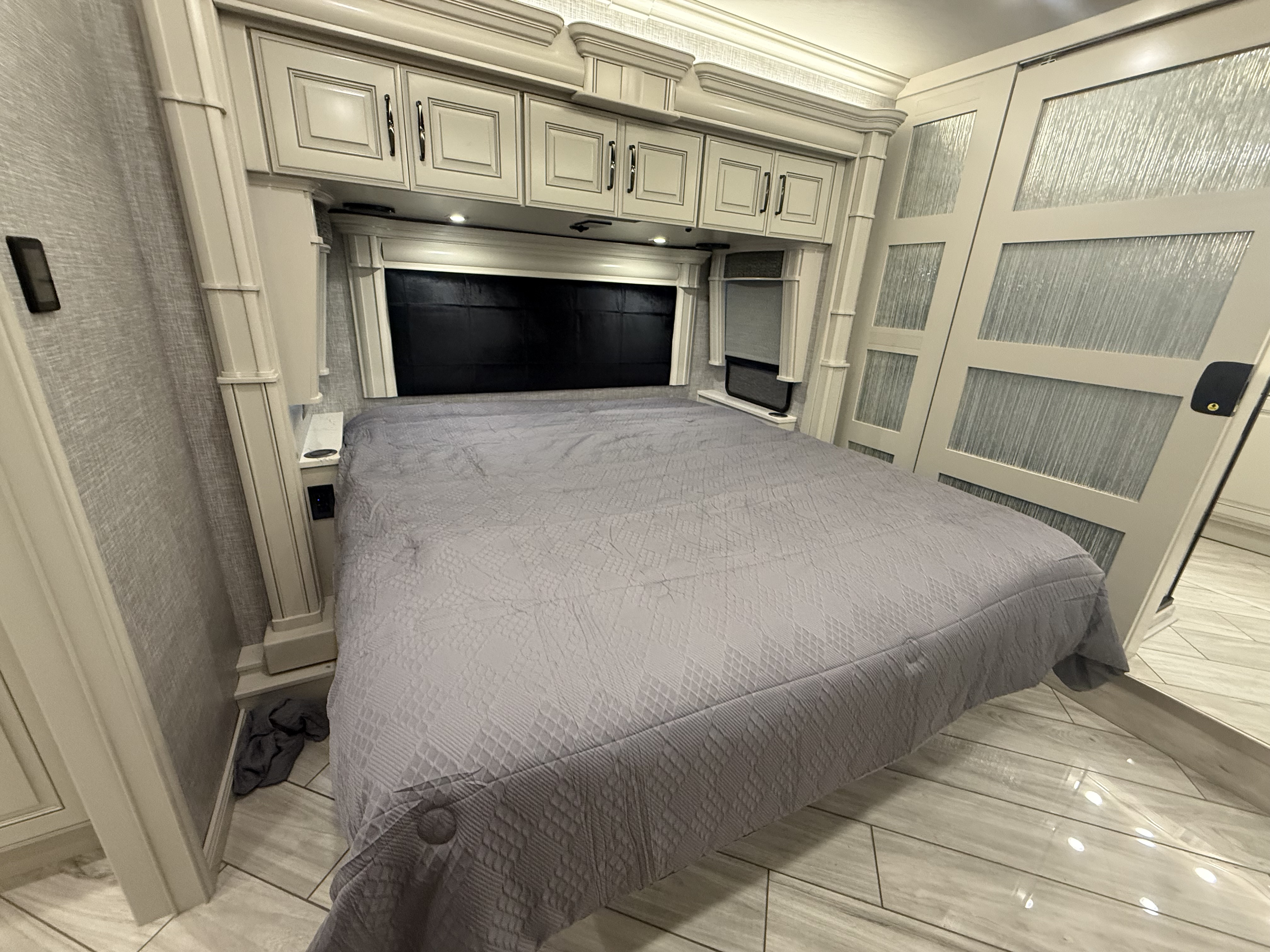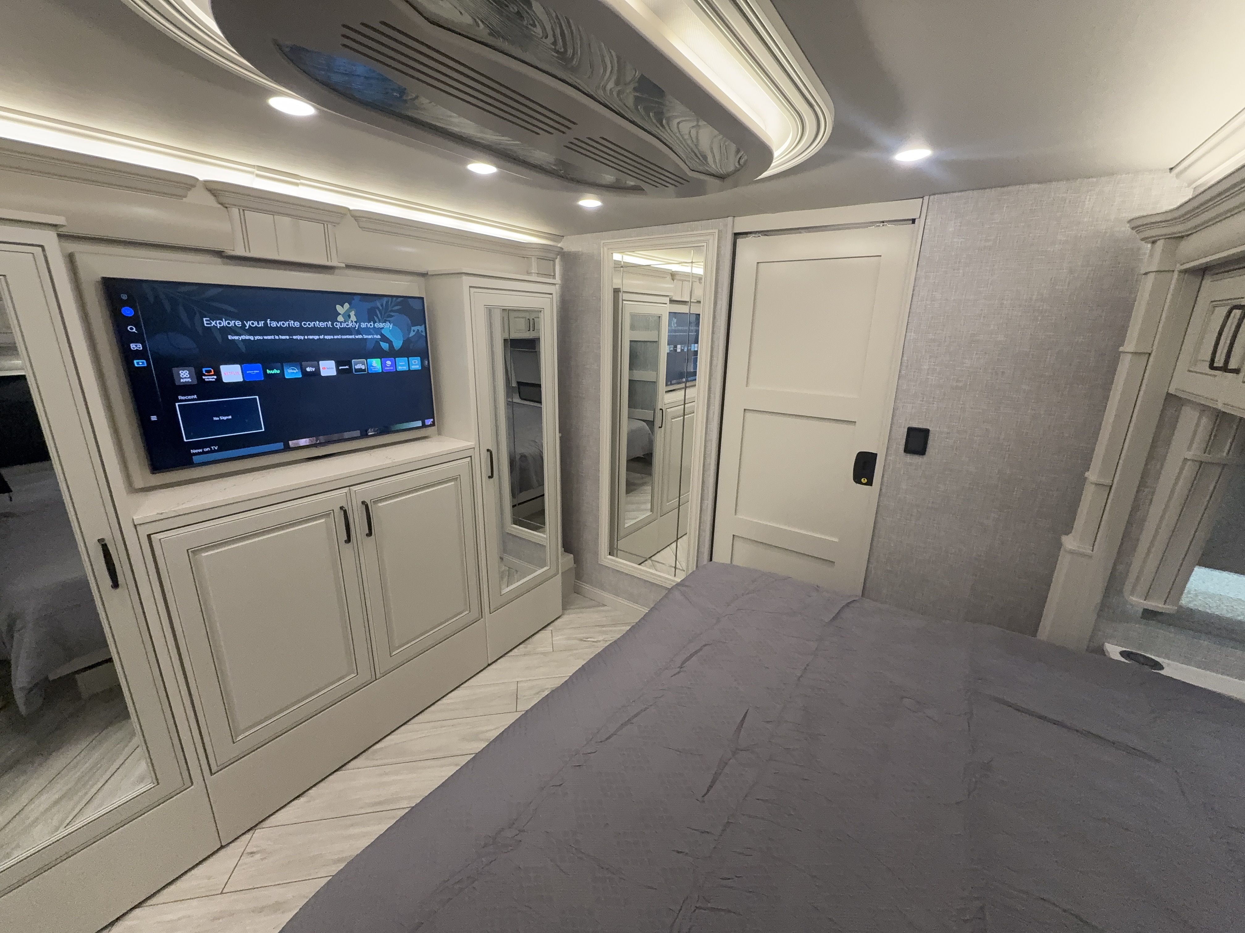 The 2024 American Coach Dream 45P is not just a motorhome; it is a rolling declaration of success, riding on the exclusive Liberty Bridge chassis which provides a foundation of rock-solid stability. This coach is defined by sheer muscle, commanded by the colossal 450HP Cummins L9engine that delivers earth-moving torque, ensuring you can tow a stacker trailer up any grade without hesitation. Inside, the "P" floor plan offers a level of bespoke opulence rarely seen, featuring quartz countertops, heated porcelain tile floors, and Apex custom furniture that rivals the comfort of a private jet. It is a sanctuary of technology and taste, equipped with a digital dash, advanced safety systems, and a master suite that feels like a five-star hotel.