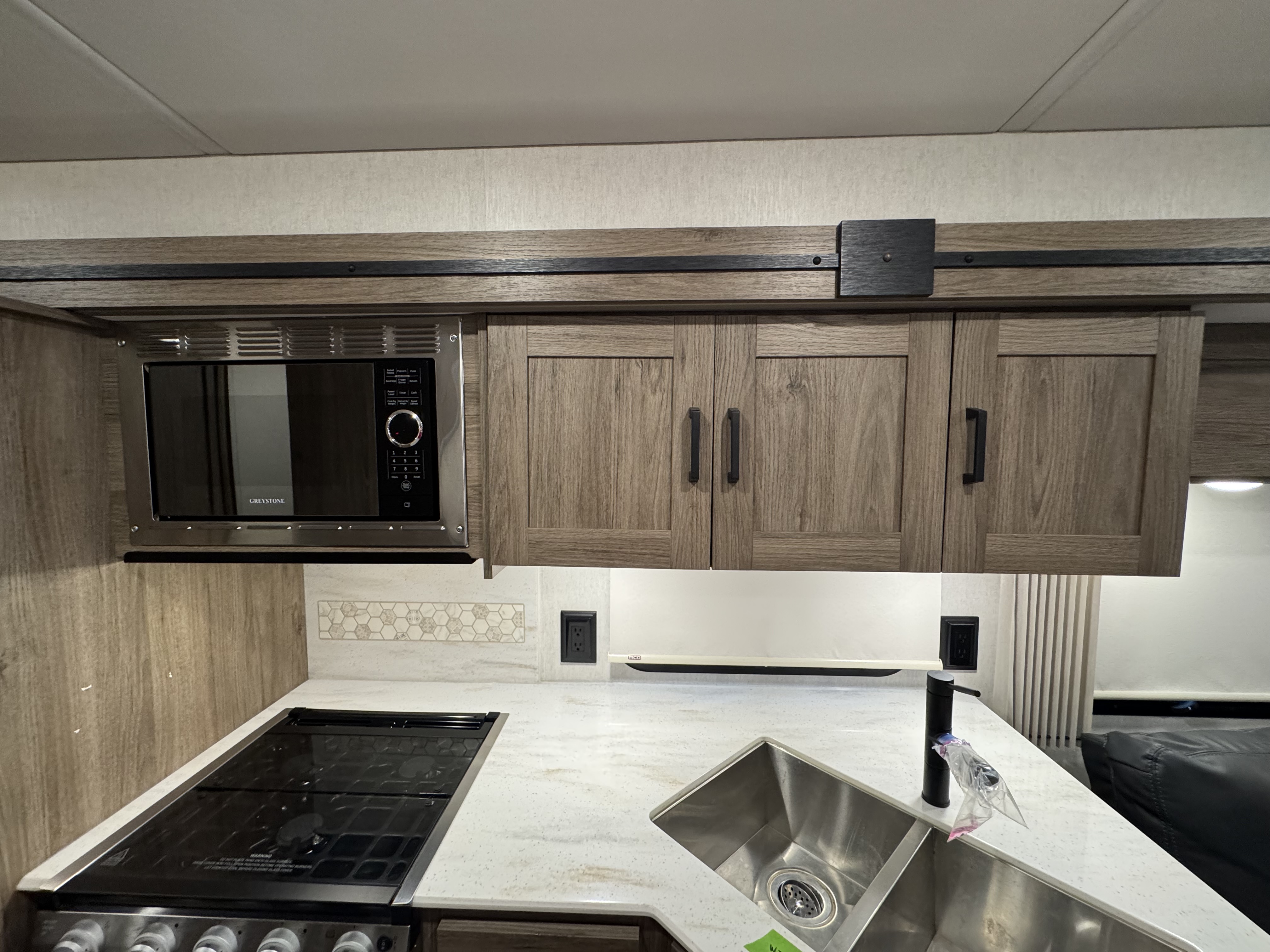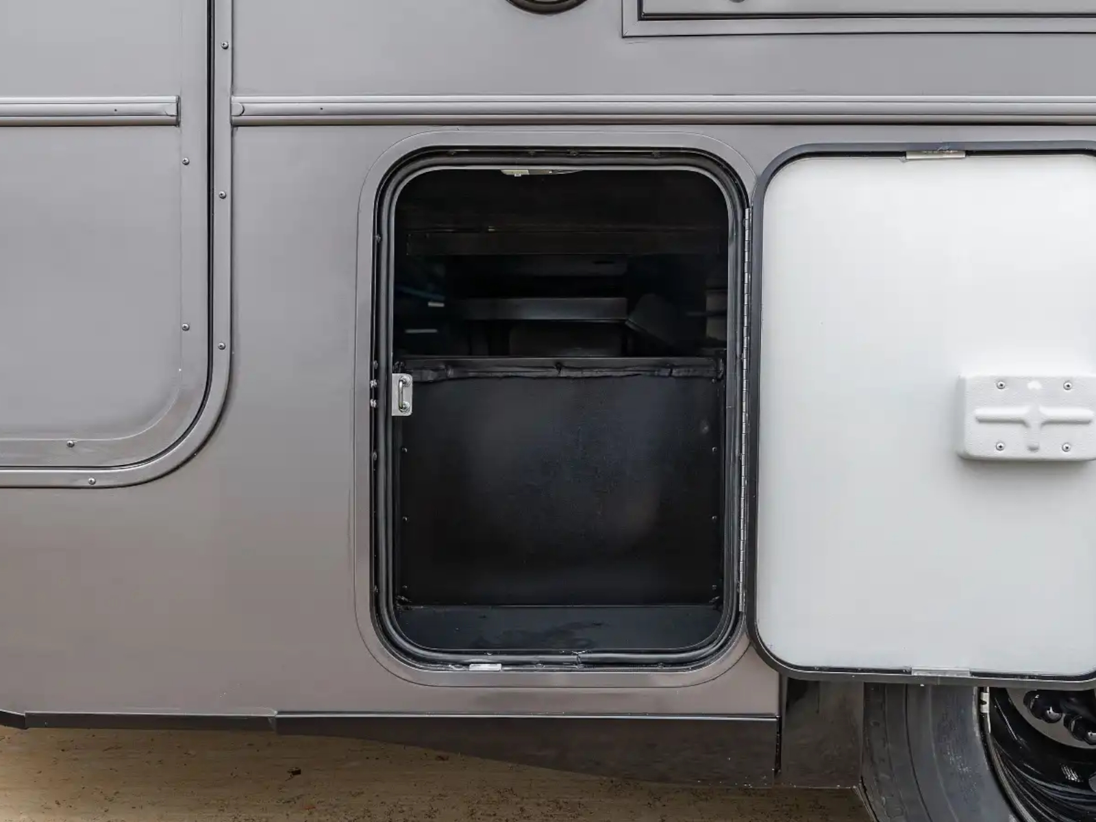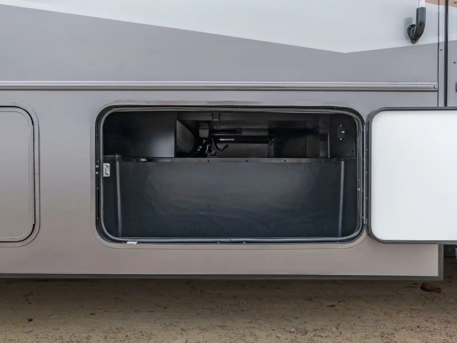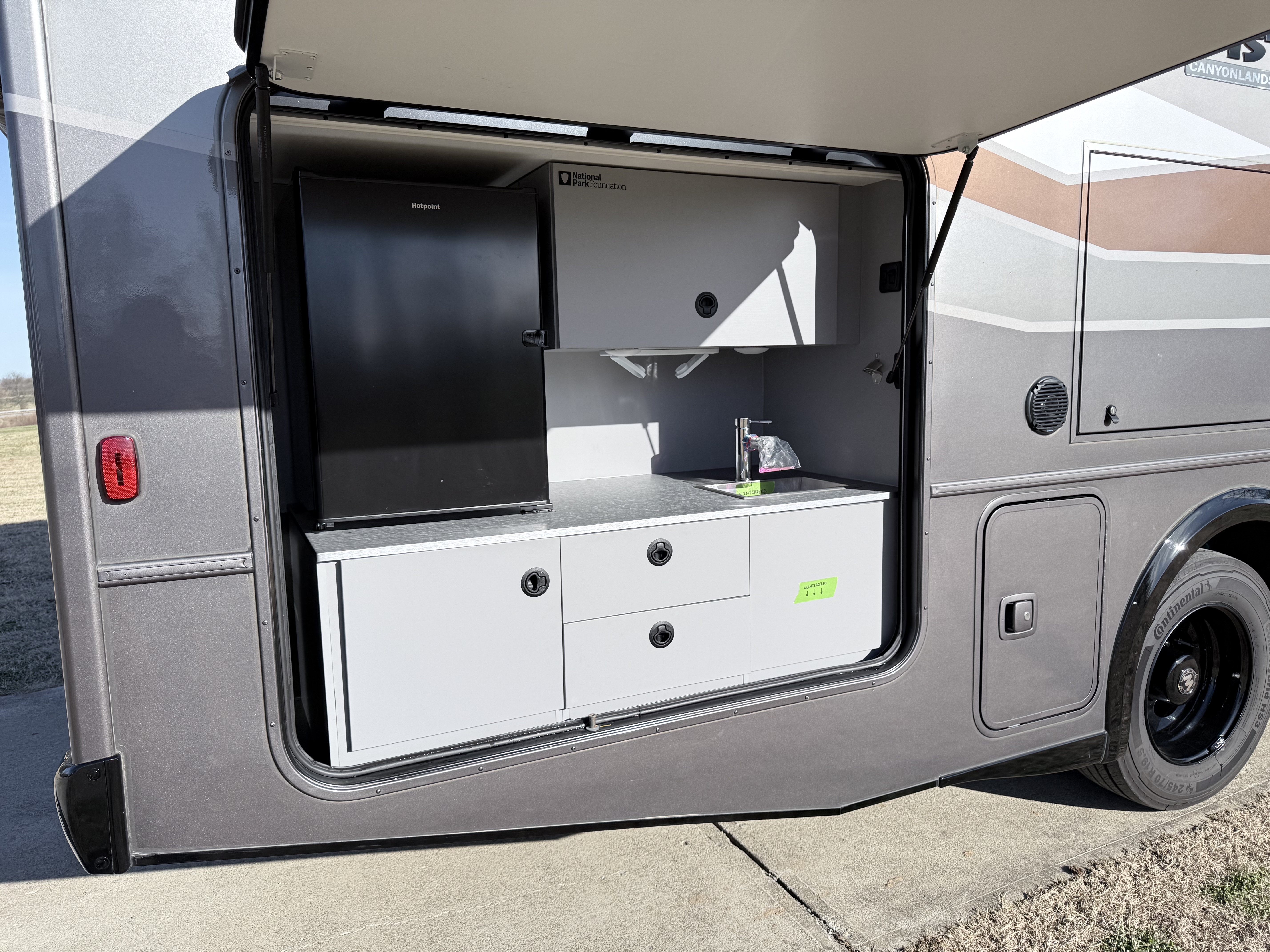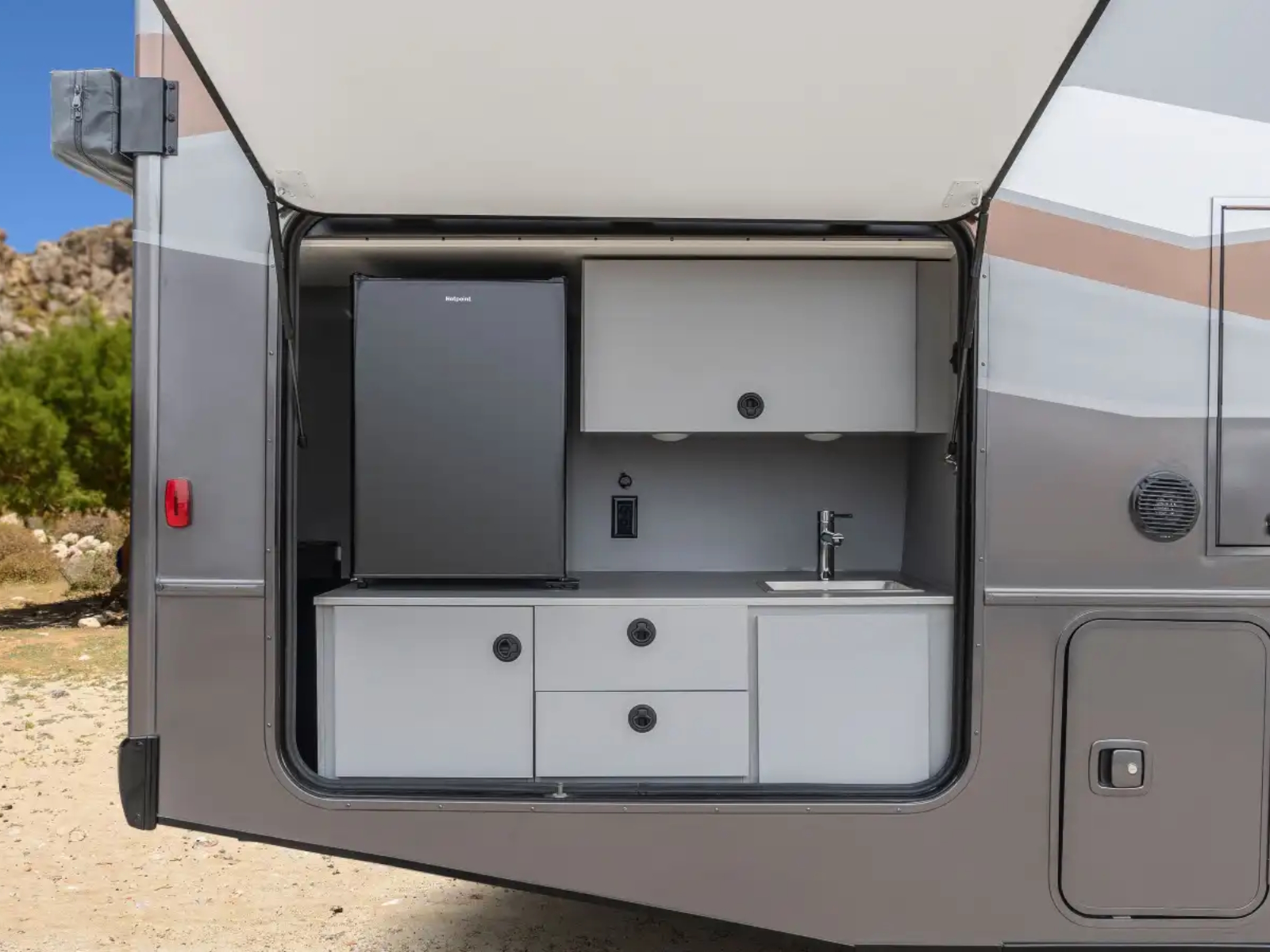 The Tailgate Package is perfect for entertaining or cooking while chilling outside. The exterior galley includes a refrigerator, sink, LP Quick-Connect for a portable stove or grill, and other convenient accessories.