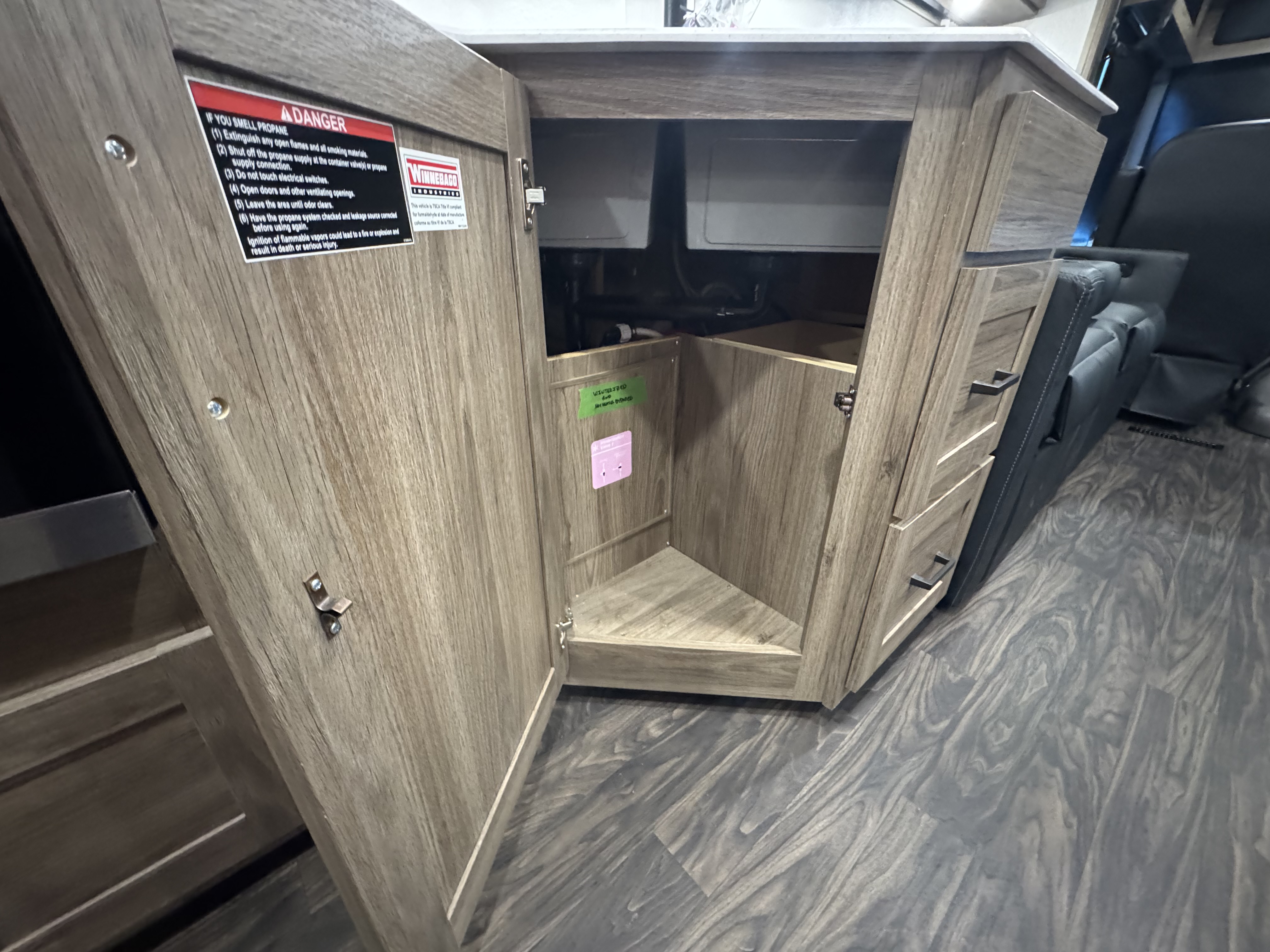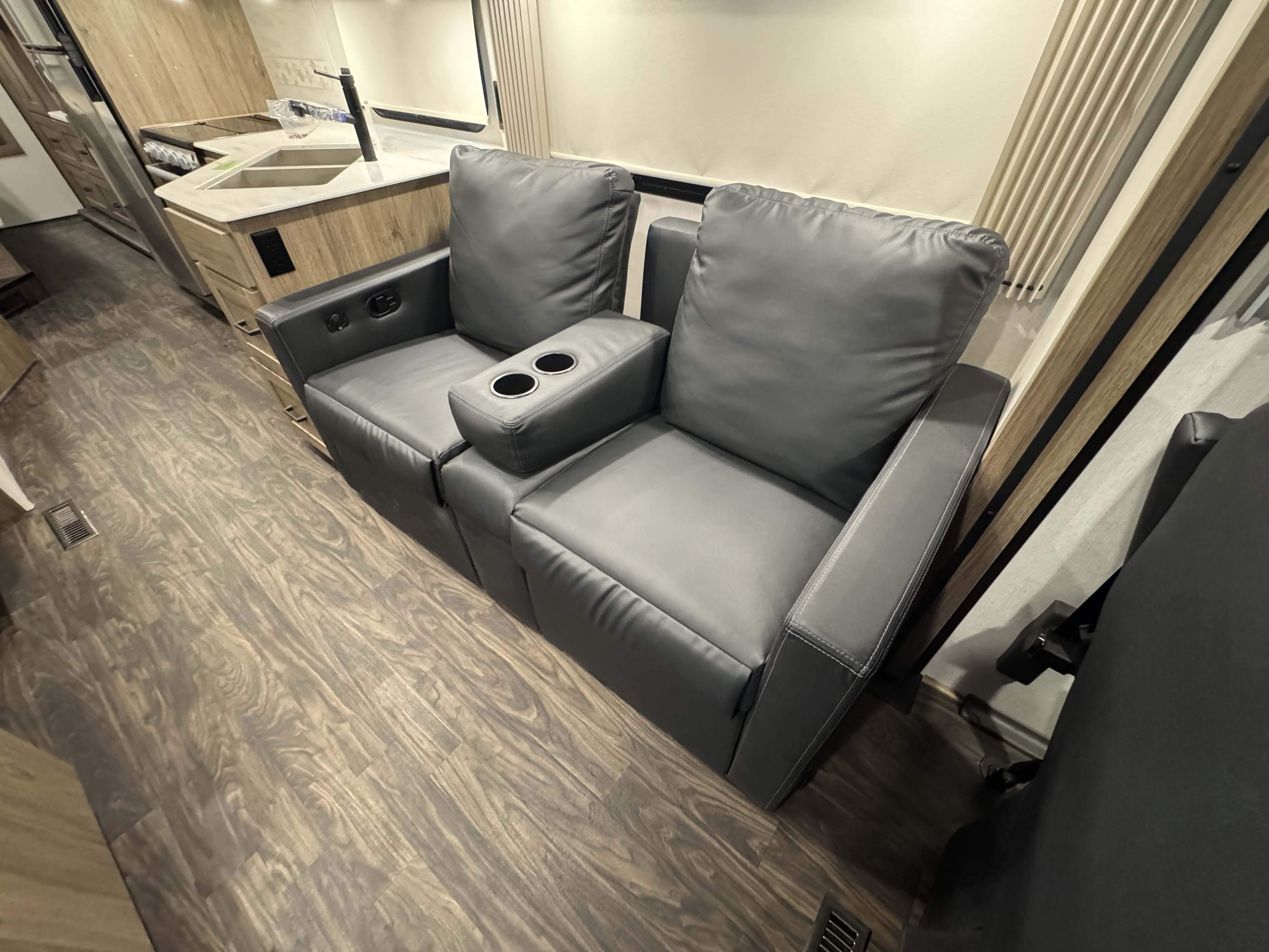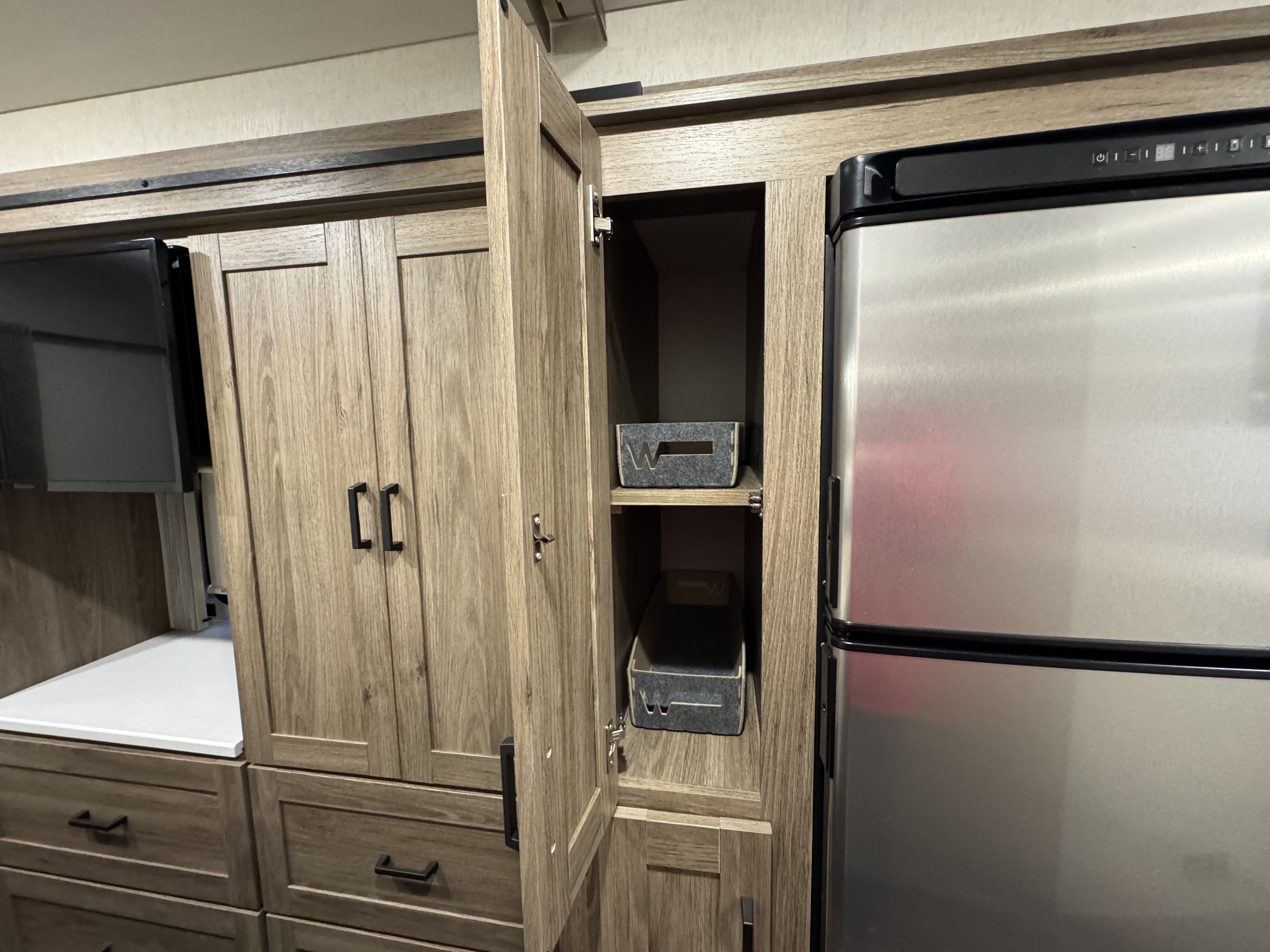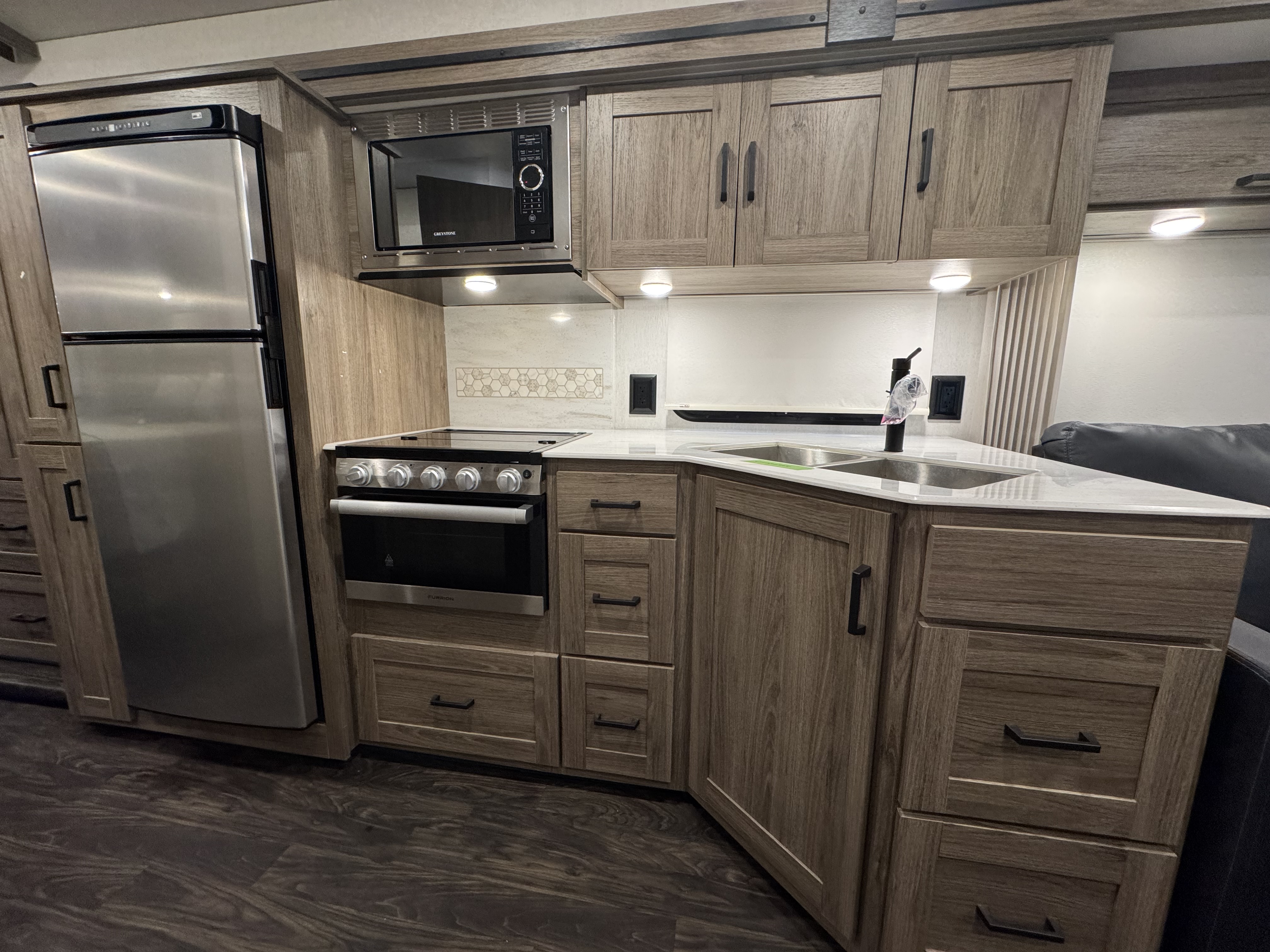 The Tailgate Package is perfect for entertaining or cooking while chilling outside. The exterior galley includes a refrigerator, sink, LP Quick-Connect for a portable stove or grill, and other convenient accessories.