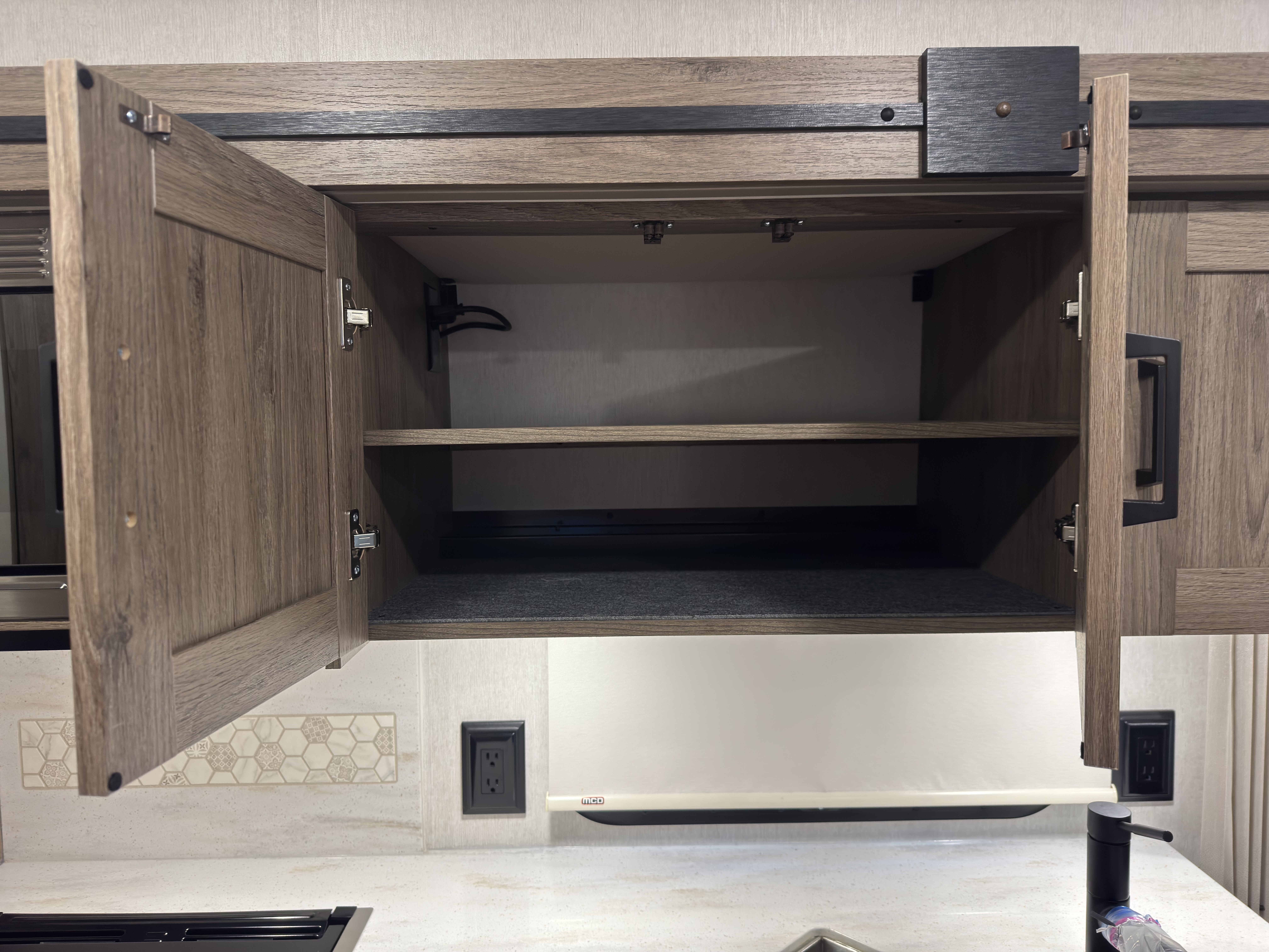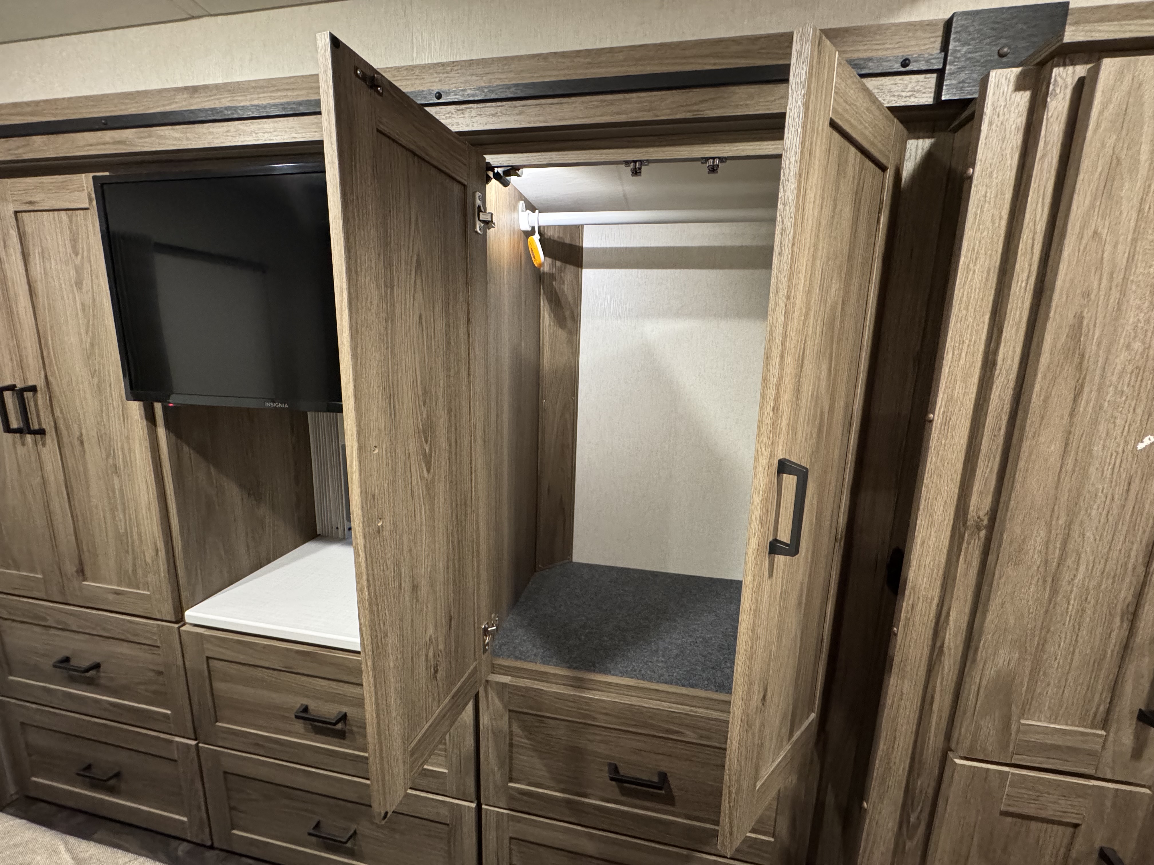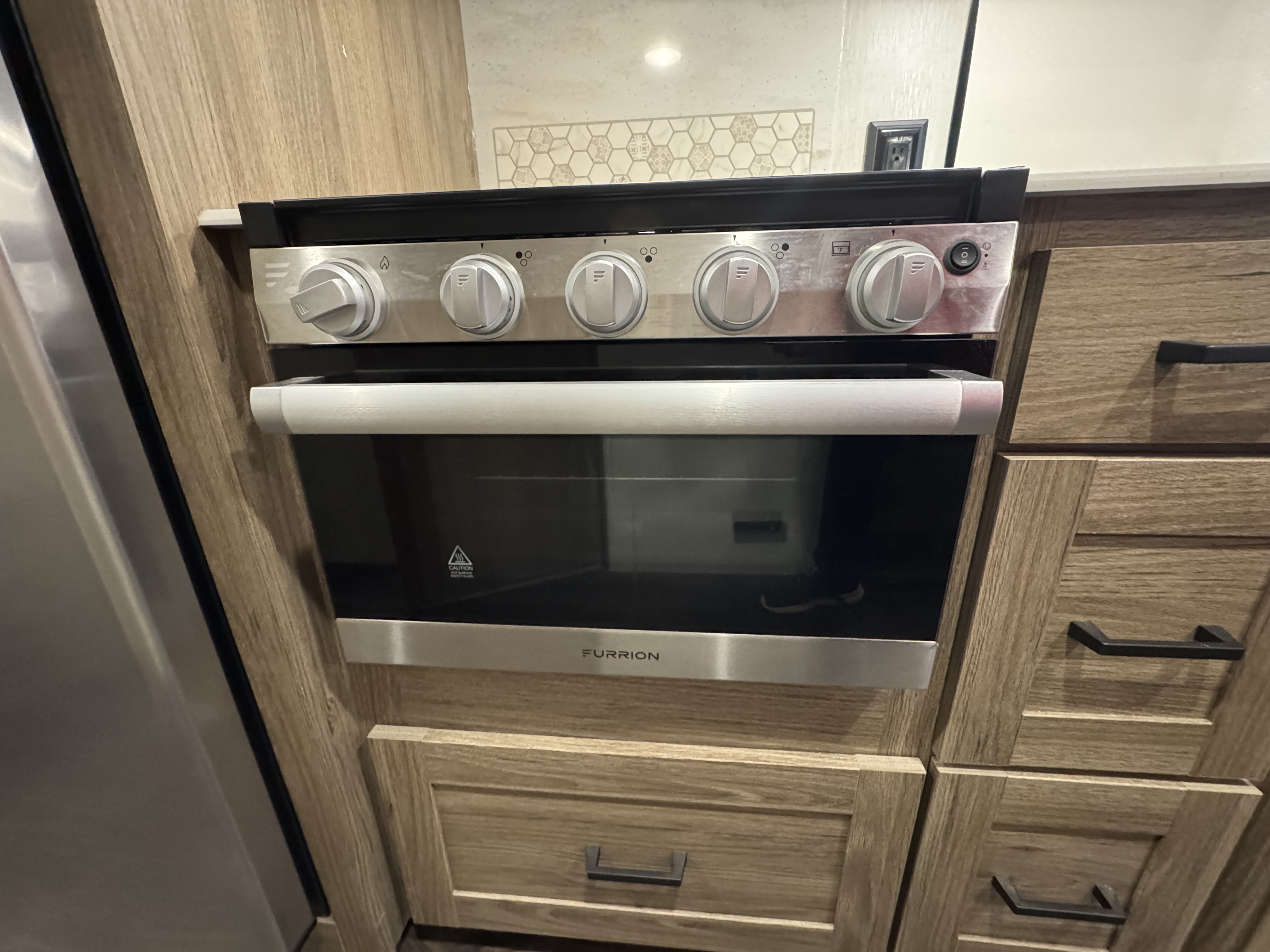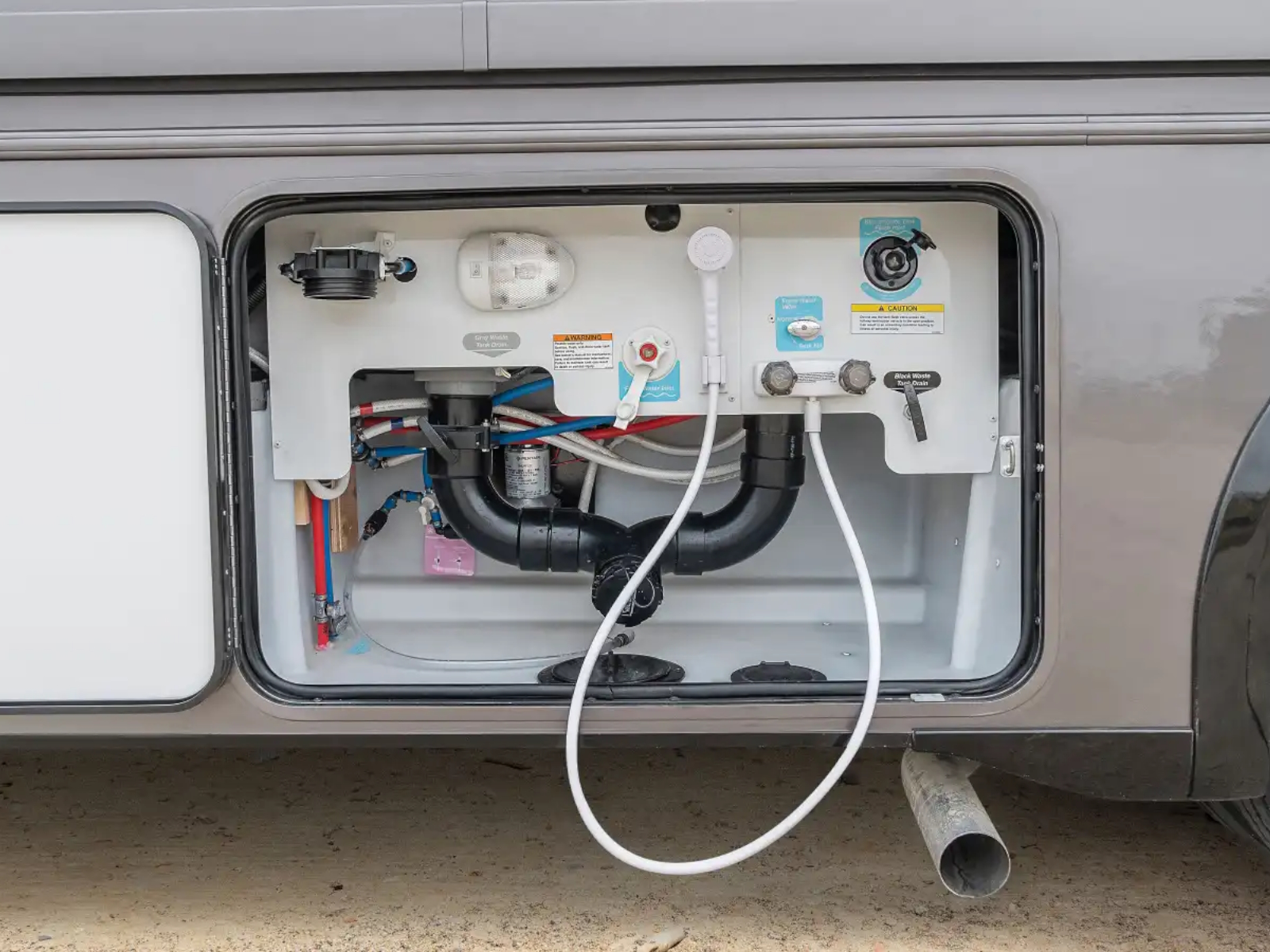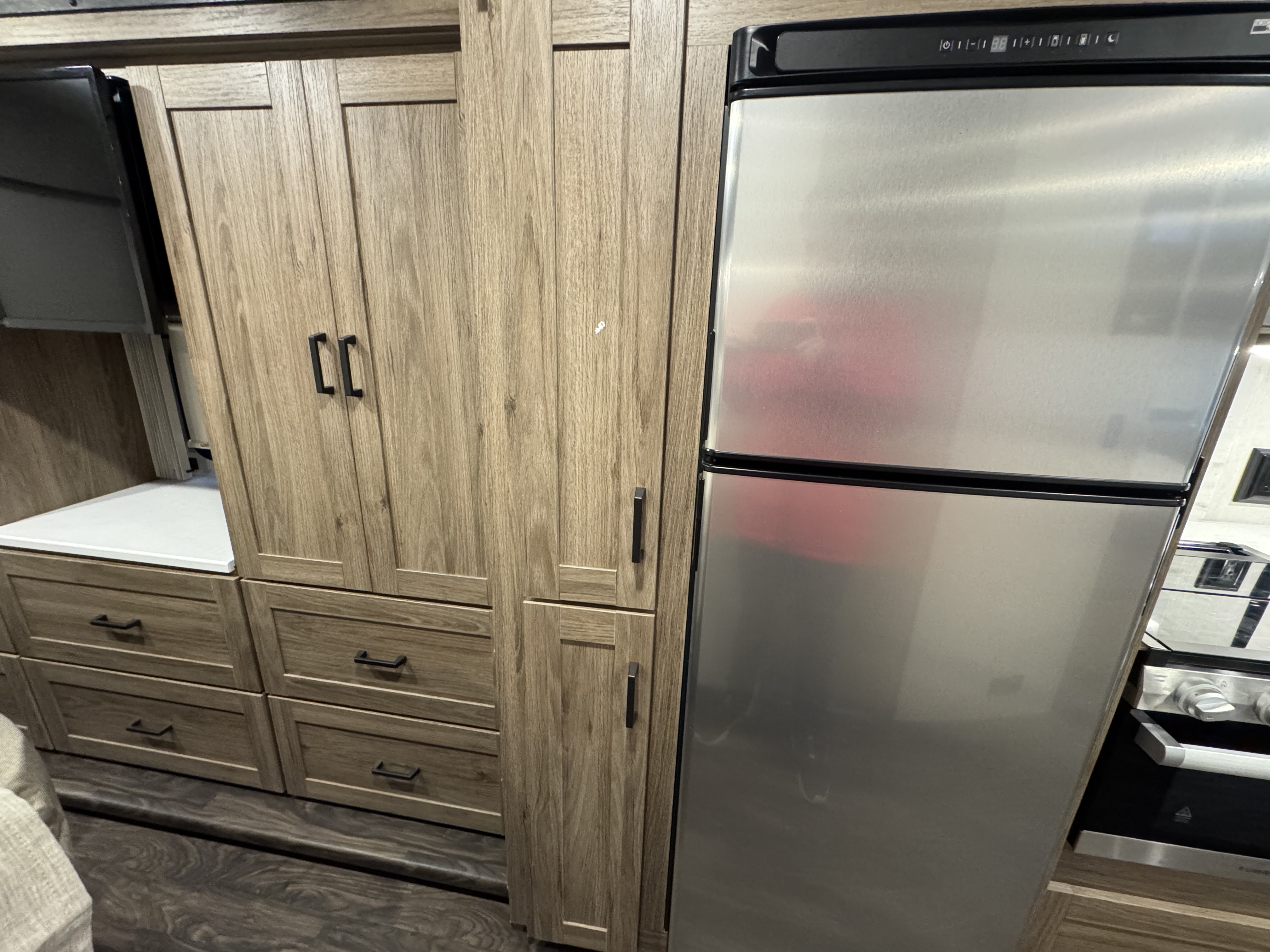The Tailgate Package is perfect for entertaining or cooking while chilling outside. The exterior galley includes a refrigerator, sink, LP Quick-Connect for a portable stove or grill, and other convenient accessories.