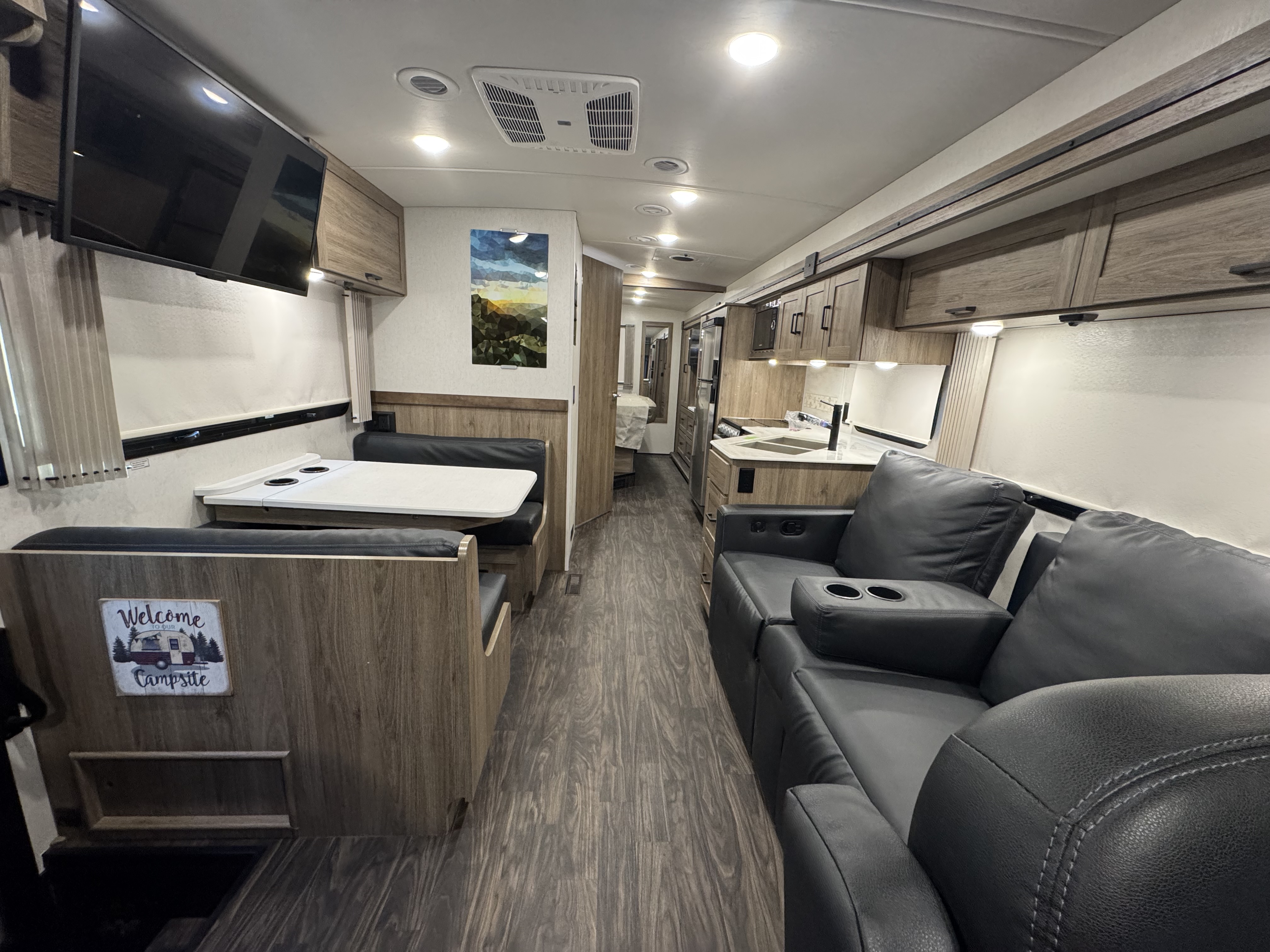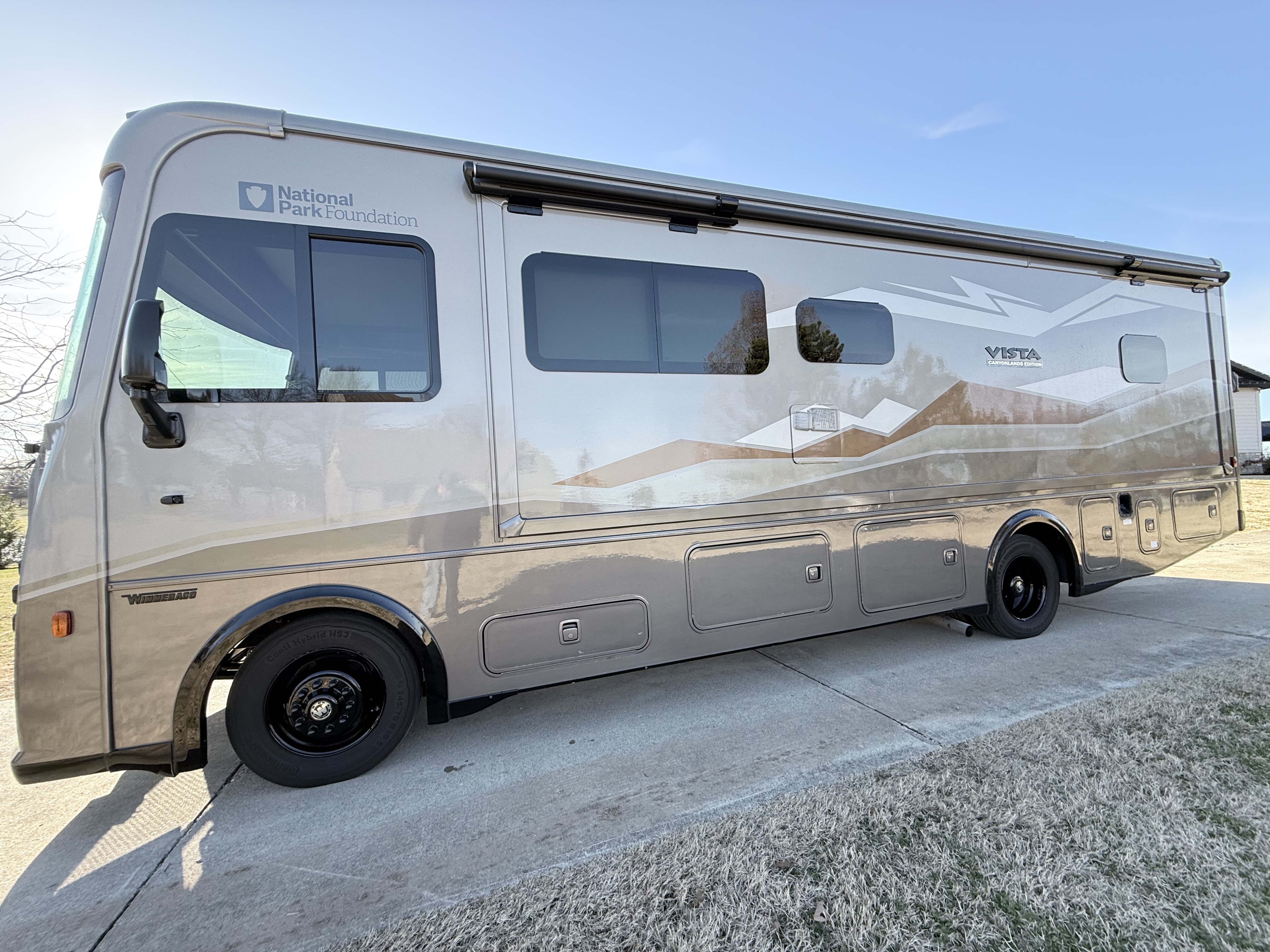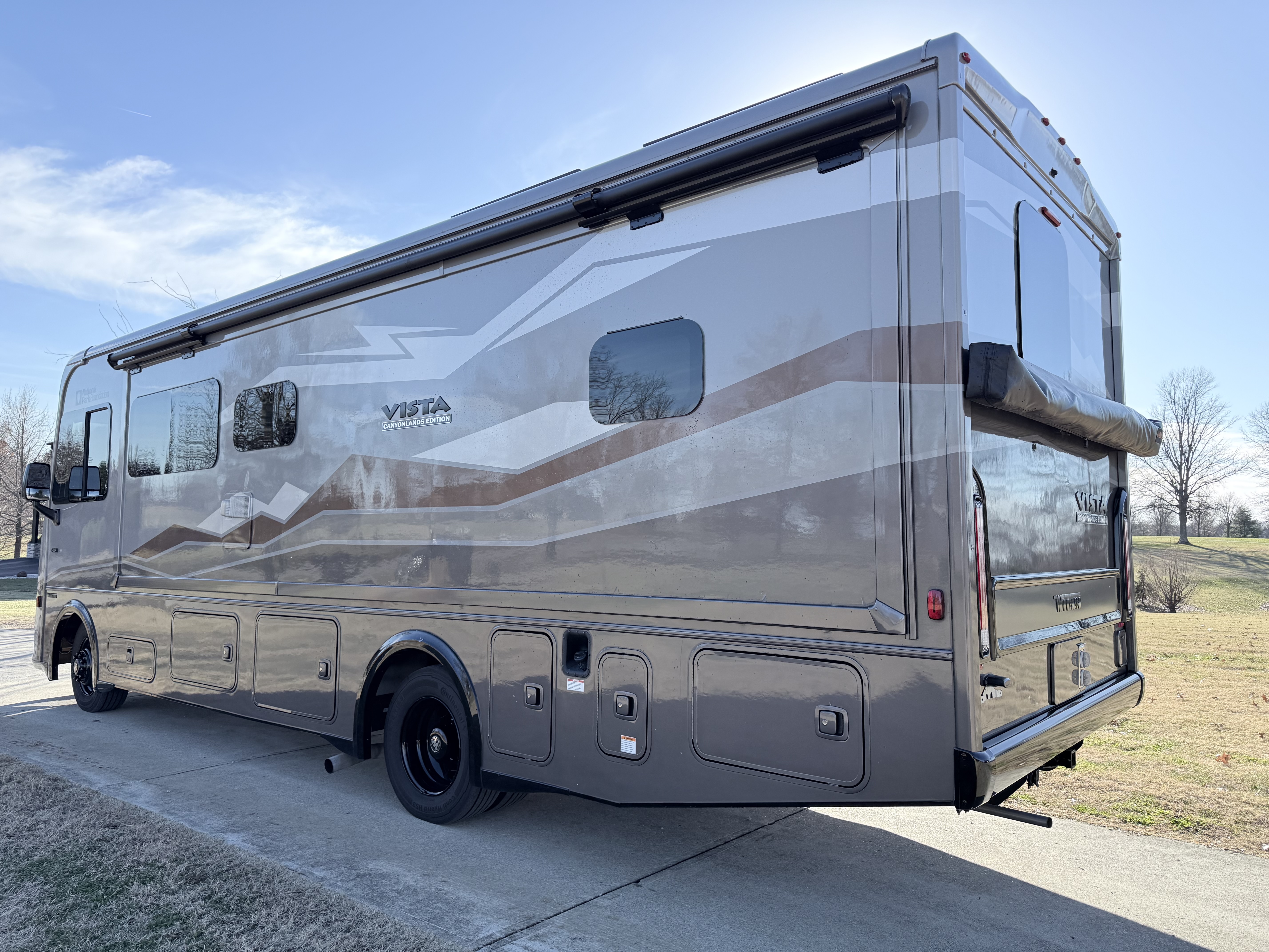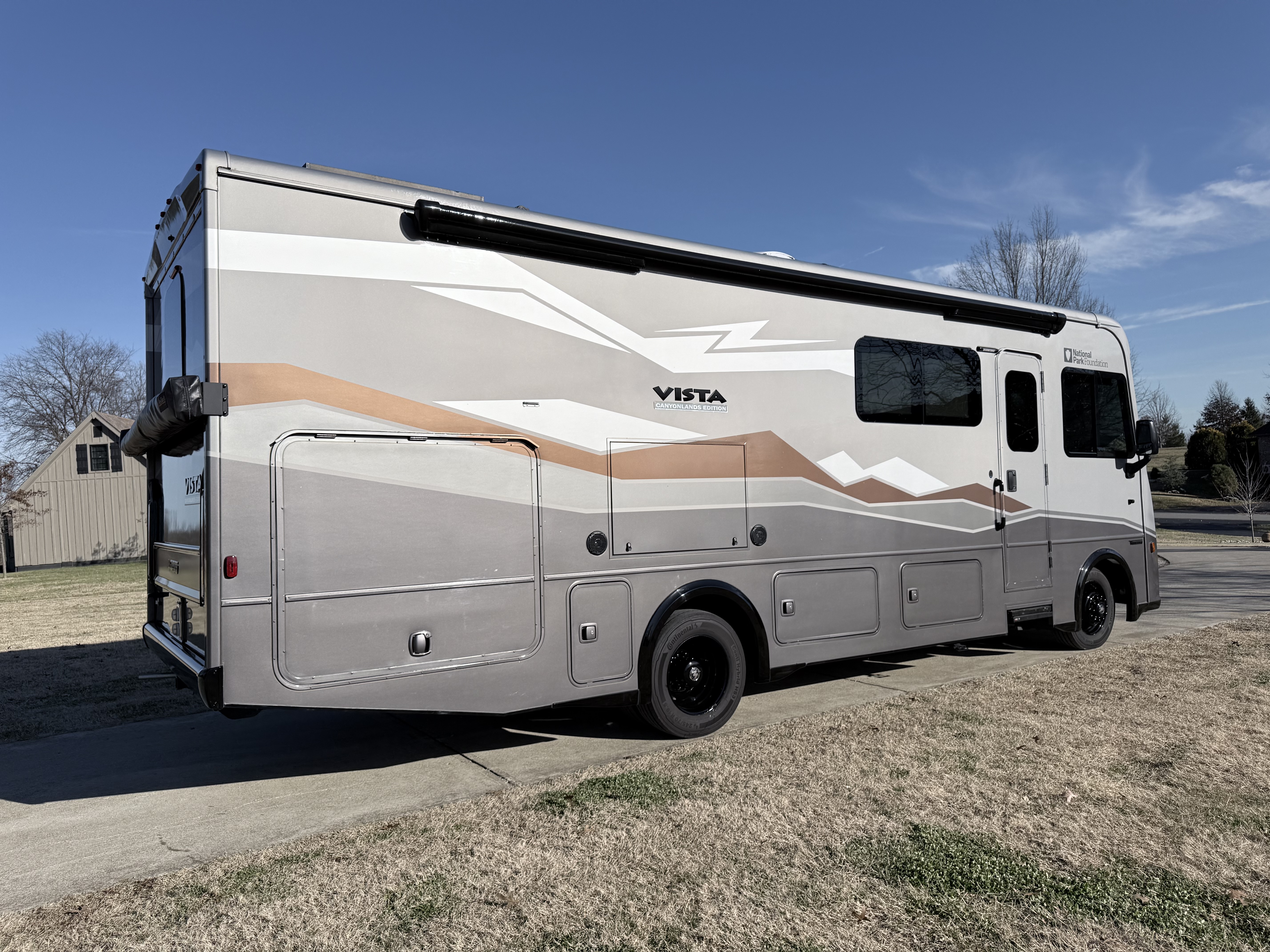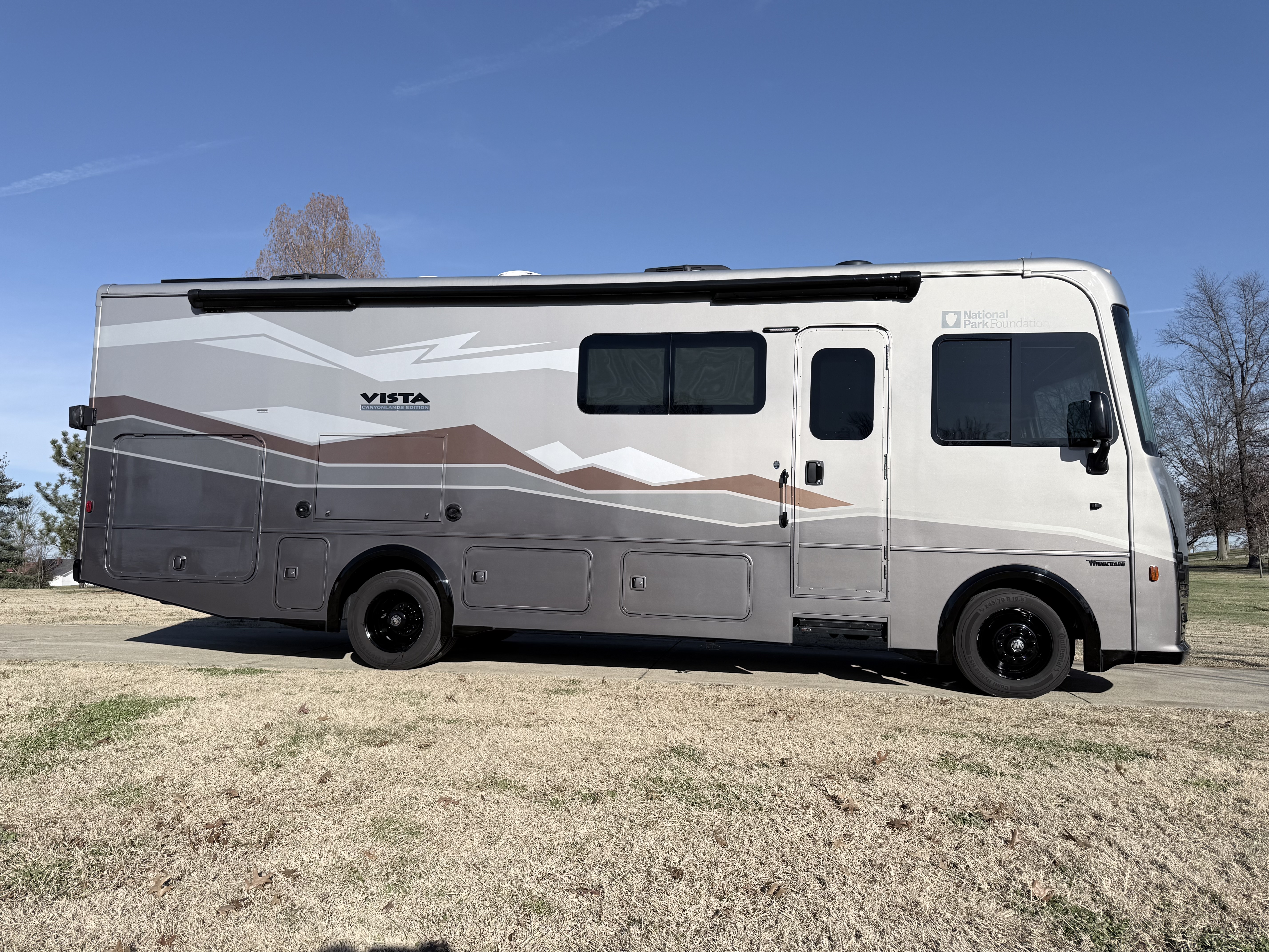The 2024 Vista NPF (National Park Foundation) Edition is a special release designed for the adventurer who wants to go further, showcased here in the rugged "Canyonlands" exterior graphics. Winnebago upgrades this model with a factory-installed SumoSprings suspension package and steering stabilizer, delivering a drive that feels planted and secure on winding park roads. It is ready for the wild with an enhanced solar energy system and batwing awning, allowing you to set up a comfortable, off-grid basecamp quickly, while the interior remains refined with distinct "NPF" mountain-inspired decor.
