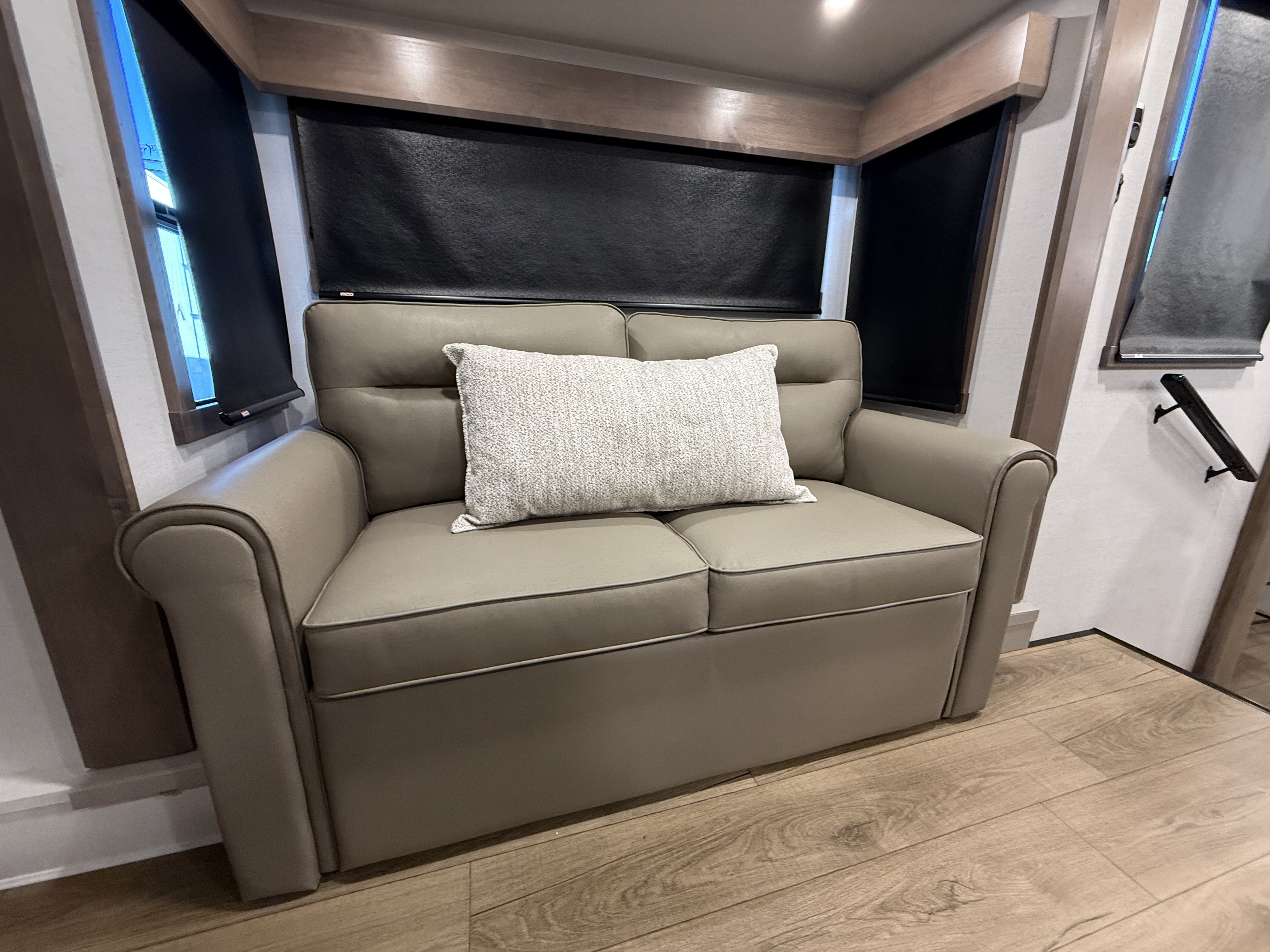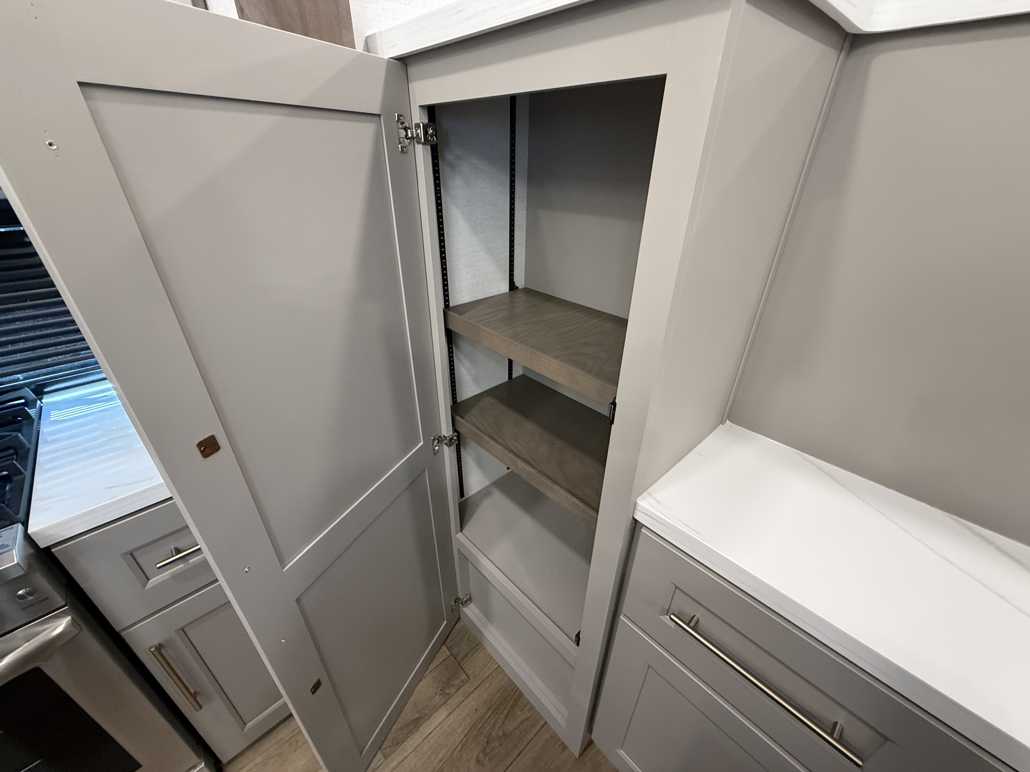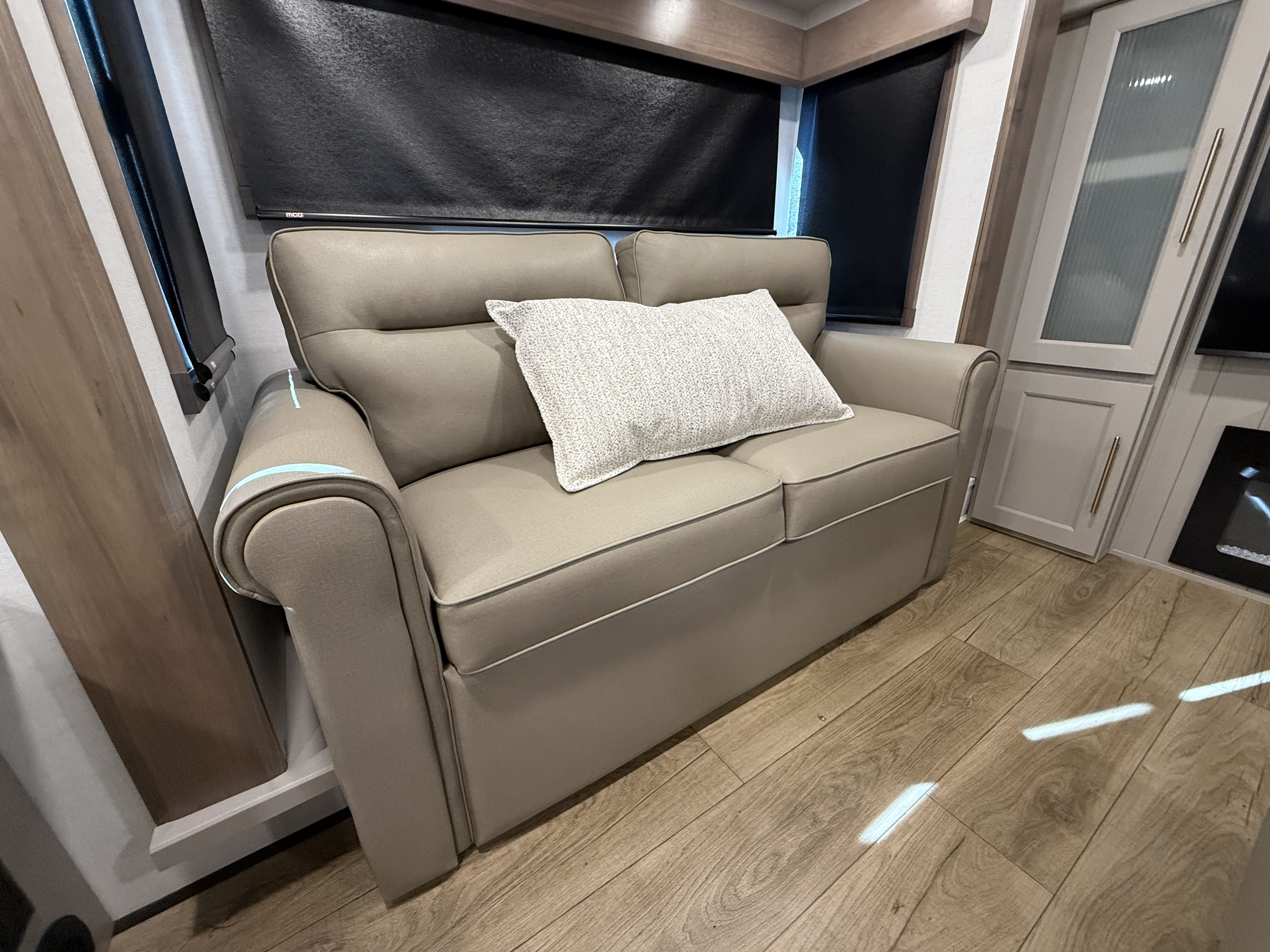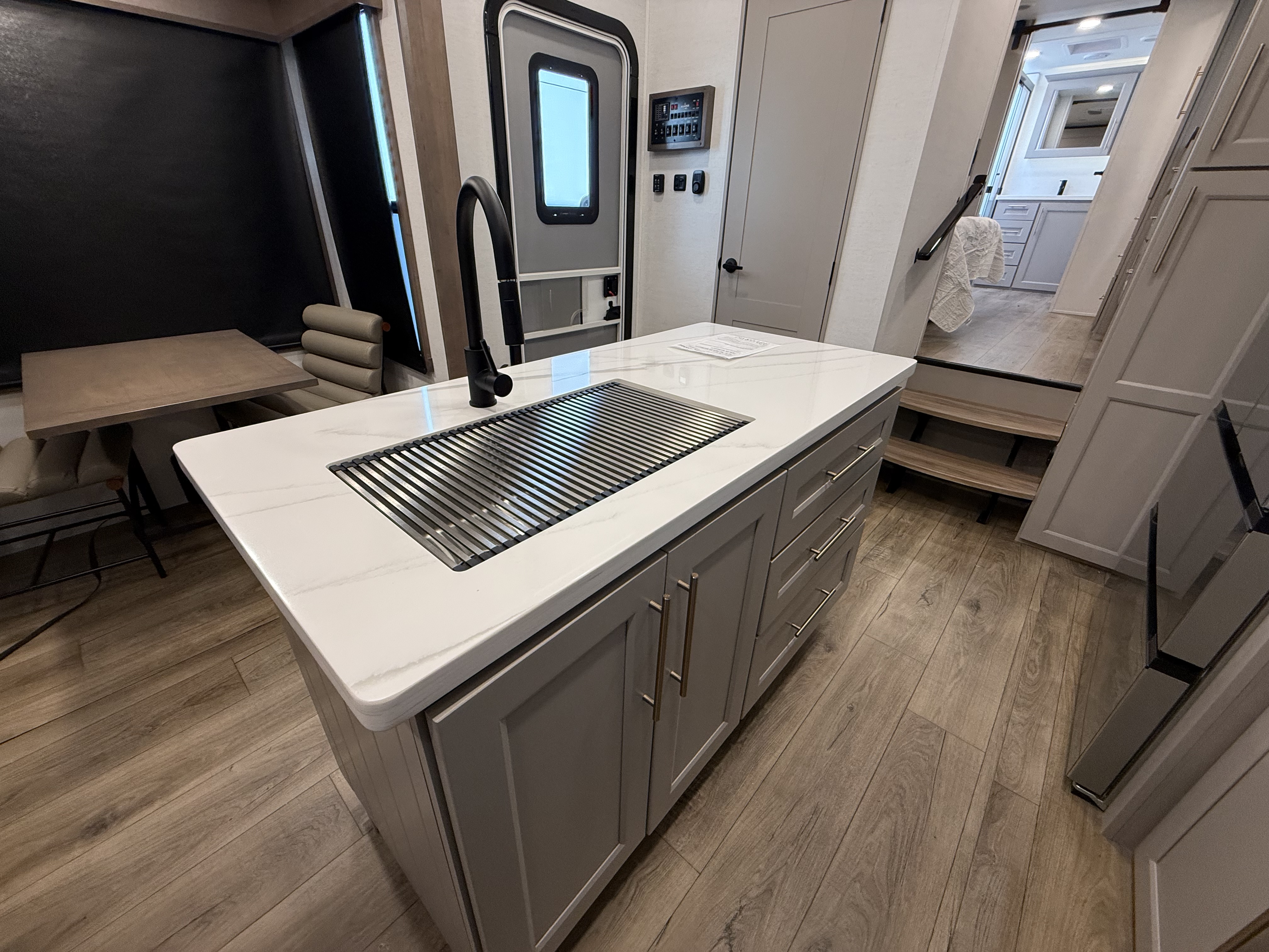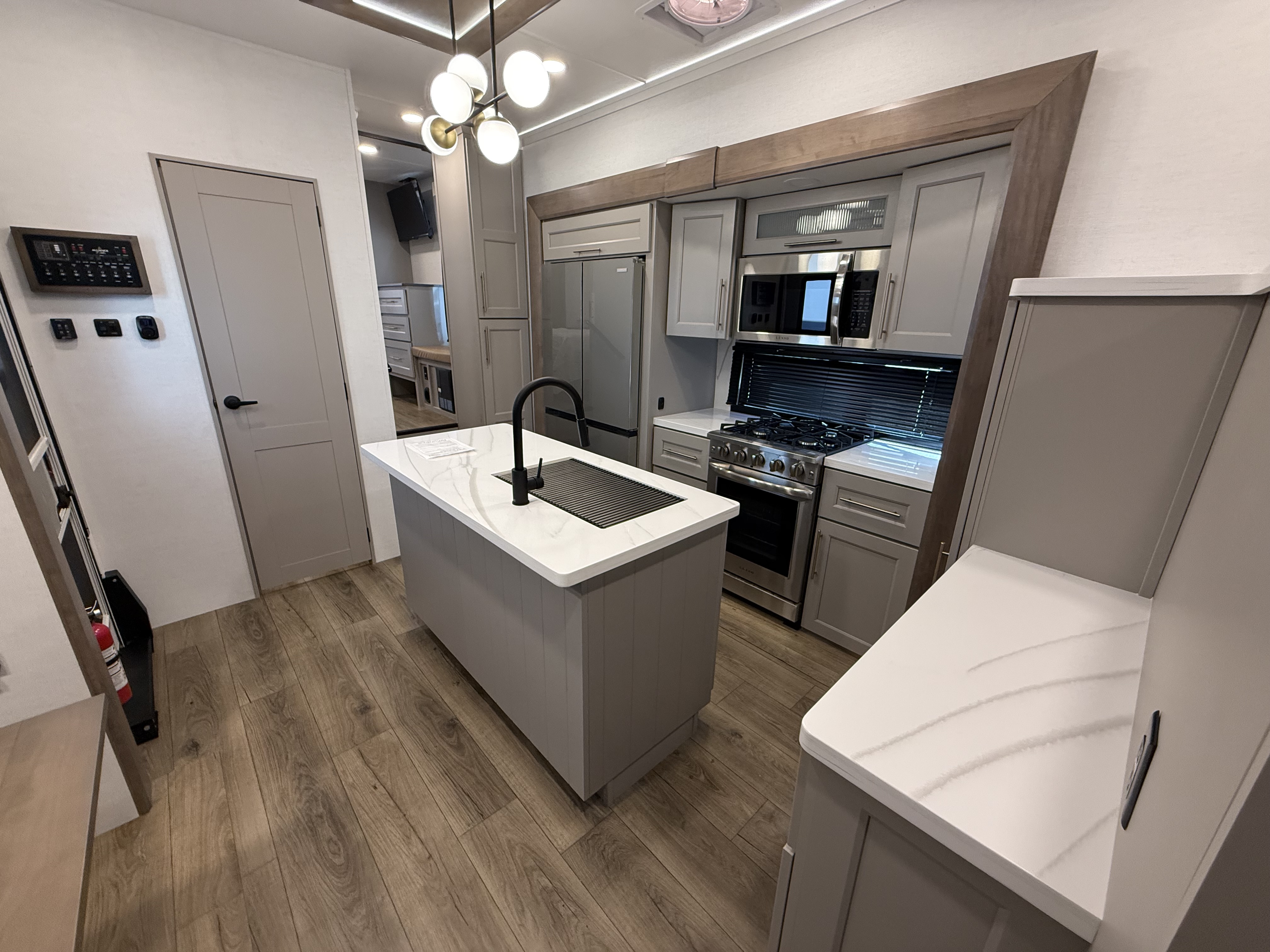 The half bath near the main entry adds convenience, and the separate kitchen offers a functional, well-equipped cooking space. The chef will love the residential microwave, range, and 19 cu. ft. 12V residential refrigerator, as well as the kitchen island with a large sink and extra counter space for meal prep. There’s also a pantry for additional storage.