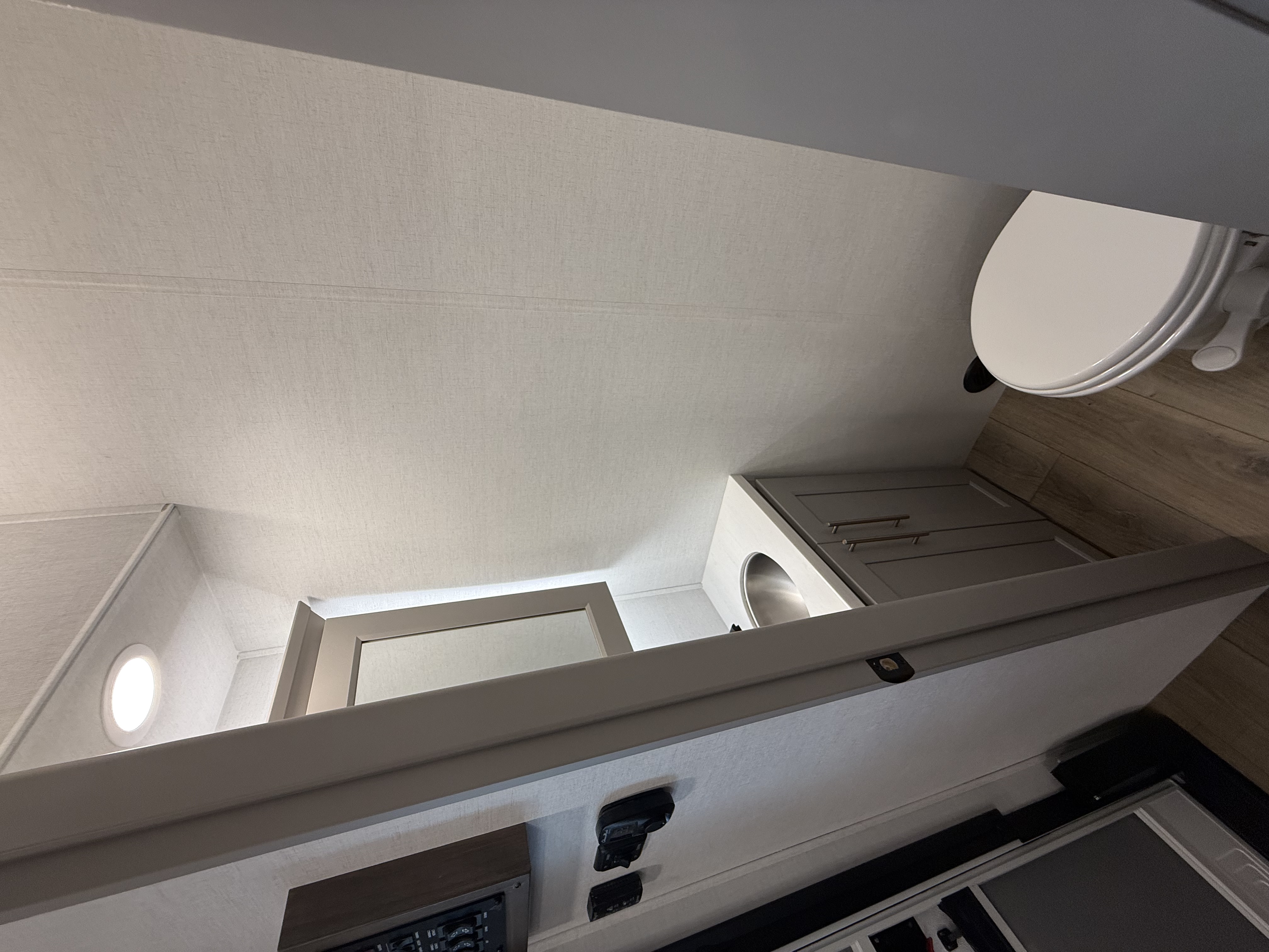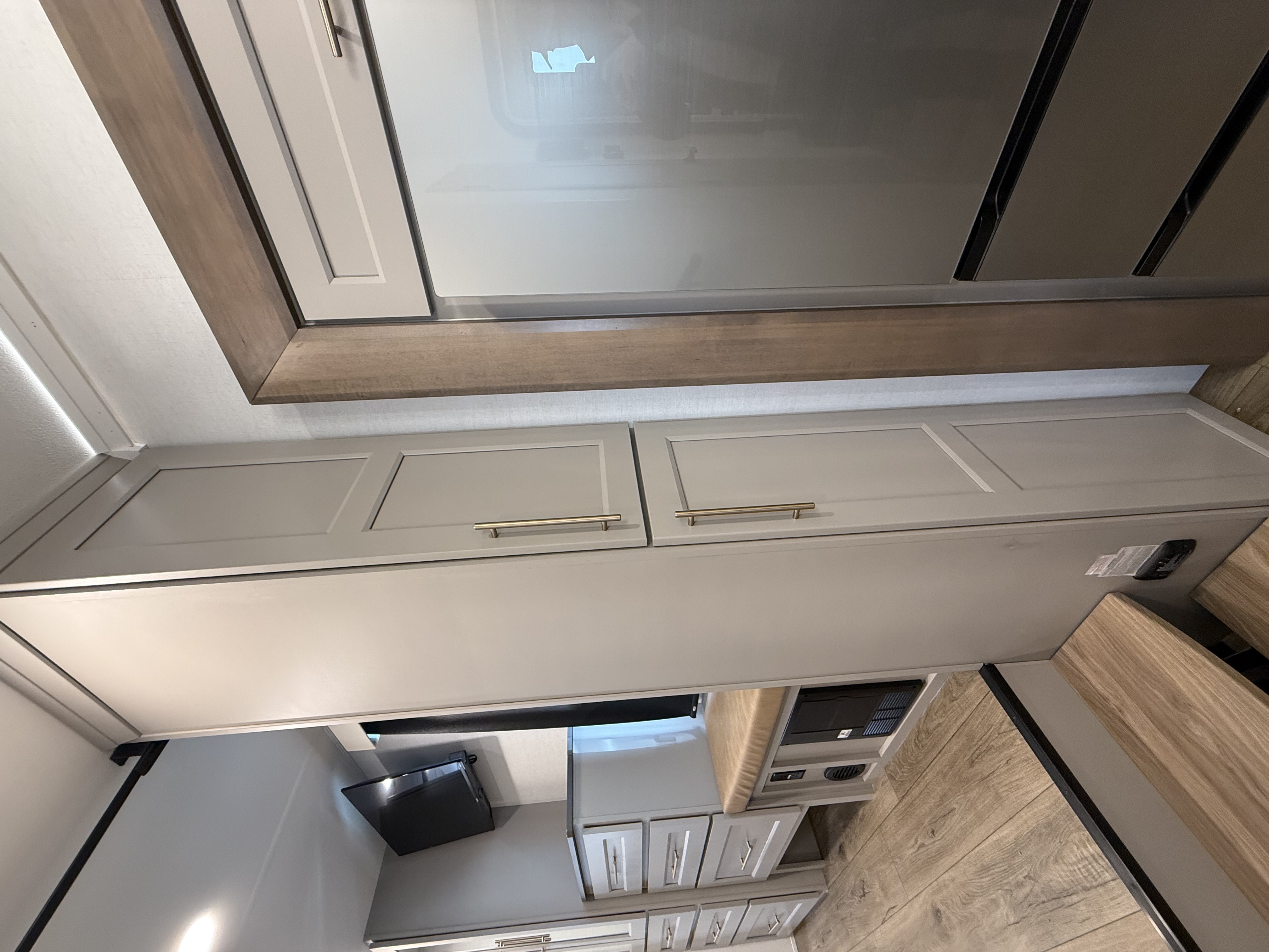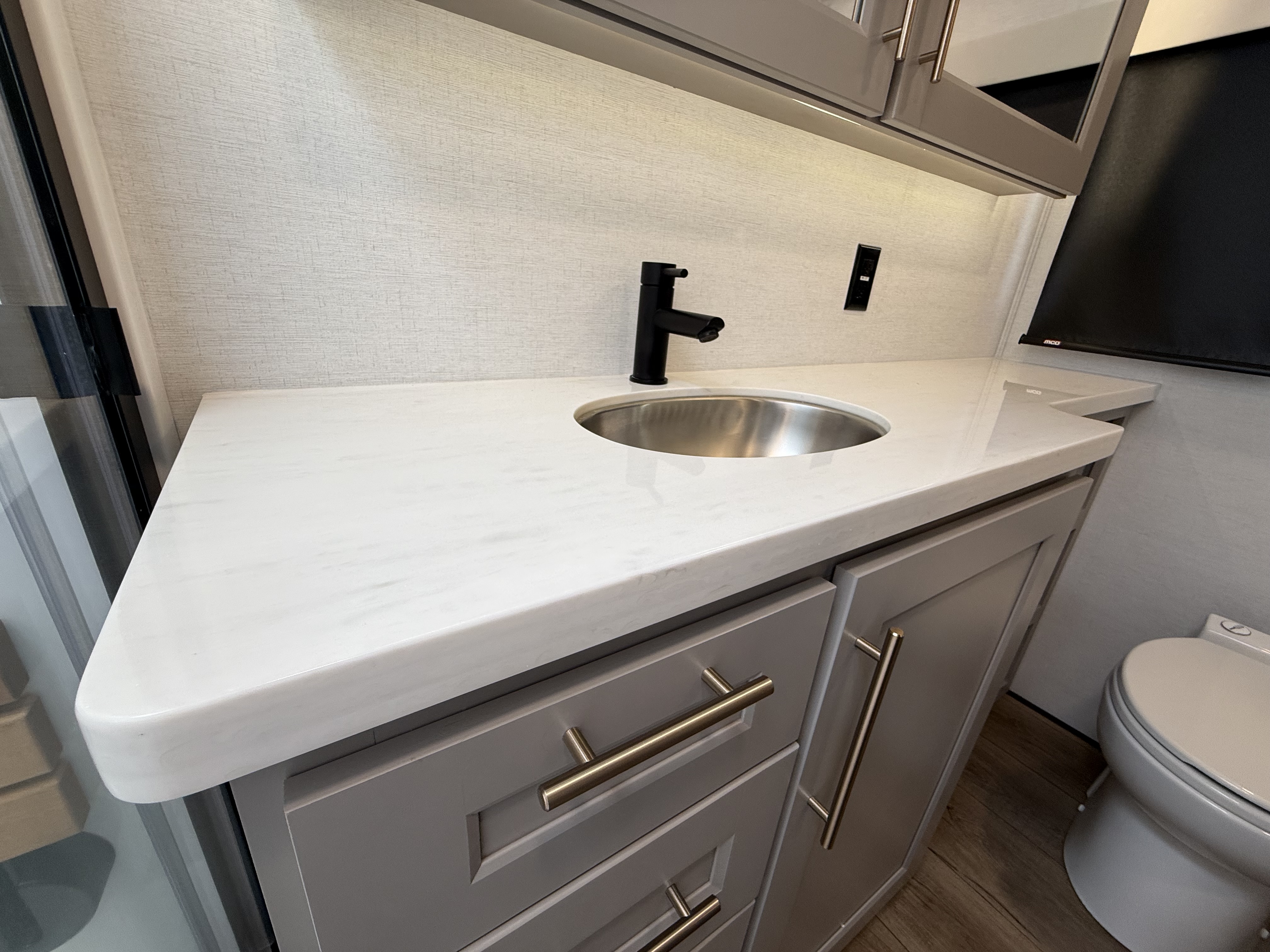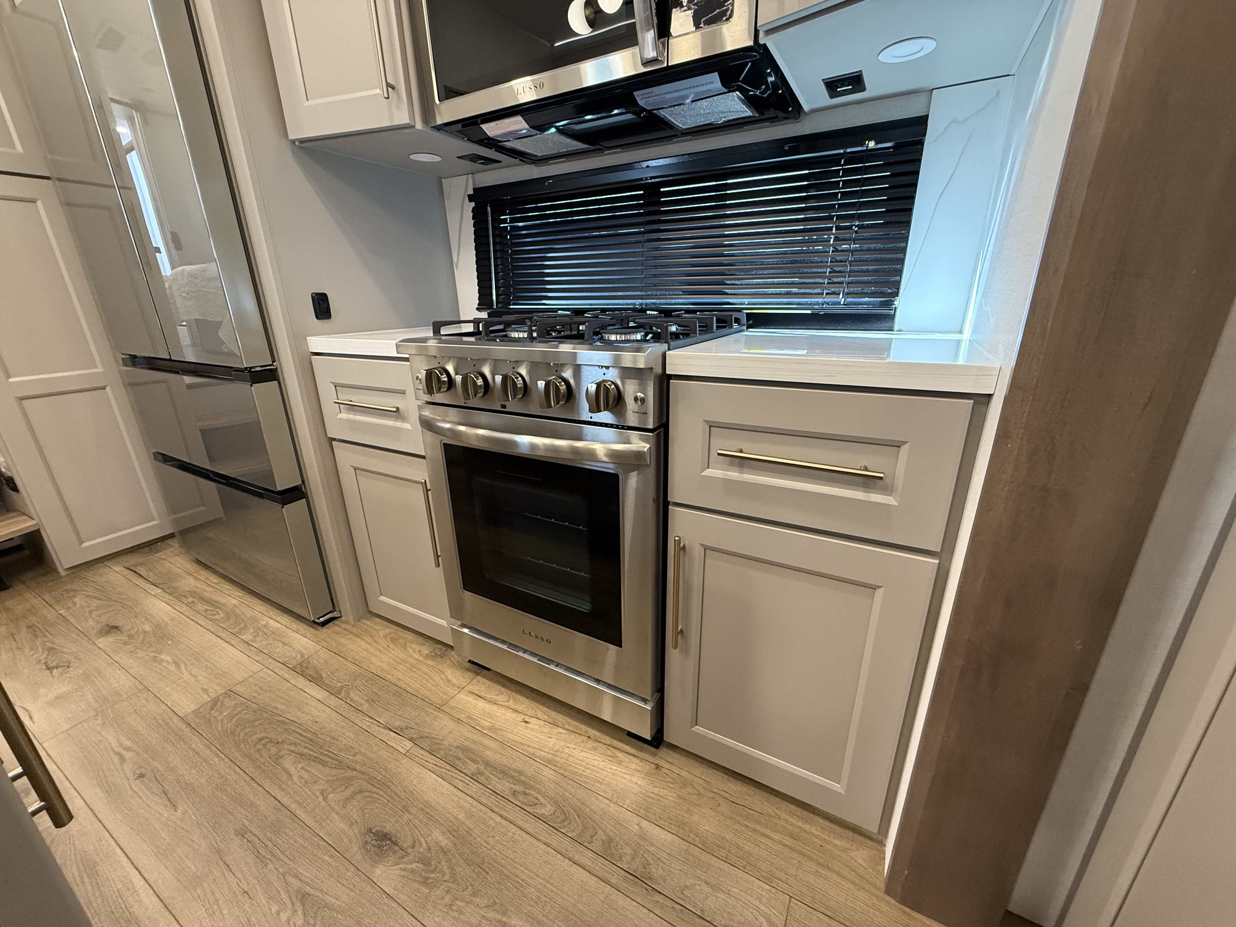 The half bath near the main entry adds convenience, and the separate kitchen offers a functional, well-equipped cooking space. The chef will love the residential microwave, range, and 19 cu. ft. 12V residential refrigerator, as well as the kitchen island with a large sink and extra counter space for meal prep. There’s also a pantry for additional storage.