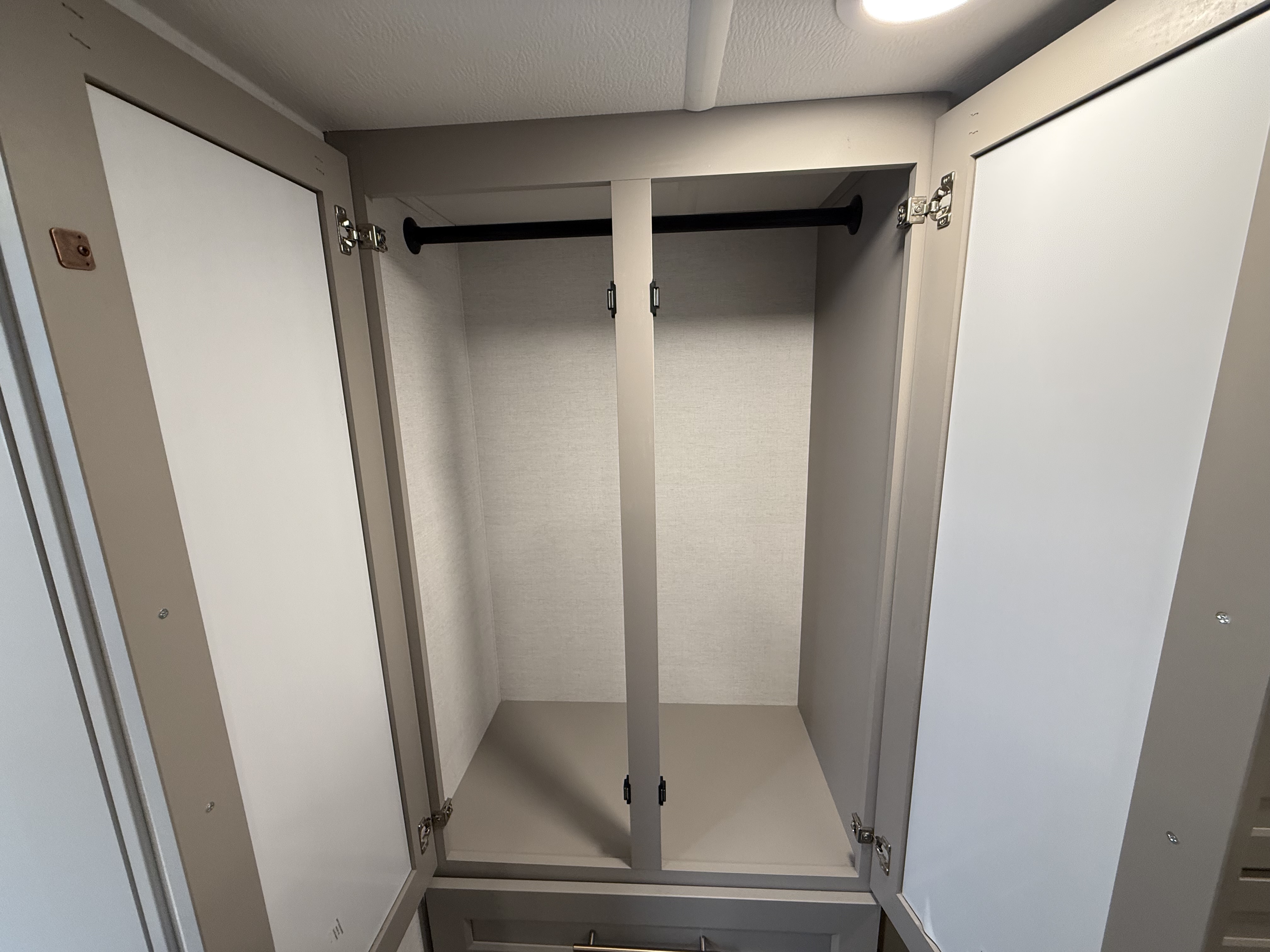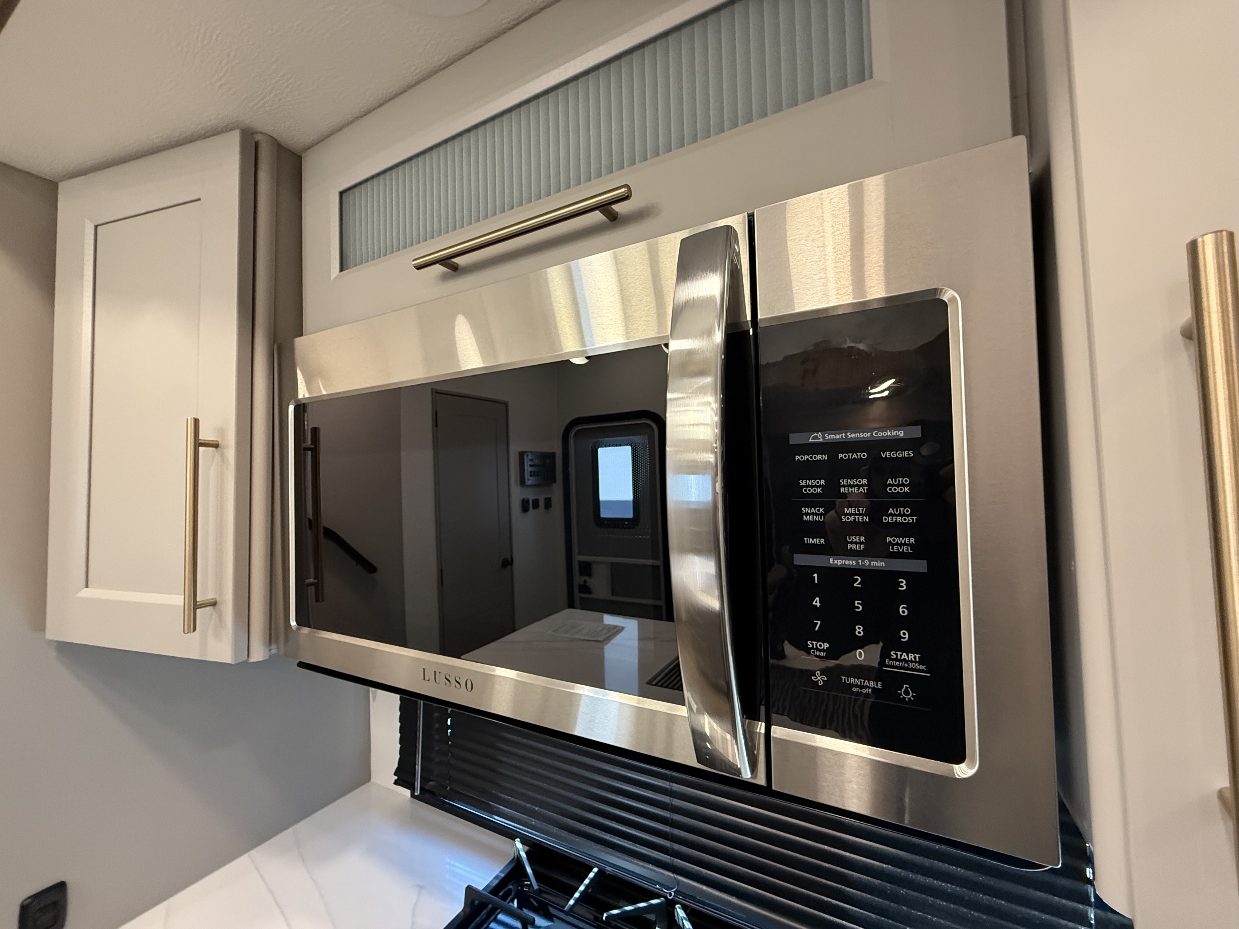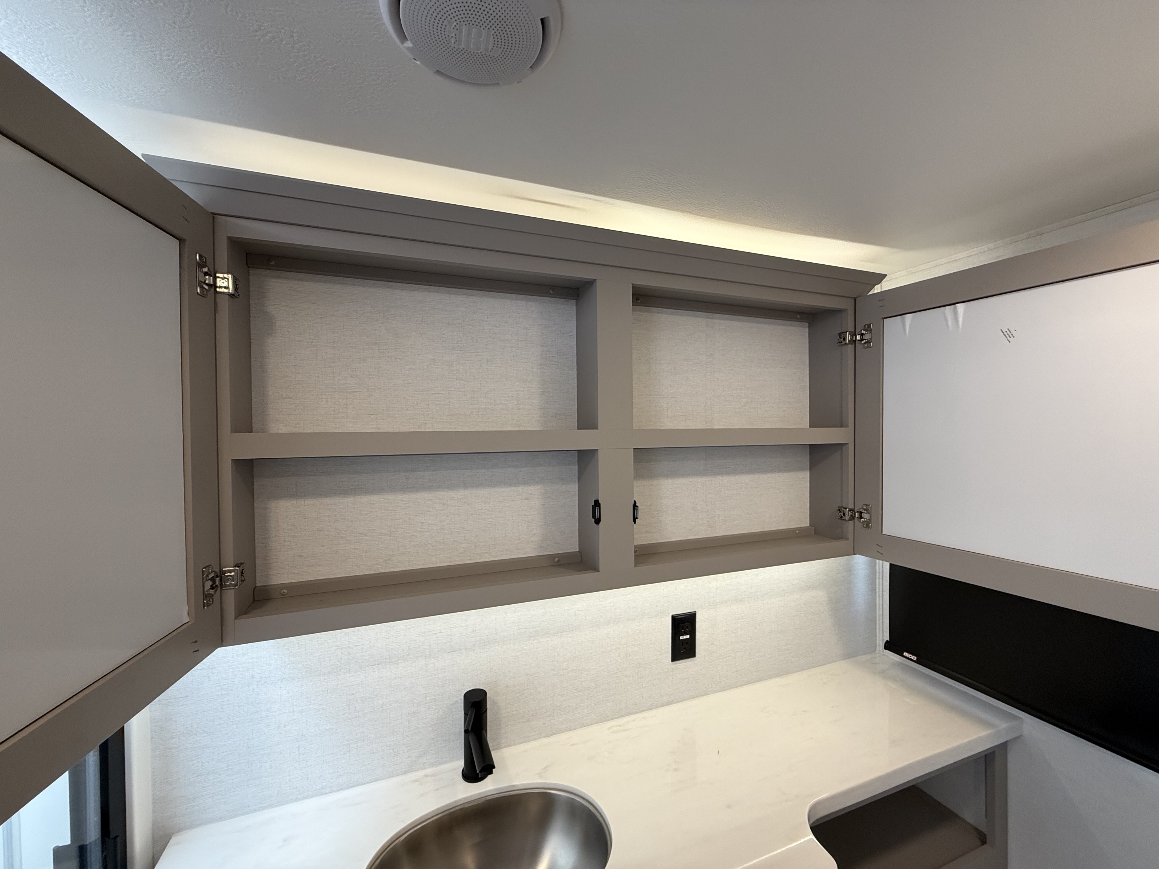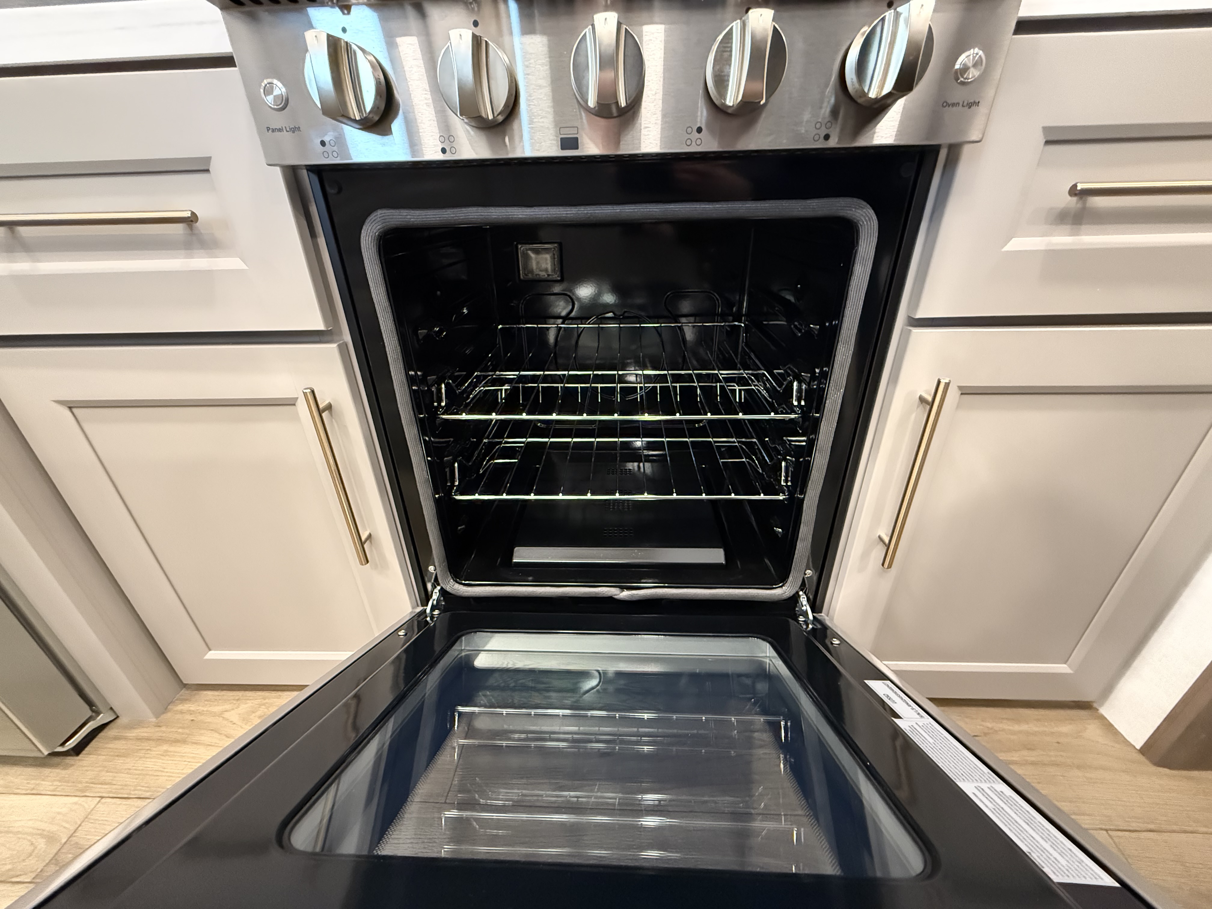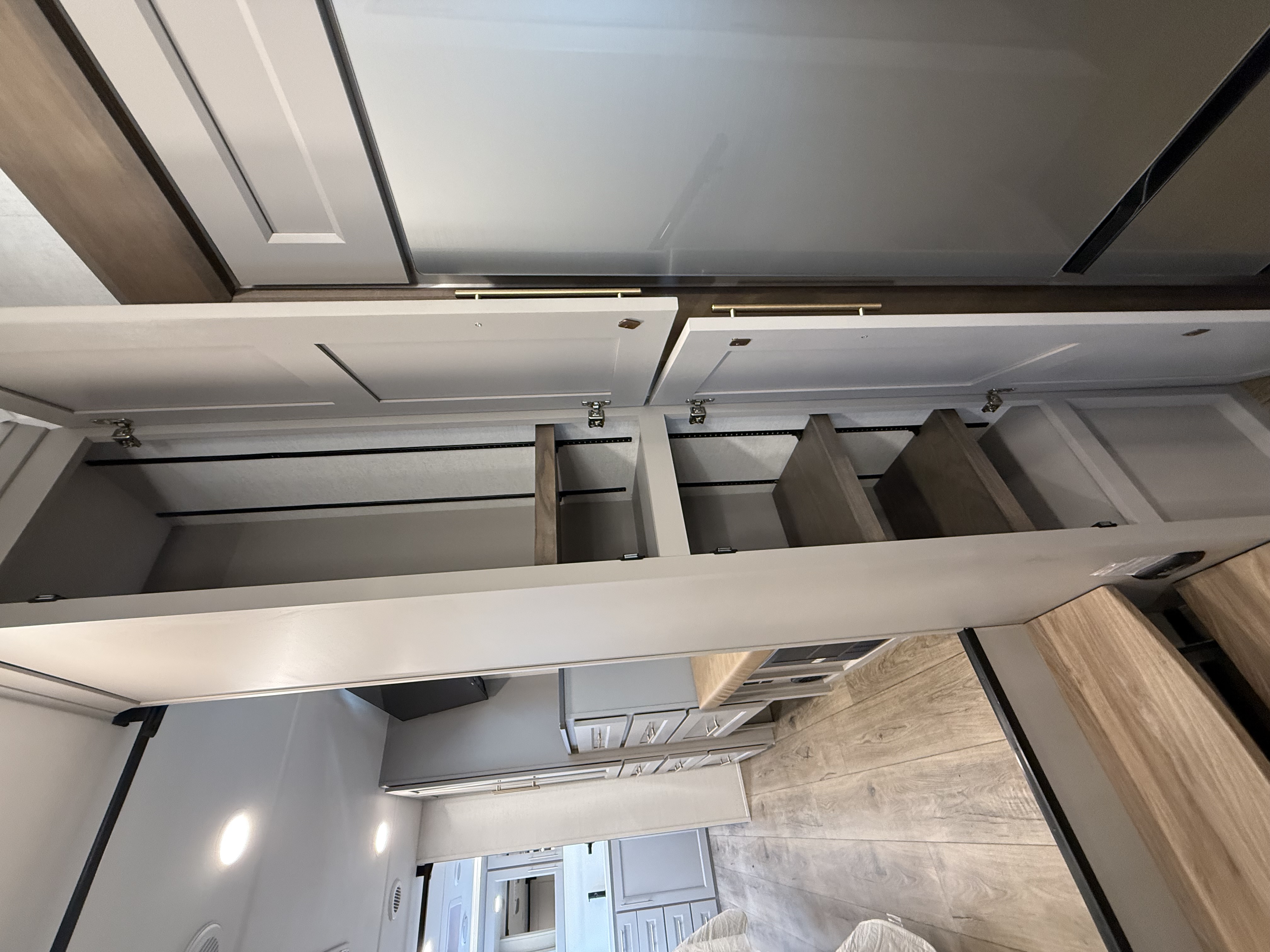 The half bath near the main entry adds convenience, and the separate kitchen offers a functional, well-equipped cooking space. The chef will love the residential microwave, range, and 19 cu. ft. 12V residential refrigerator, as well as the kitchen island with a large sink and extra counter space for meal prep. There’s also a pantry for additional storage.
