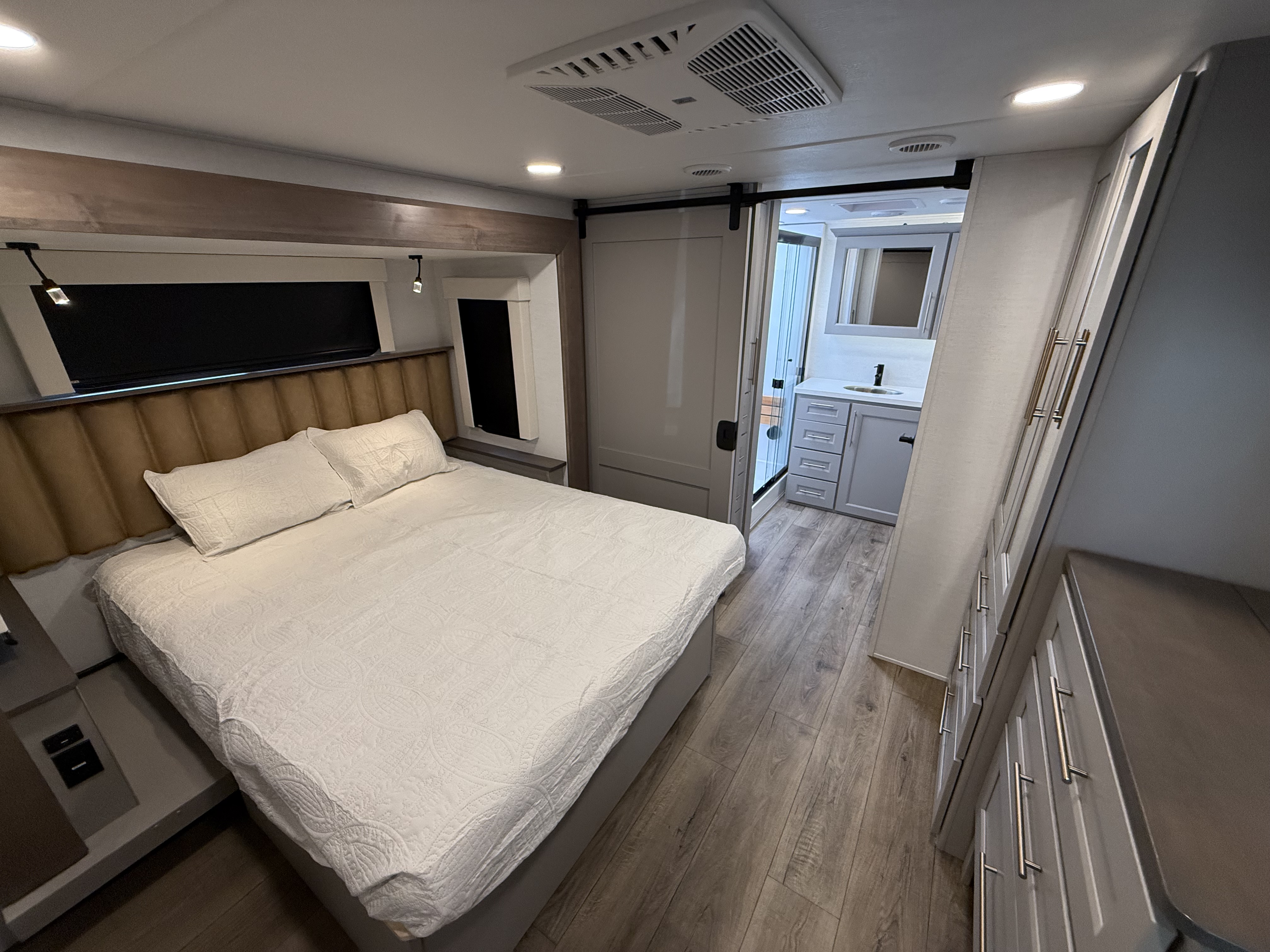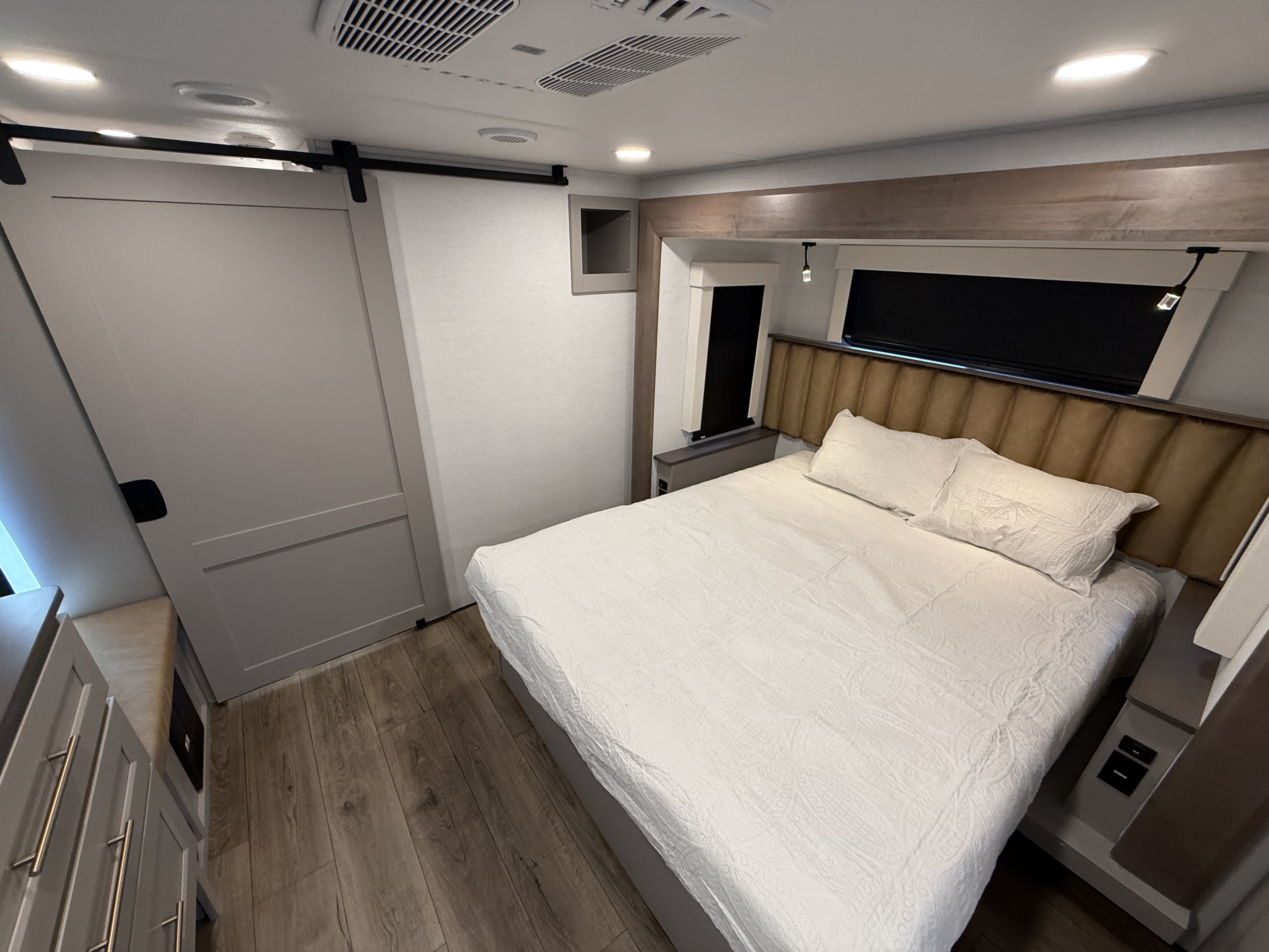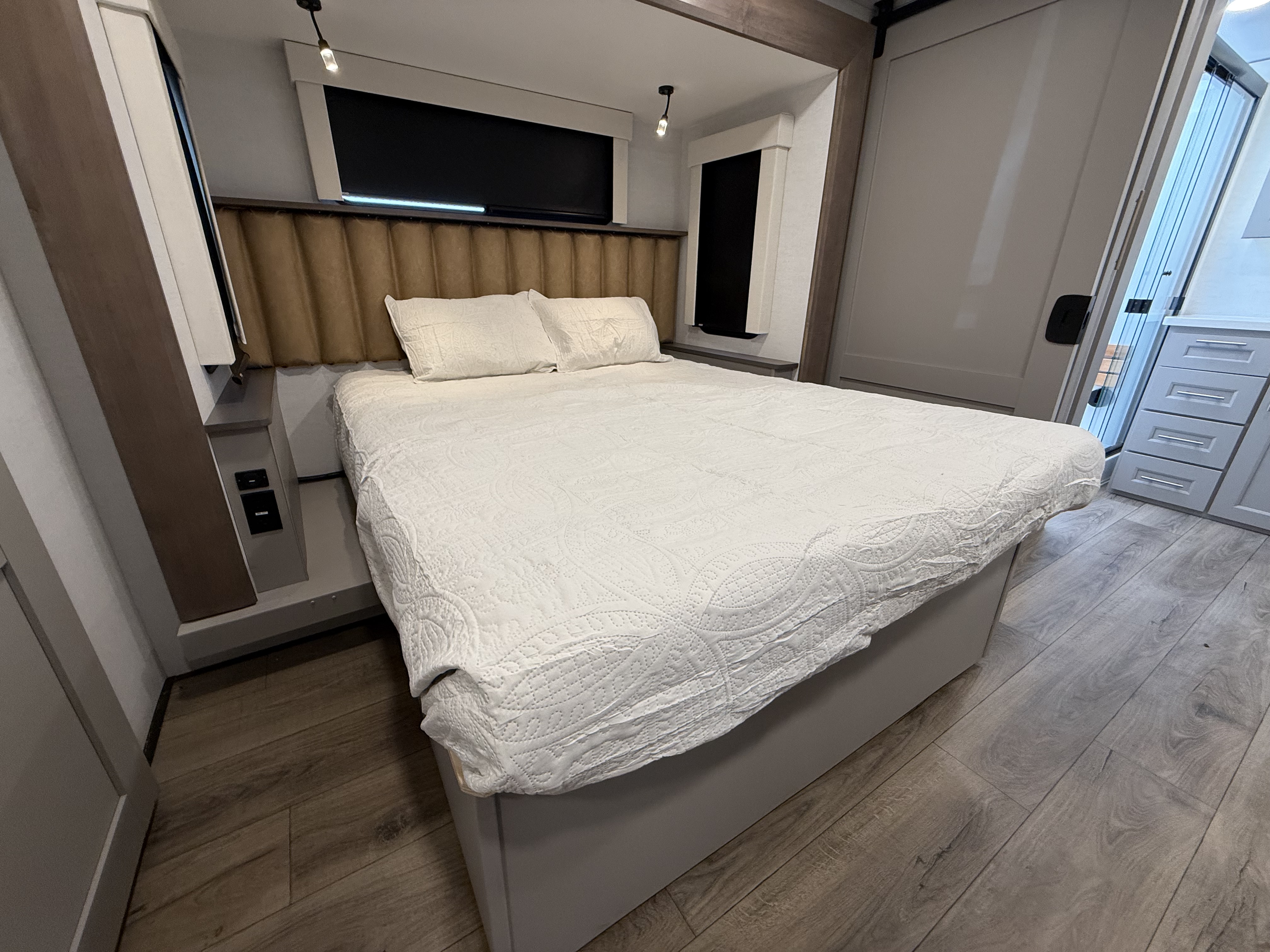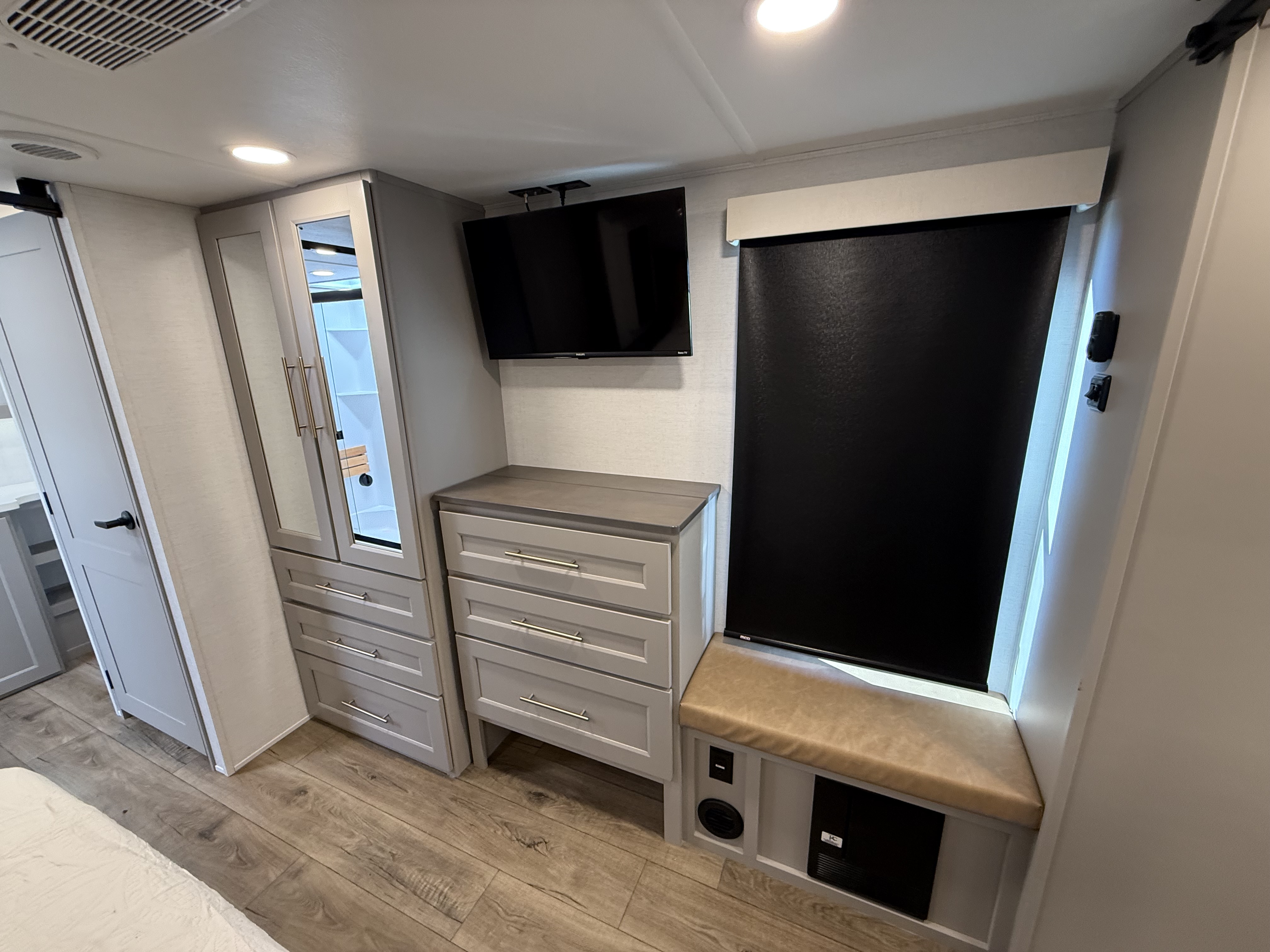 Inside, the master suite is a true retreat, featuring a king bed slide-out that maximizes space, along with a flip-top dresser, a Smart TV, and plenty of wardrobe and shelf storage. The rear bathroom includes a residential-style shower, a porcelain toilet with a soft-close seat, and more storage for your linens and essentials.