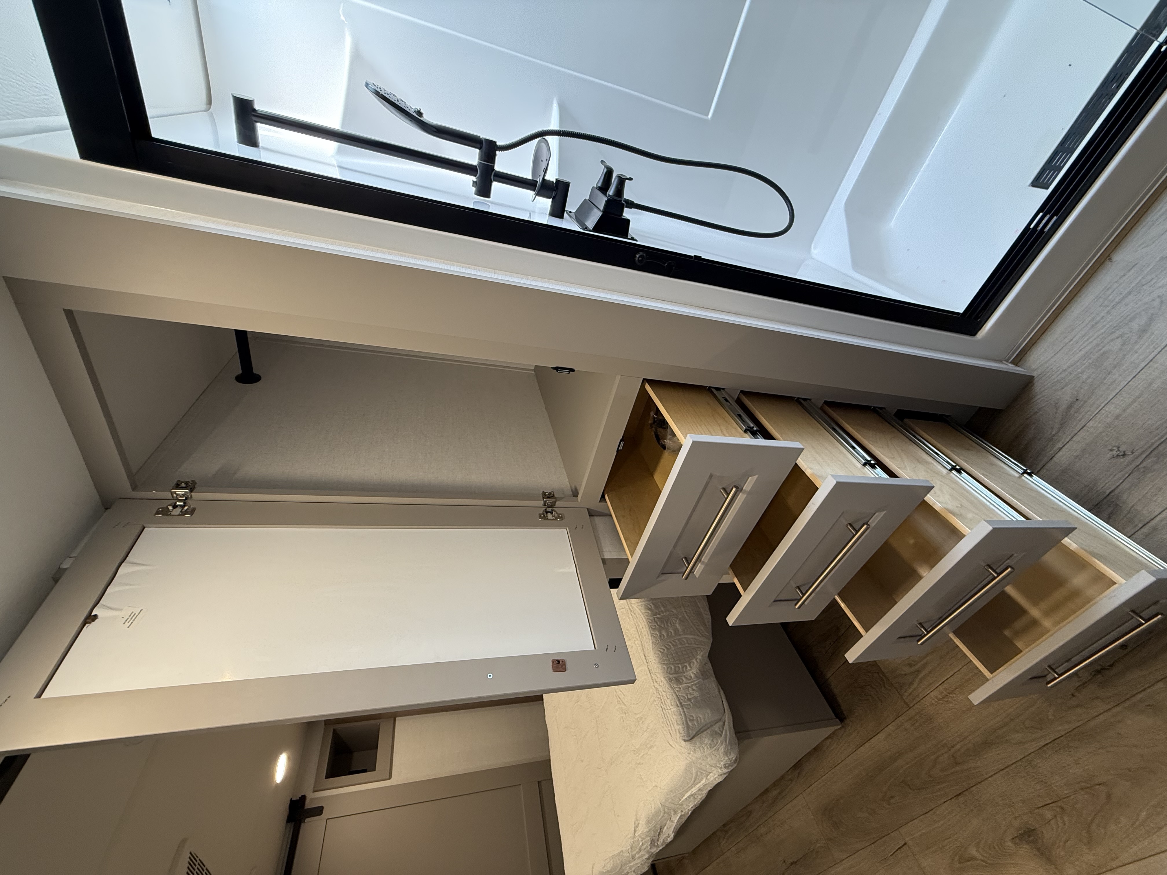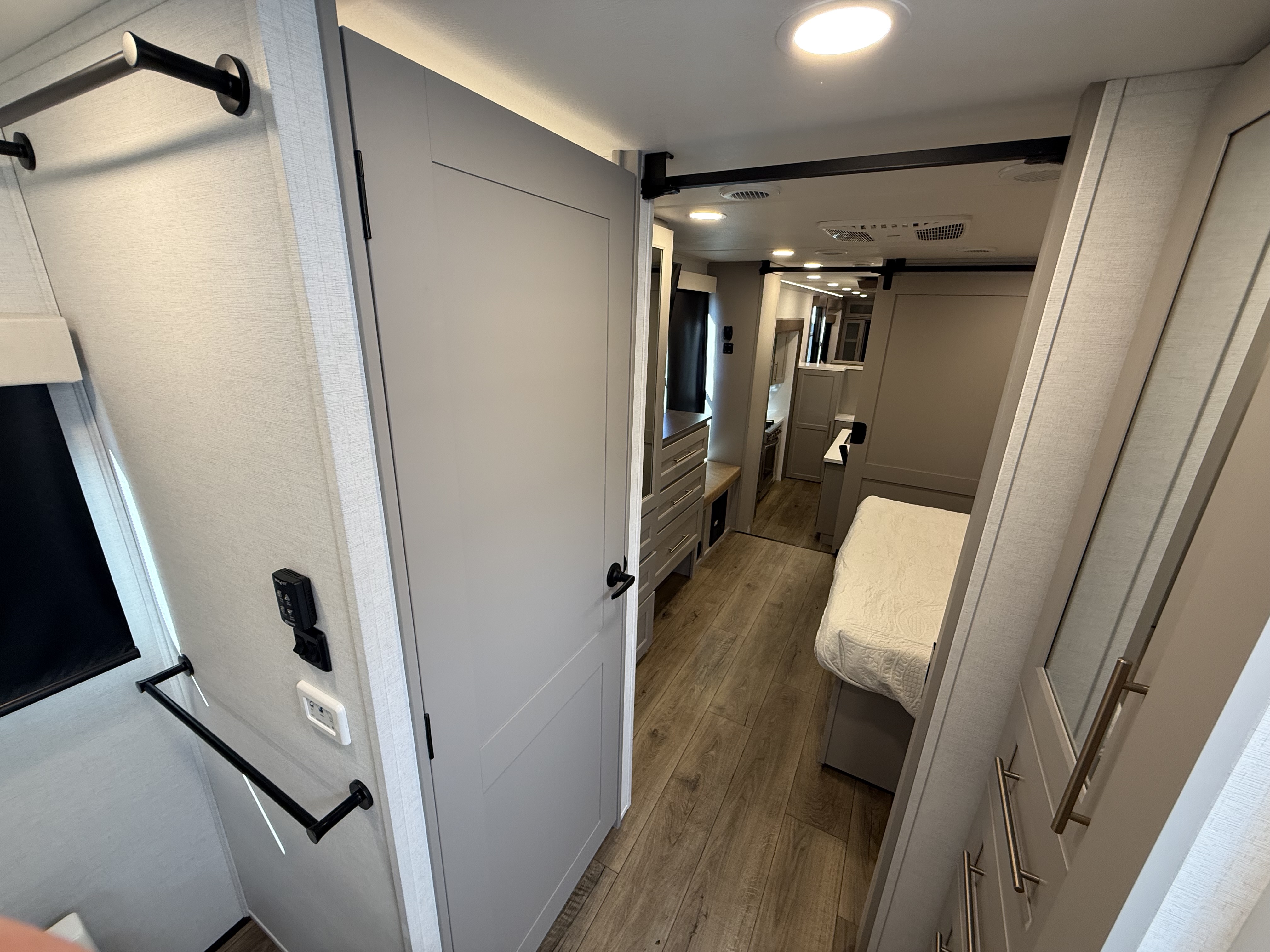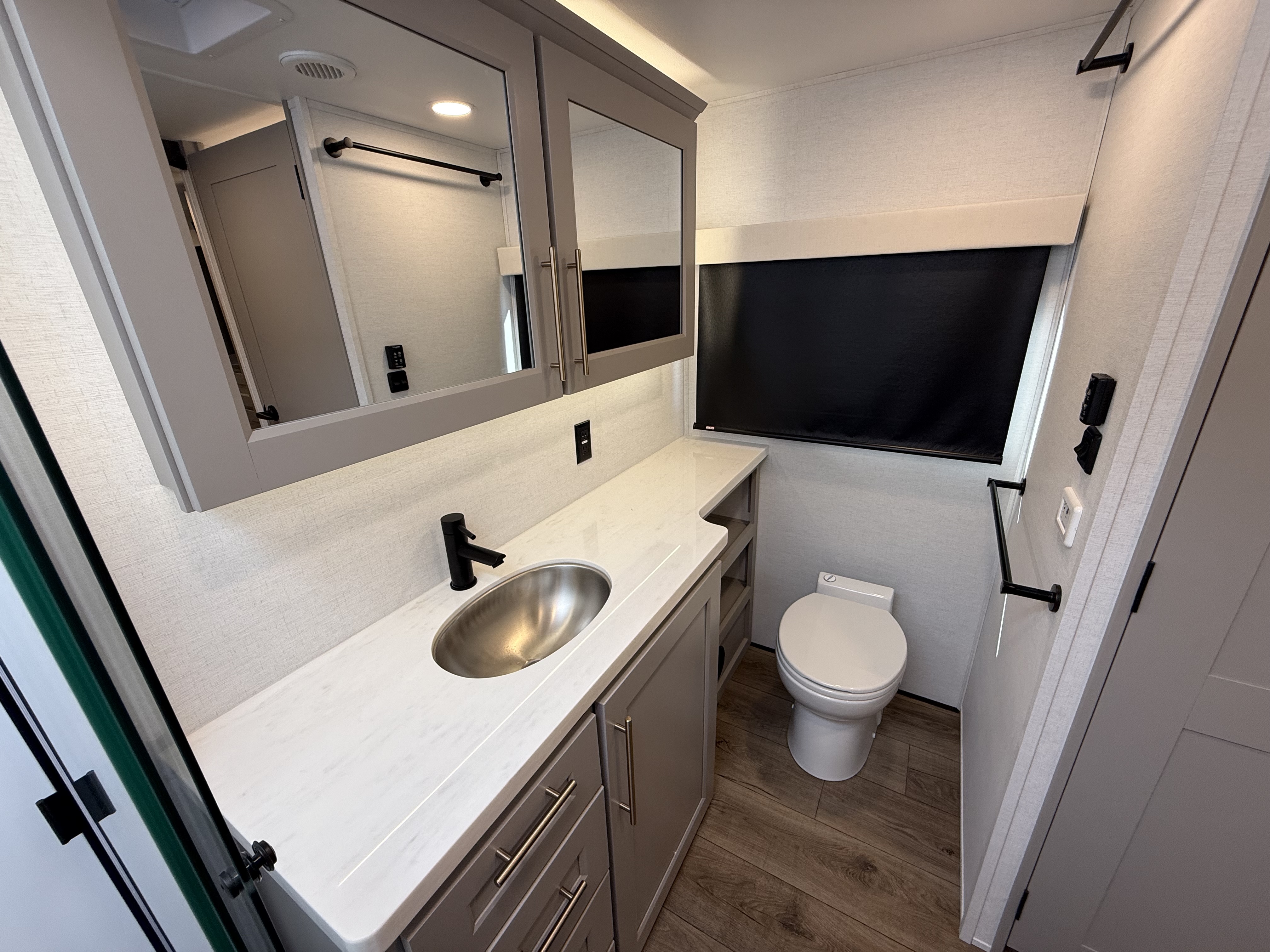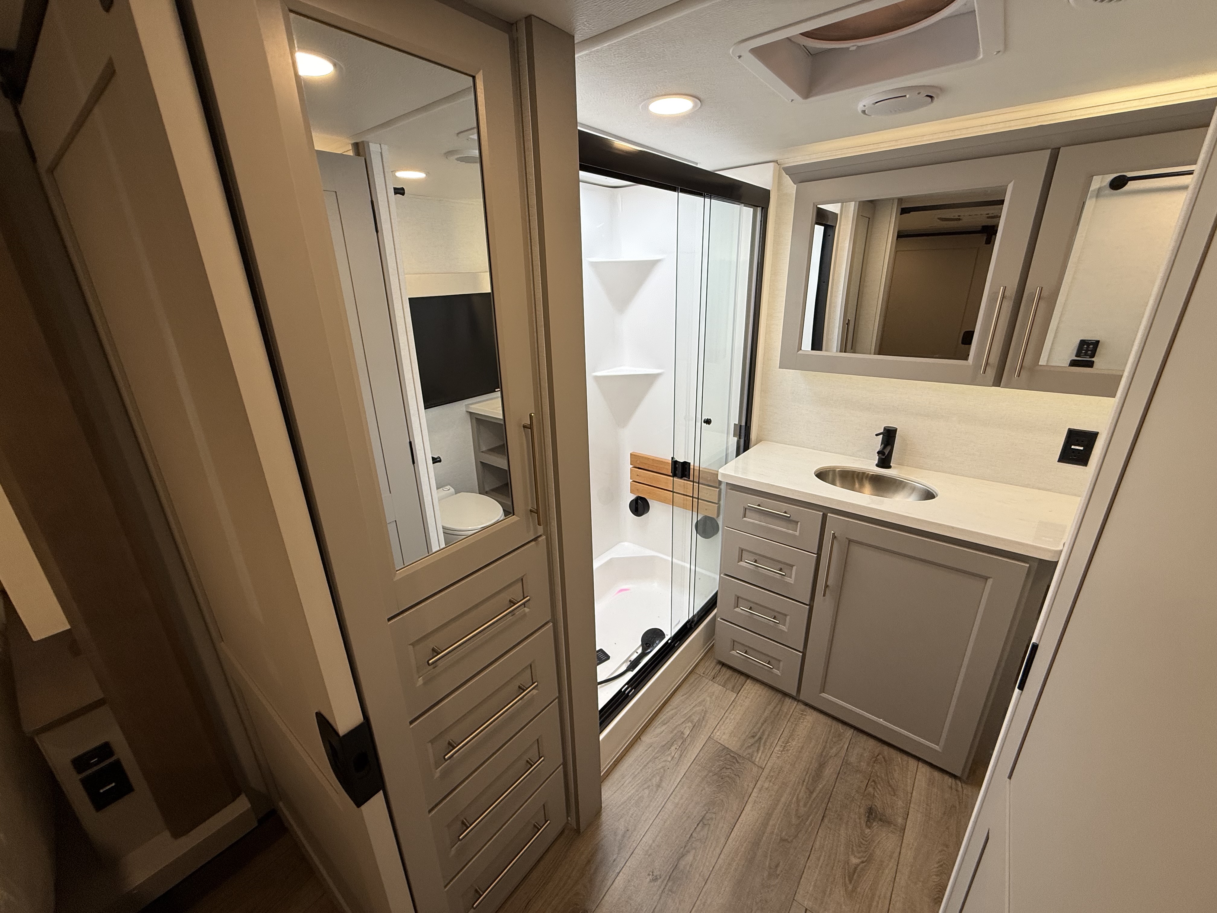 Inside, the master suite is a true retreat, featuring a king bed slide-out that maximizes space, along with a flip-top dresser, a Smart TV, and plenty of wardrobe and shelf storage. The rear bathroom includes a residential-style shower, a porcelain toilet with a soft-close seat, and more storage for your linens and essentials.