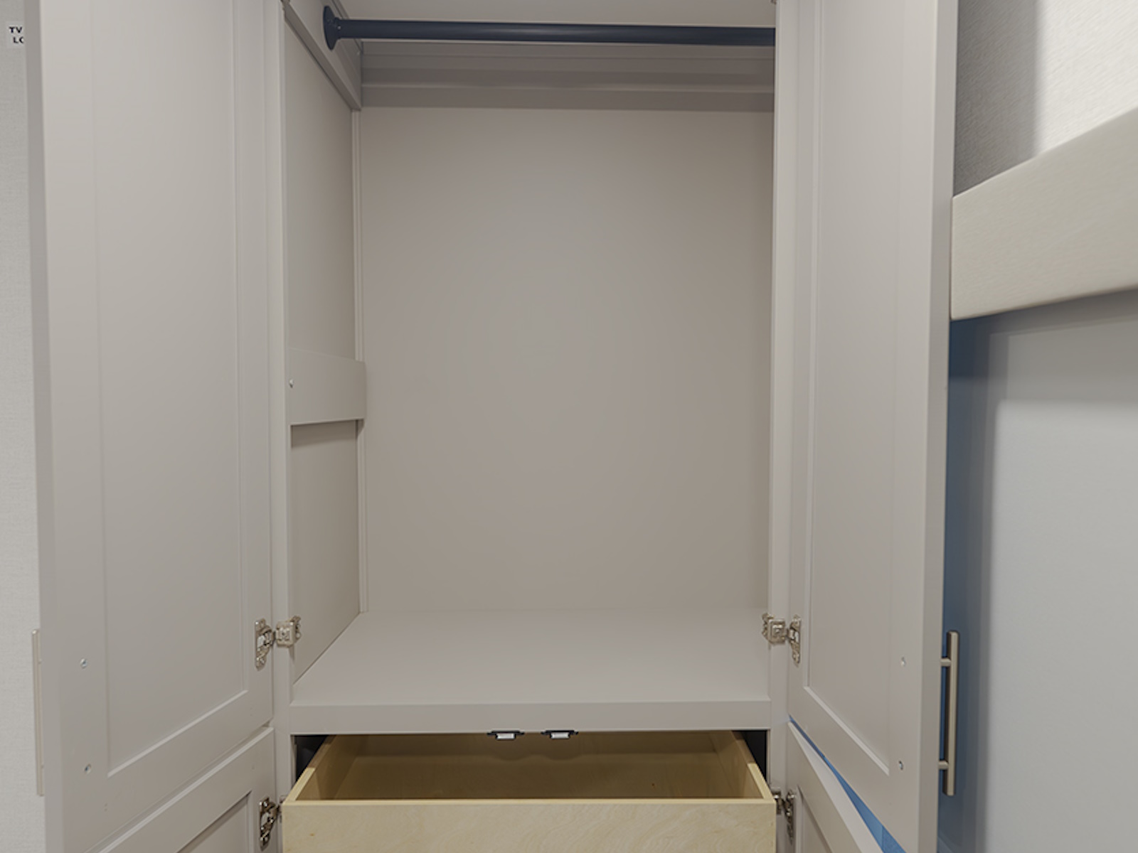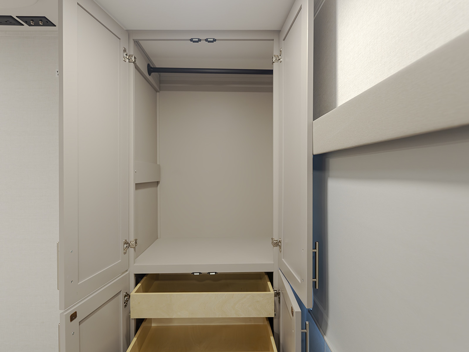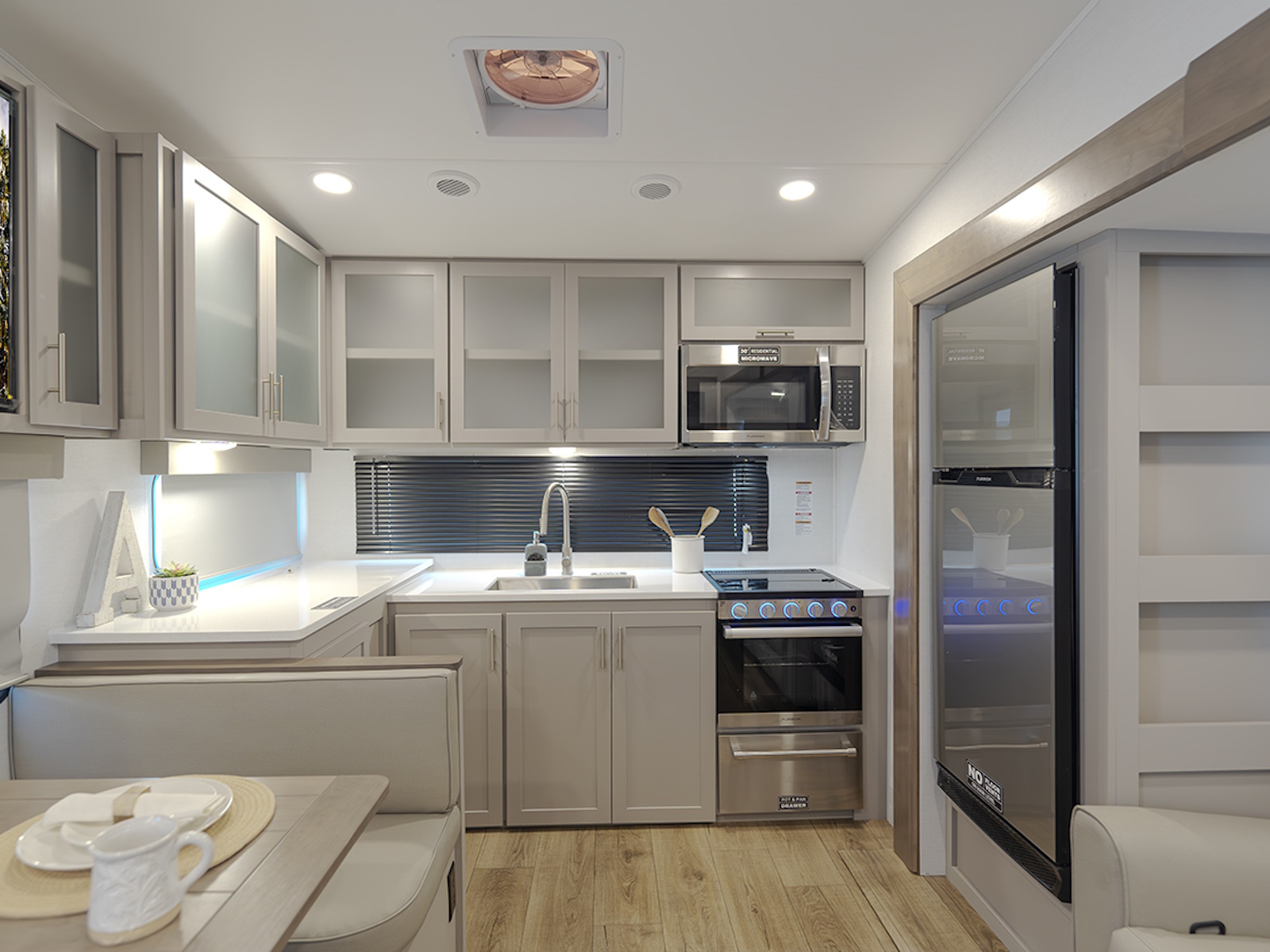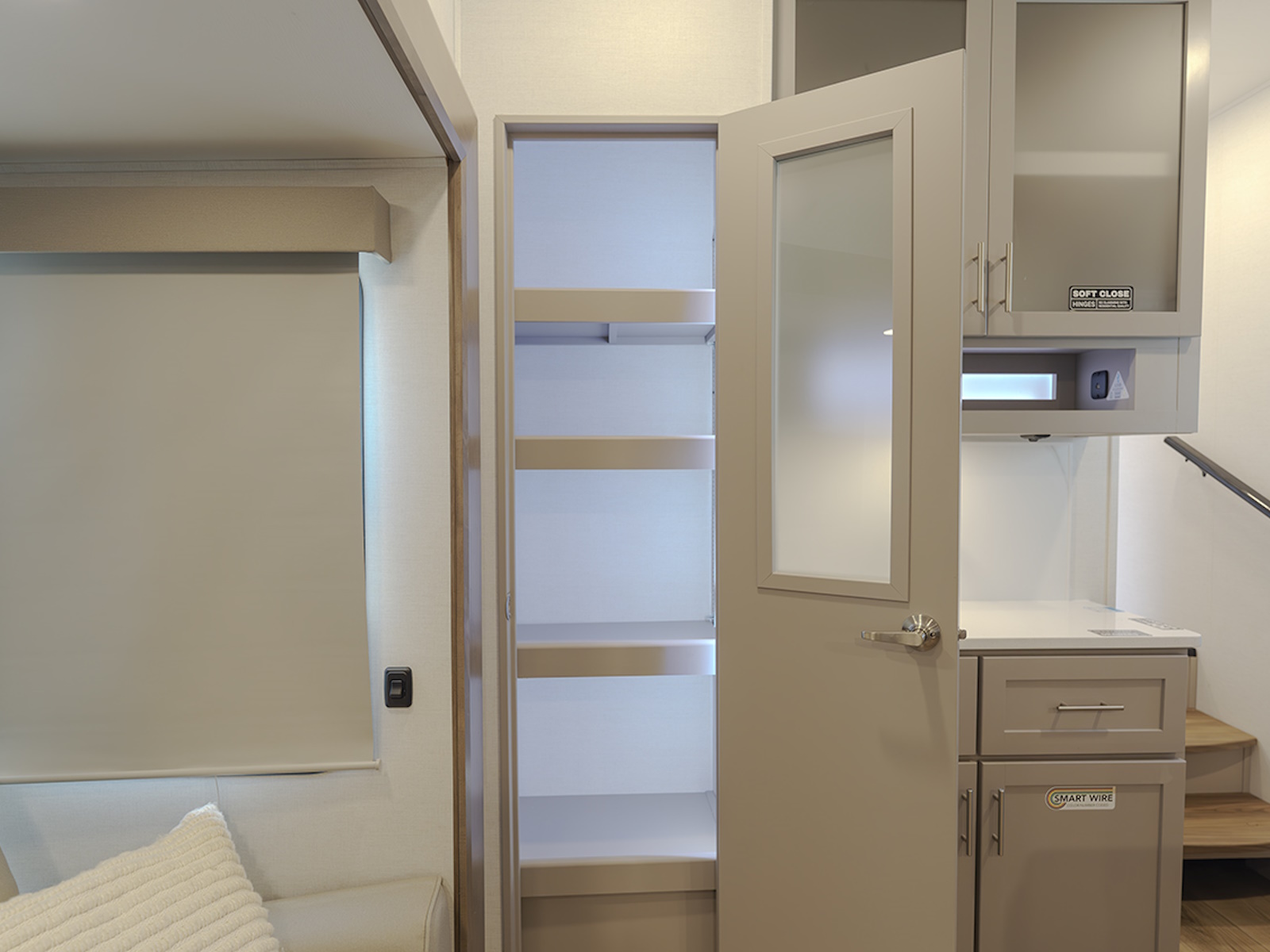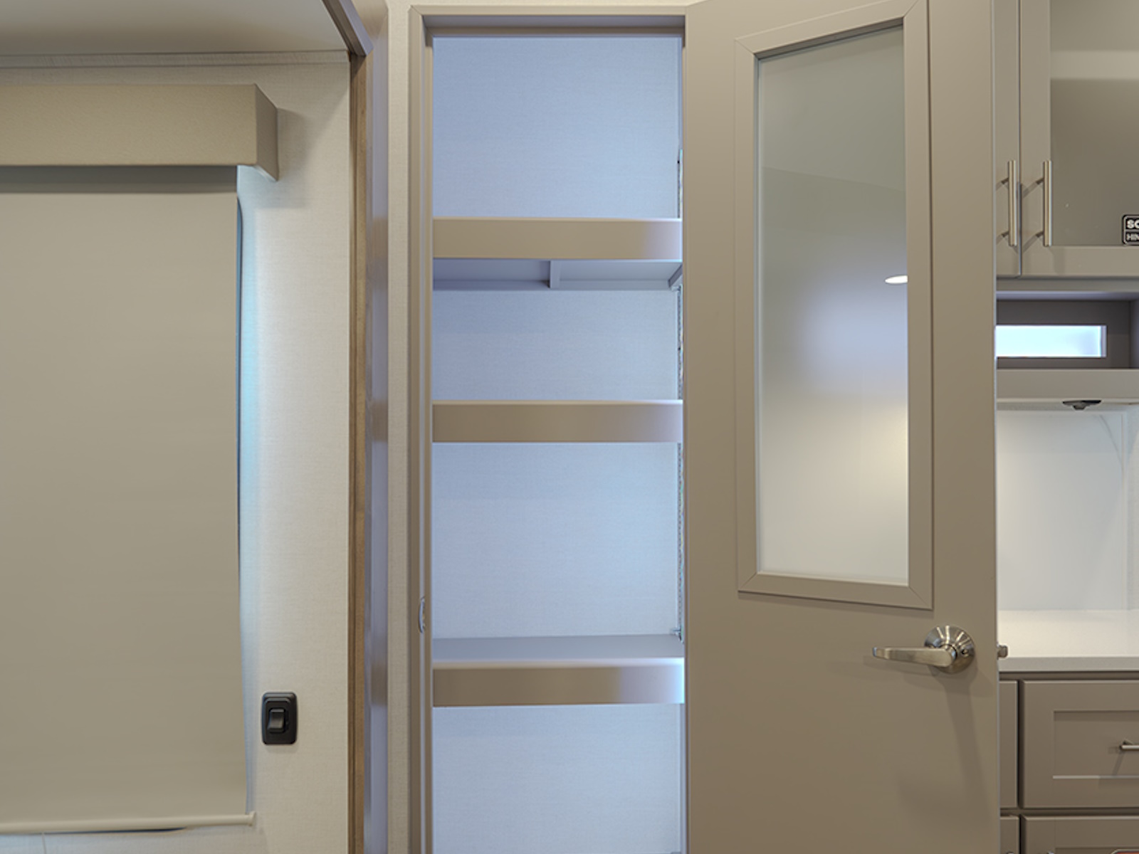 - Well-appointed rear kitchen with a large pantry and a 10 cu. ft. 12V refrigerator