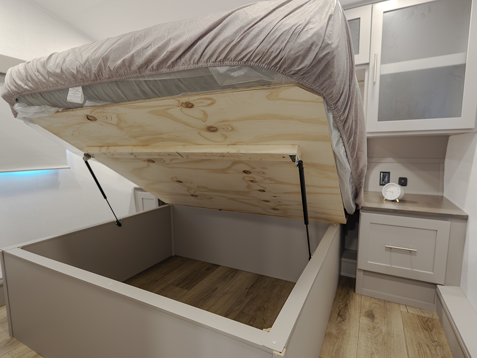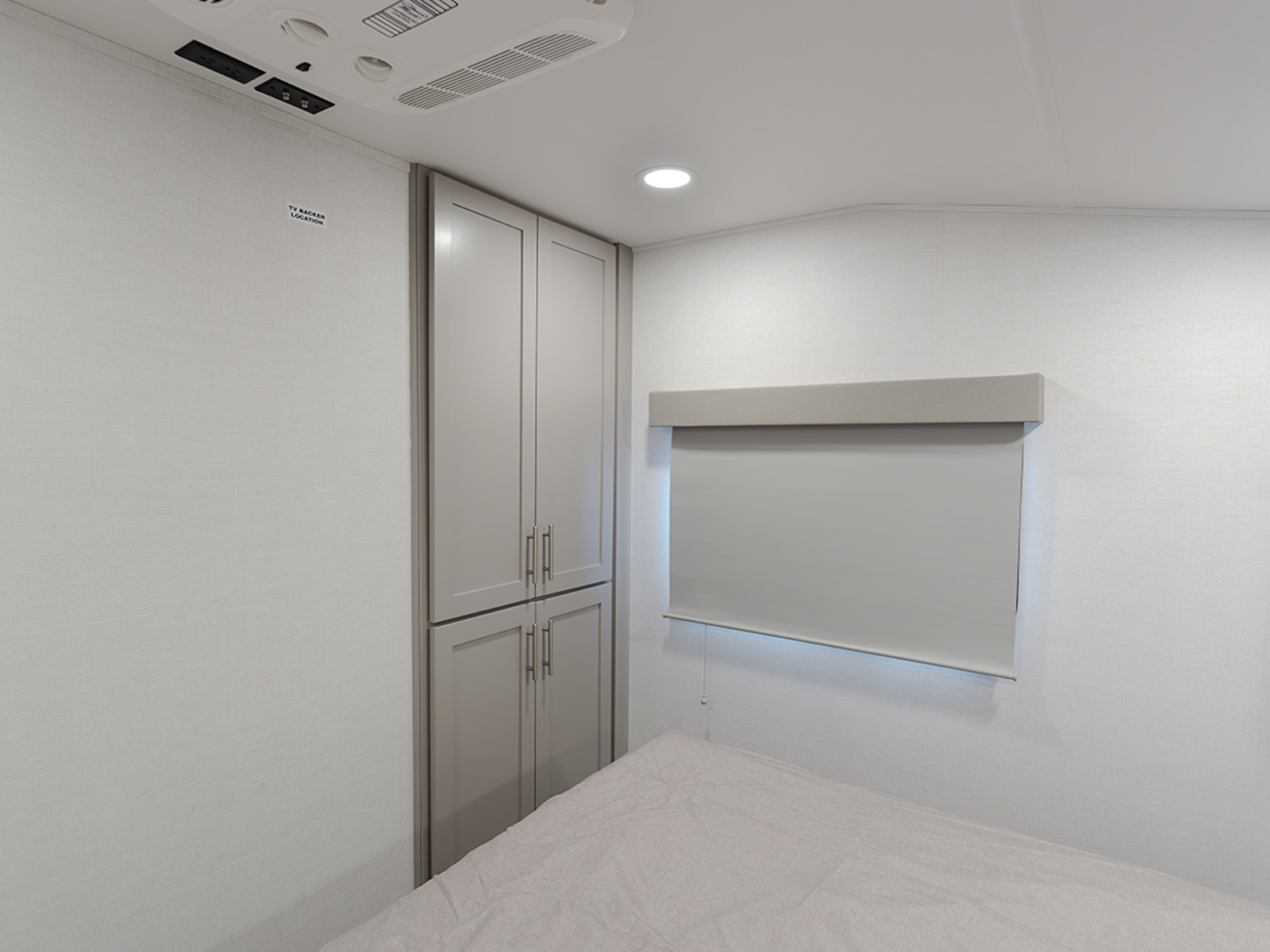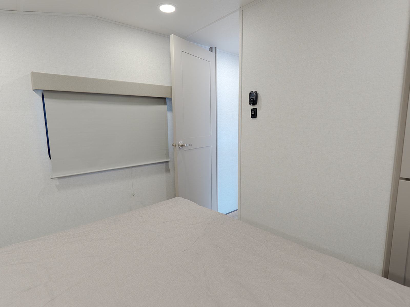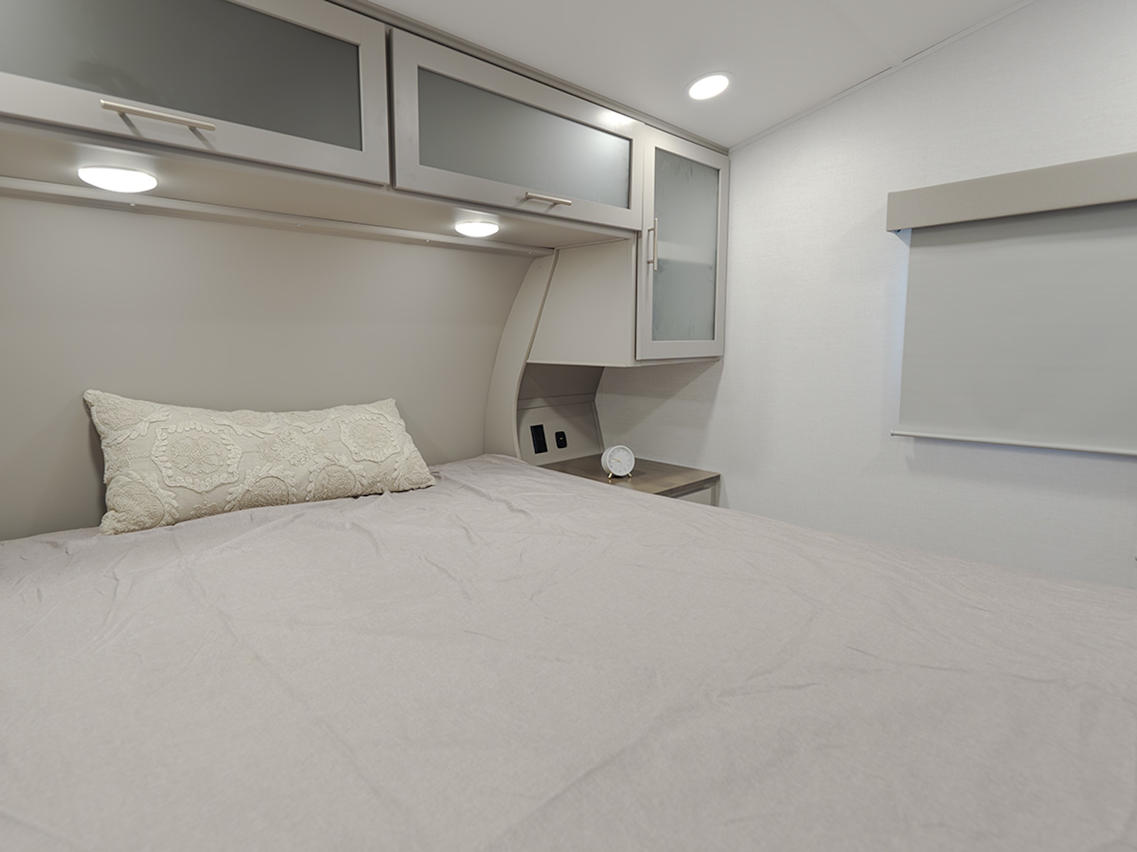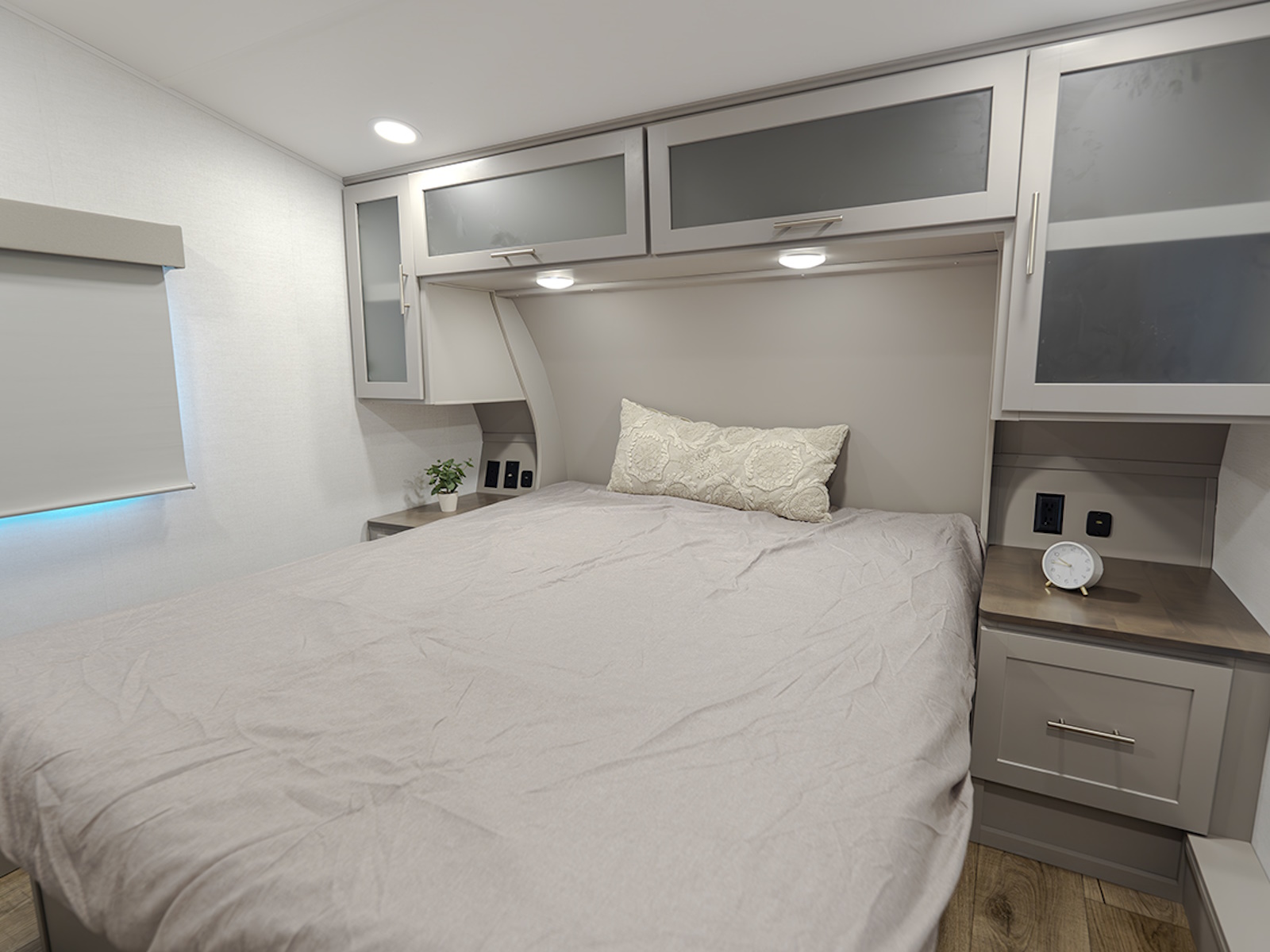 - Queen bed in a private front bedroom with dual nightstands and overhead storage