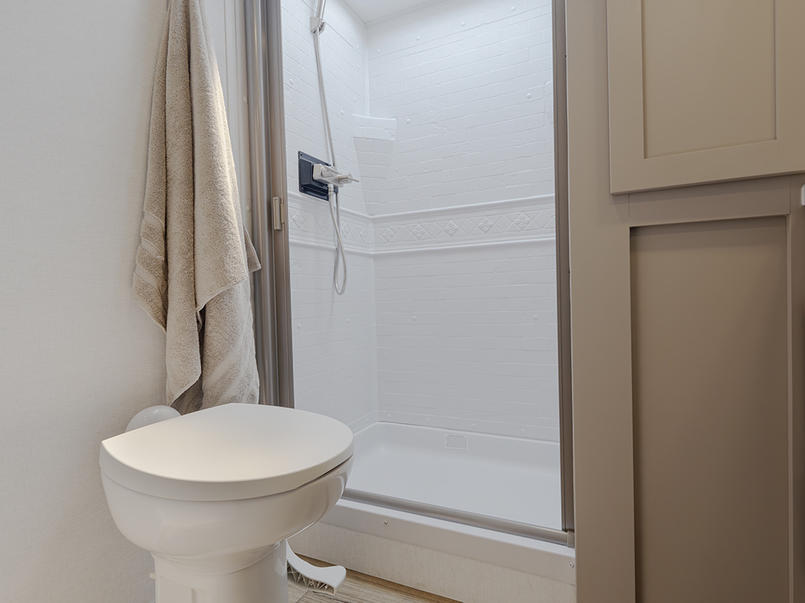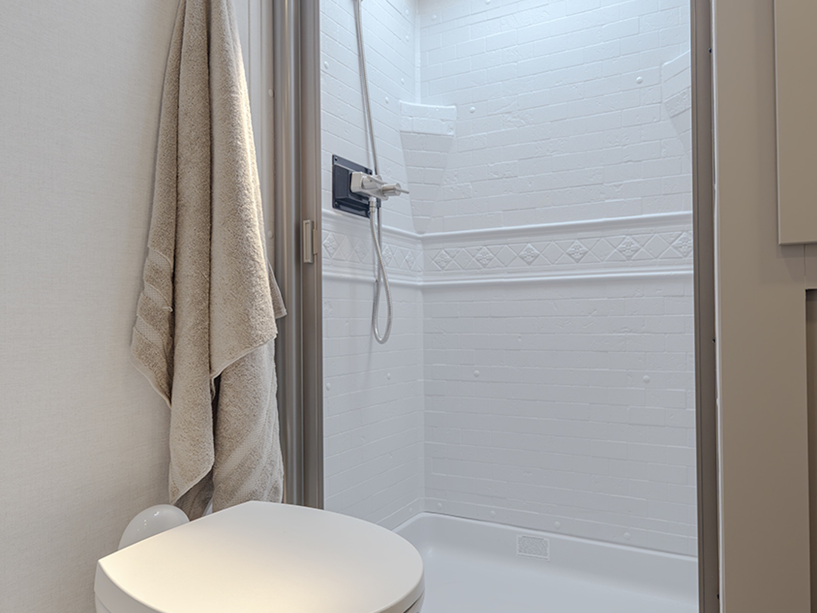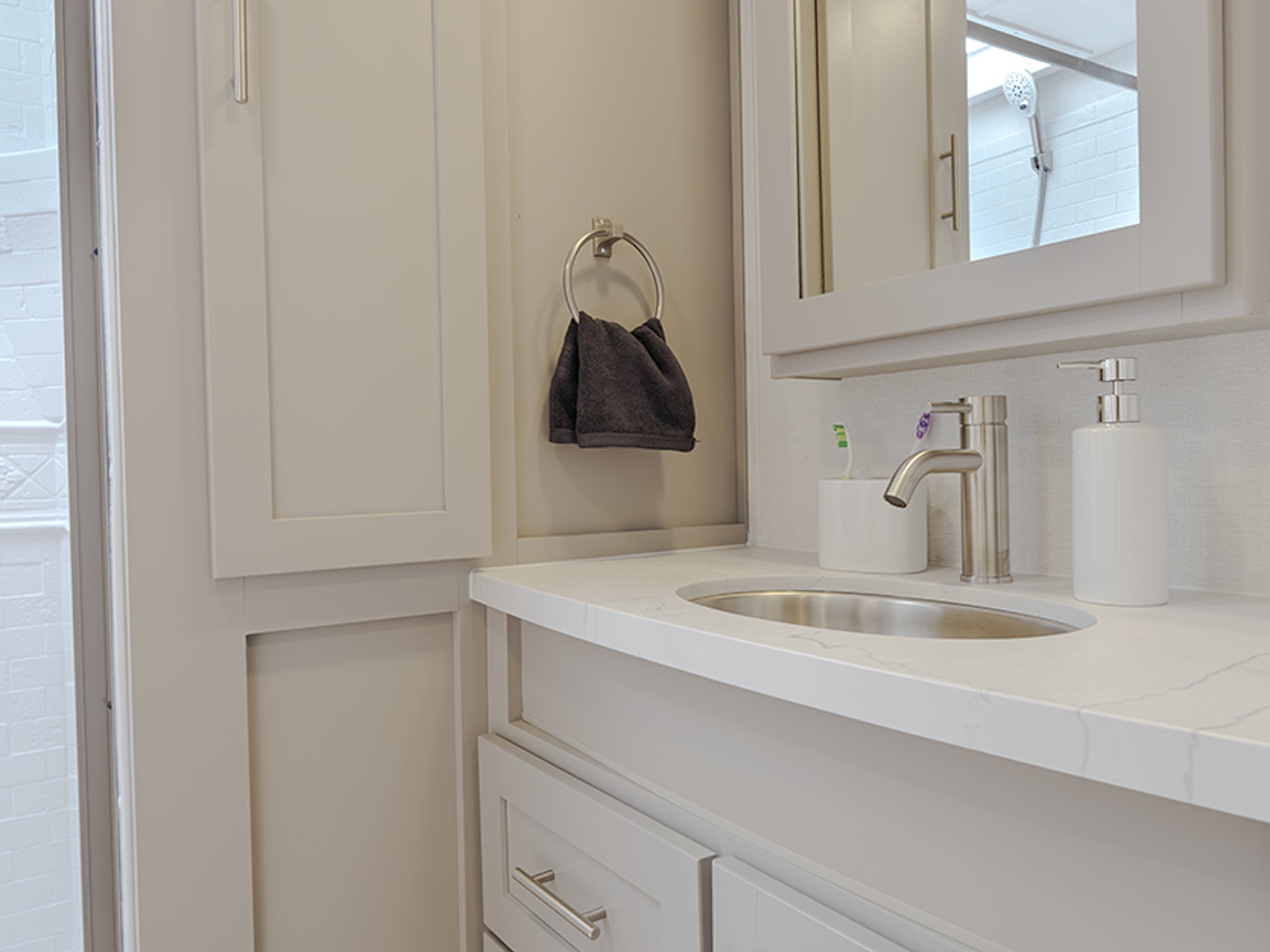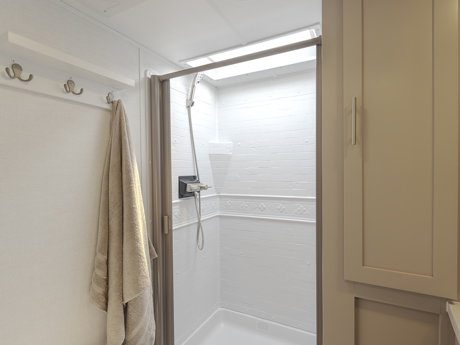 - Side-aisle bathroom featuring a 30" x 36" shower, vanity, and linen storage