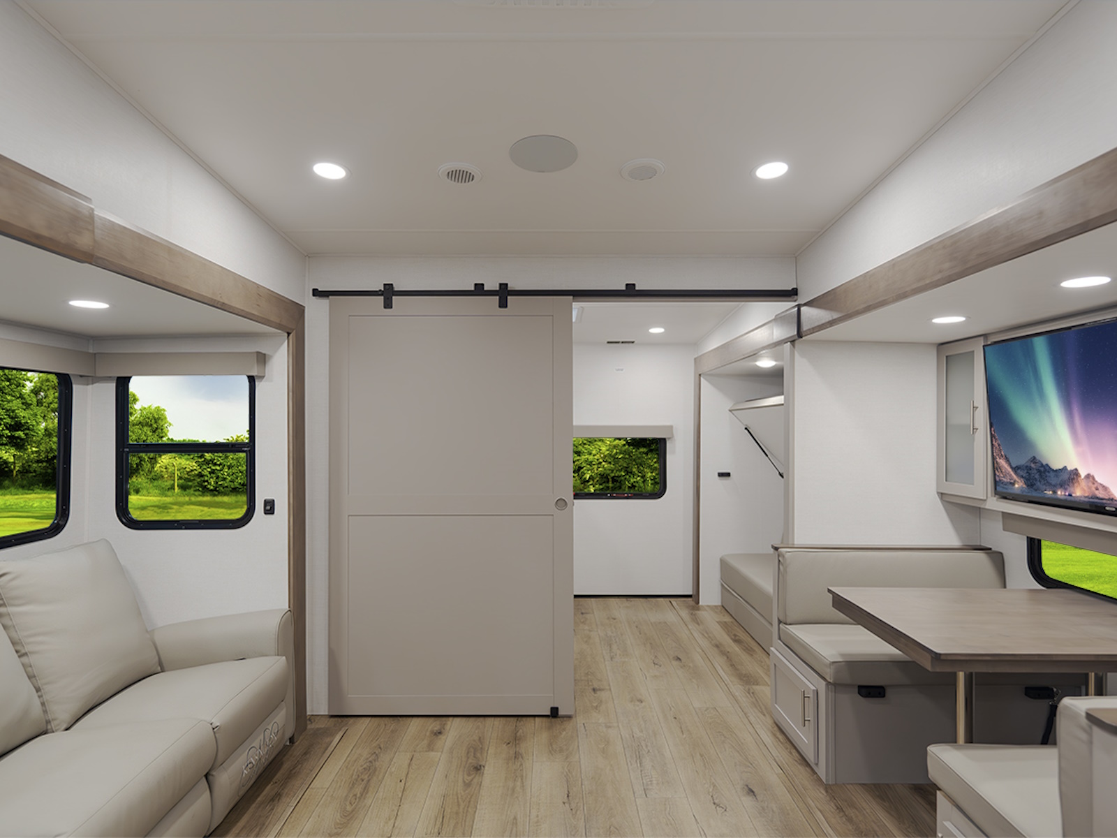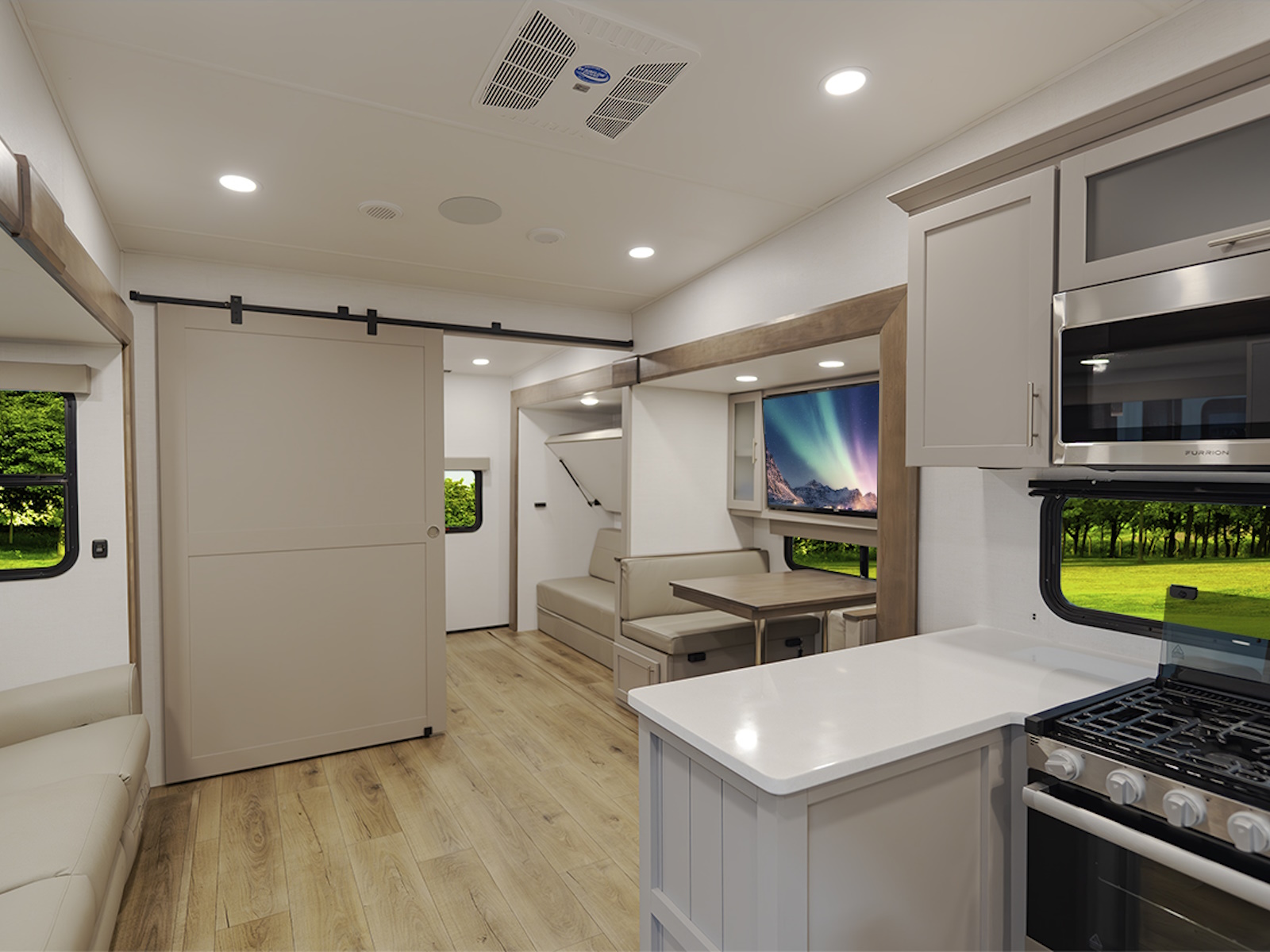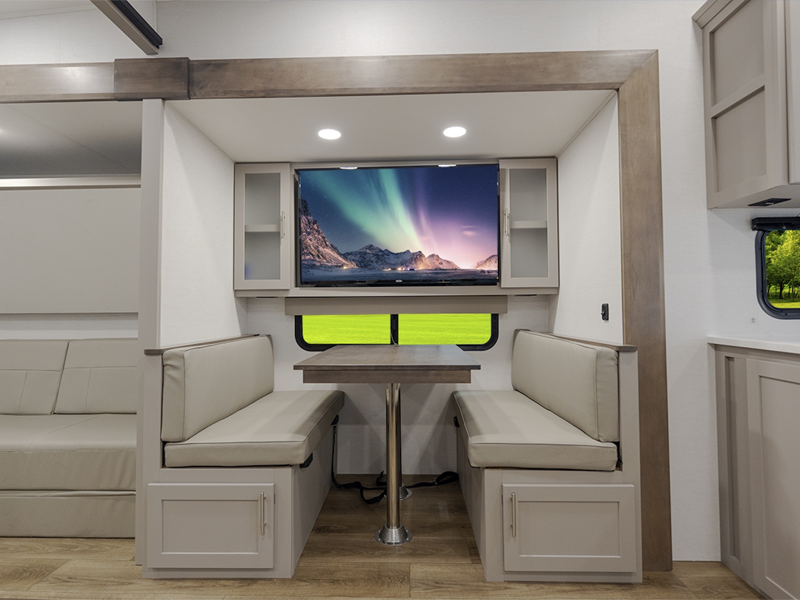 - Innovative storage solutions like hidden compartments behind the TV and in the end tables, ottoman, and dinette chairs.