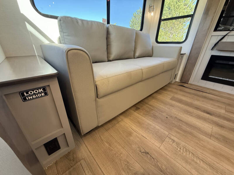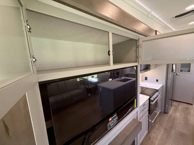 In the rear living area, enjoy the comfort of dual recliner theater seating across from the entertainment center, featuring a 50" HDTV on a swing mount, perfect for viewing from the rear sleeper sofa. Plus, hidden storage behind the TV ensures you can keep your living space tidy and organized.