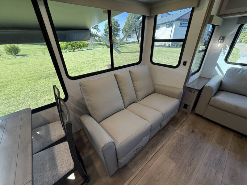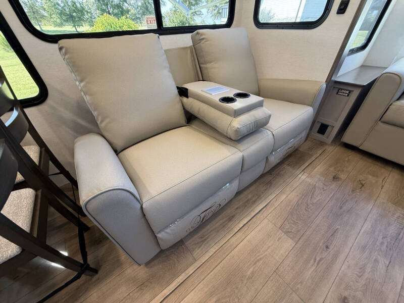 - Rear living area with dual recliner theater seating, ideal for relaxation and entertainment.