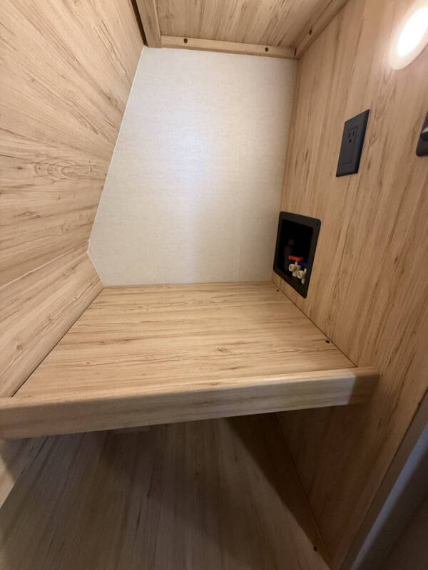 - The private front bedroom offers a queen bed slide (with optional king bed), dresser, and large wardrobe for all your clothing and gear. The wardrobe is prepped for a washer and dryer, making this RV perfect for longer stays or extended trips.