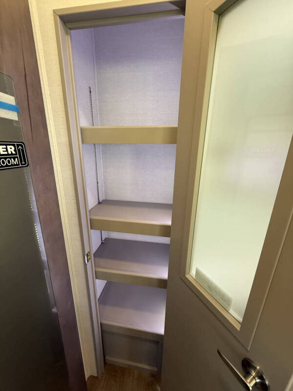 The Avenue 32RLS fifth wheel is designed for ultimate comfort and convenience. Featuring a kitchen island with ample counter space, meal prep is a breeze in this fully equipped kitchen. The floating dinette table is paired with two chairs on one side and a movable ottoman with hidden storage on the other, perfect for storing games or extra tablecloths. Enjoy additional storage in the hutch/pantry and a second pantry for snacks and essentials.