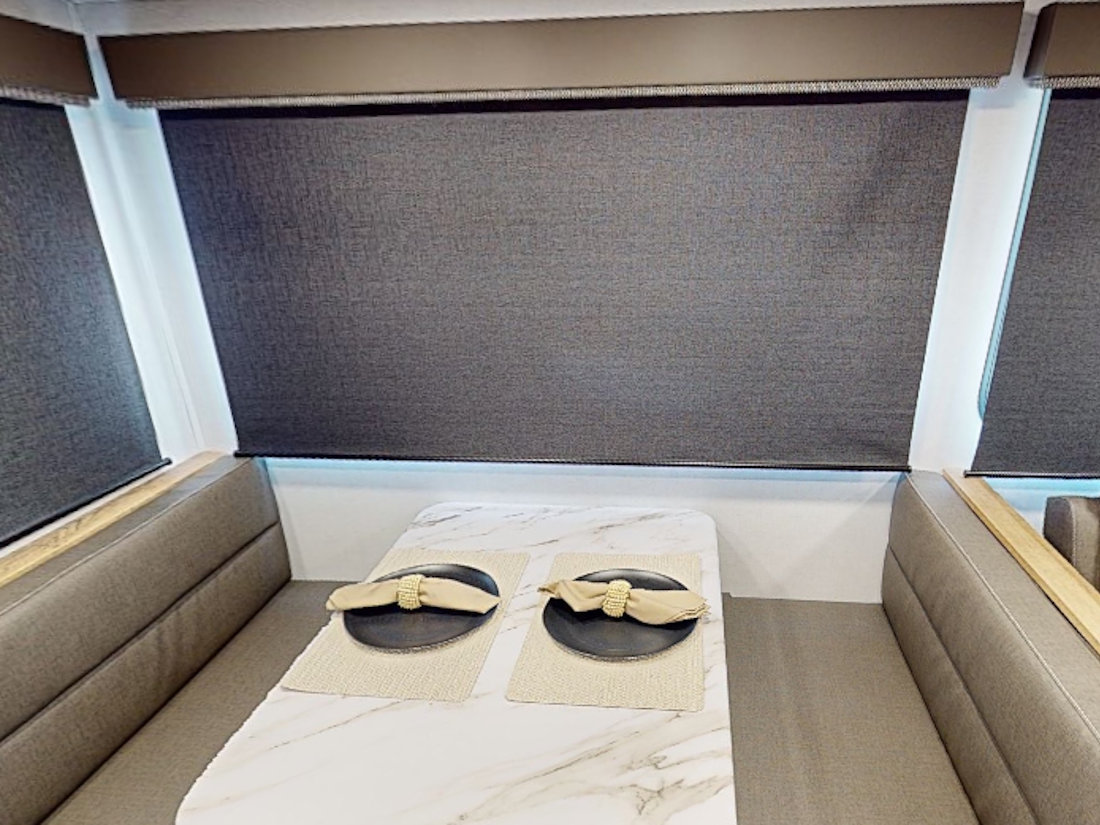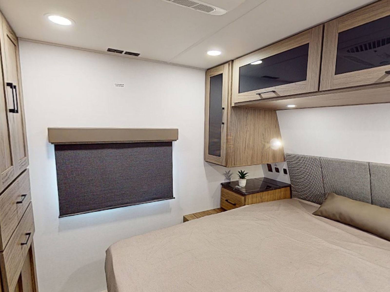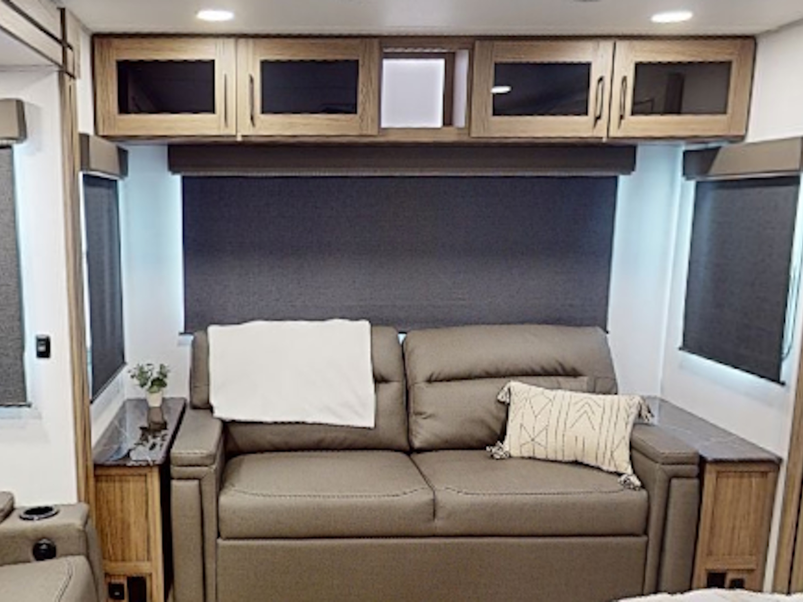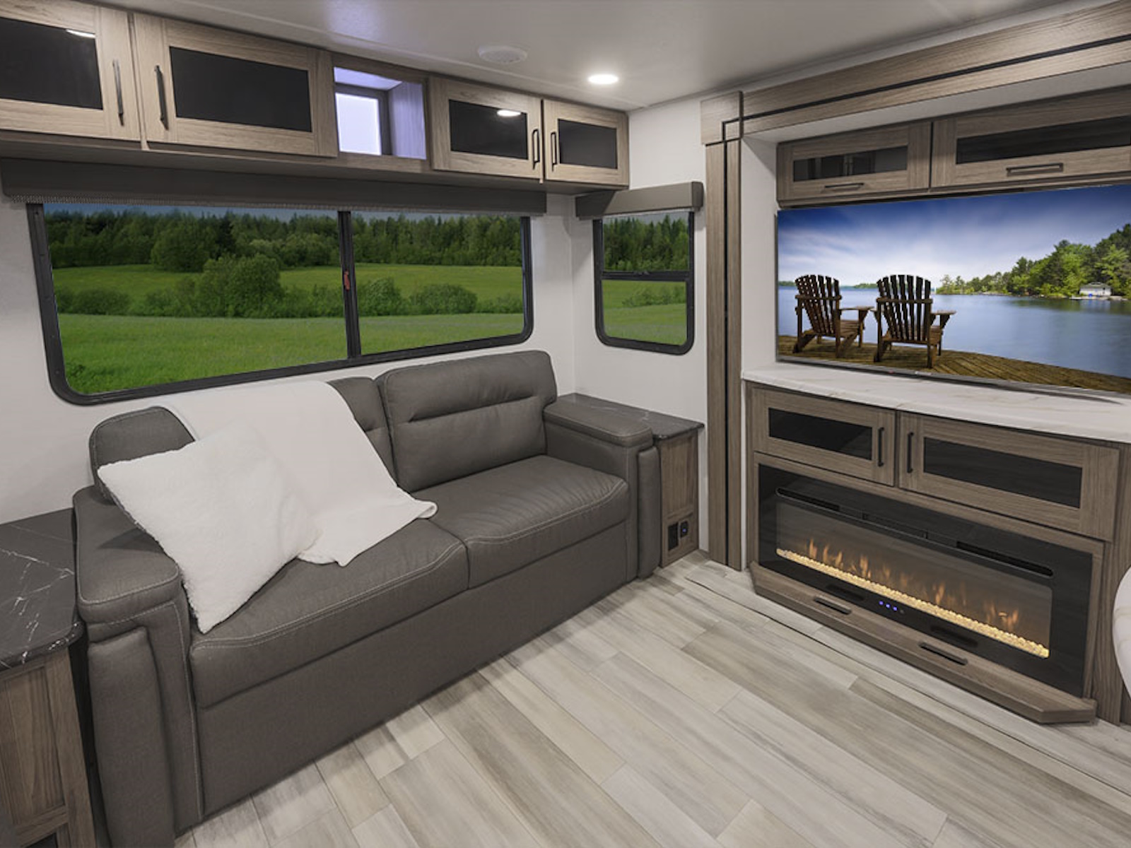 The Delta 292RL is a perfect choice for those who appreciate a comfortable and inviting living space. With a sleeper sofa on one side and a dual reclining loveseat on the other, maximum comfort is guaranteed. The same slide-out accommodates a free-standing dinette, ideal for enjoying meals or playing games. Enhancing the overall appeal is the entertainment center, directly across from the loveseat, featuring a 50" HDTV, a high-quality soundbar, and a convenient pull-out fireplace. When it comes to the kitchen, this unit offers a wide range of features. From the kitchen island with a sink and tip-out trash can to the three-burner stovetop, microwave, 12-volt refrigerator, and pantry, you'll find everything you need for culinary convenience. There's no shortage of amenities here! On the way to the bedroom, you'll discover a full bathroom that boasts a spacious shower and a porcelain toilet. The master suite is equipped with a comfortable queen-sized bed and offers ample storage space with bedside wardrobes and overhead bins.