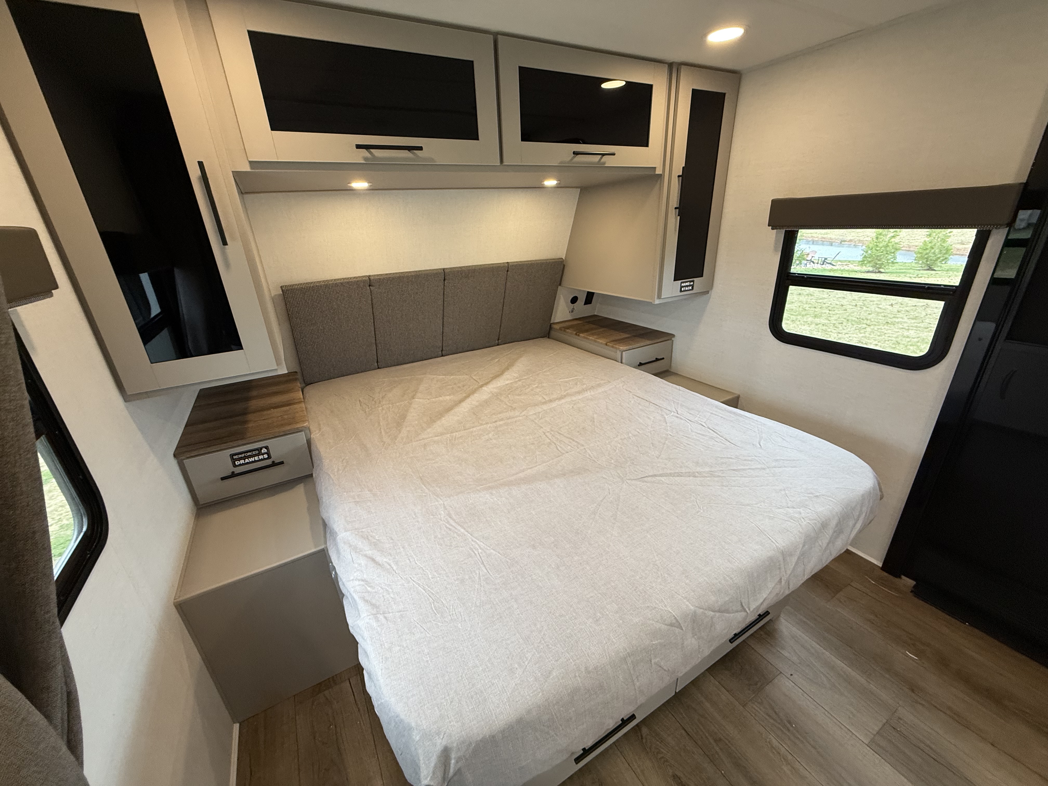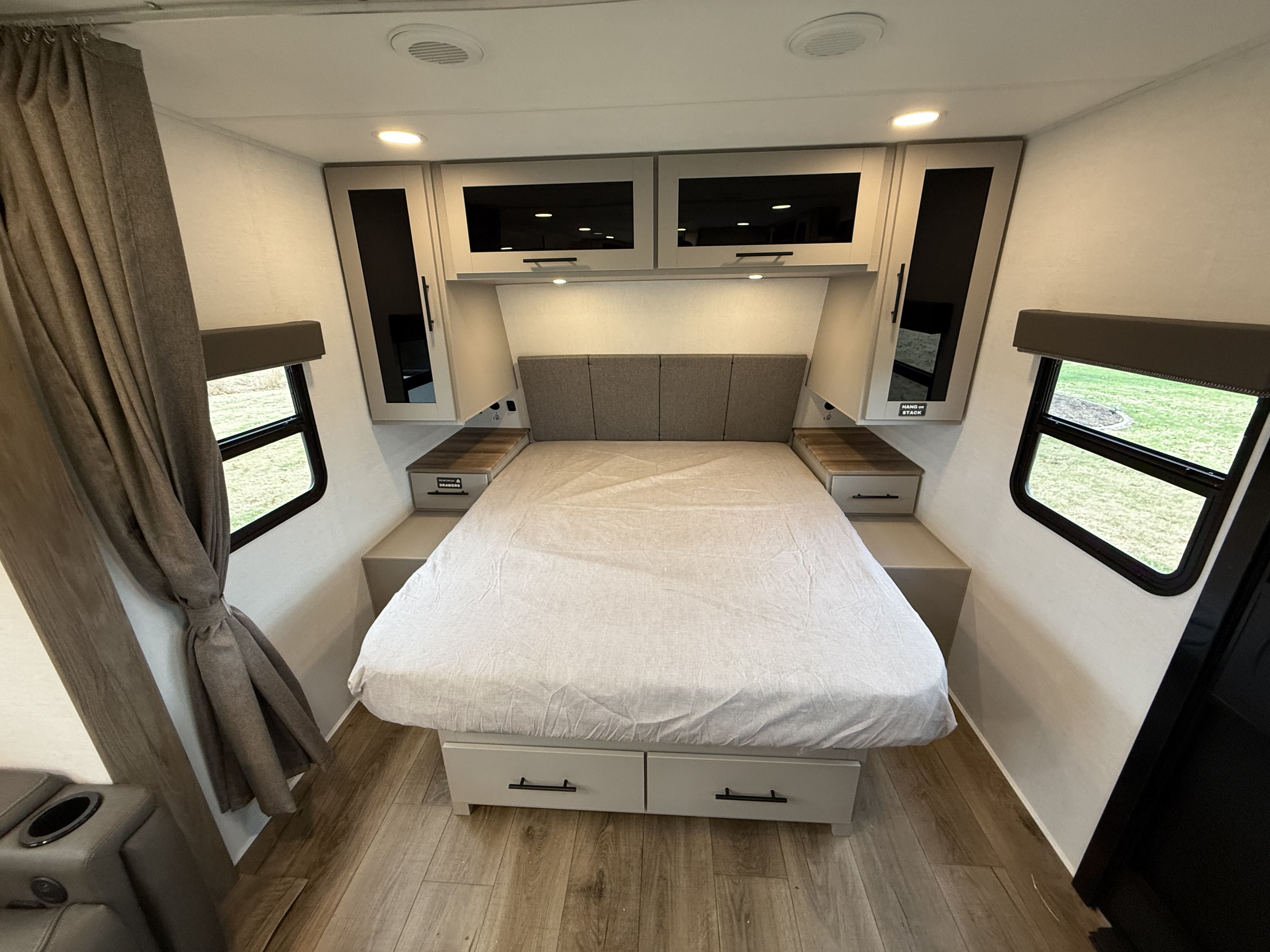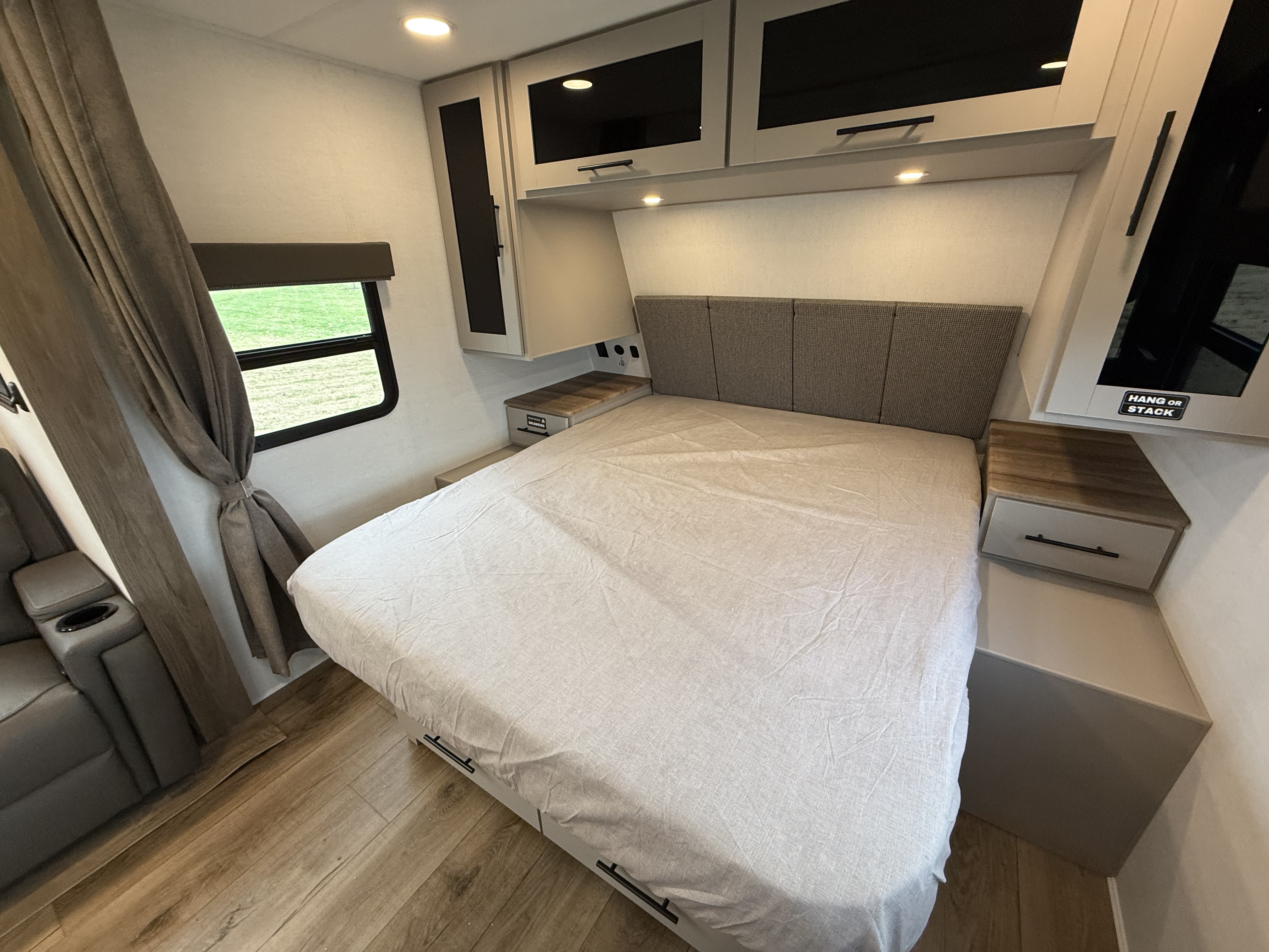 - Private Bedroom Retreat: Enjoy a 60" x 80" queen bed with wardrobe nightstands, overhead storage, and a privacy curtain for added comfort.