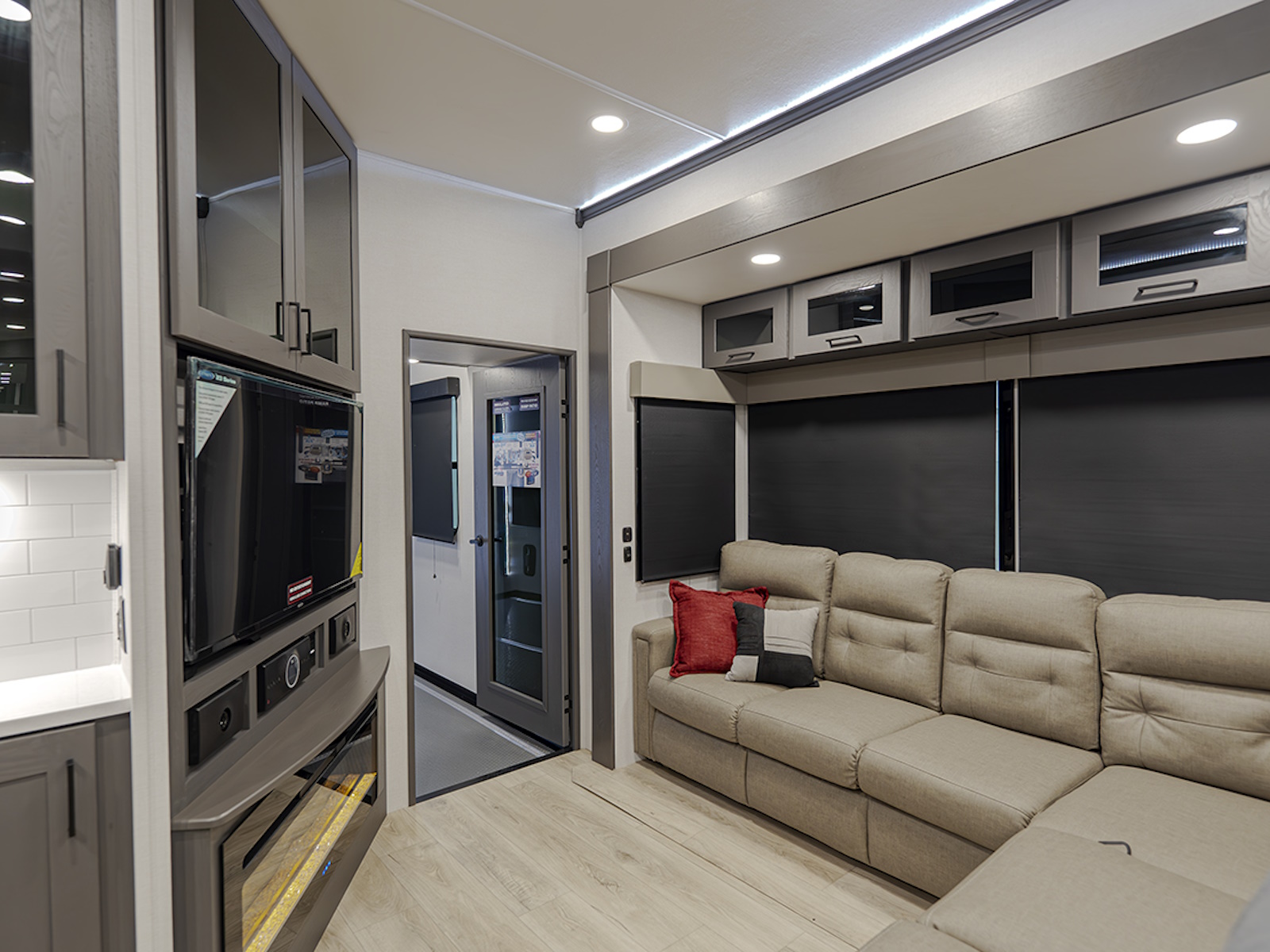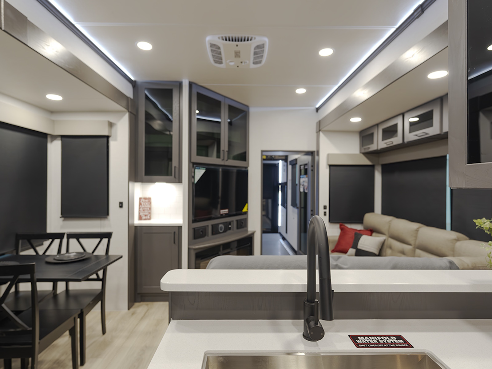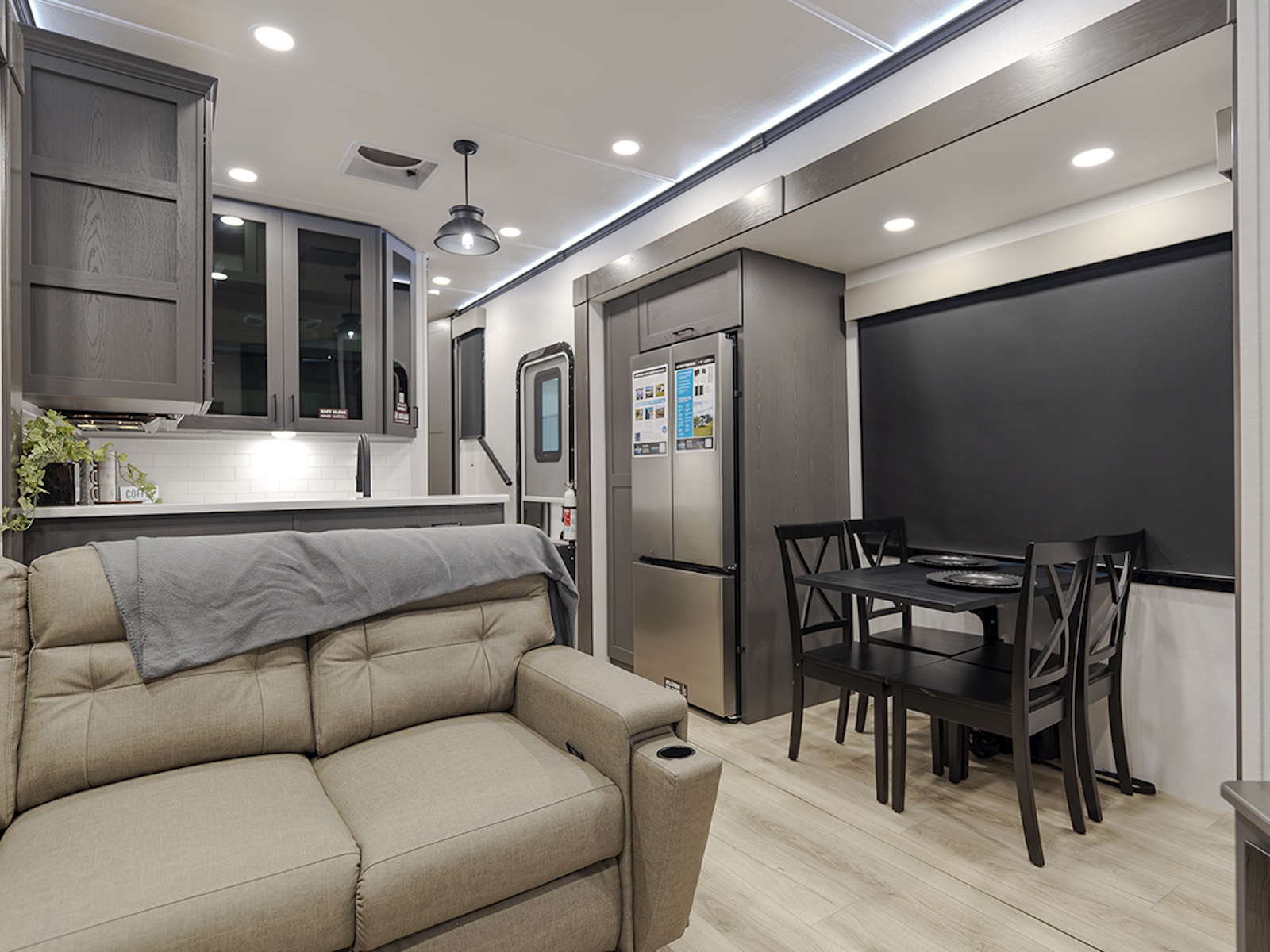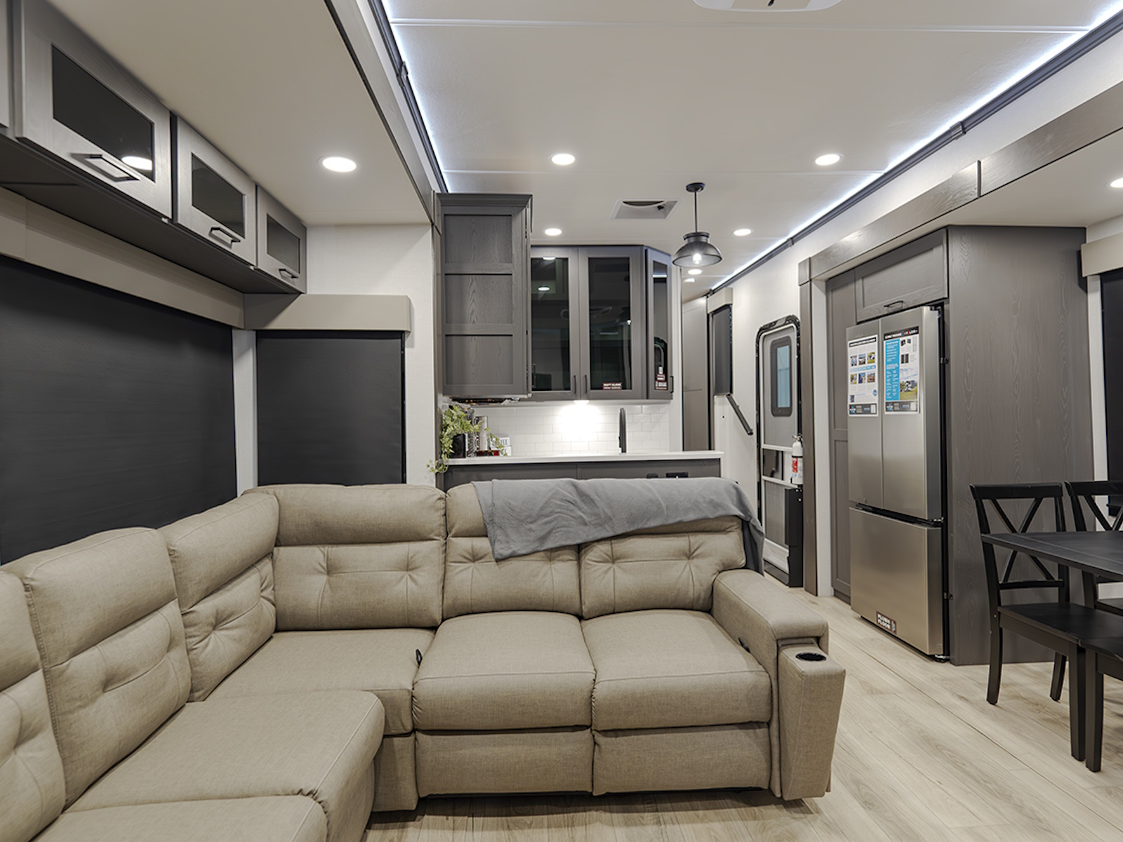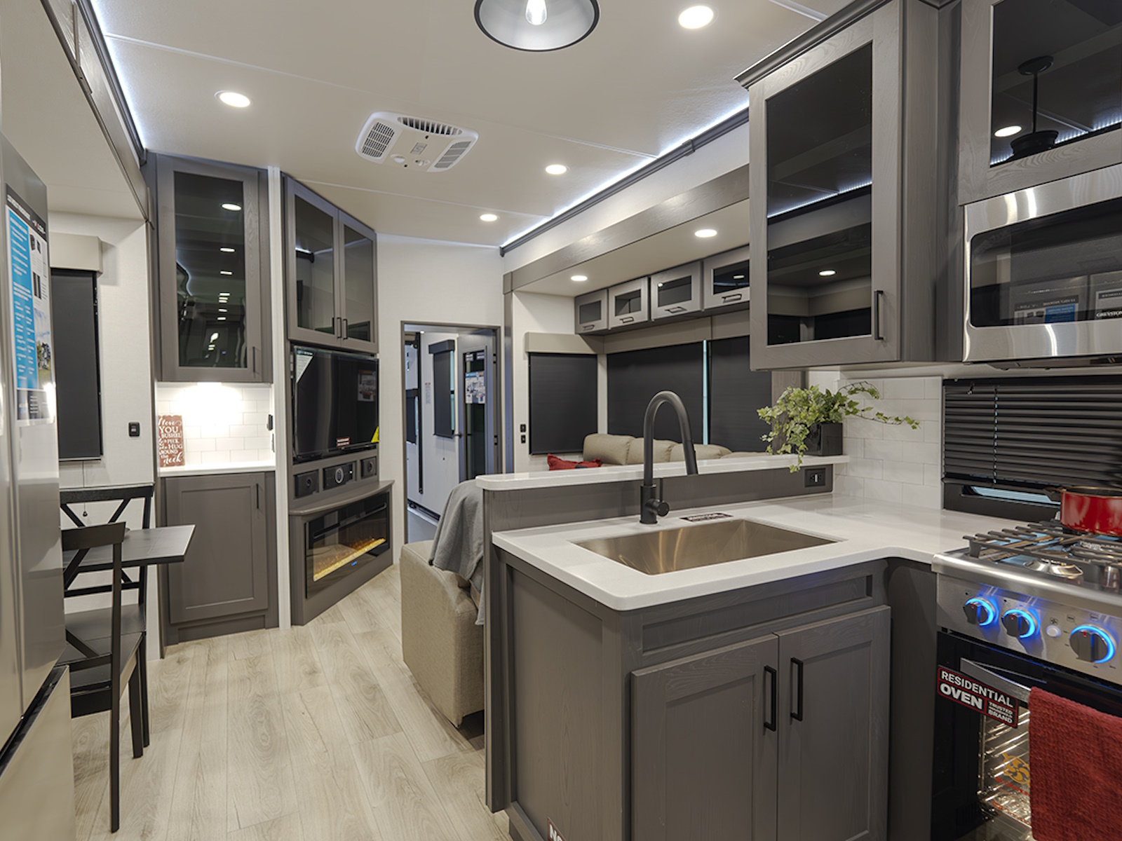 The chef in the family will love the fully equipped kitchen, featuring a three-burner cooktop, a 17 cu. ft. stainless steel 12V refrigerator, a large sink, and ample countertop space for meal prep. The L-shaped sofa slide provides plenty of space for relaxation, while you unwind with the 50" HDTV and fireplace. Enjoy family meals or game nights at the dining table with four chairs, making this the perfect place to gather after a day of adventure.