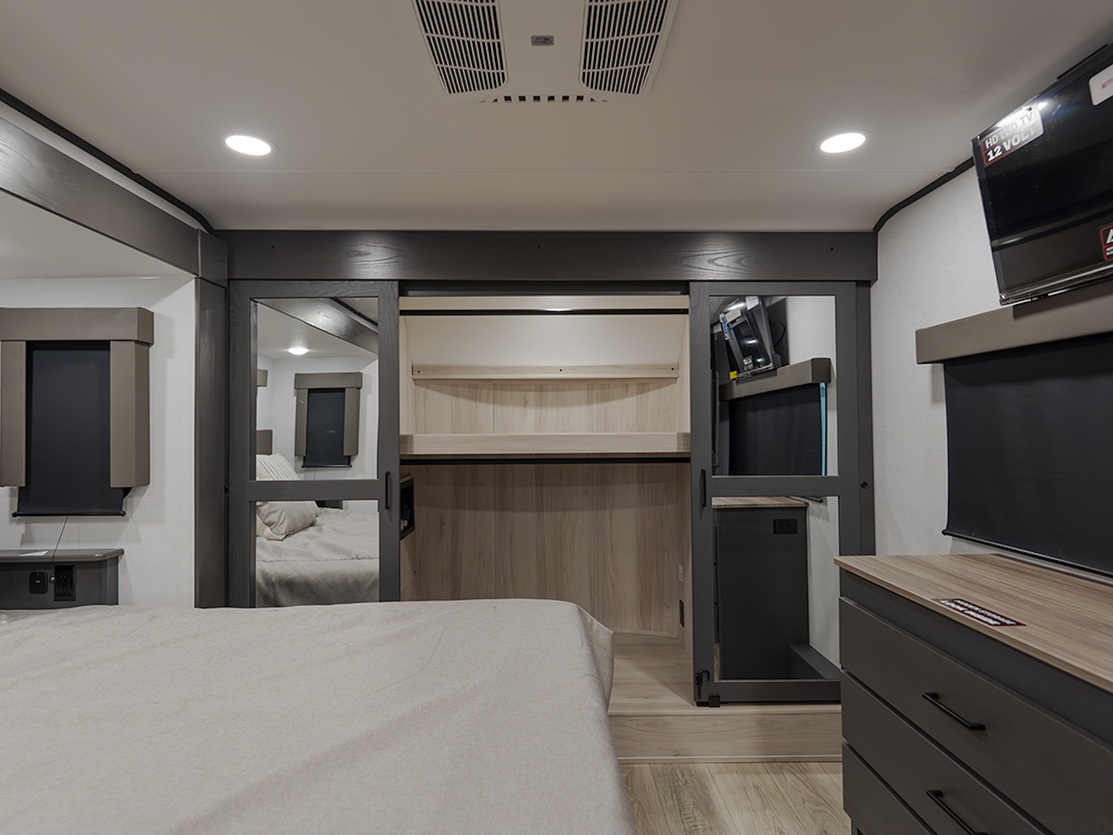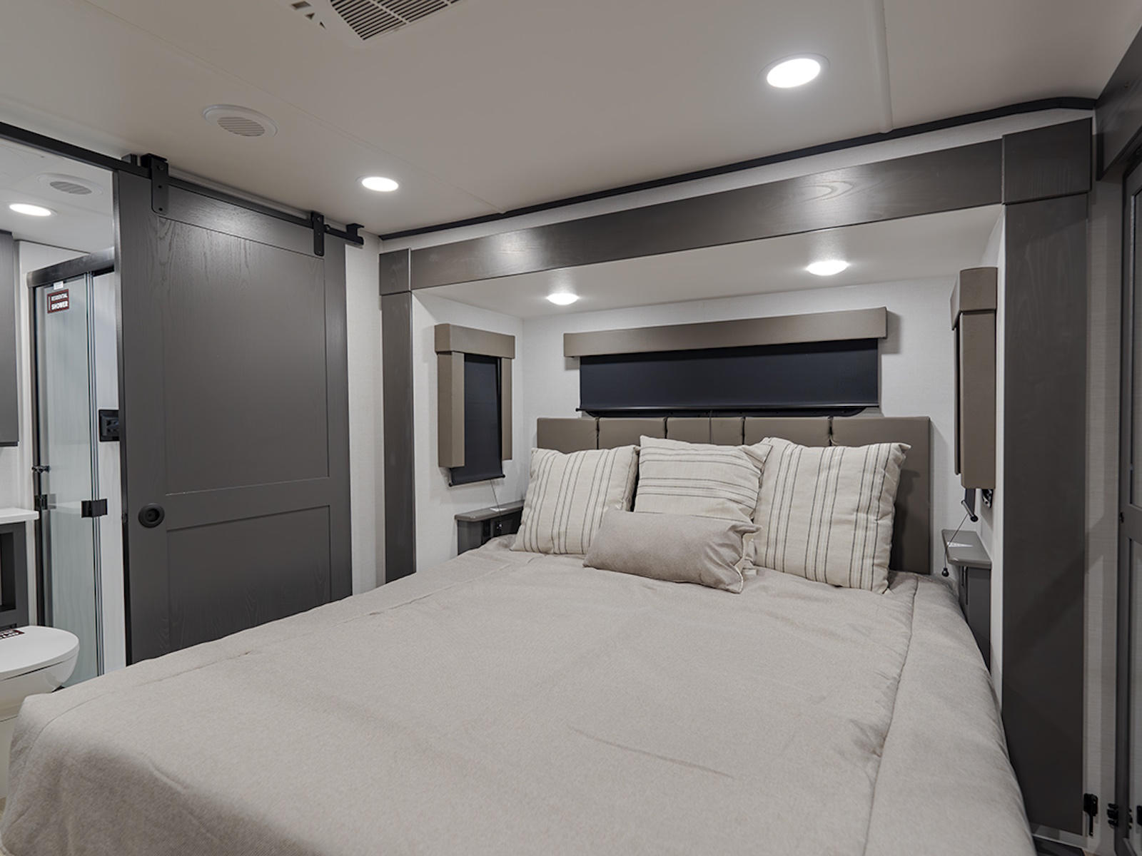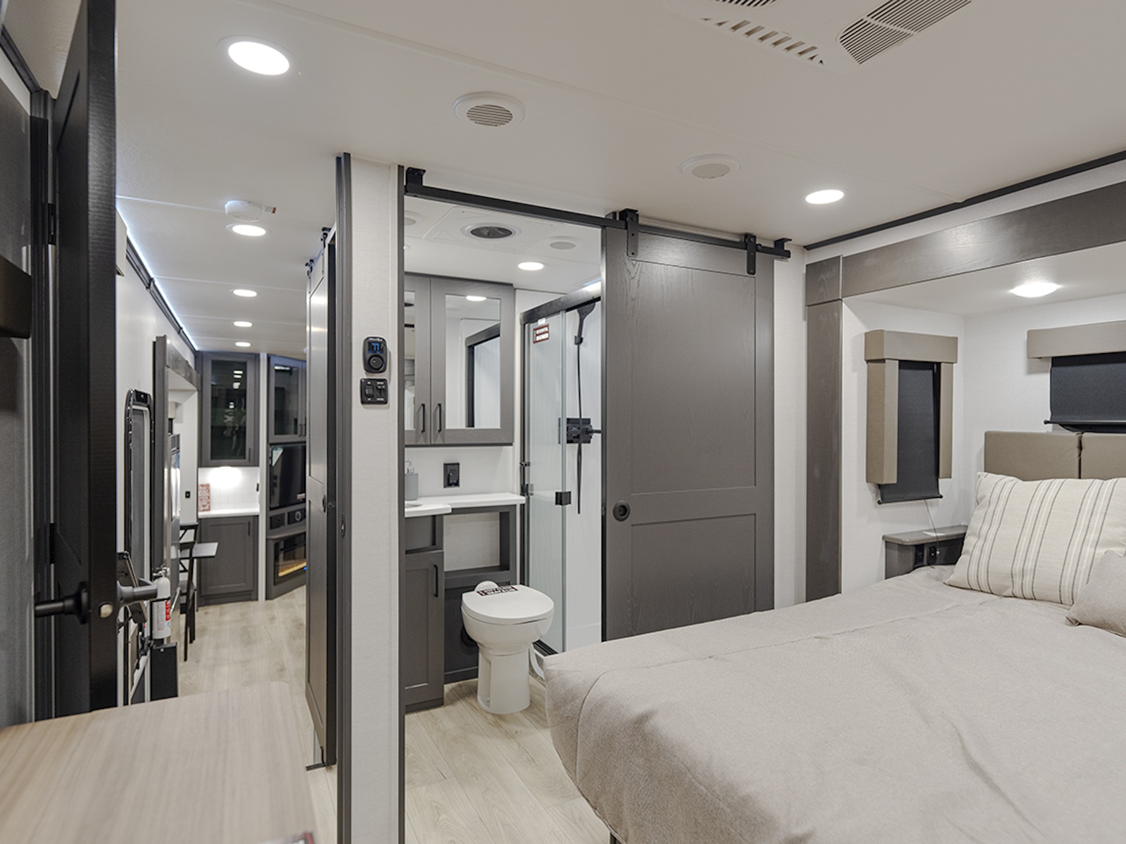 The front private bedroom offers a king bed slide for added space and comfort, plus a flip-top dresser and large front wardrobe that's prepped for a washer/dryer. The dual entry bathroom ensures easy access from both the bedroom and the main living area.