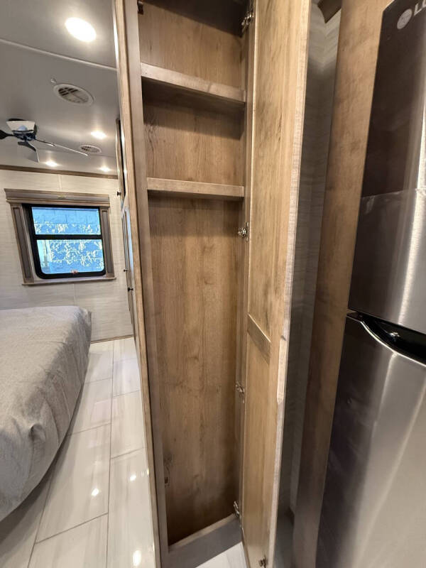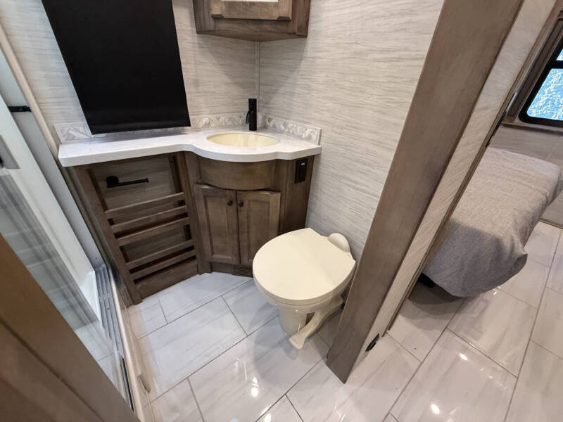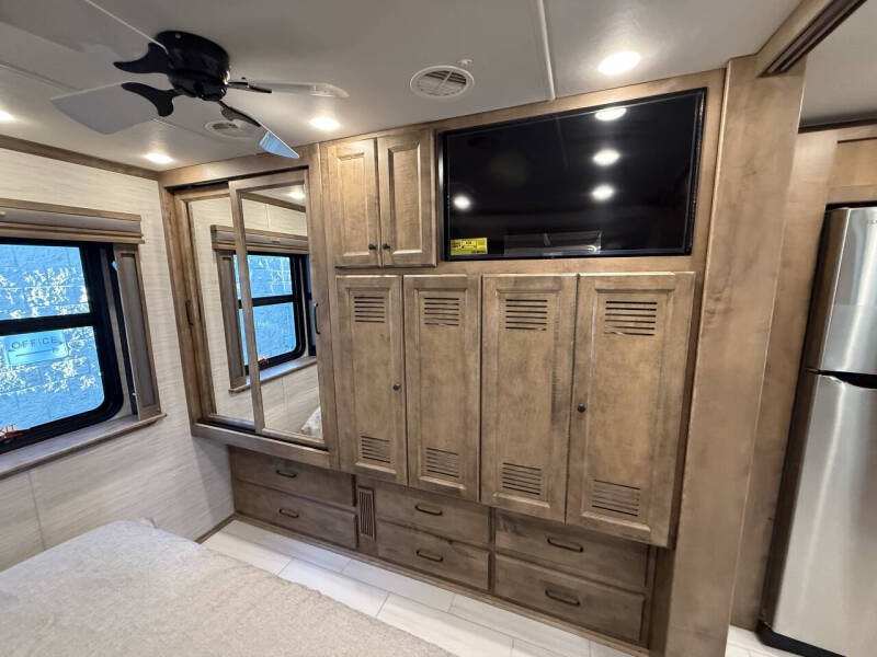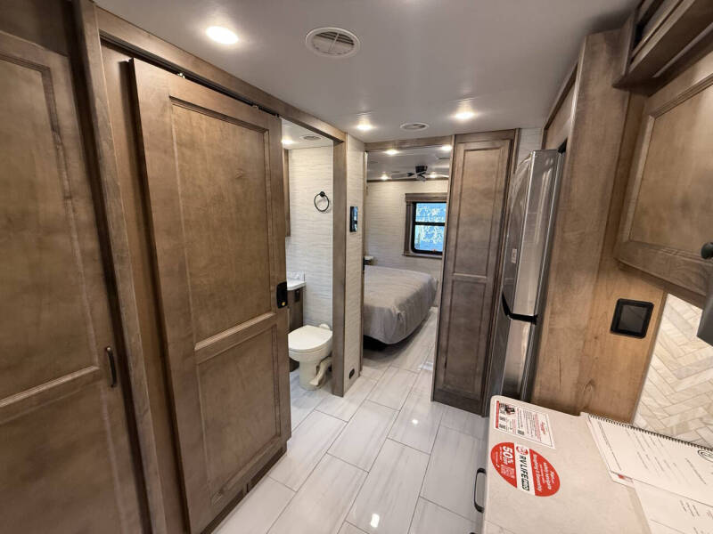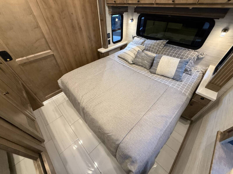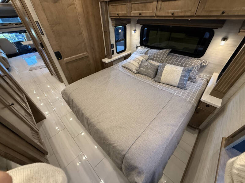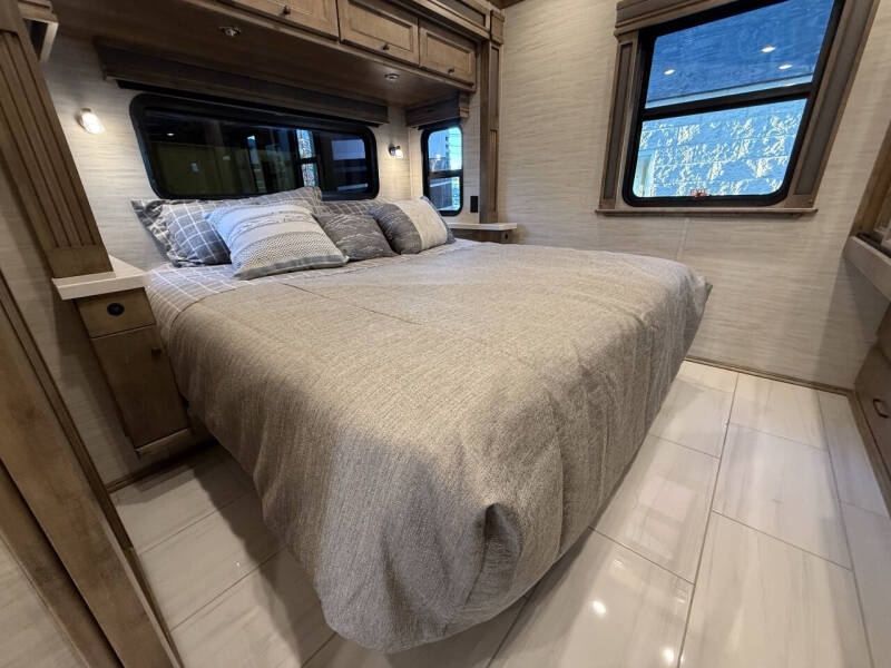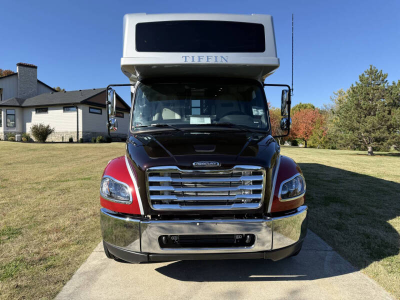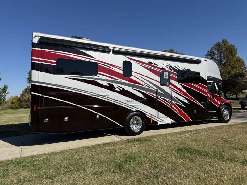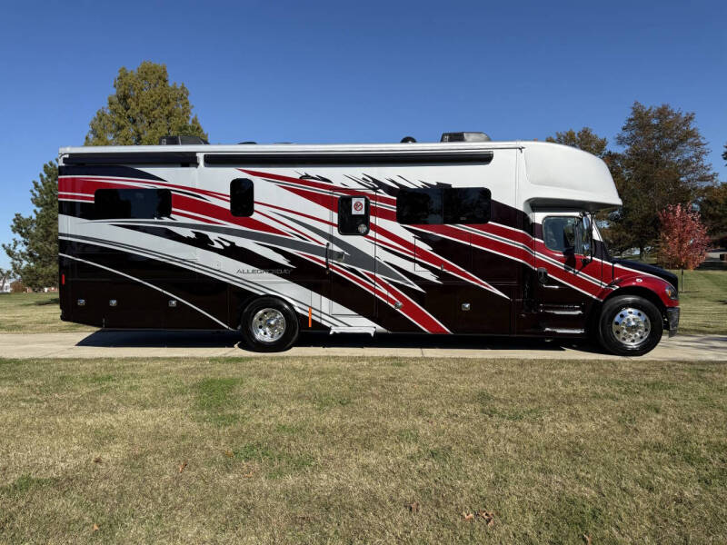 The 2026 Allegro Bay 34 DB commands respect with its rich "Bordeaux" full-body paint, signaling the immense capability of the Freightliner S2RV Super C chassis that lies beneath. This rig is engineered for the active adventurer, boasting a massive 12,000-lb towing capacity that allows you to haul a boat or stacker trailer effortlessly, while the custom-tuned Air Ride suspension ensures the drive remains civilized. Inside, the King Bed slide-out and handcrafted hardwood cabinetry provide a sanctuary of comfort that feels completely removed from the rugged utility of the chassis, giving you the best of both worlds.