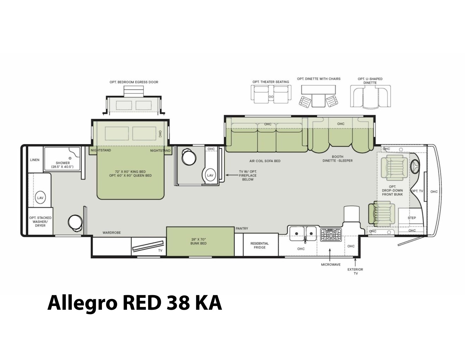 The 2026 Allegro RED is your ticket to luxury on the road. Made for families of all sizes, it offers three unique floor plans, each packed with all the comfort and style you need, including one with bunk beds! Choose from a range of exterior colors, interior decors, and premium cabinetry to create a space that fits your style. Plus, with multiple furniture layouts to choose from, you can make it truly your own. Whether you’re hitting the road for a weekend getaway or a cross-country adventure, the Allegro RED is ready to deliver a first-class experience every mile of the way.