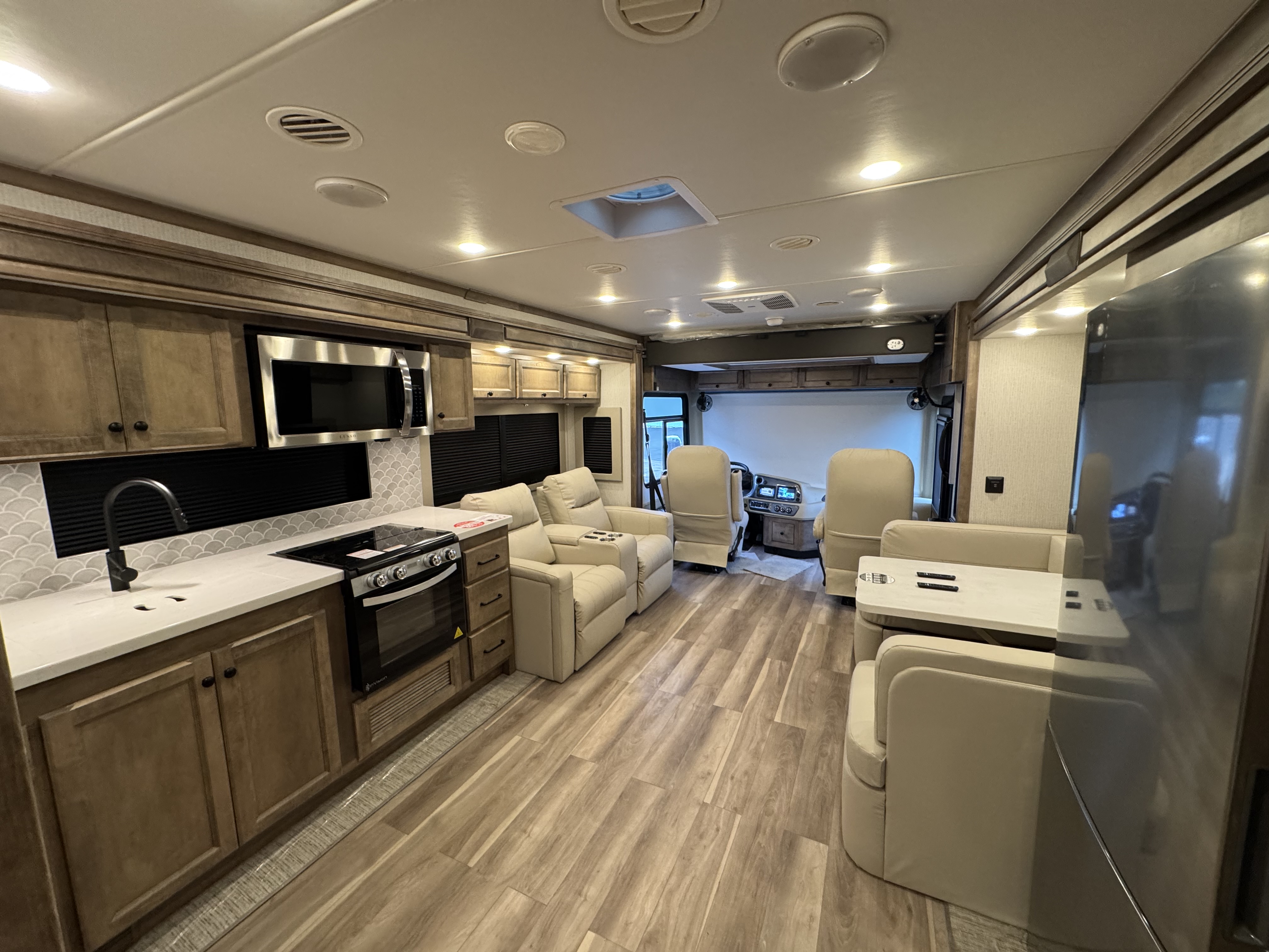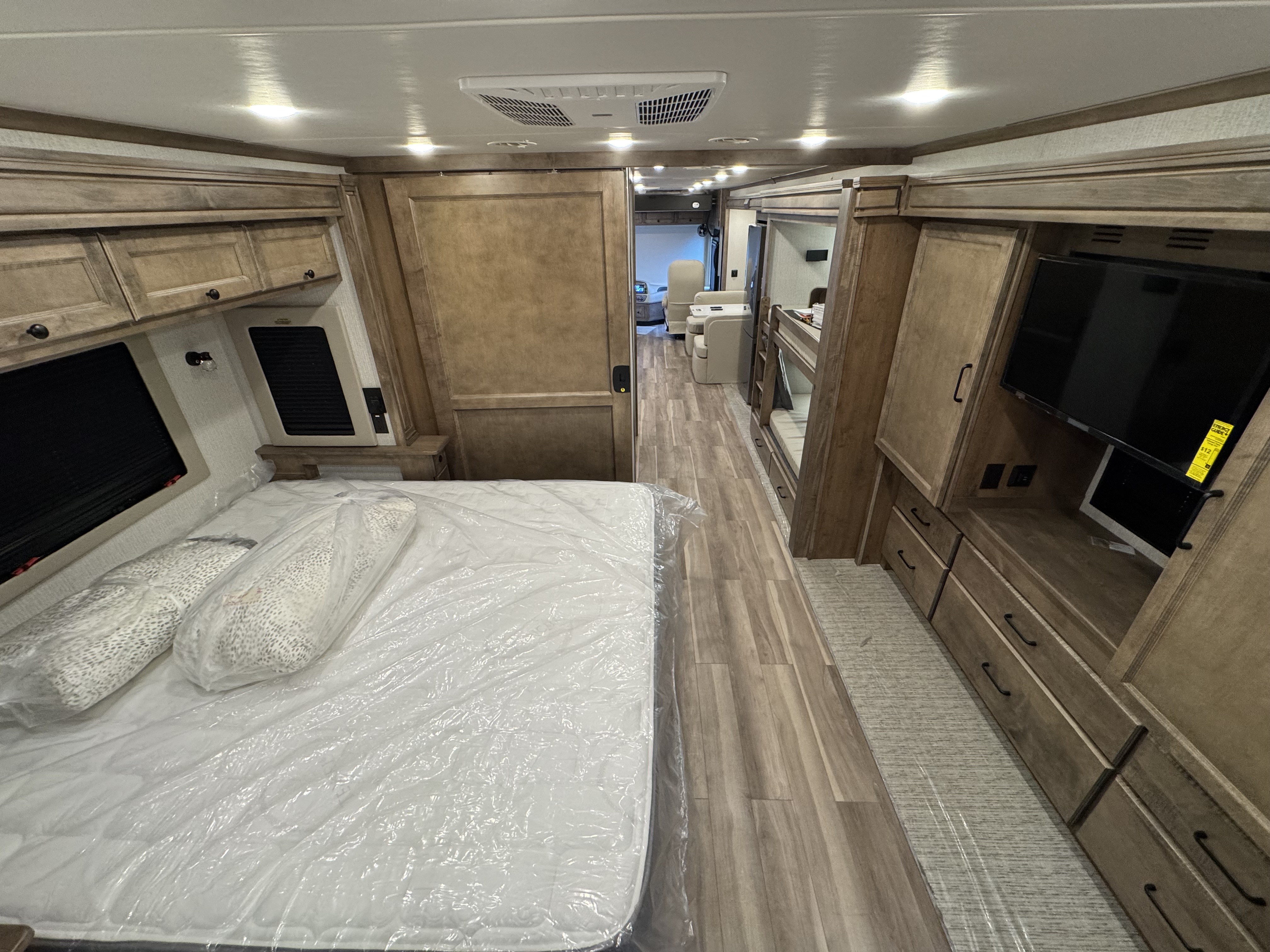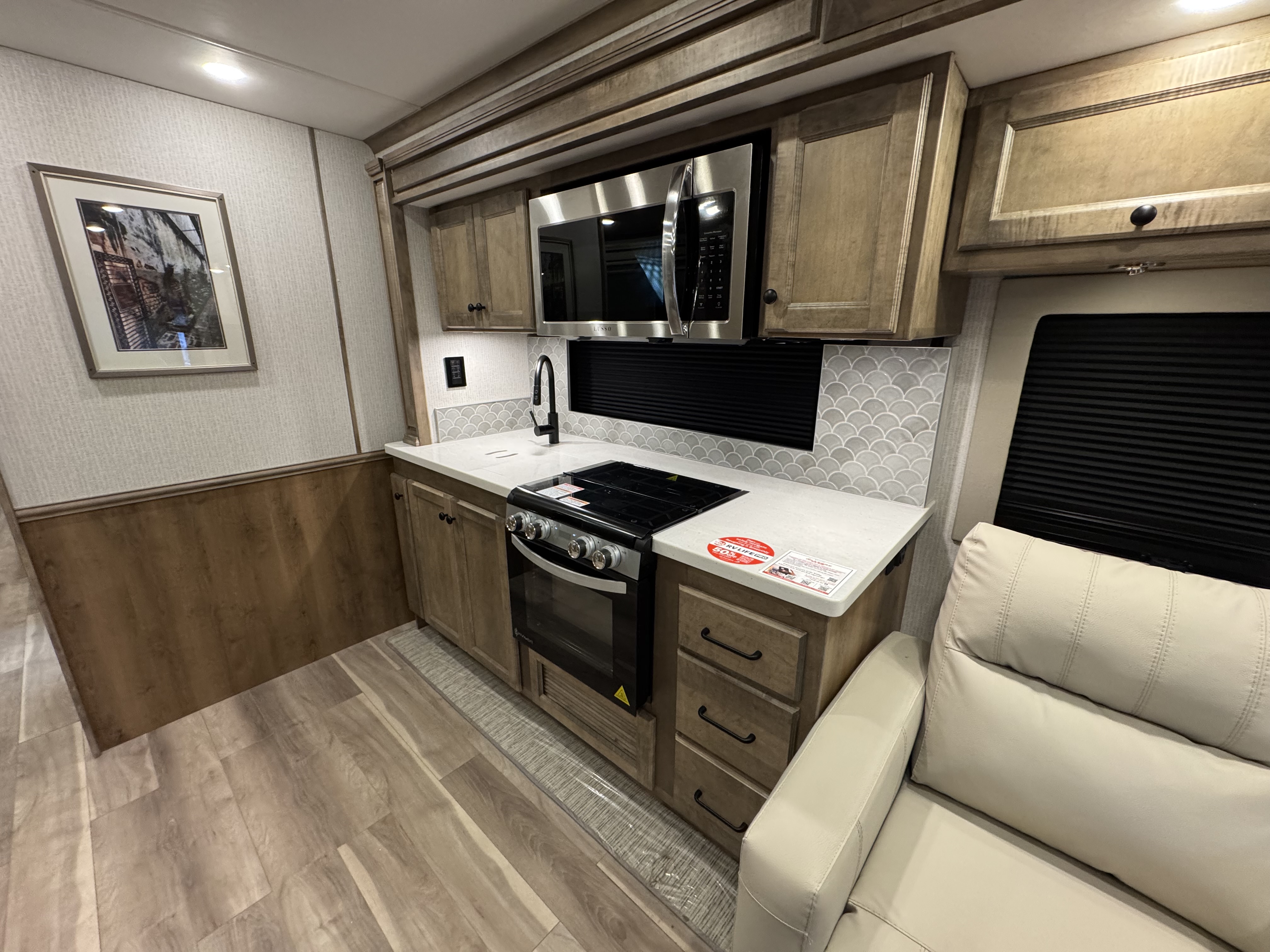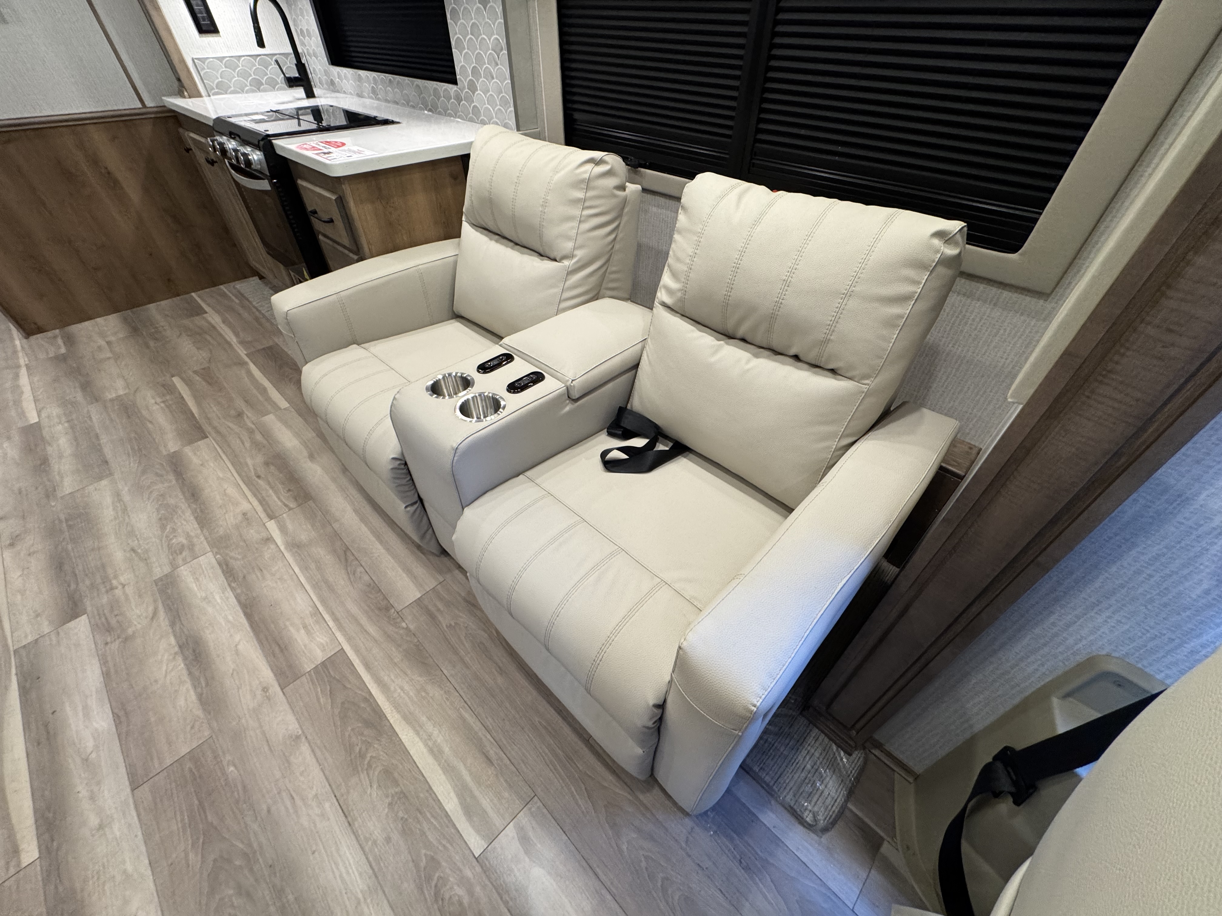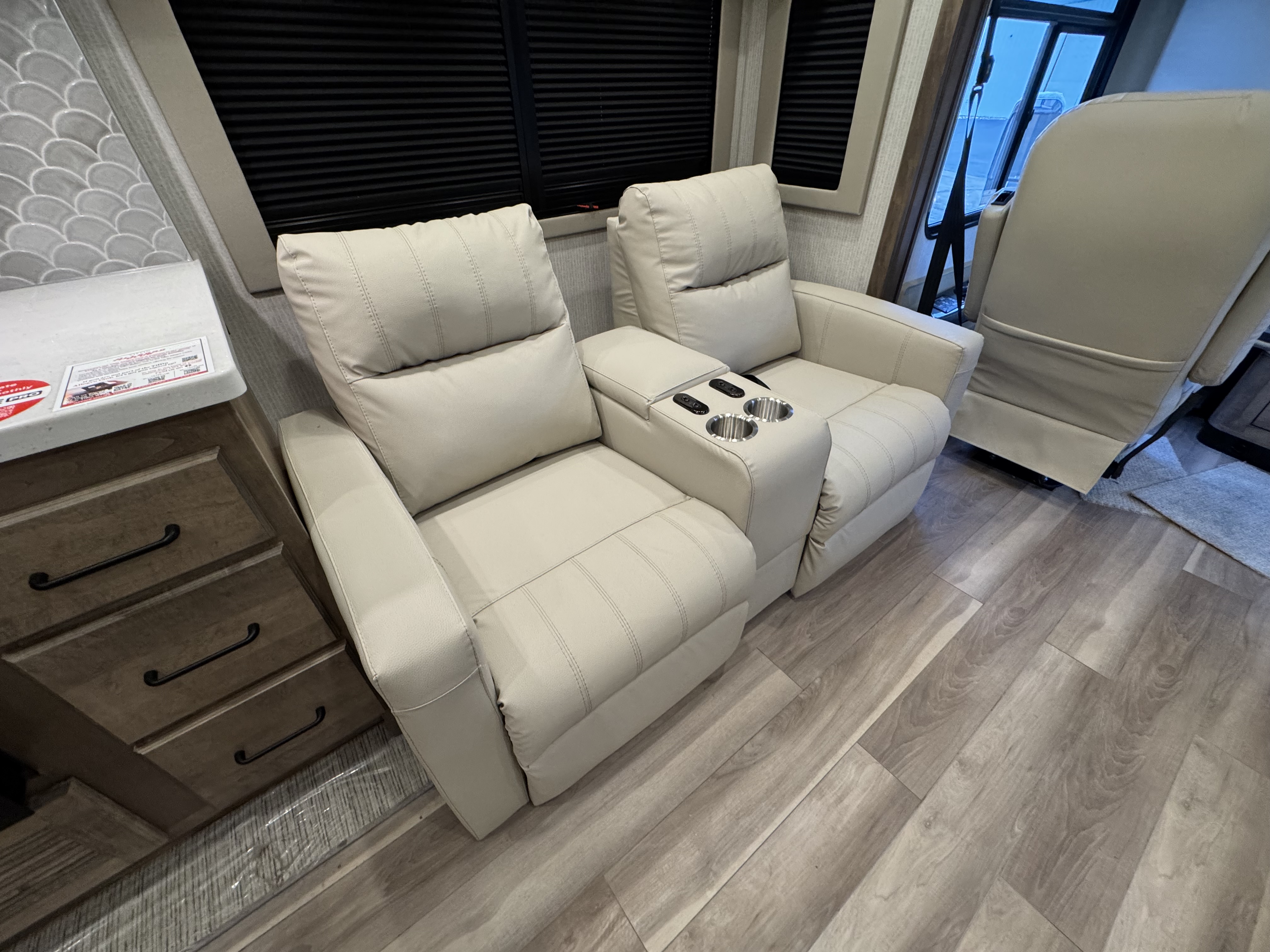 The 2026 Byway 38 BL makes an immediate impression with its sophisticated "Frosted Granite" full-body paint, setting a tone of modern elegance that matches the smooth performance of the Freightliner XCS chassis underneath. You will appreciate the serenity of the Air Ride suspension and Air Brakes, which turn every highway into a gliding experience, while the 340 HP Cummins engine provides the reliable power you need to travel with confidence. Inside, the luxury continues with Tiffin’s signature handcrafted cabinetry and Ultraleather furniture, all kept comfortable by the instant, endless hot water from the Truma AquaGo system and a layout designed for effortless living.