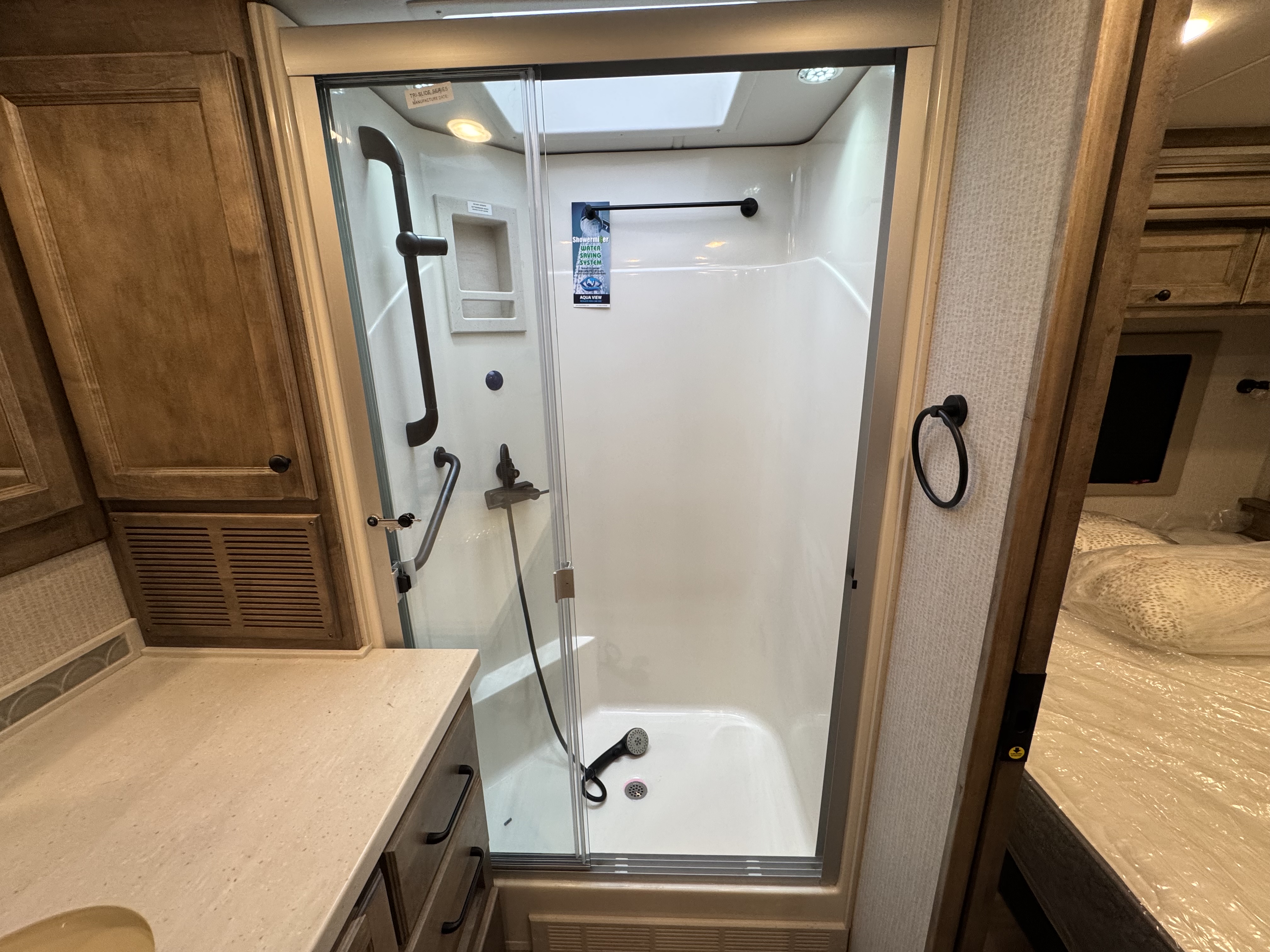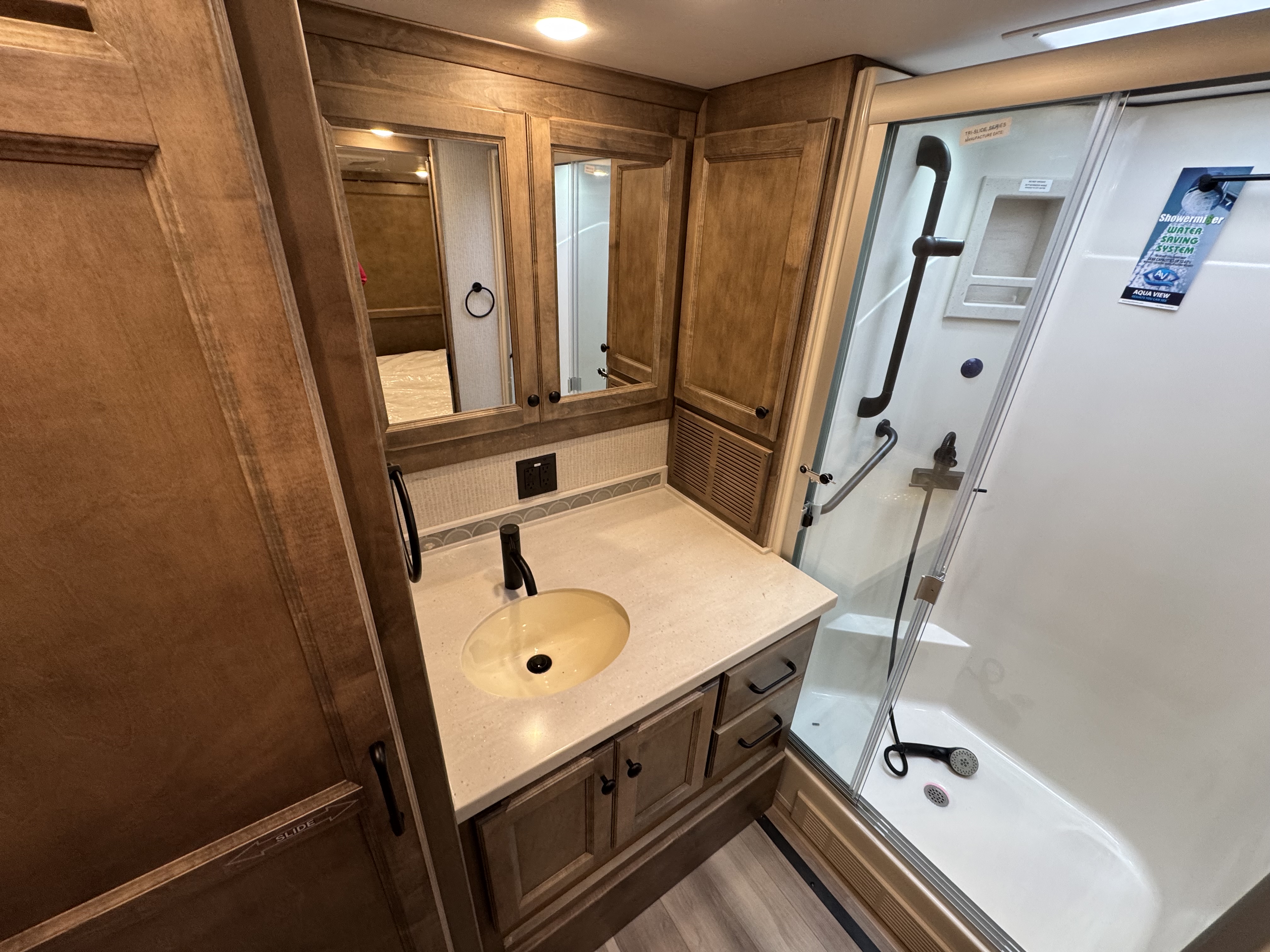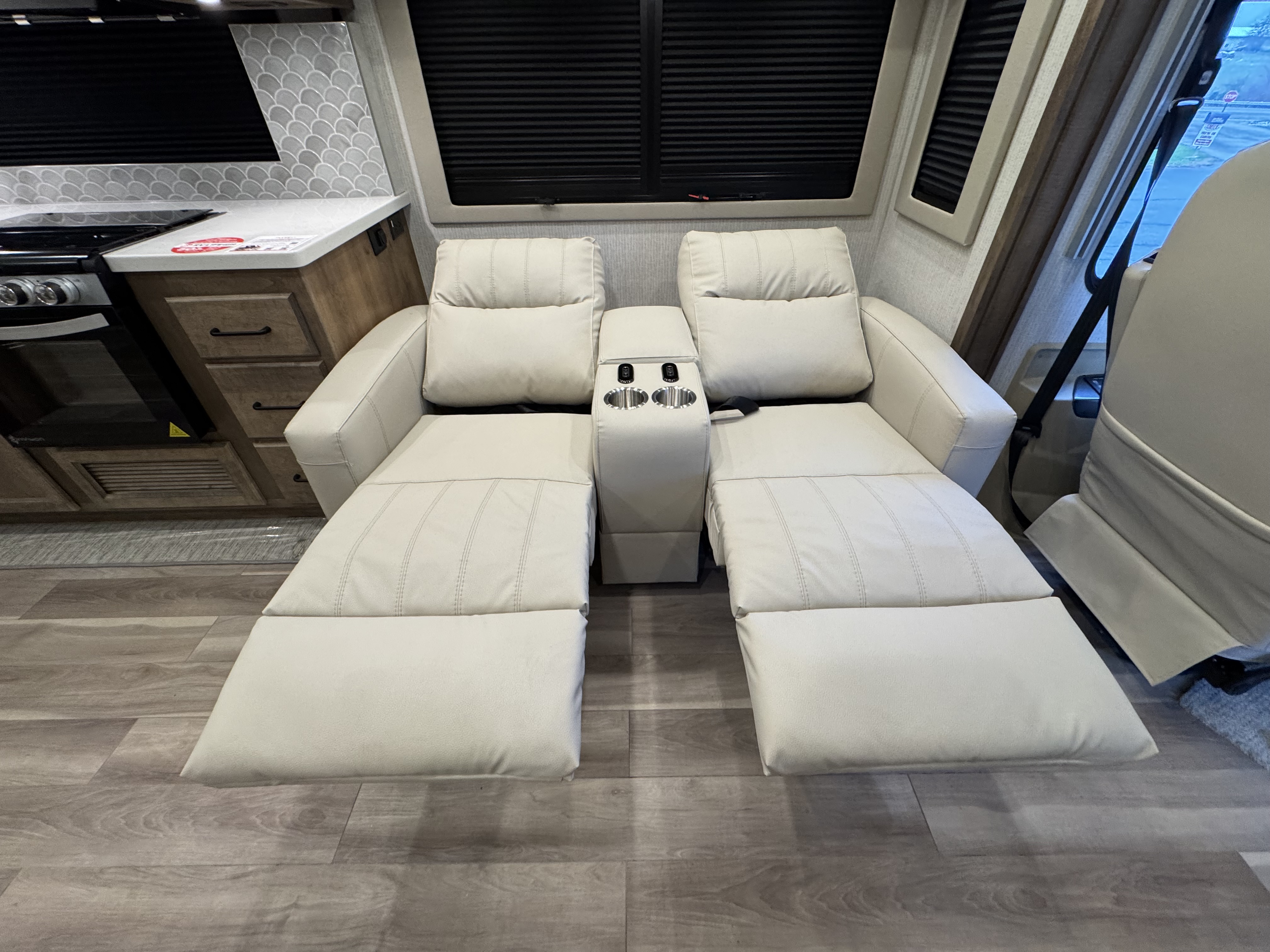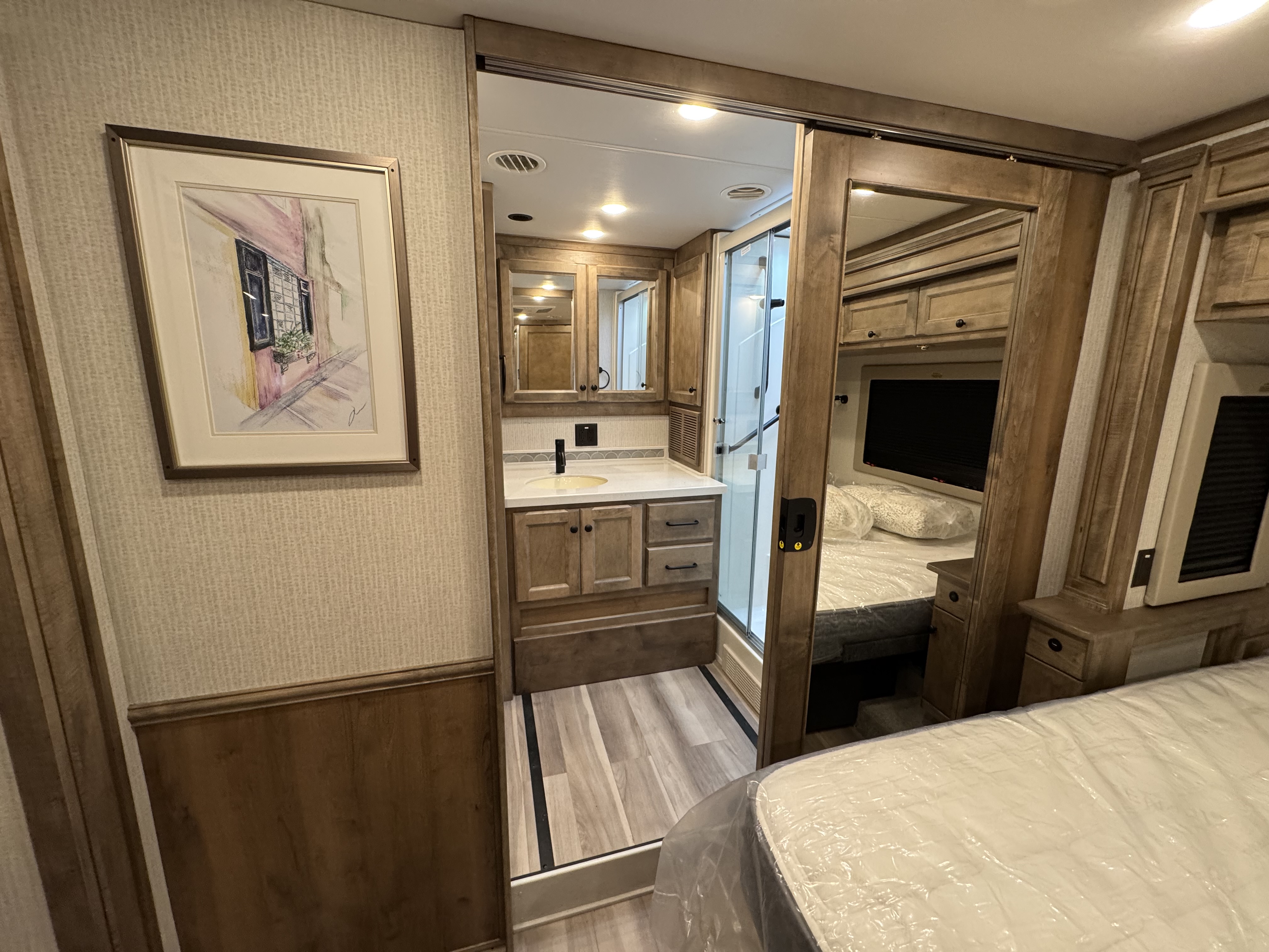 The 2026 Byway 38 BL makes an immediate impression with its sophisticated "Frosted Granite" full-body paint, setting a tone of modern elegance that matches the smooth performance of the Freightliner XCS chassis underneath. You will appreciate the serenity of the Air Ride suspension and Air Brakes, which turn every highway into a gliding experience, while the 340 HP Cummins engine provides the reliable power you need to travel with confidence. Inside, the luxury continues with Tiffin’s signature handcrafted cabinetry and Ultraleather furniture, all kept comfortable by the instant, endless hot water from the Truma AquaGo system and a layout designed for effortless living.