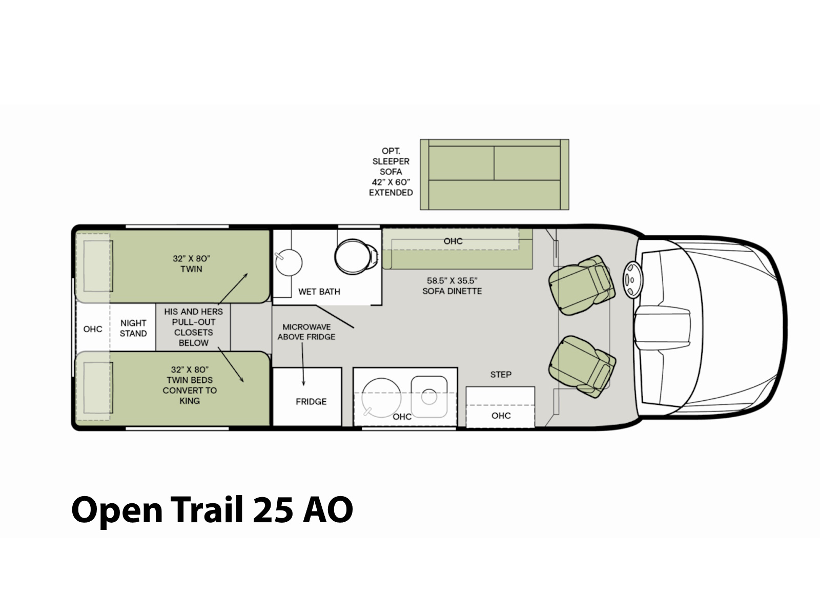 The Tiffin Open Trail combines the efficiency of an adventure van with the added capacity of a Class C coach, giving you room to roam. Built on a Mercedes-Benz AWD chassis and equipped with the SumoSprings Ride Assist System, the Open Trail provides the smooth ride you expect with the offroad capabilities you crave! The Open Trail is supercharged with an optional on-board solar panel and prepped for Starlink Mini, always keeping you connected. With a sleeping capacity of 3, your solo trips just became a family adventure. So pick a spot on the map, and take on the Open Trail!